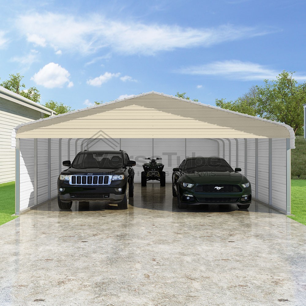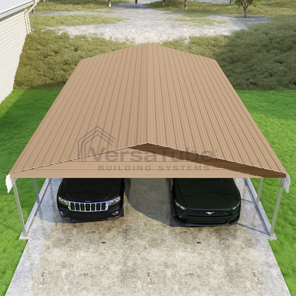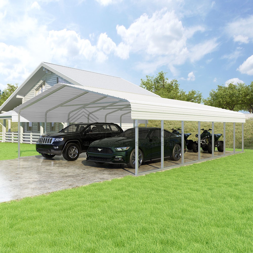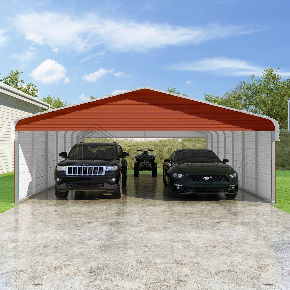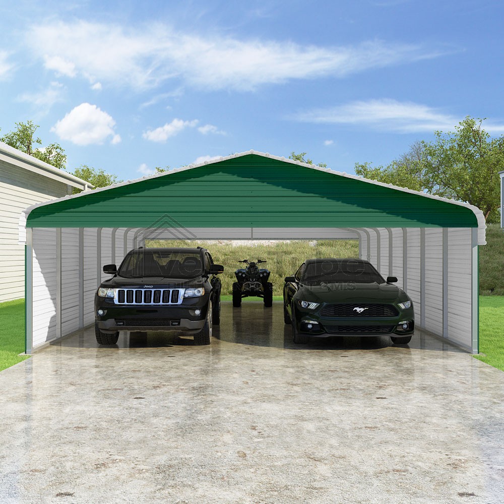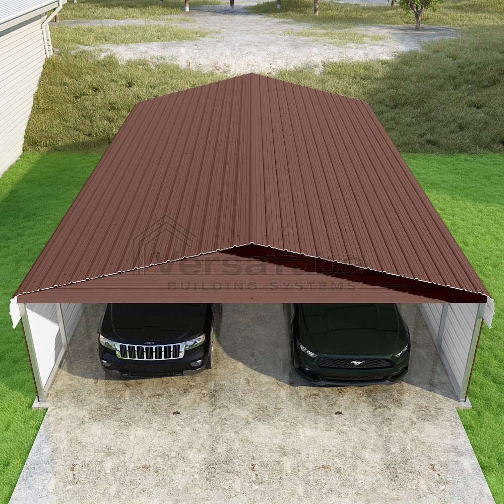 Classic Series DIY carport kit features horizontal application of sheet metal panels with the extra protection of rounded eaves.