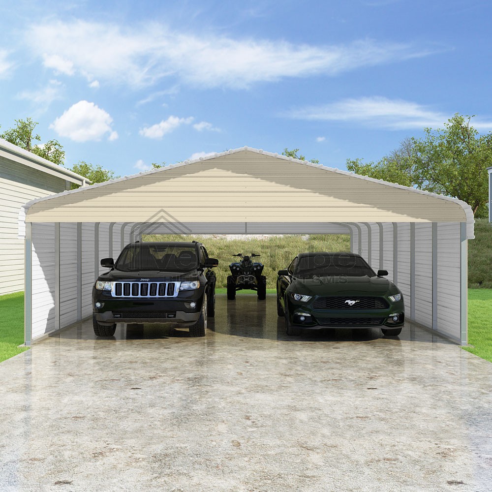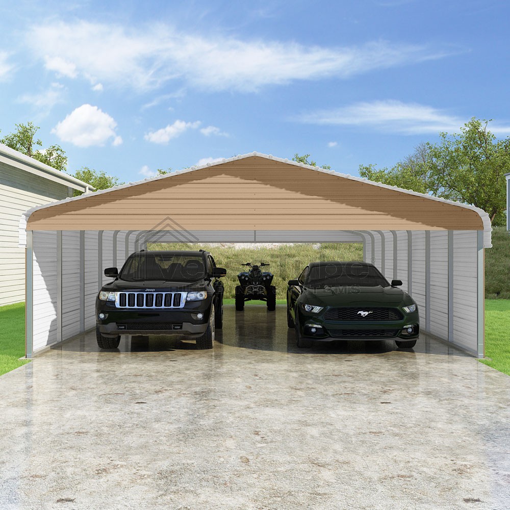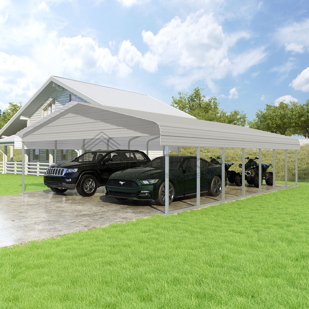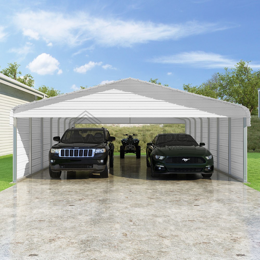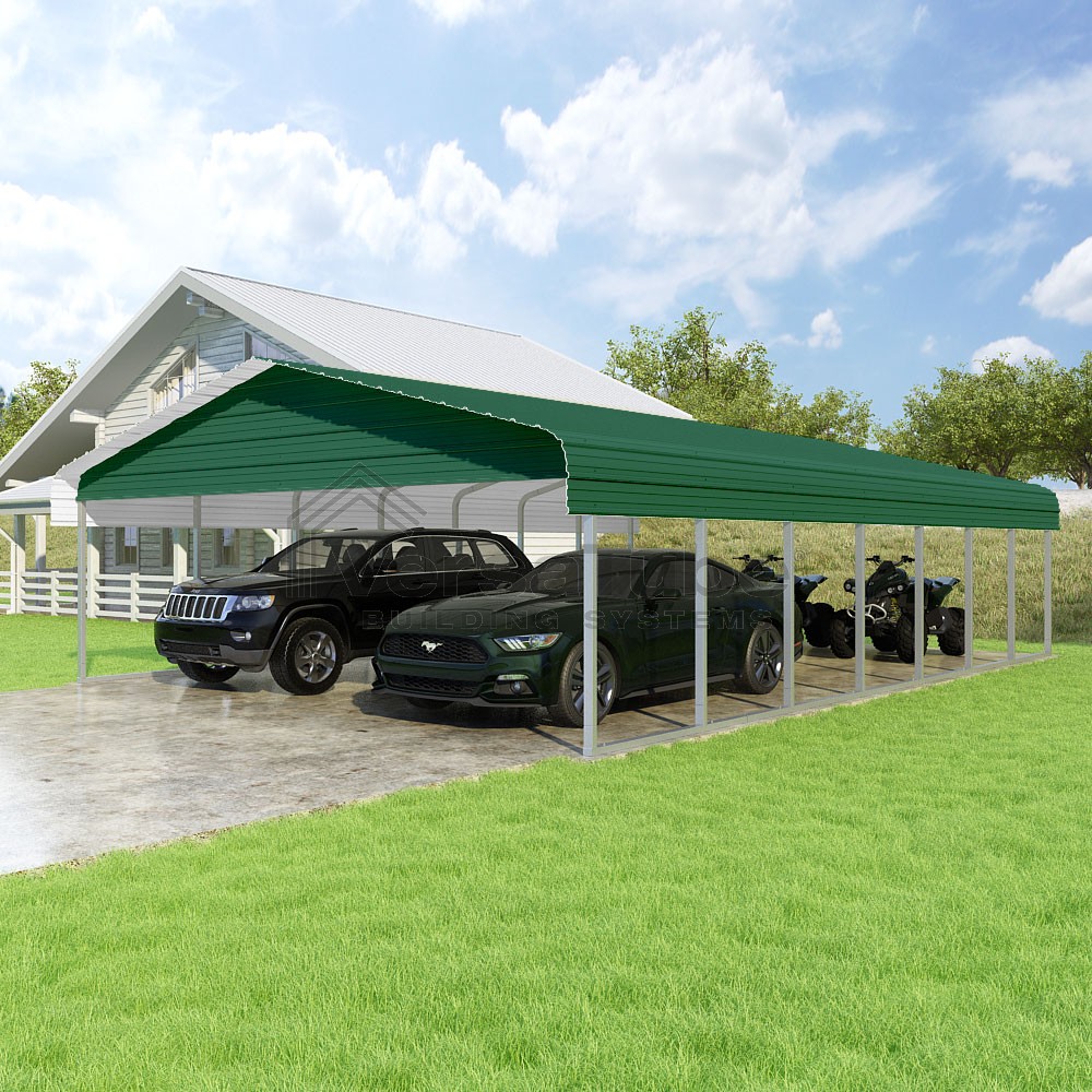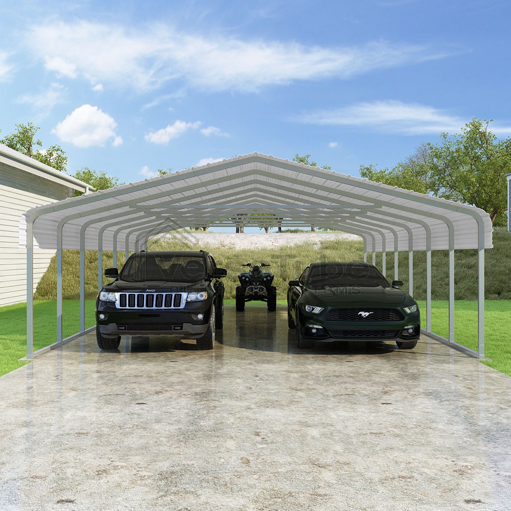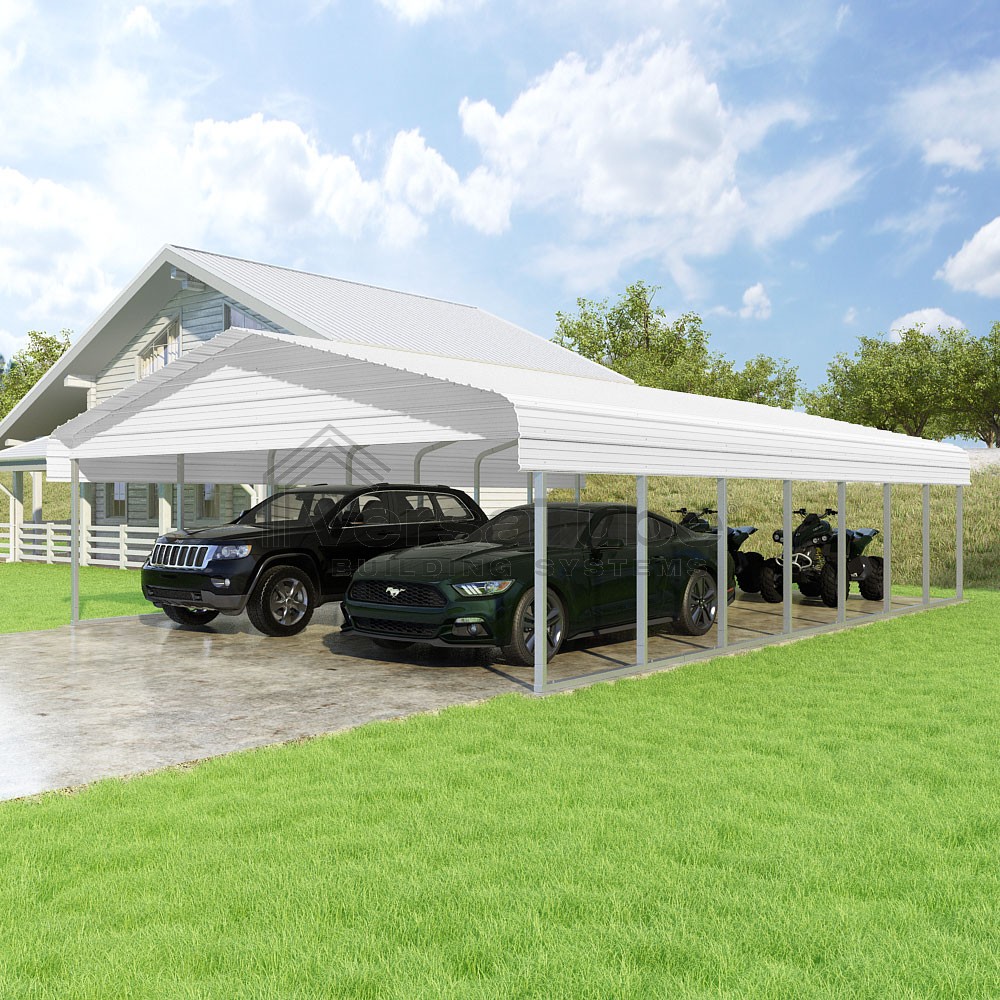 Classic Series DIY carport kit features horizontal application of sheet metal panels with the extra protection of rounded eaves.