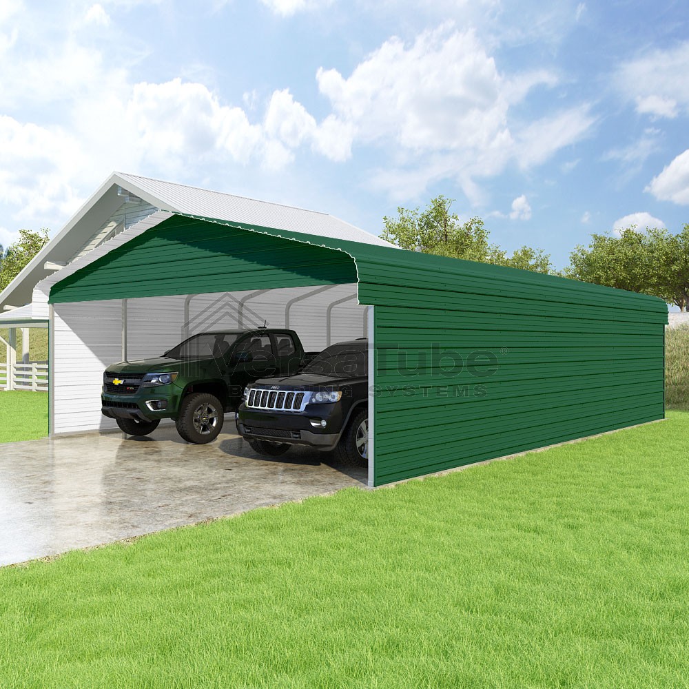 Classic Series DIY carport kit features horizontal application of sheet metal panels with the extra protection of rounded eaves.