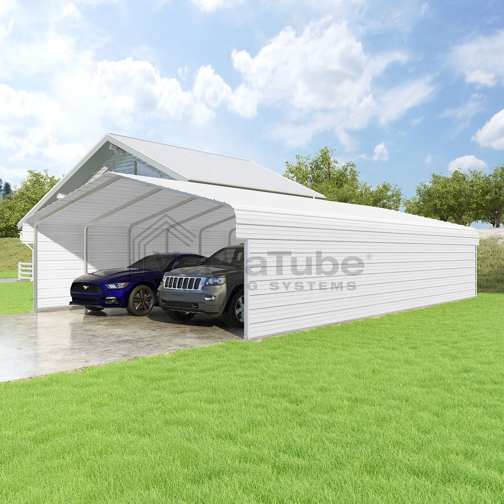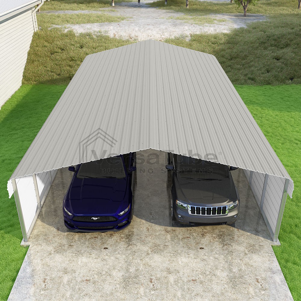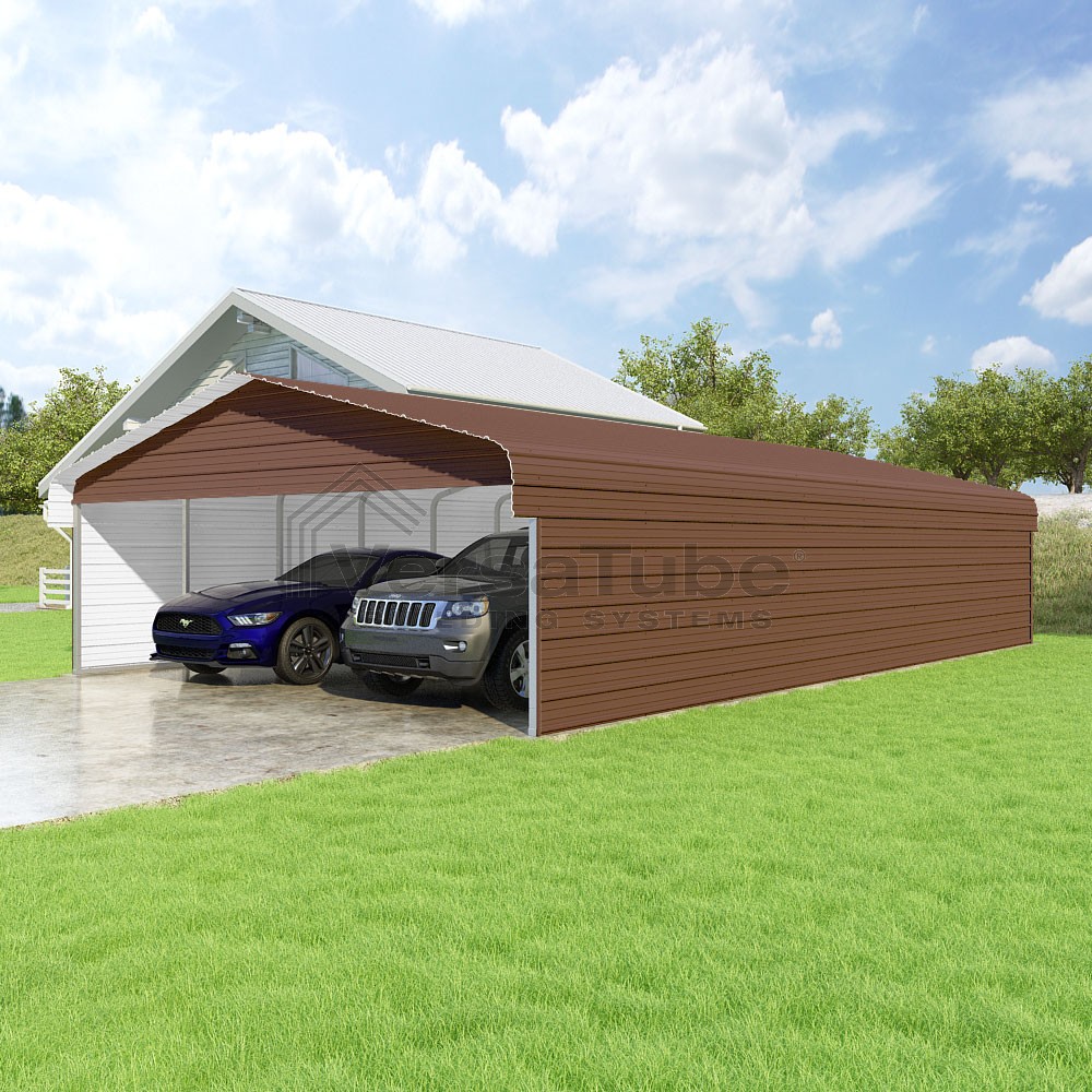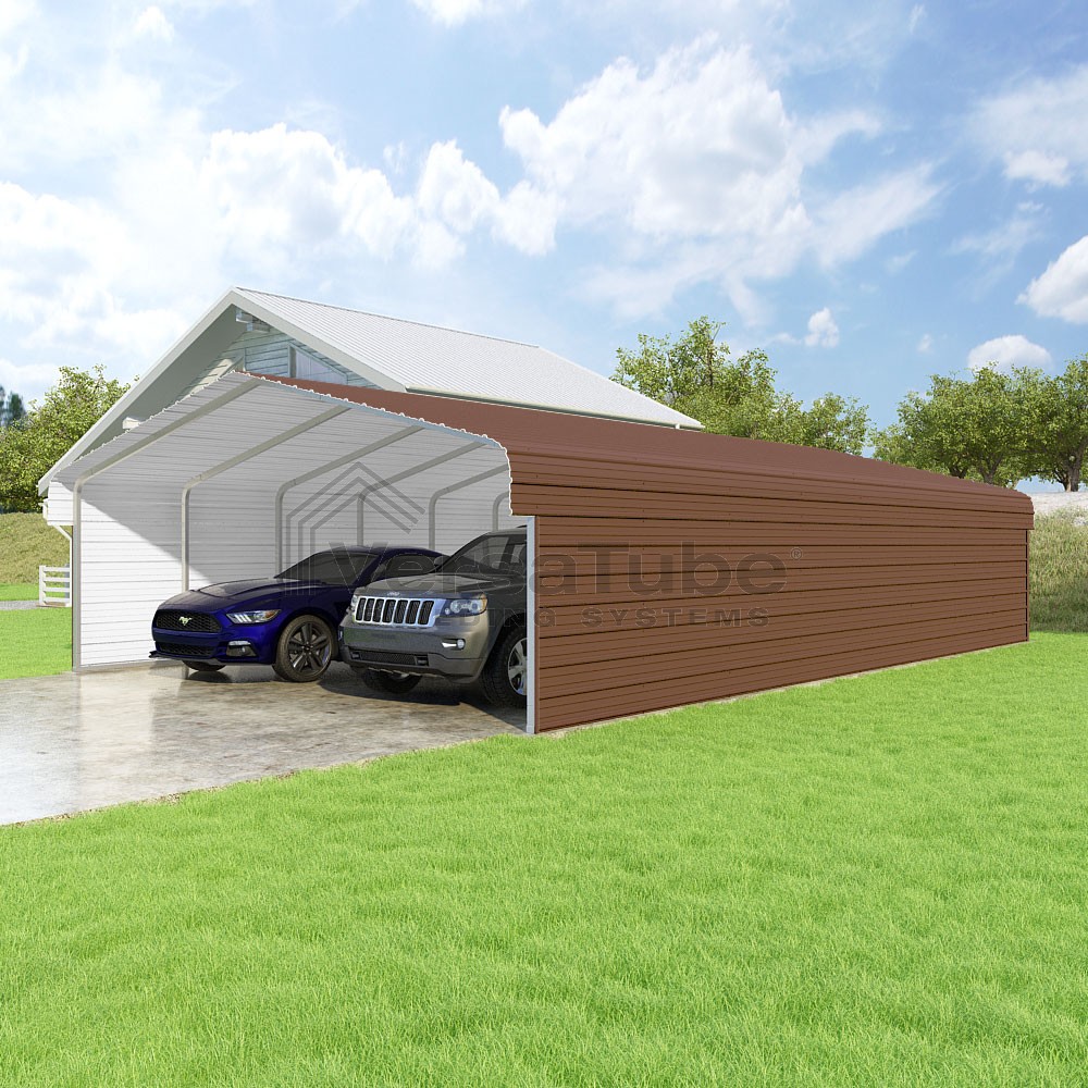 Classic Series DIY carport kit features horizontal application of sheet metal panels with the extra protection of rounded eaves.