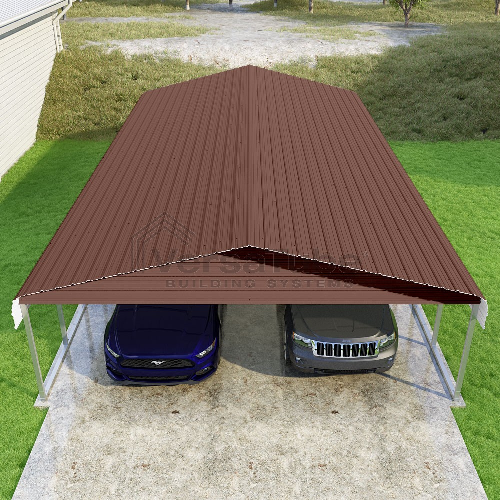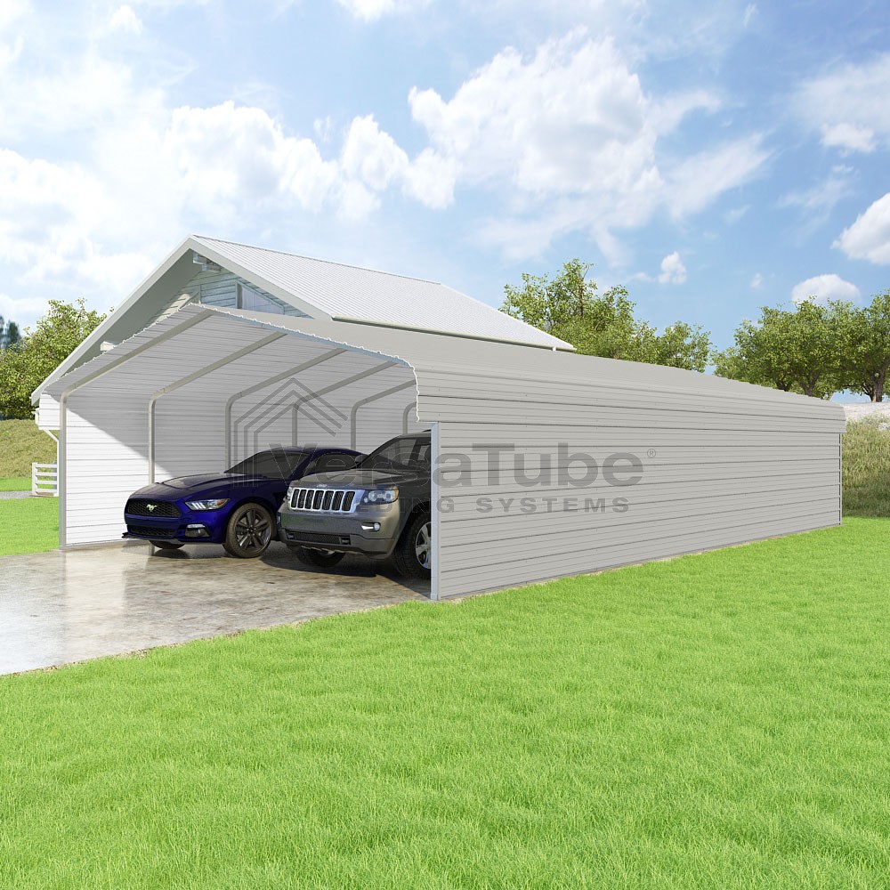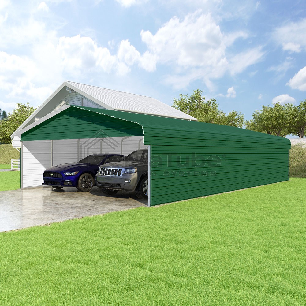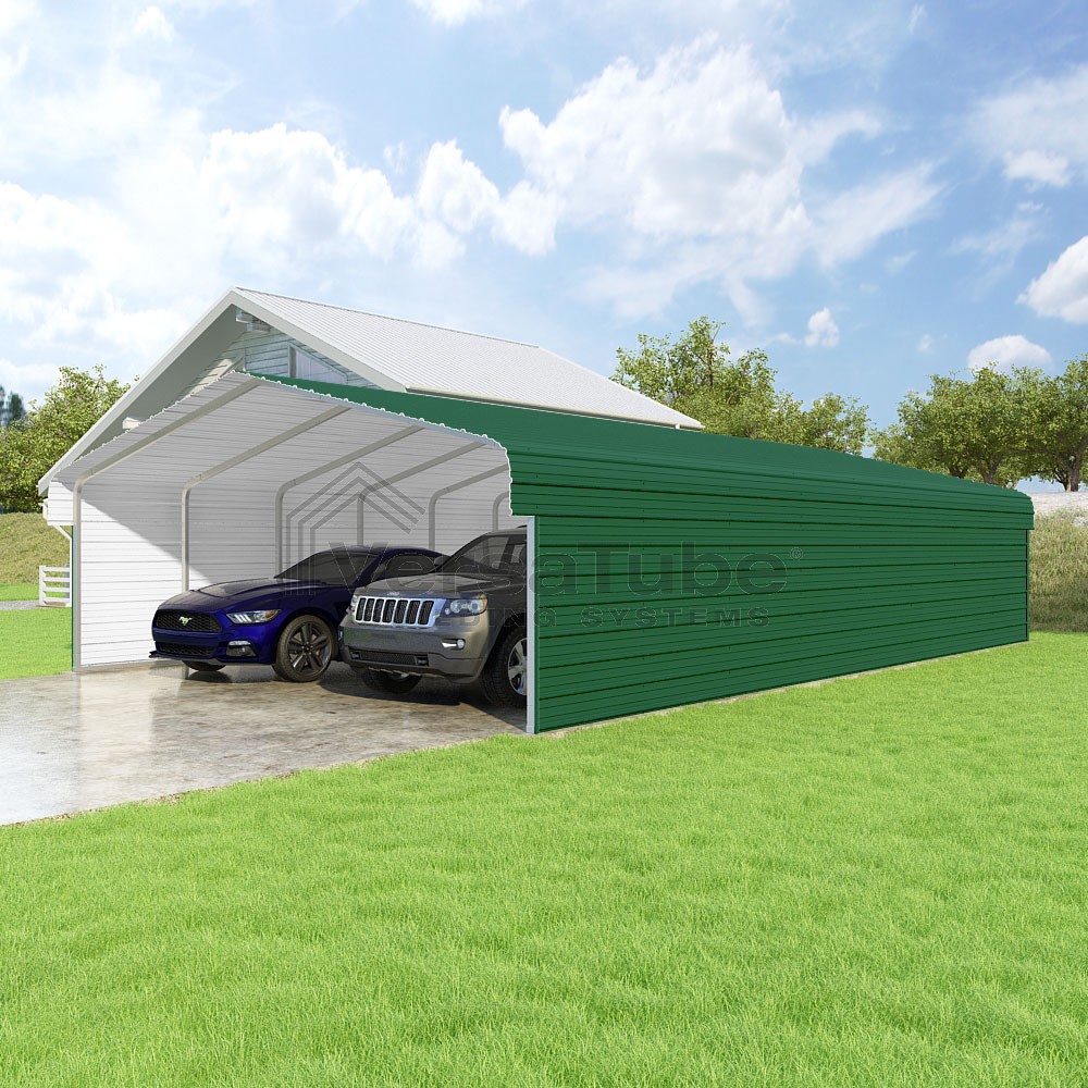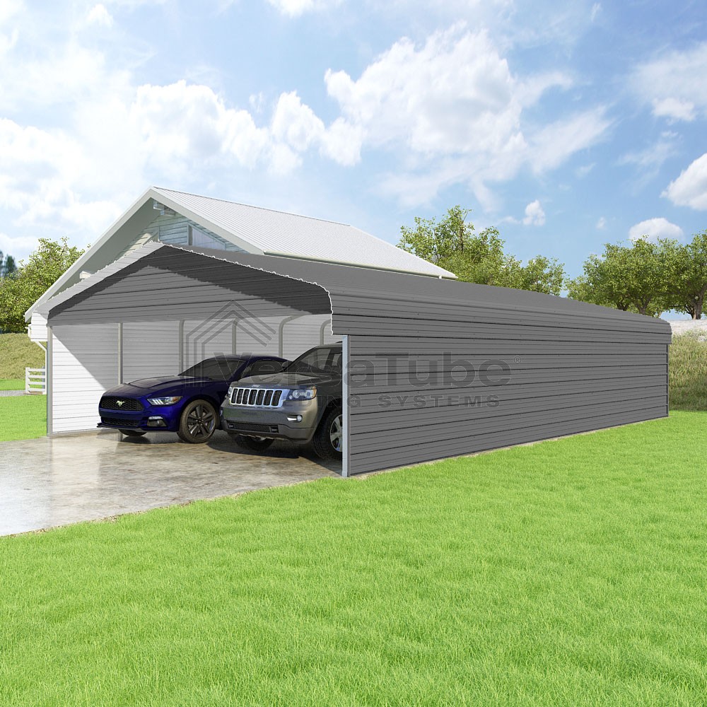 Classic Series DIY carport kit features horizontal application of sheet metal panels with the extra protection of rounded eaves.