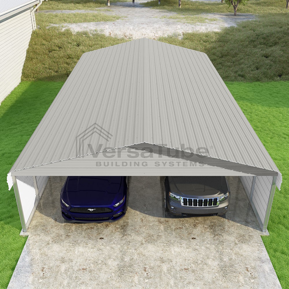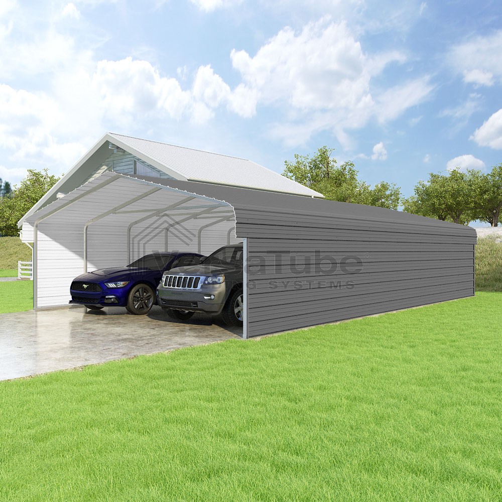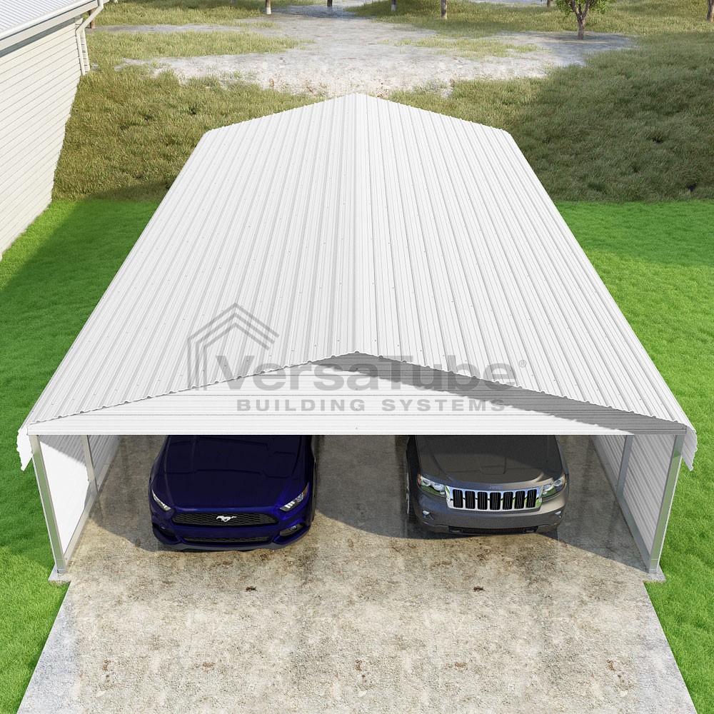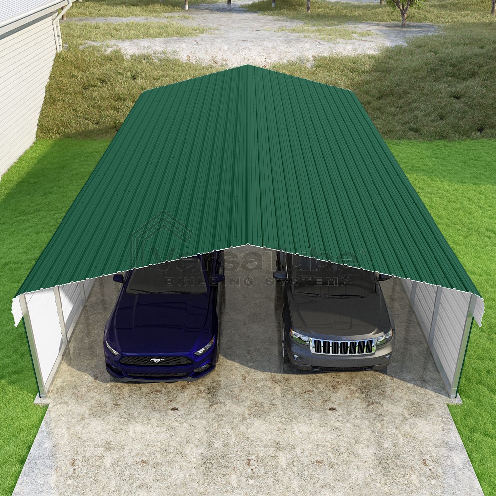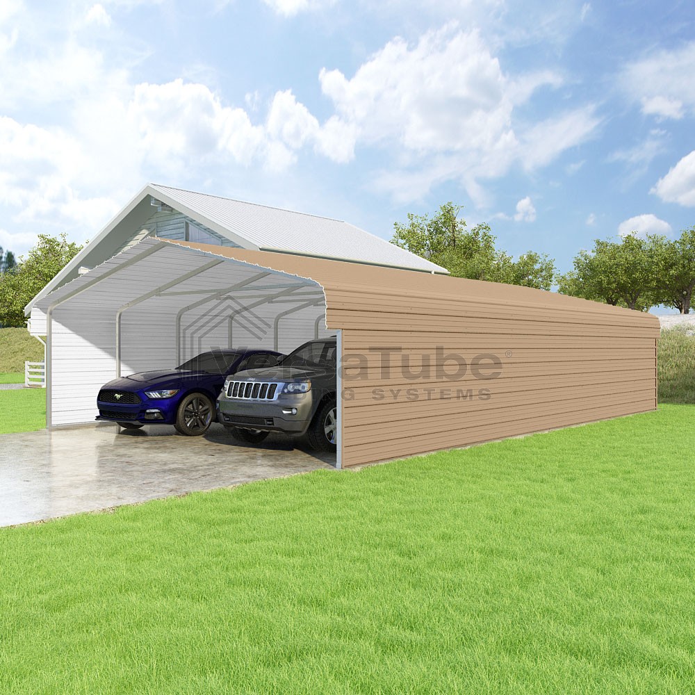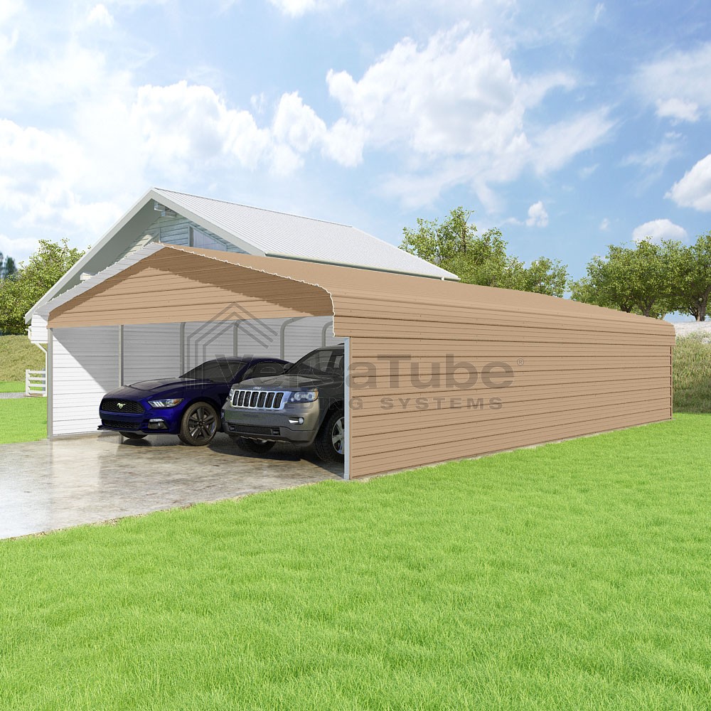 Classic Series DIY carport kit features horizontal application of sheet metal panels with the extra protection of rounded eaves.