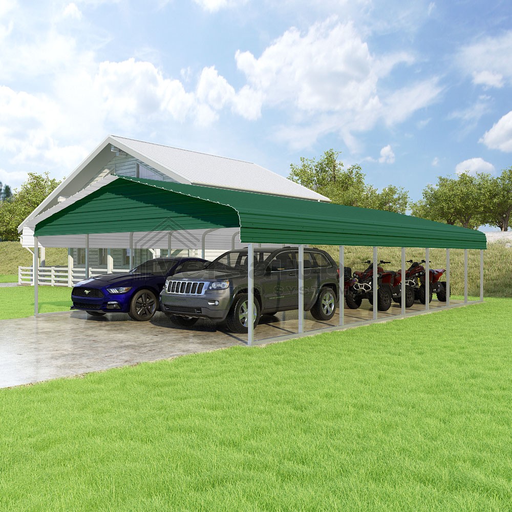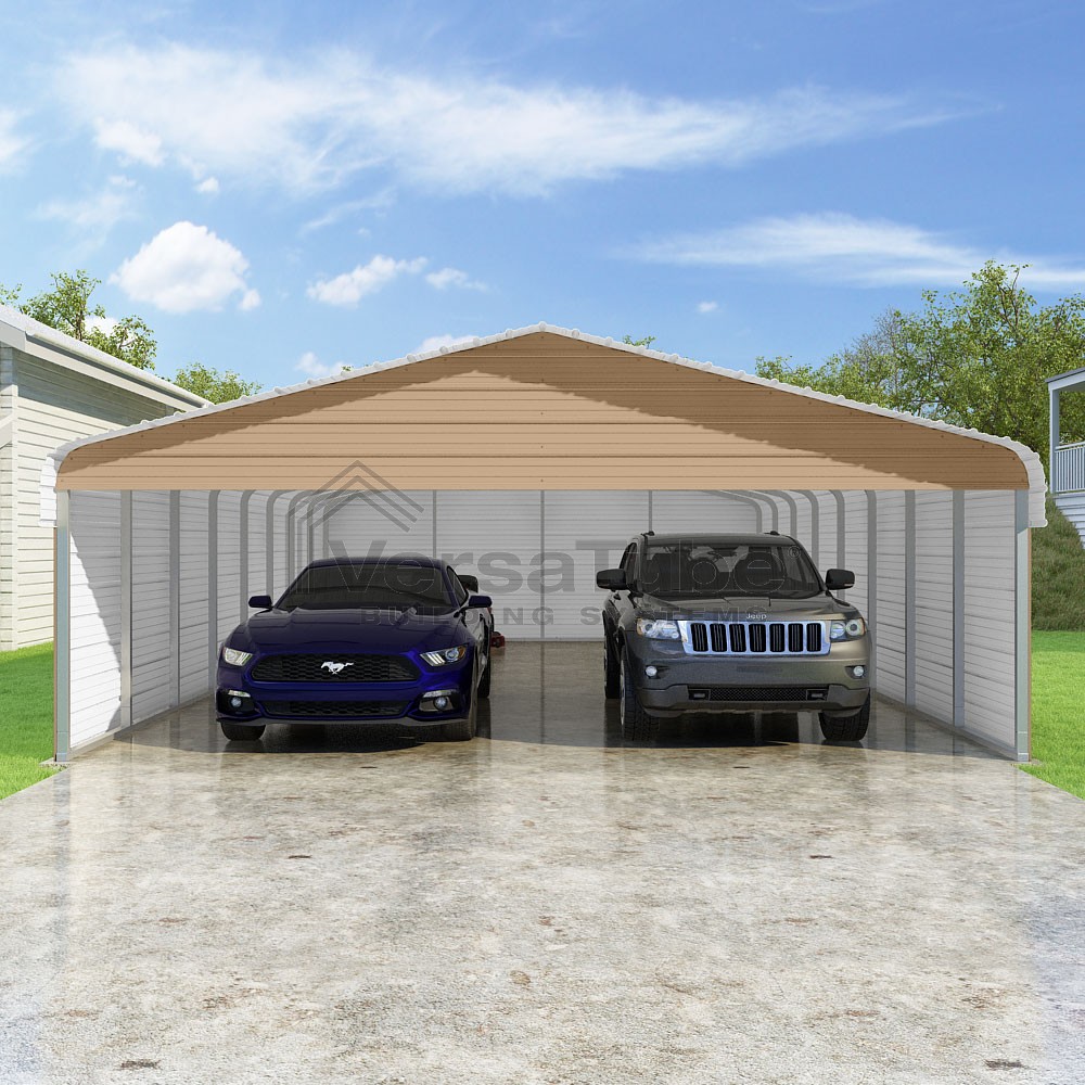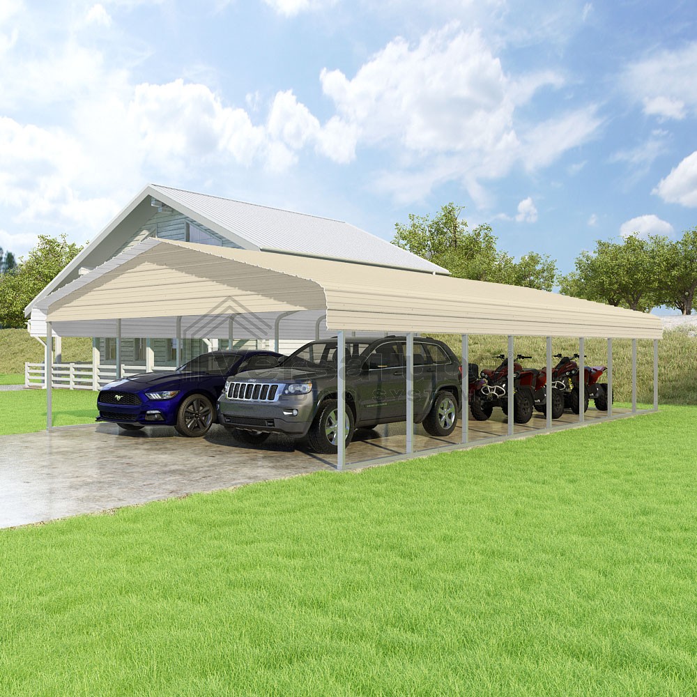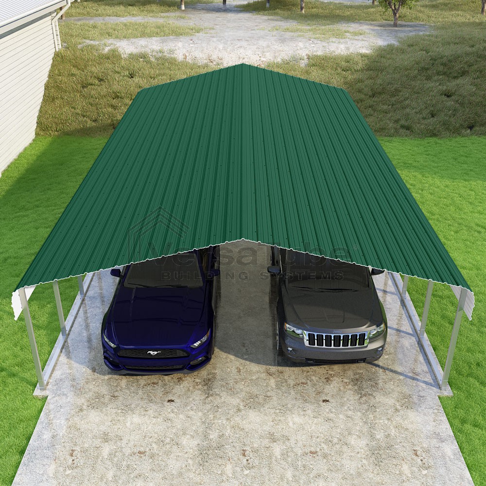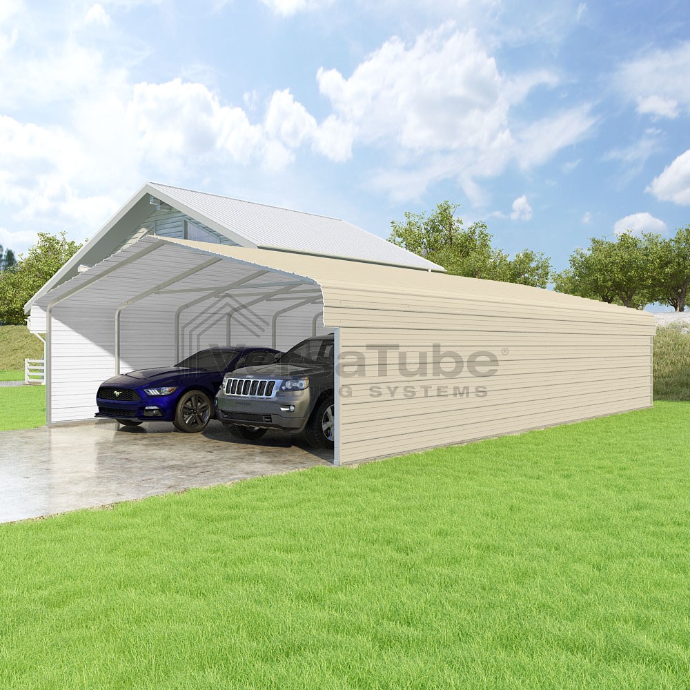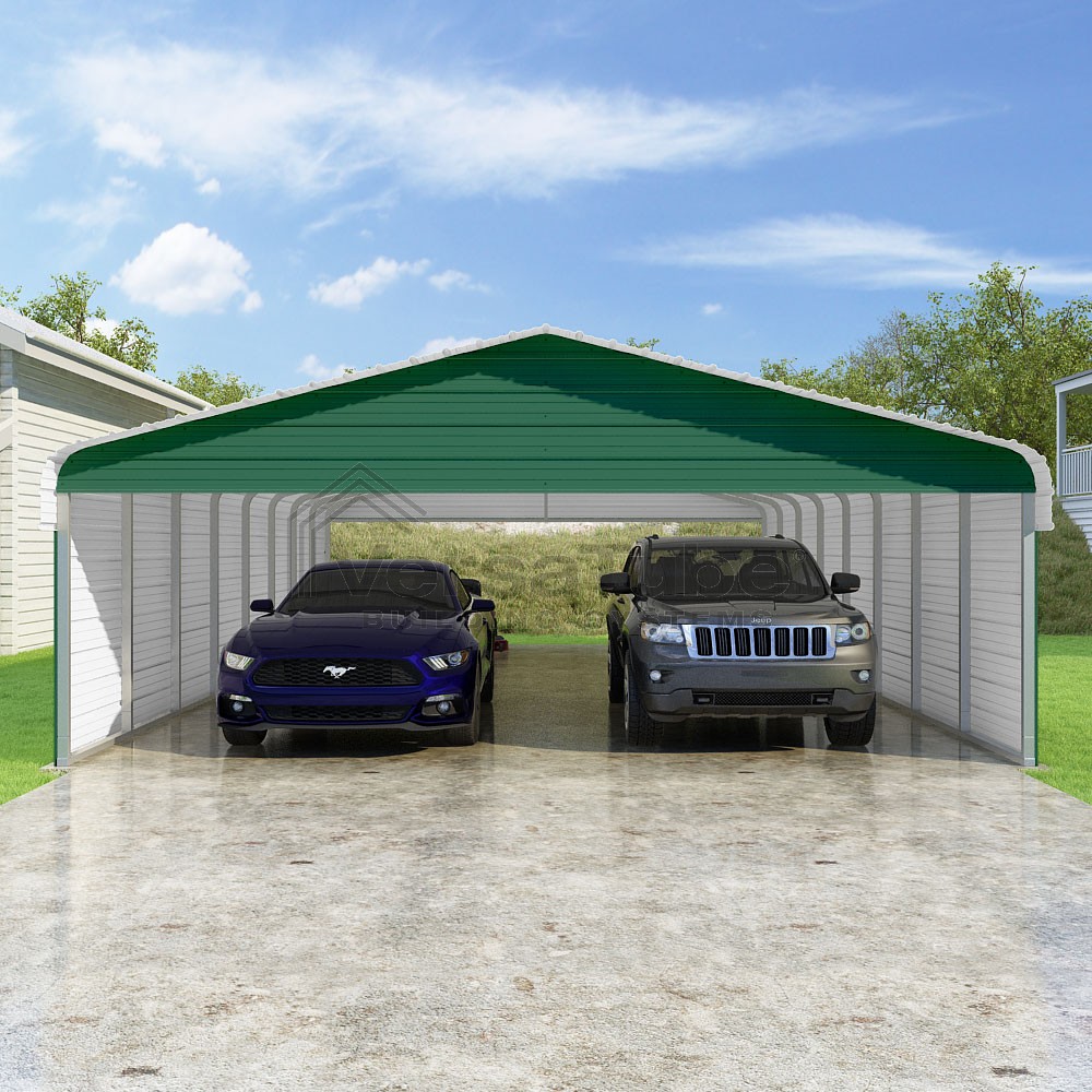 Classic Series DIY carport kit features horizontal application of sheet metal panels with the extra protection of rounded eaves.