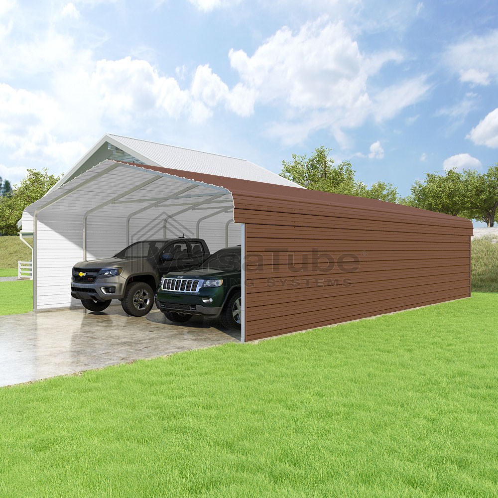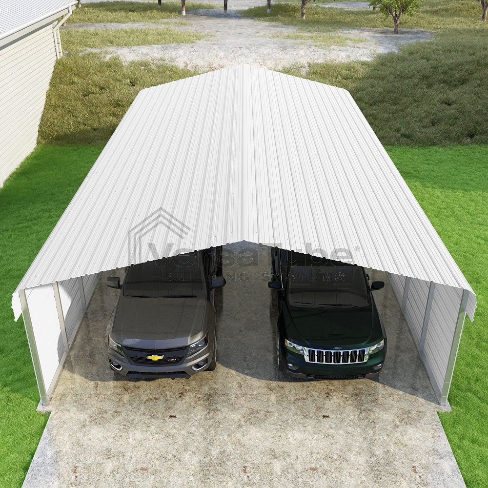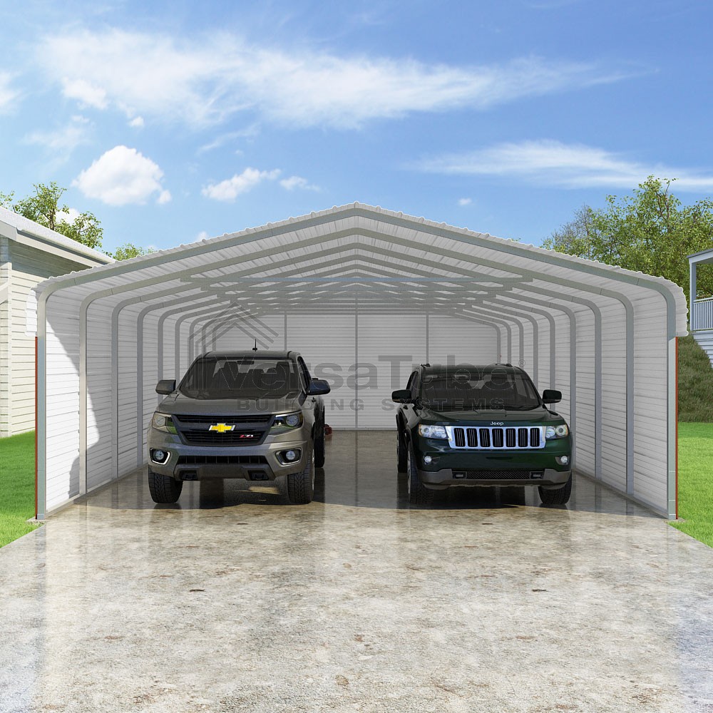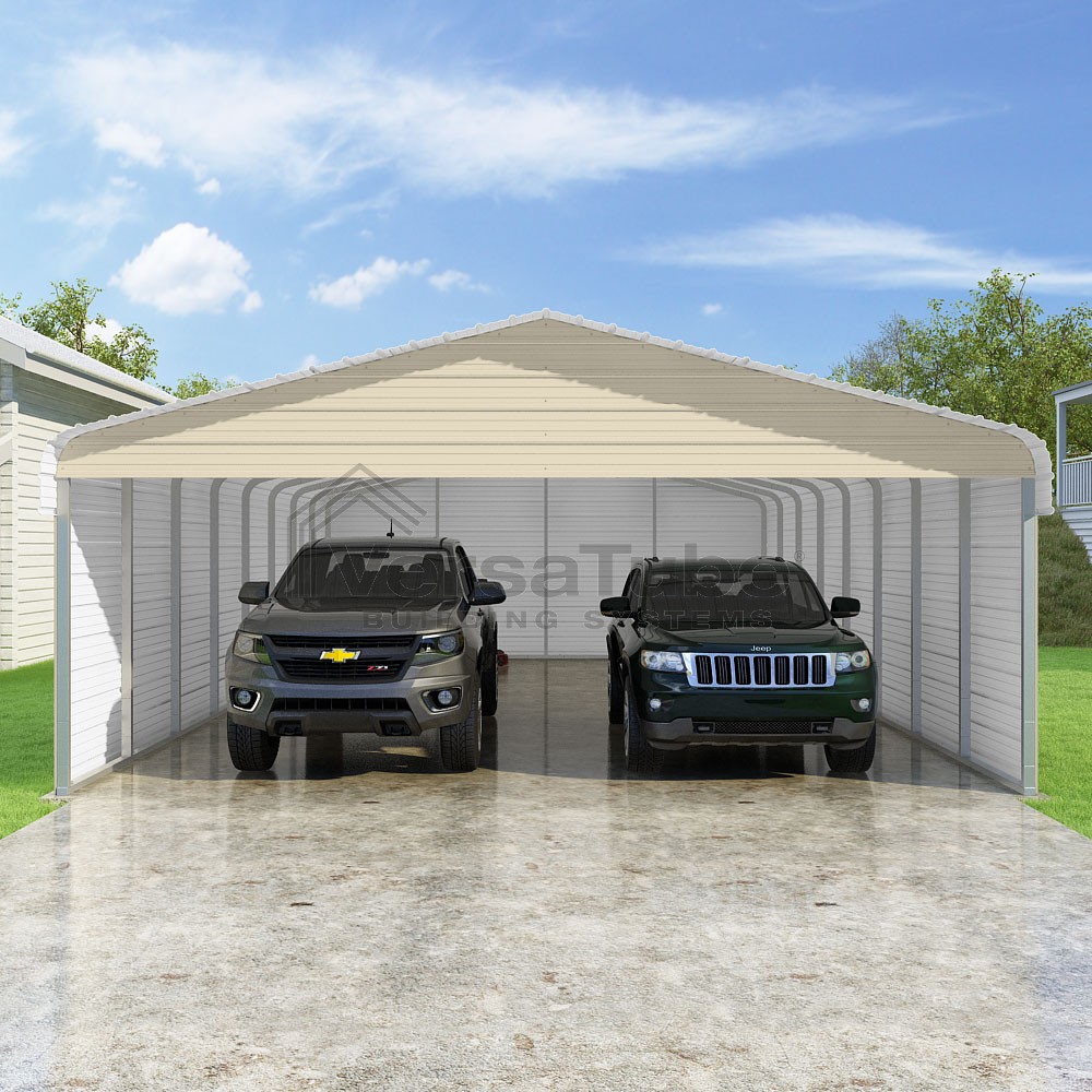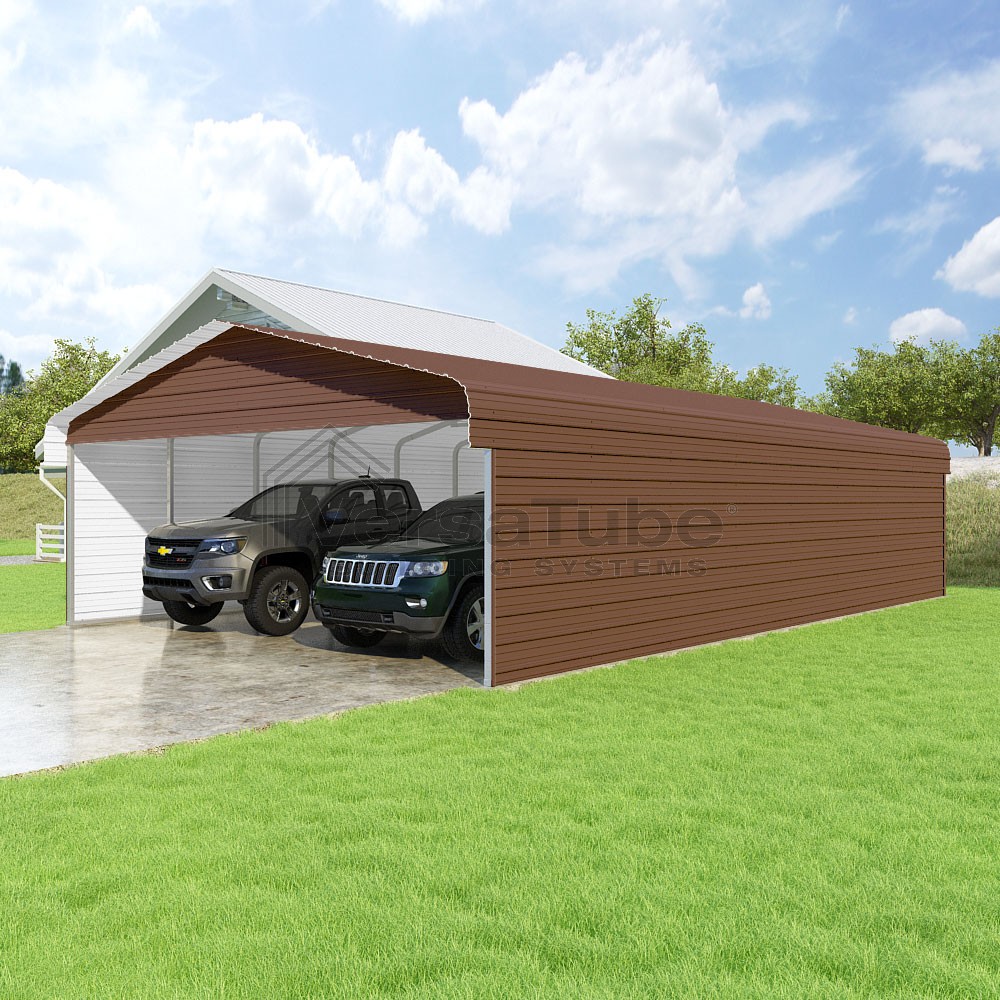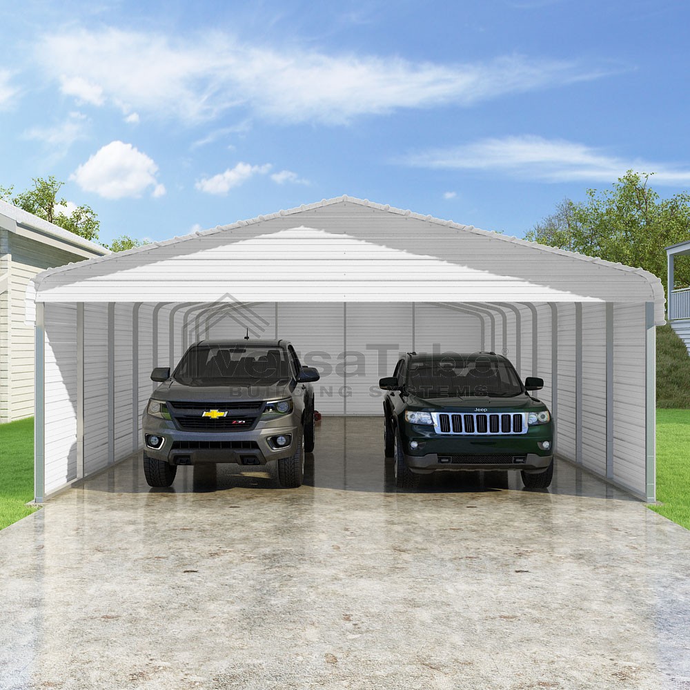 Classic Series DIY carport kit features horizontal application of sheet metal panels with the extra protection of rounded eaves.