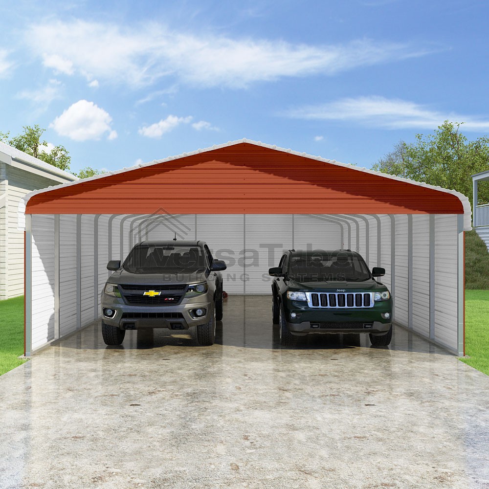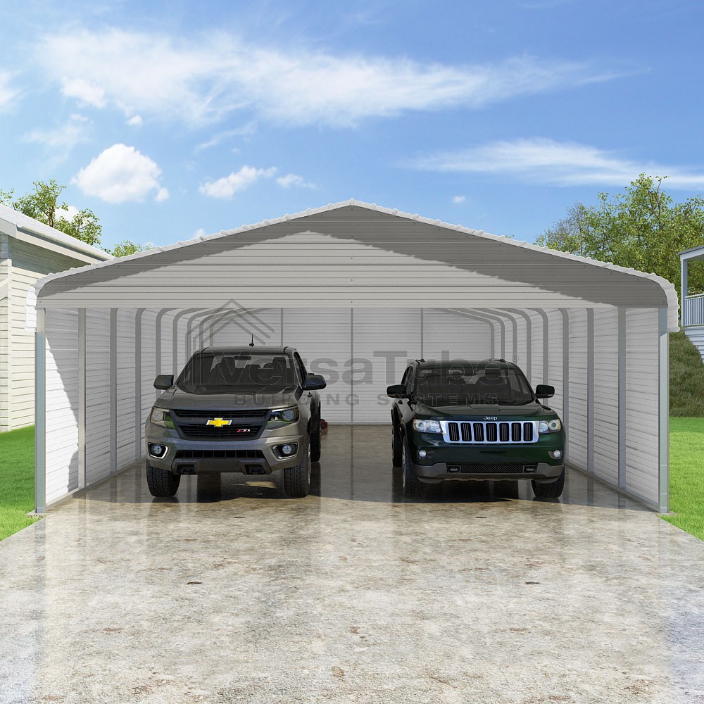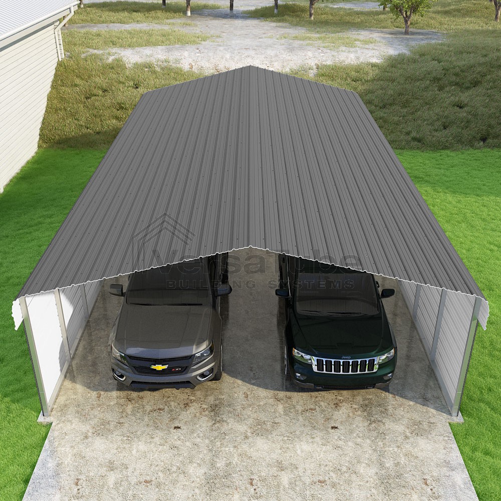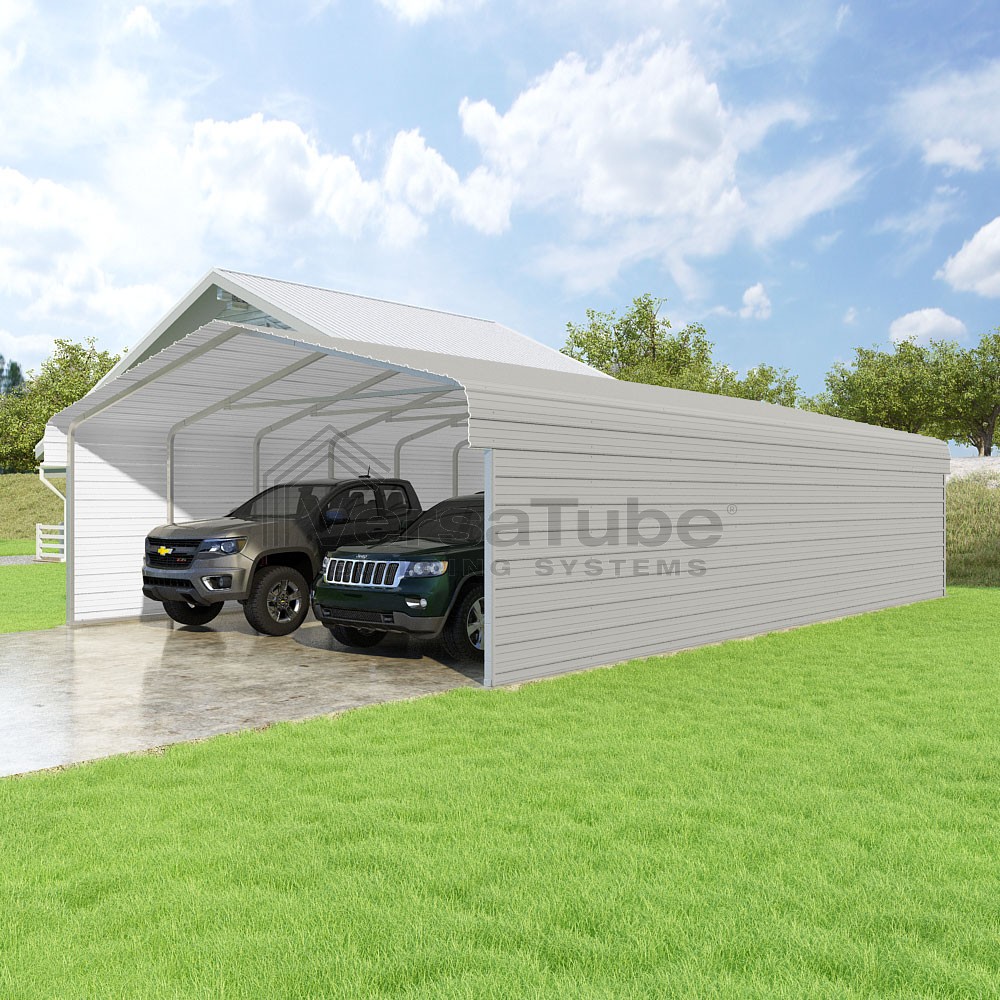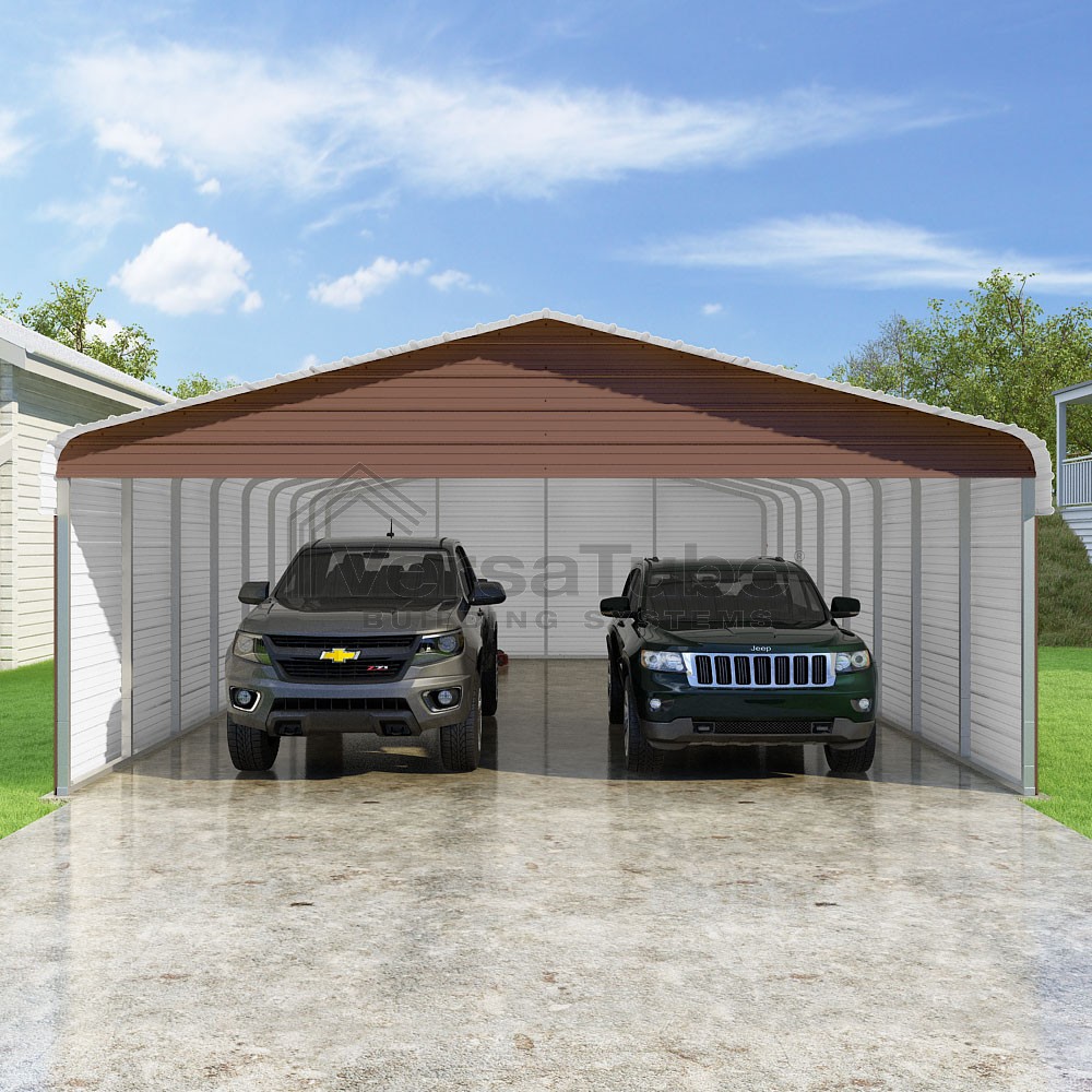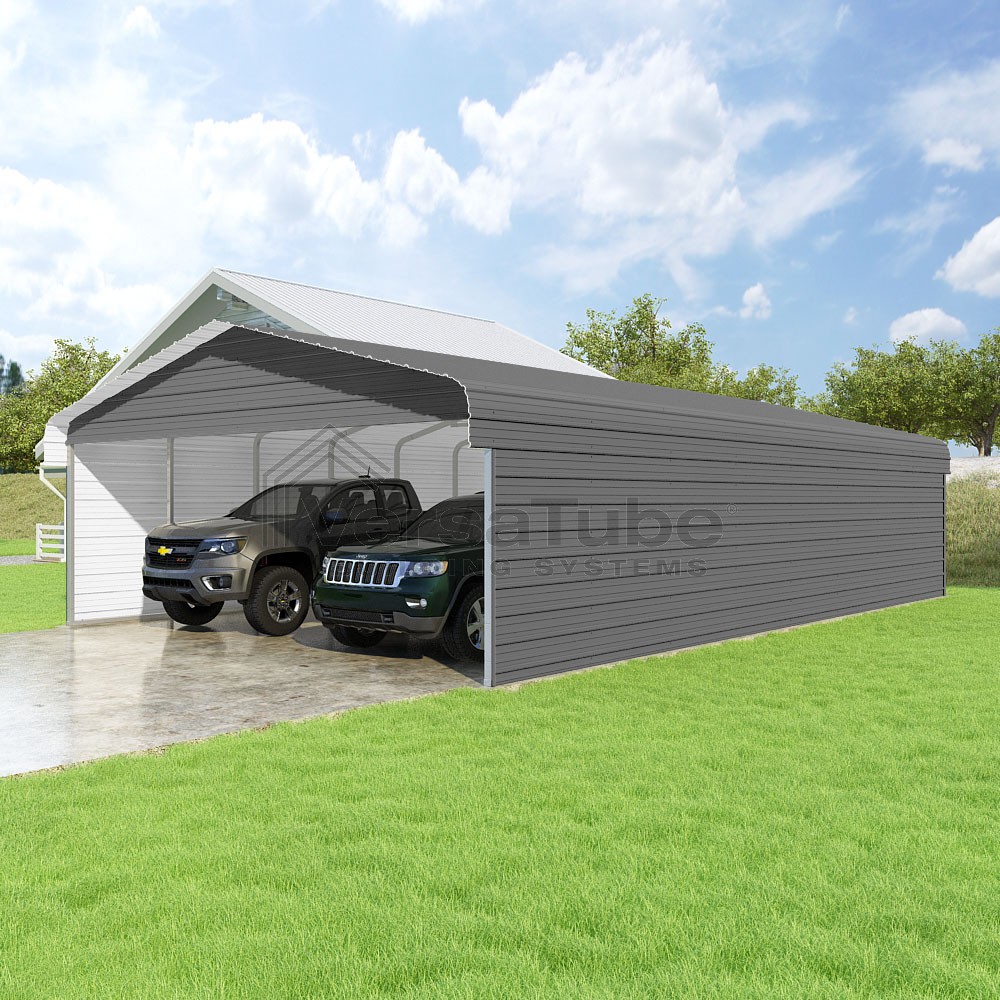 Classic Series DIY carport kit features horizontal application of sheet metal panels with the extra protection of rounded eaves.