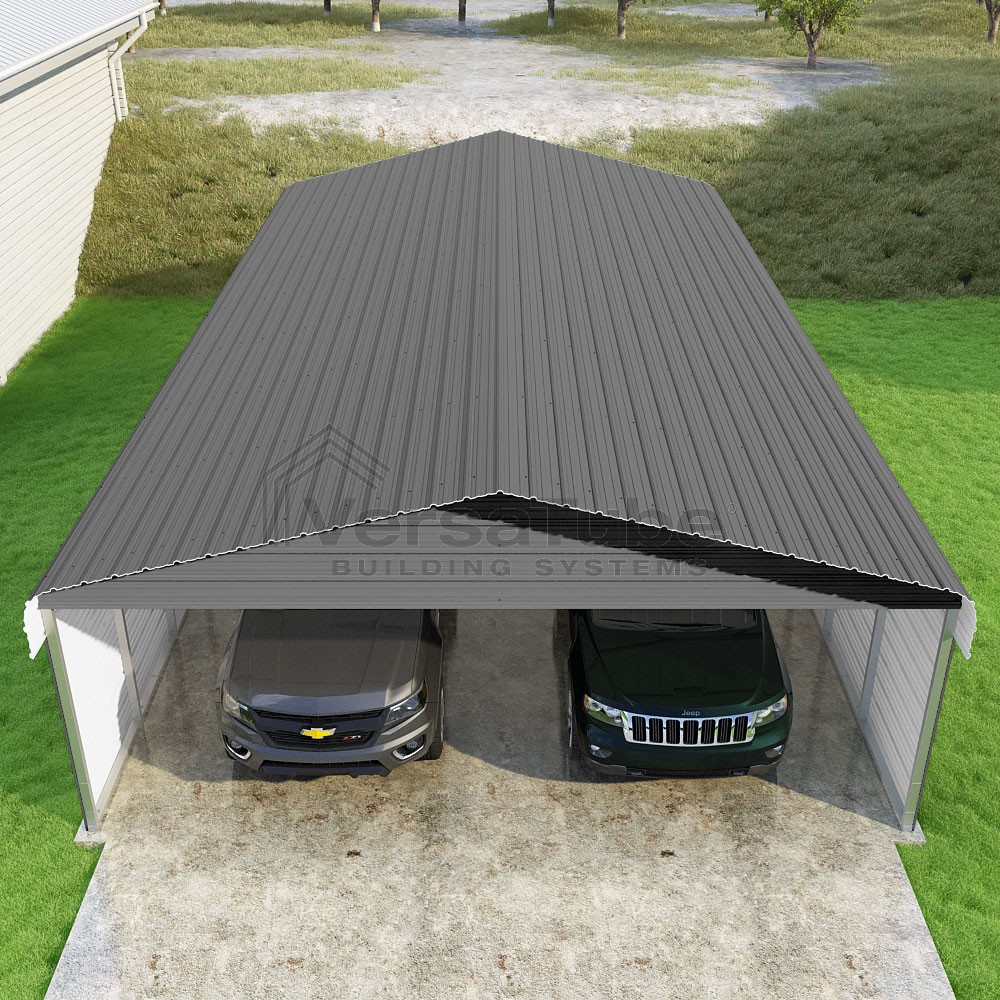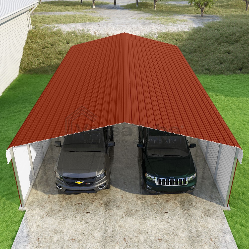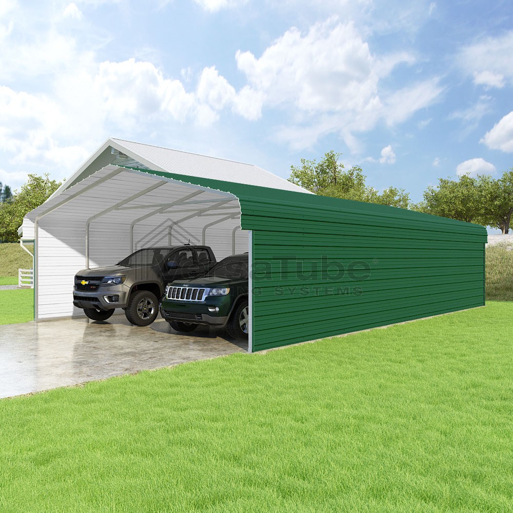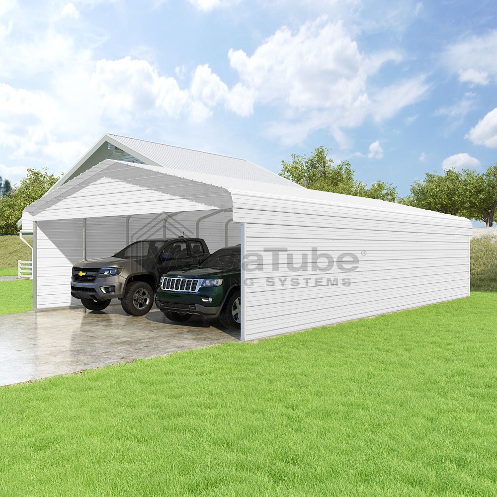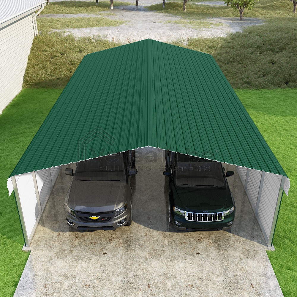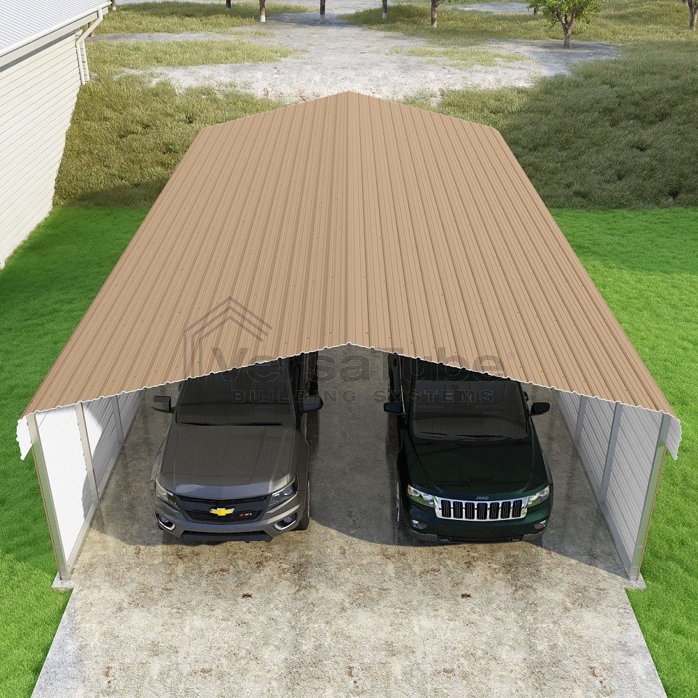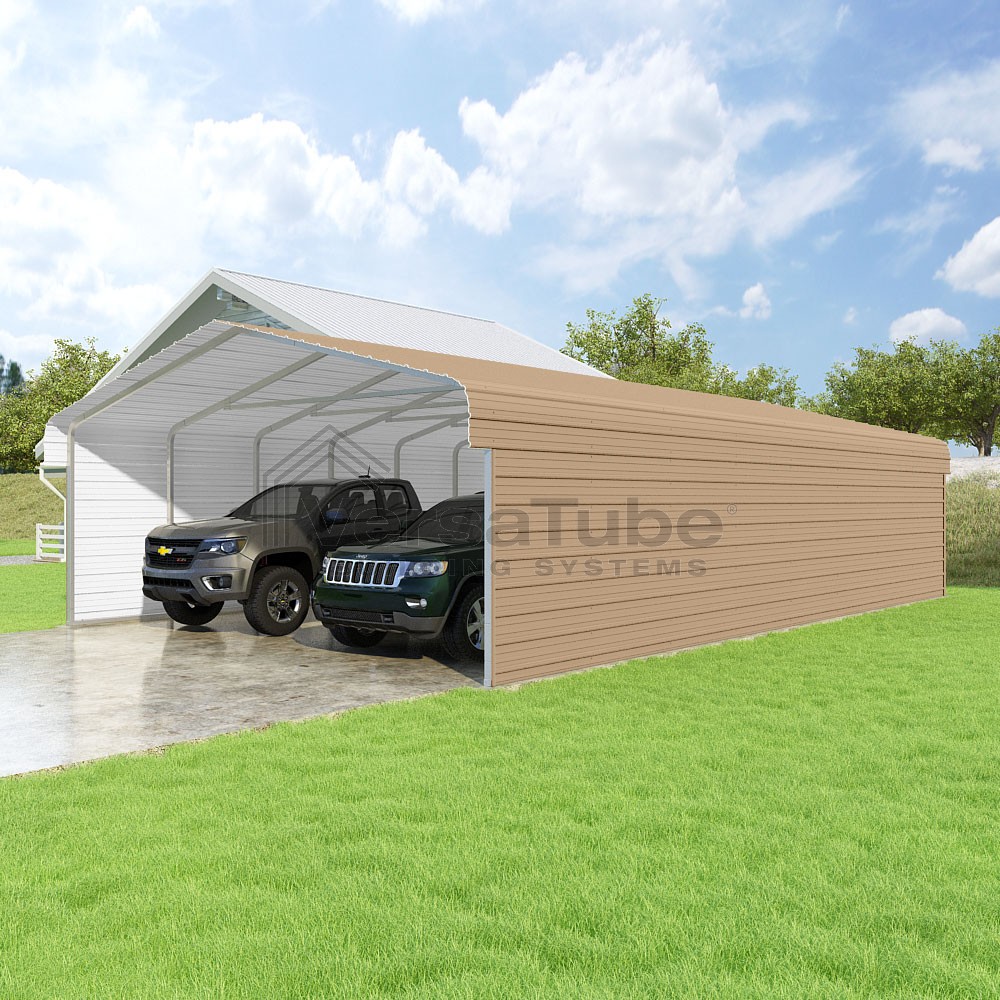 Classic Series DIY carport kit features horizontal application of sheet metal panels with the extra protection of rounded eaves.