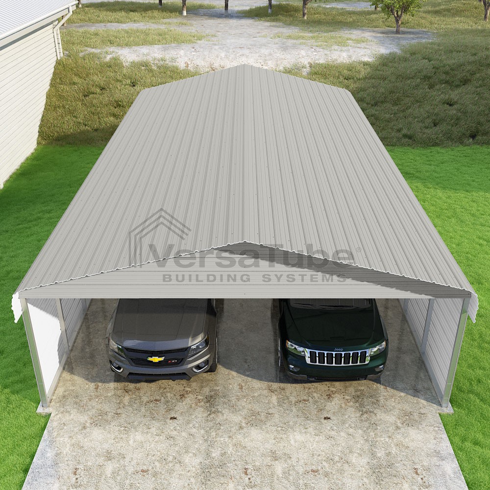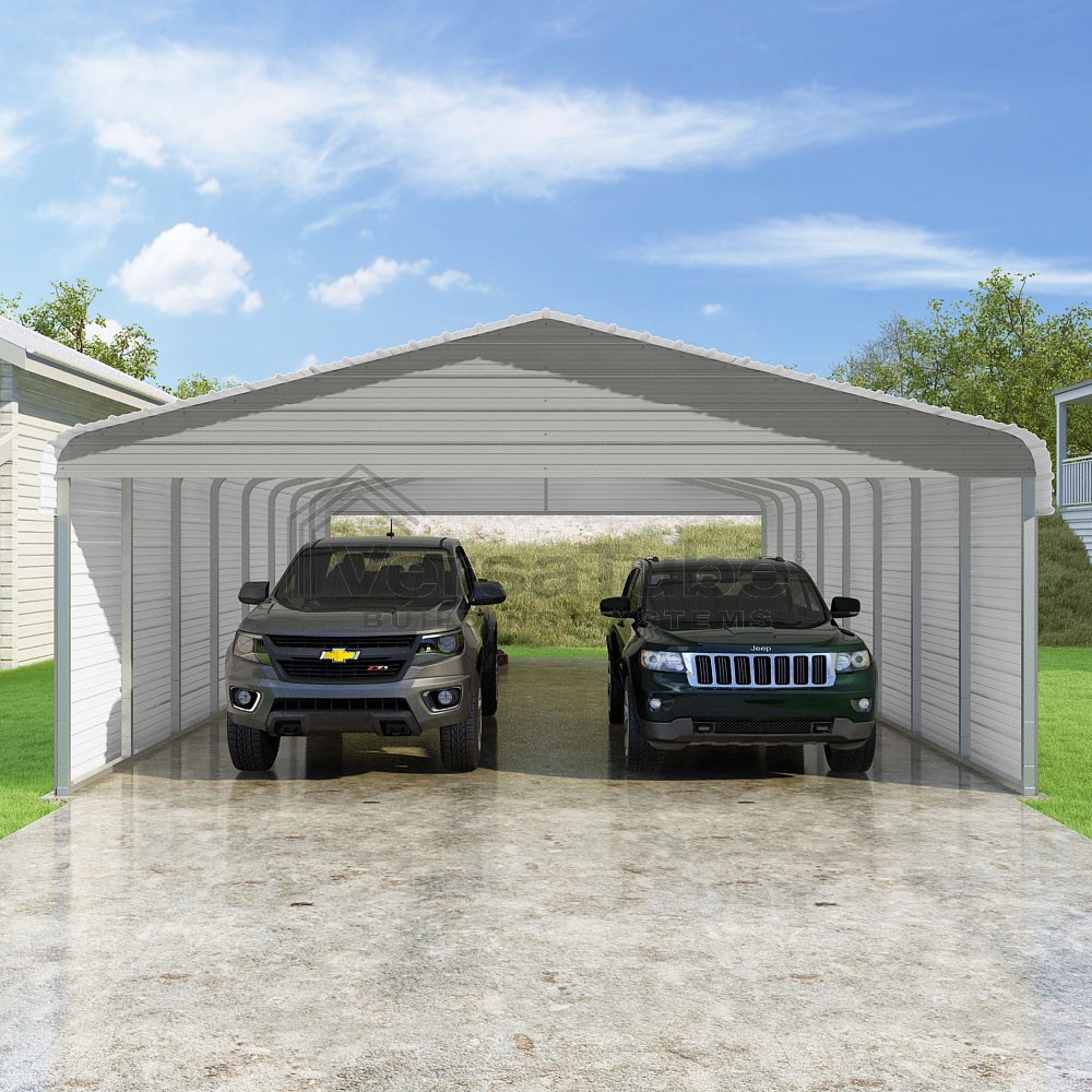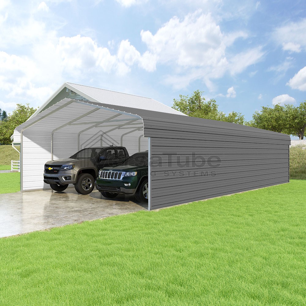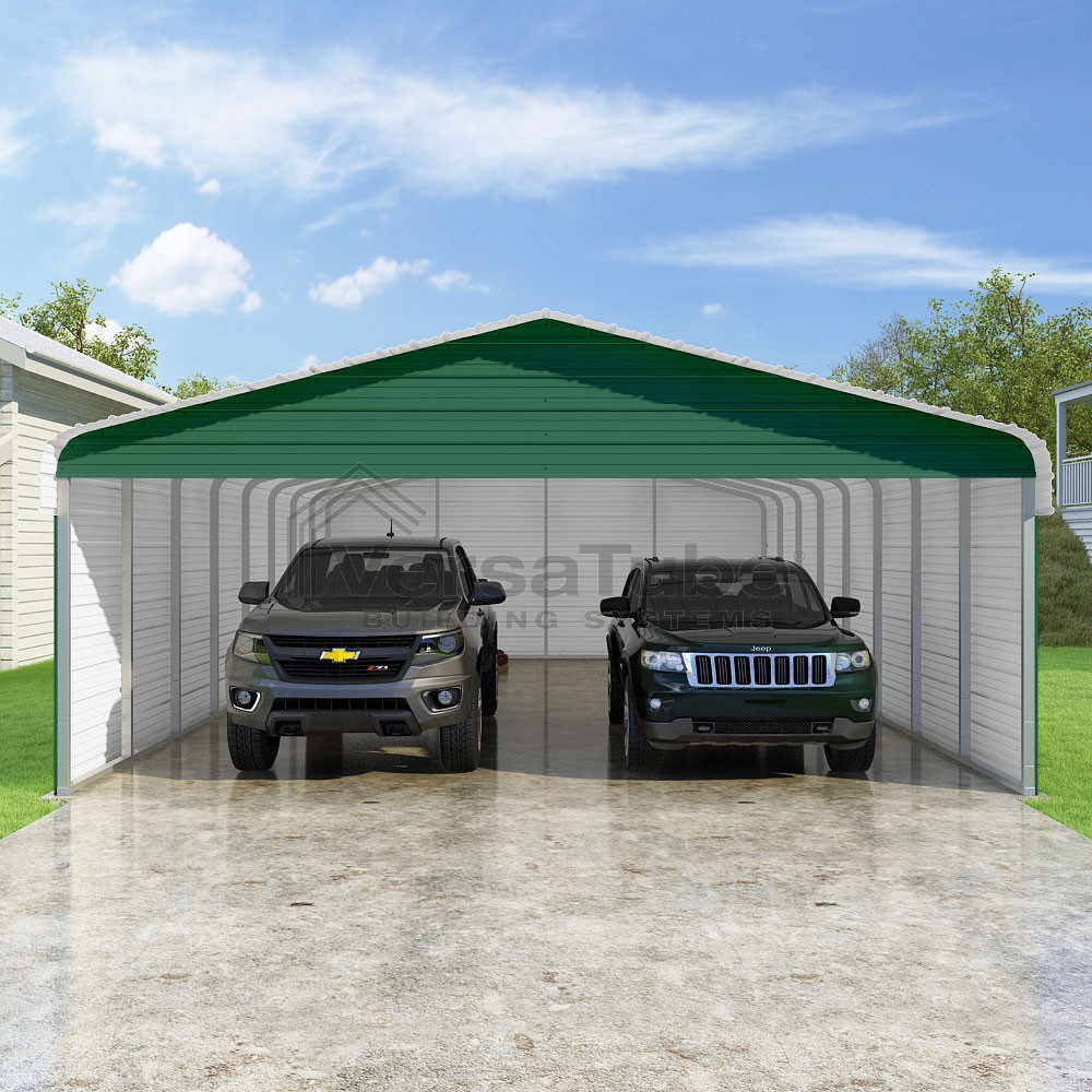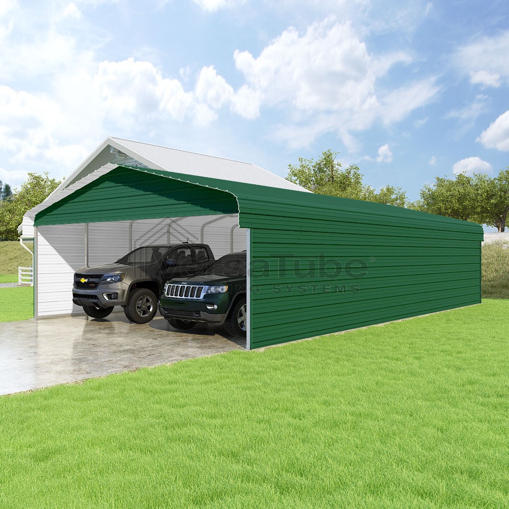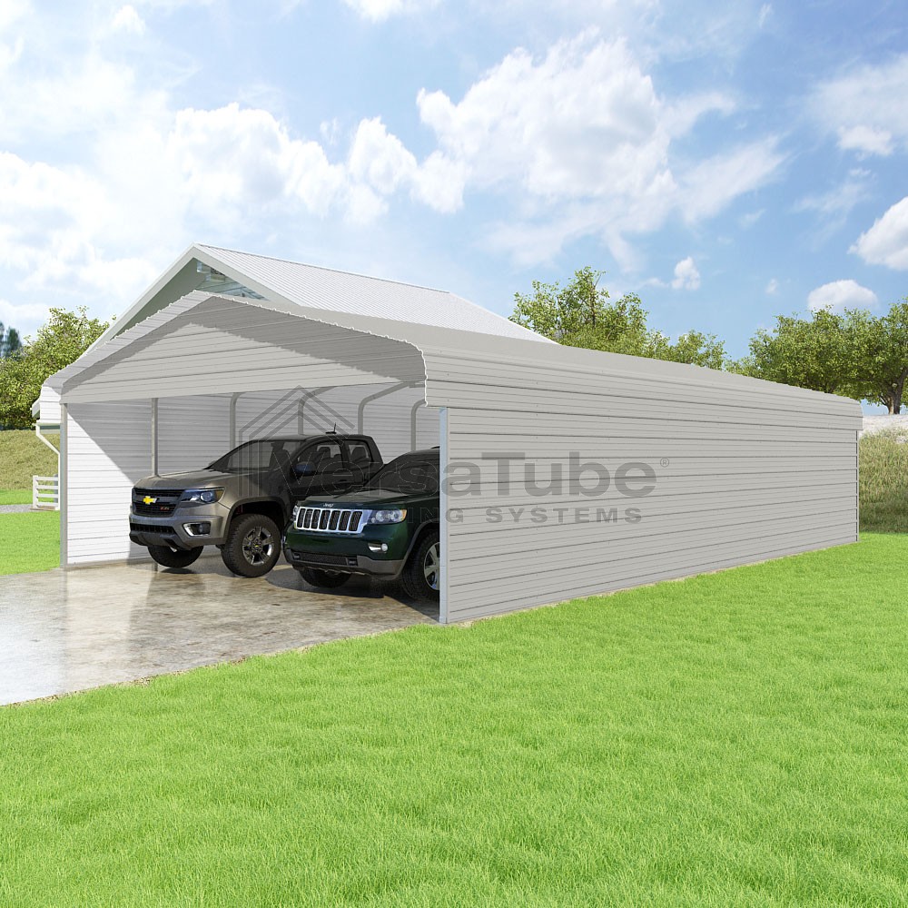 Classic Series DIY carport kit features horizontal application of sheet metal panels with the extra protection of rounded eaves.