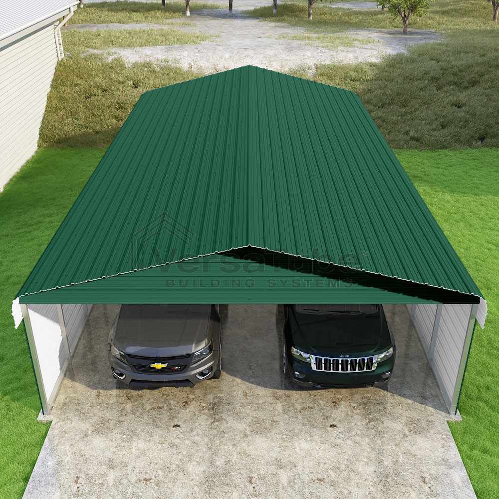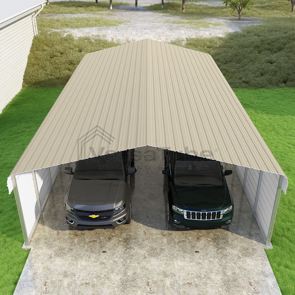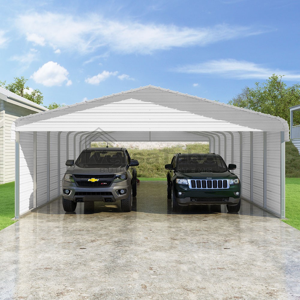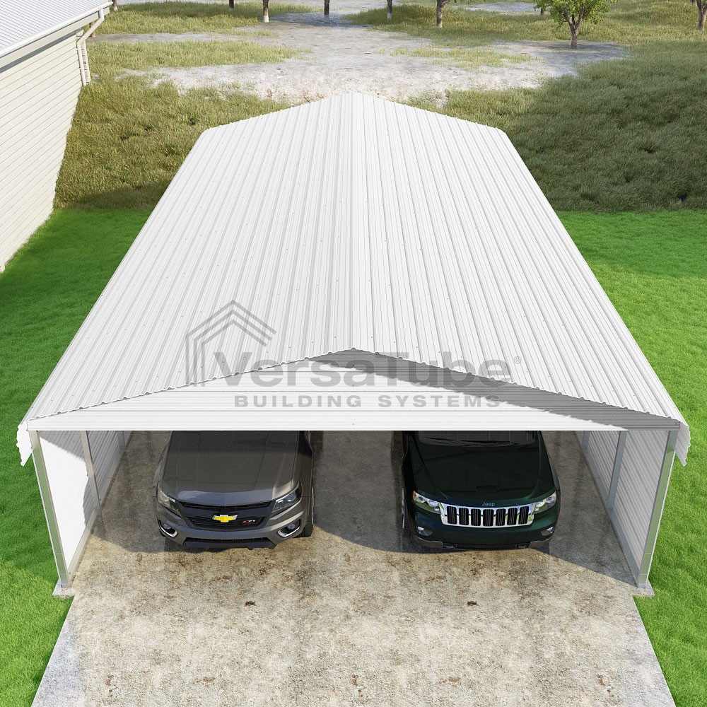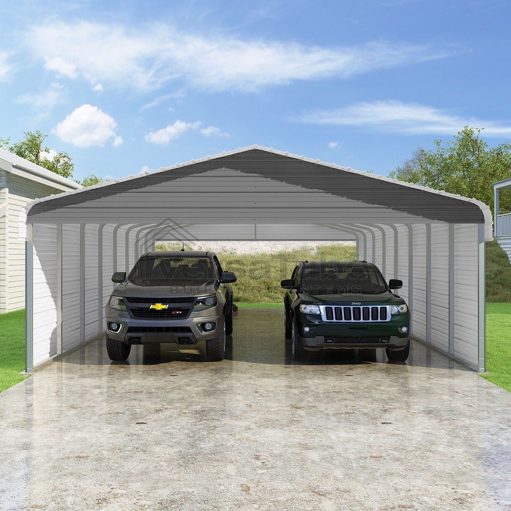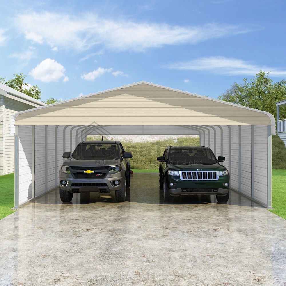 Classic Series DIY carport kit features horizontal application of sheet metal panels with the extra protection of rounded eaves.