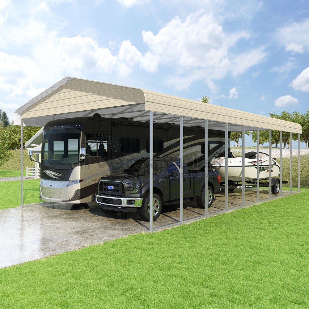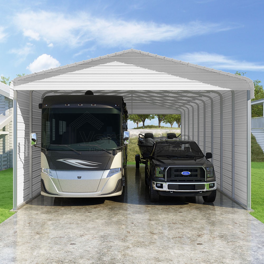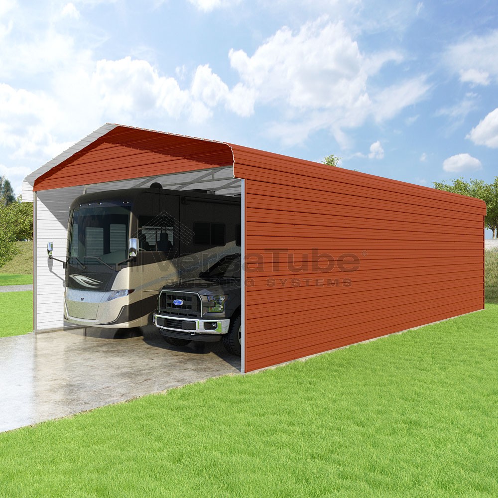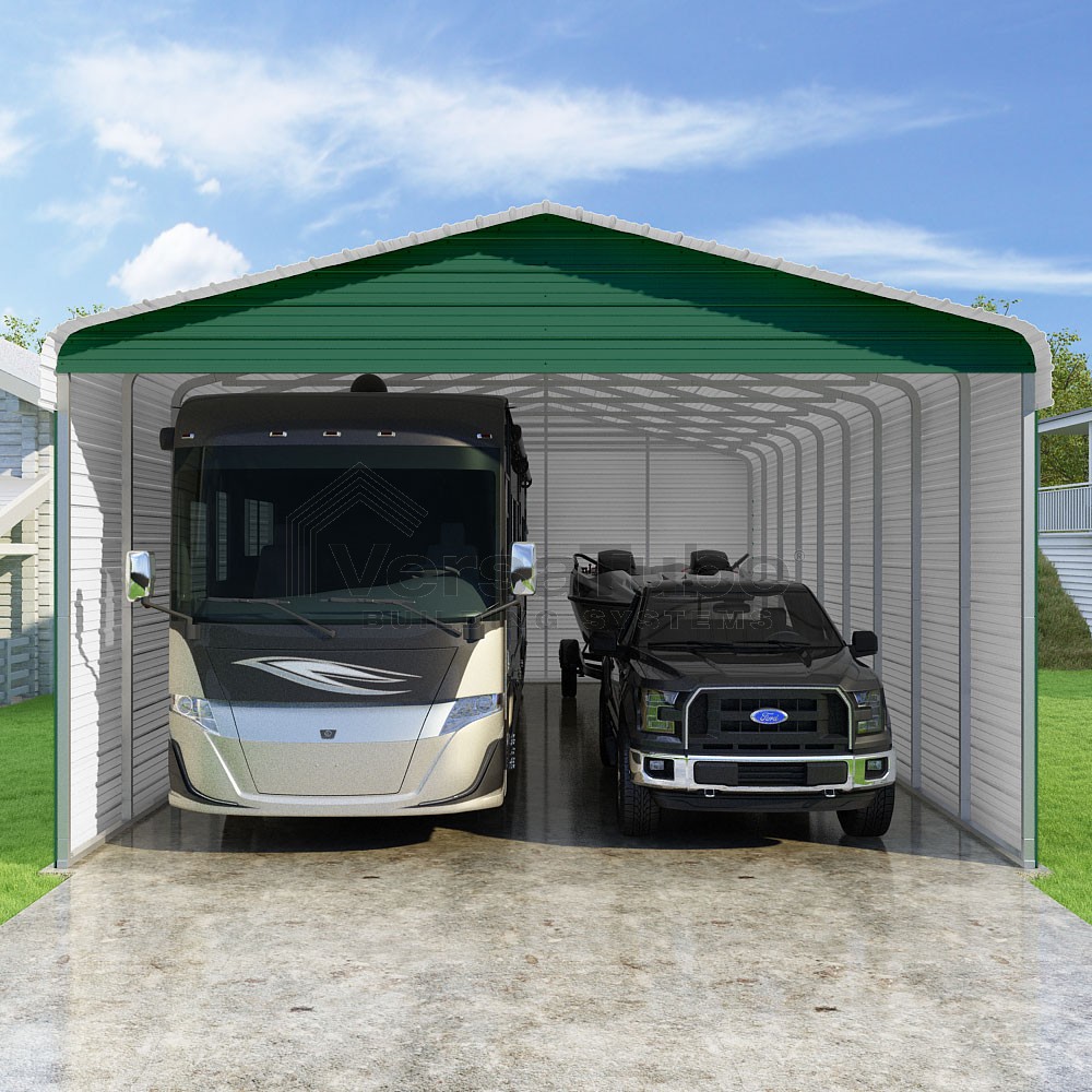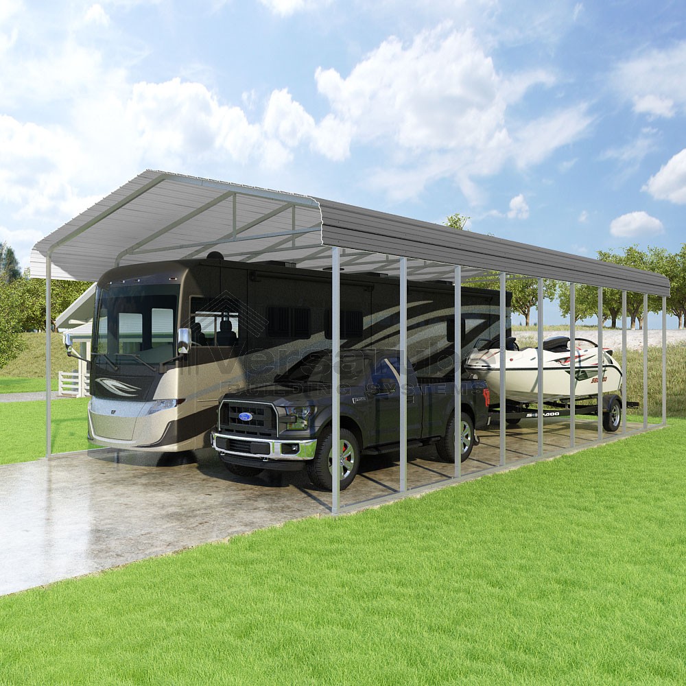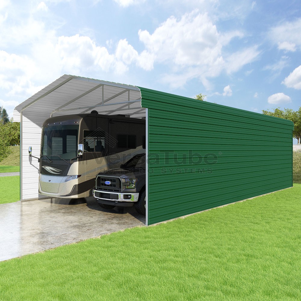 Classic Series DIY carport kit features horizontal application of sheet metal panels with the extra protection of rounded eaves.