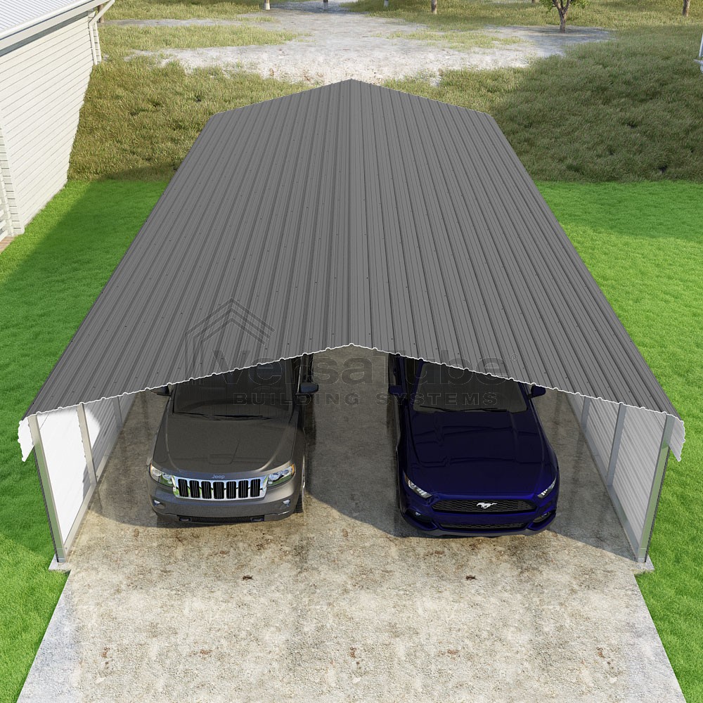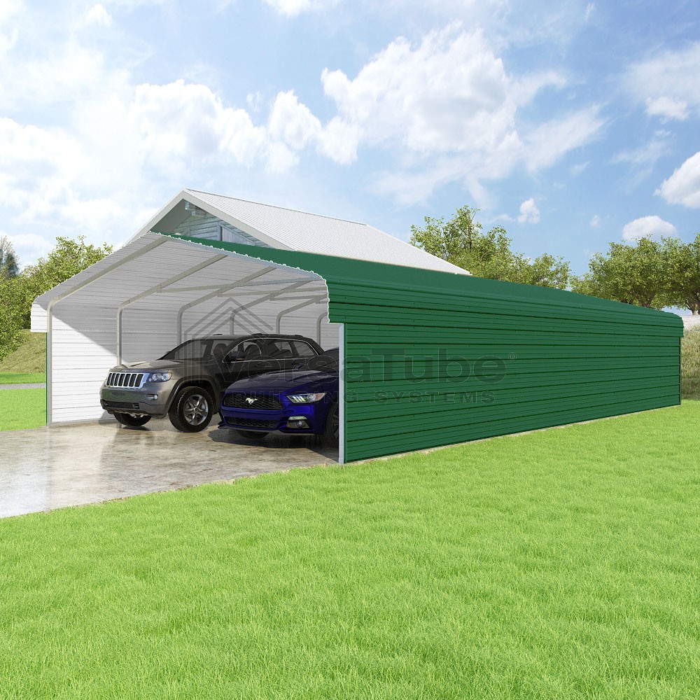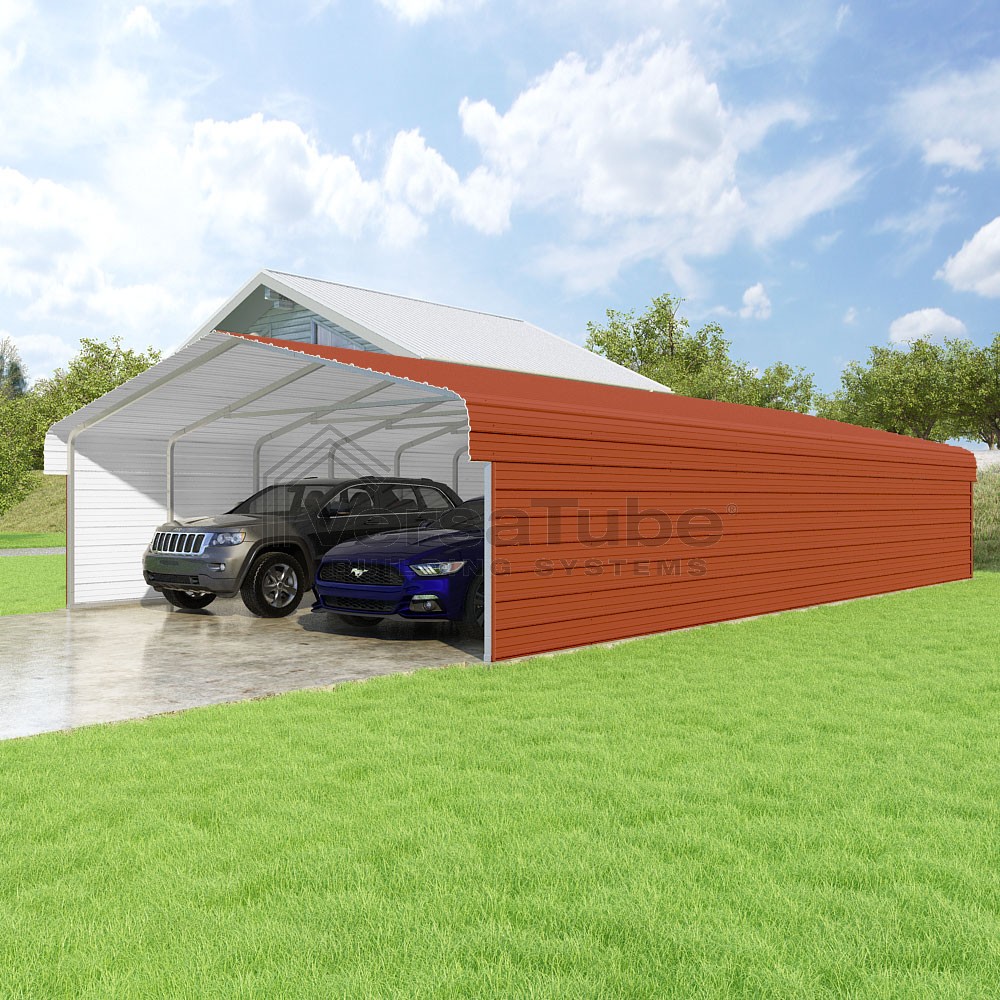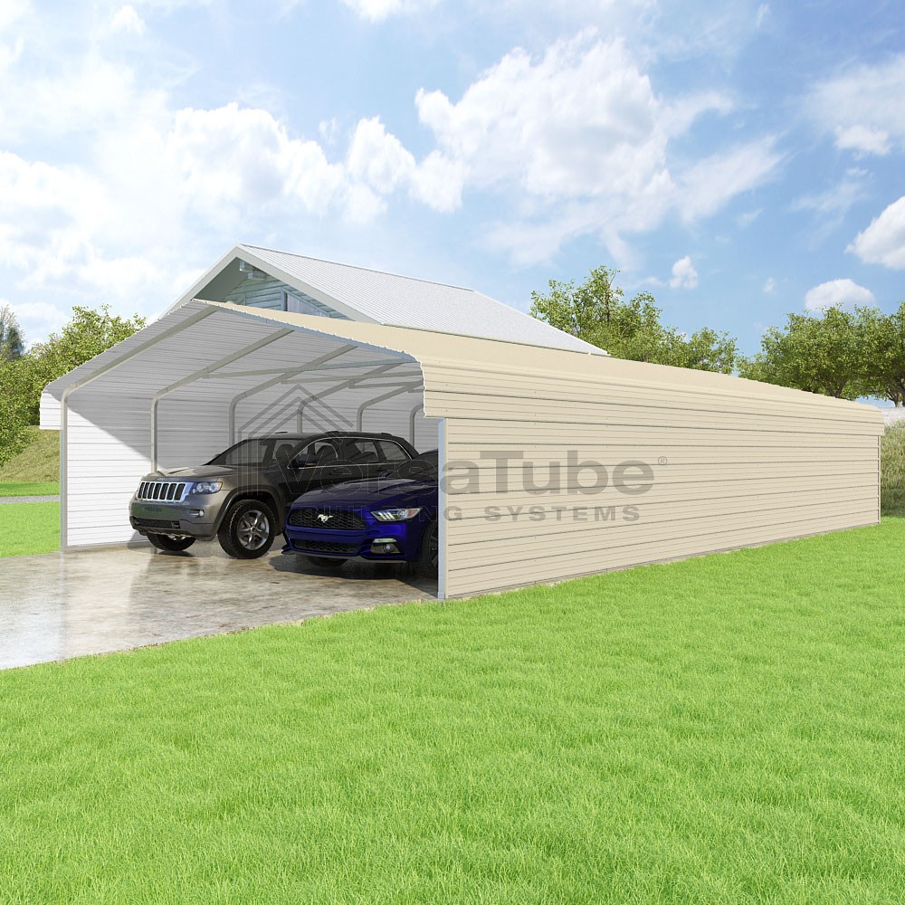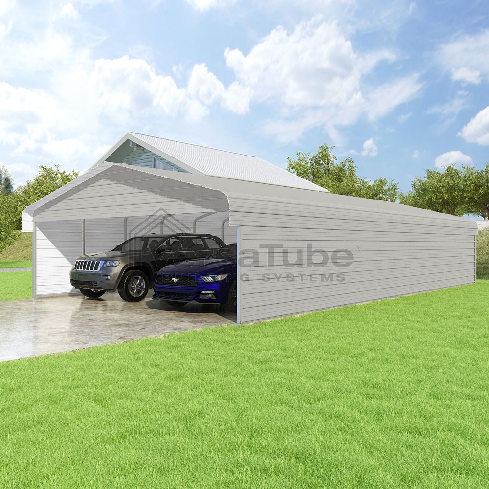 Classic Series DIY carport kit features horizontal application of sheet metal panels with the extra protection of rounded eaves.