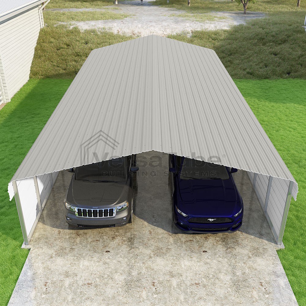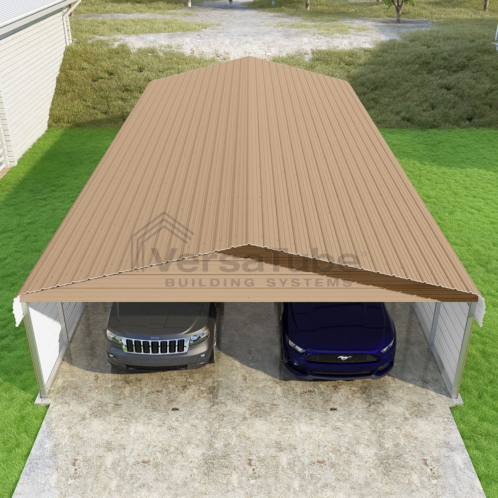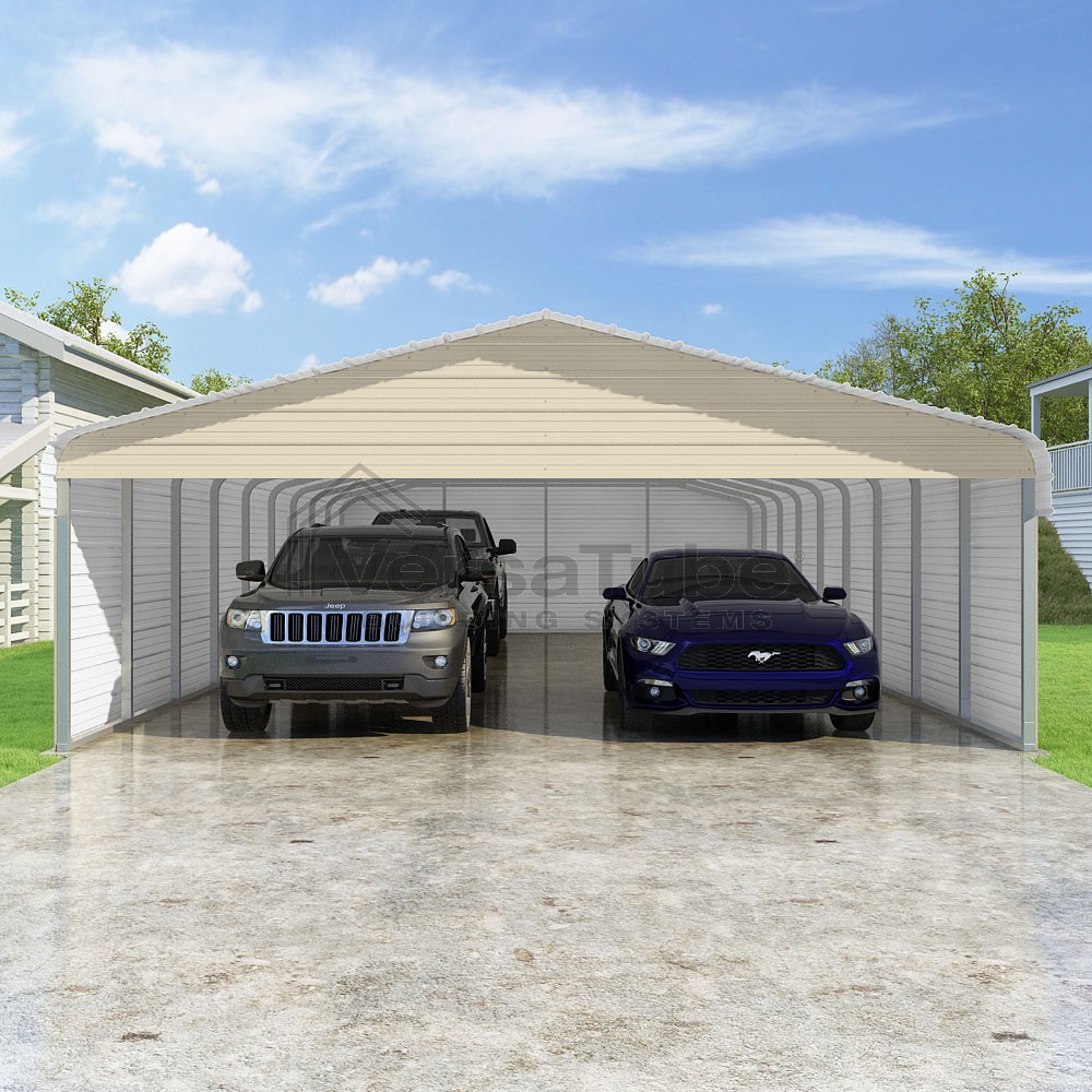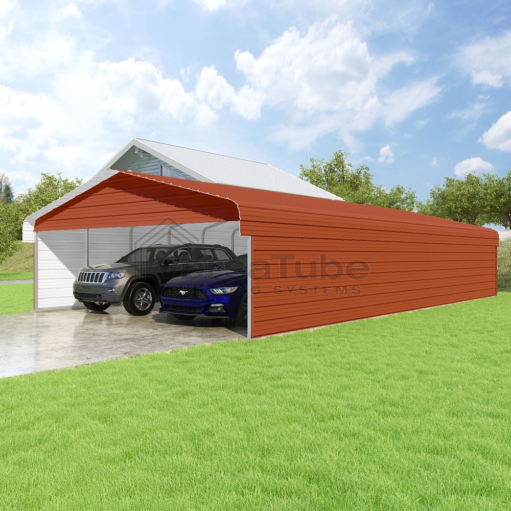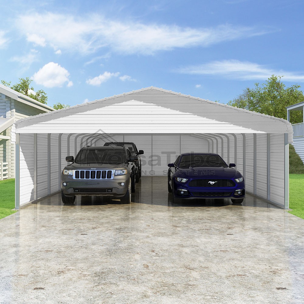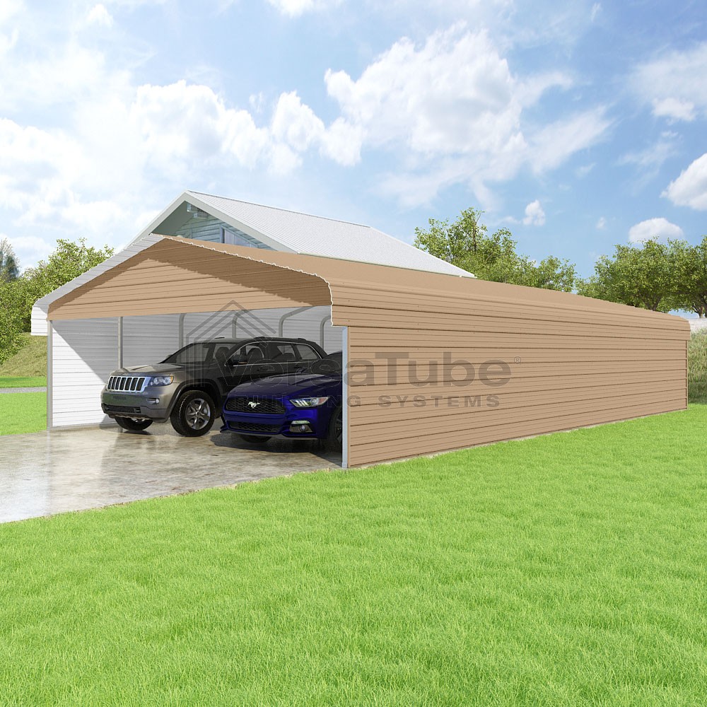 Classic Series DIY carport kit features horizontal application of sheet metal panels with the extra protection of rounded eaves.
