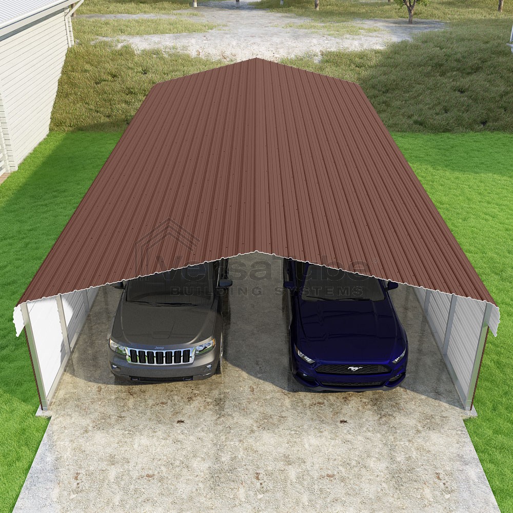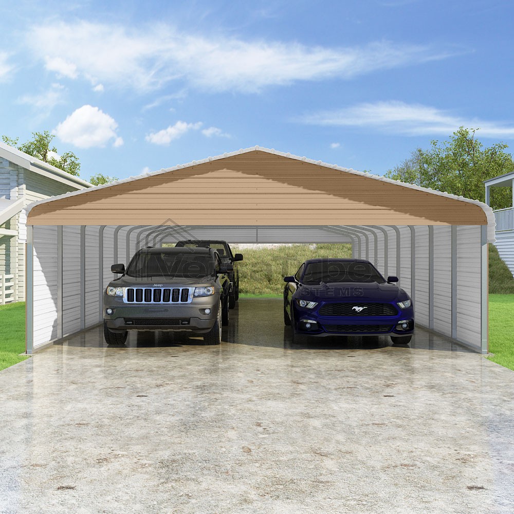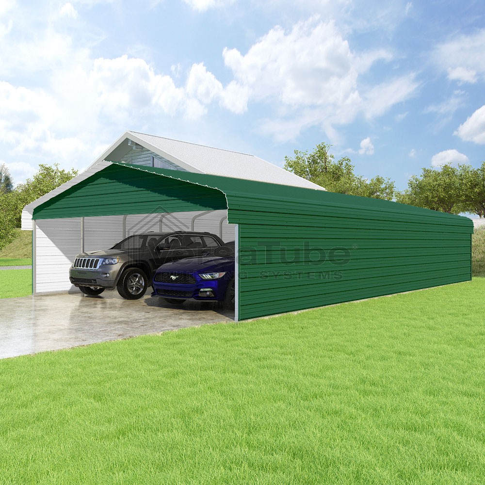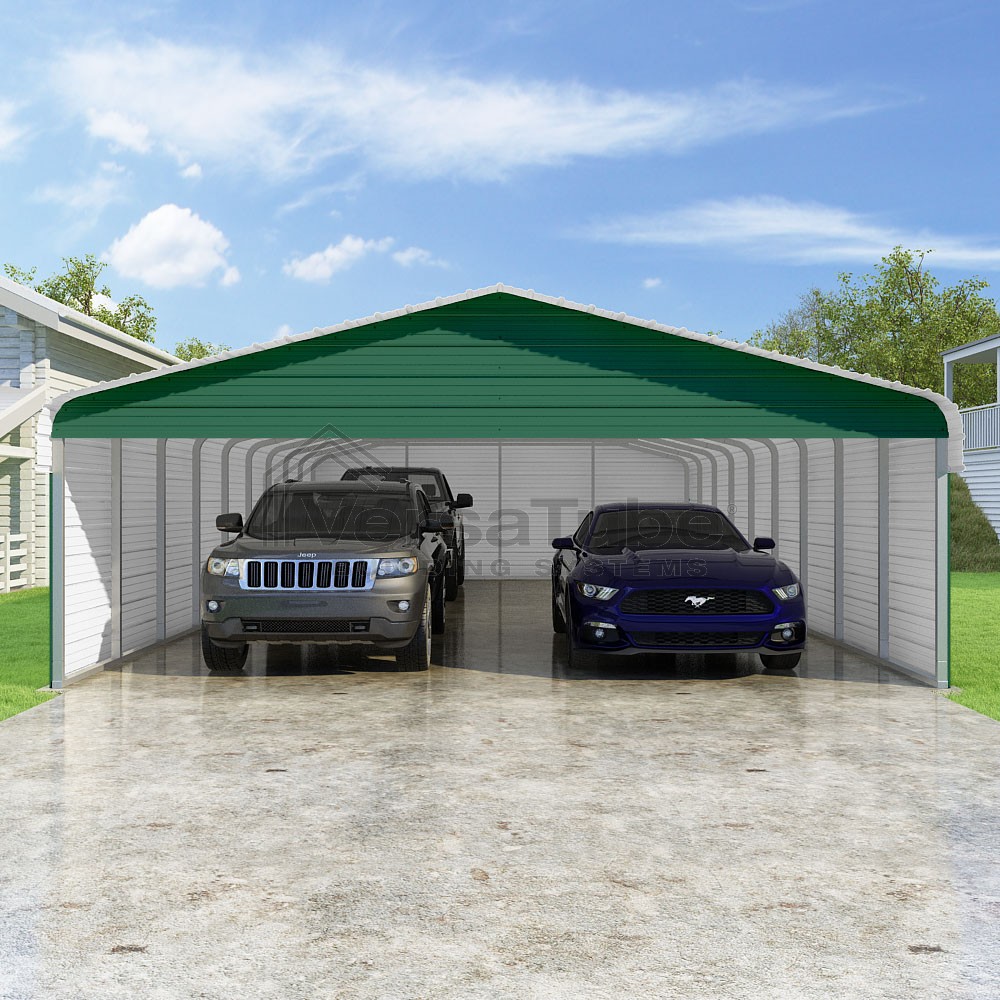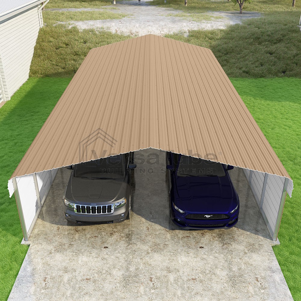 Classic Series DIY carport kit features horizontal application of sheet metal panels with the extra protection of rounded eaves.