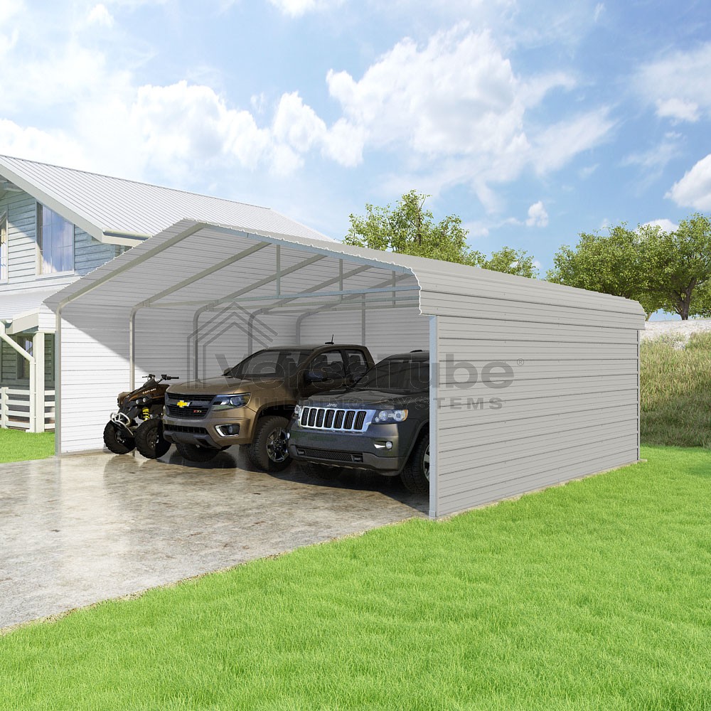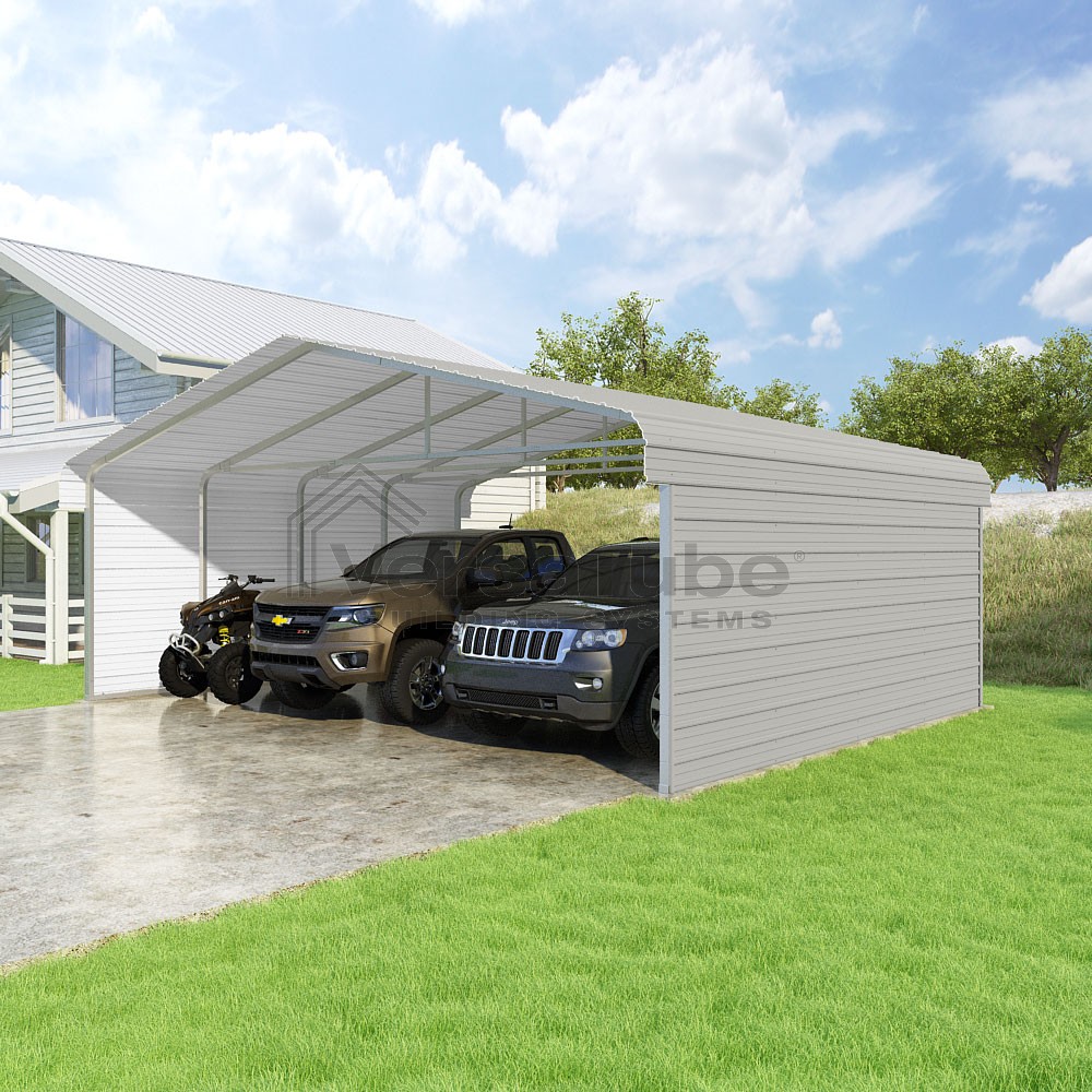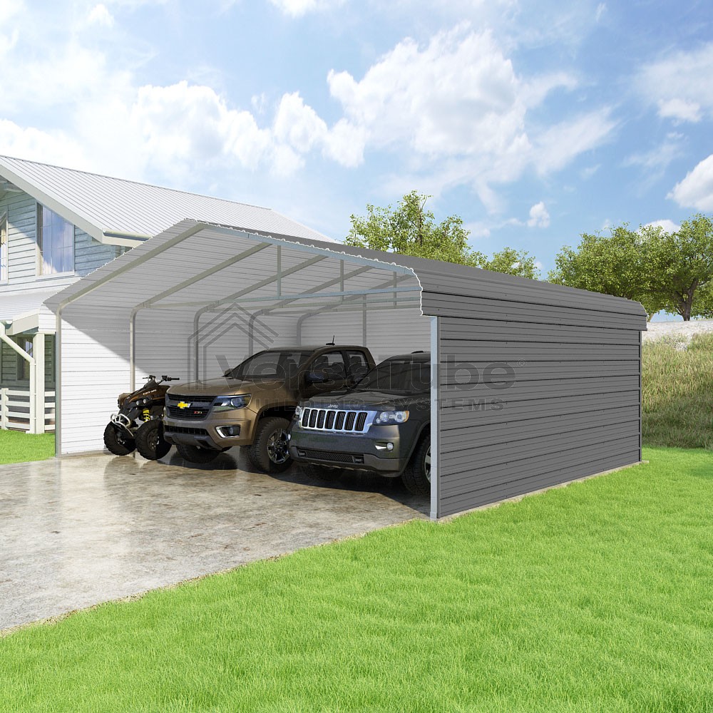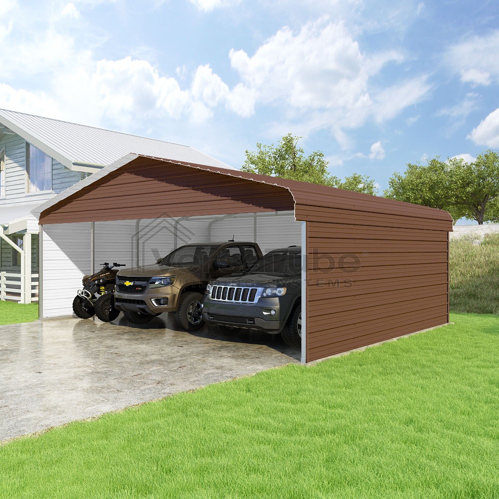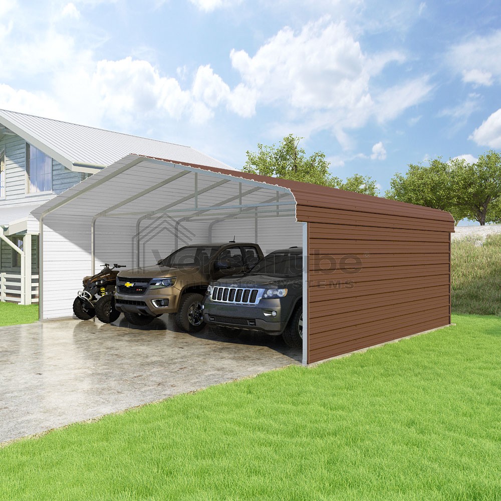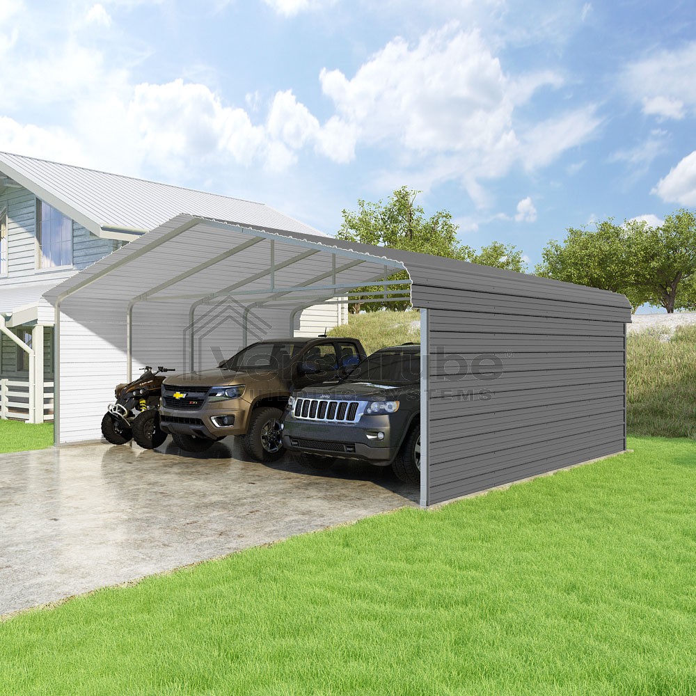 Classic Series DIY carport kit features horizontal application of sheet metal panels with the extra protection of rounded eaves.