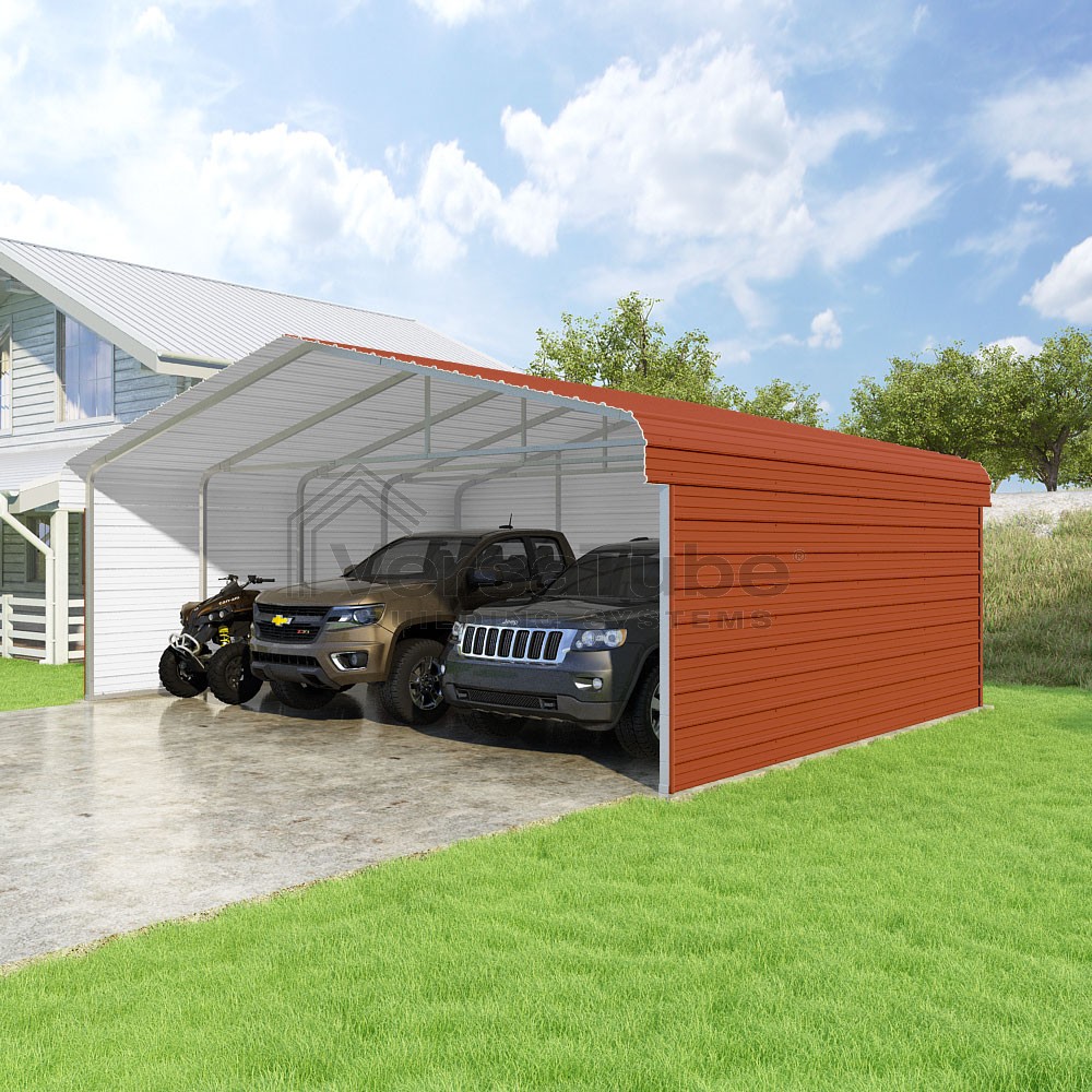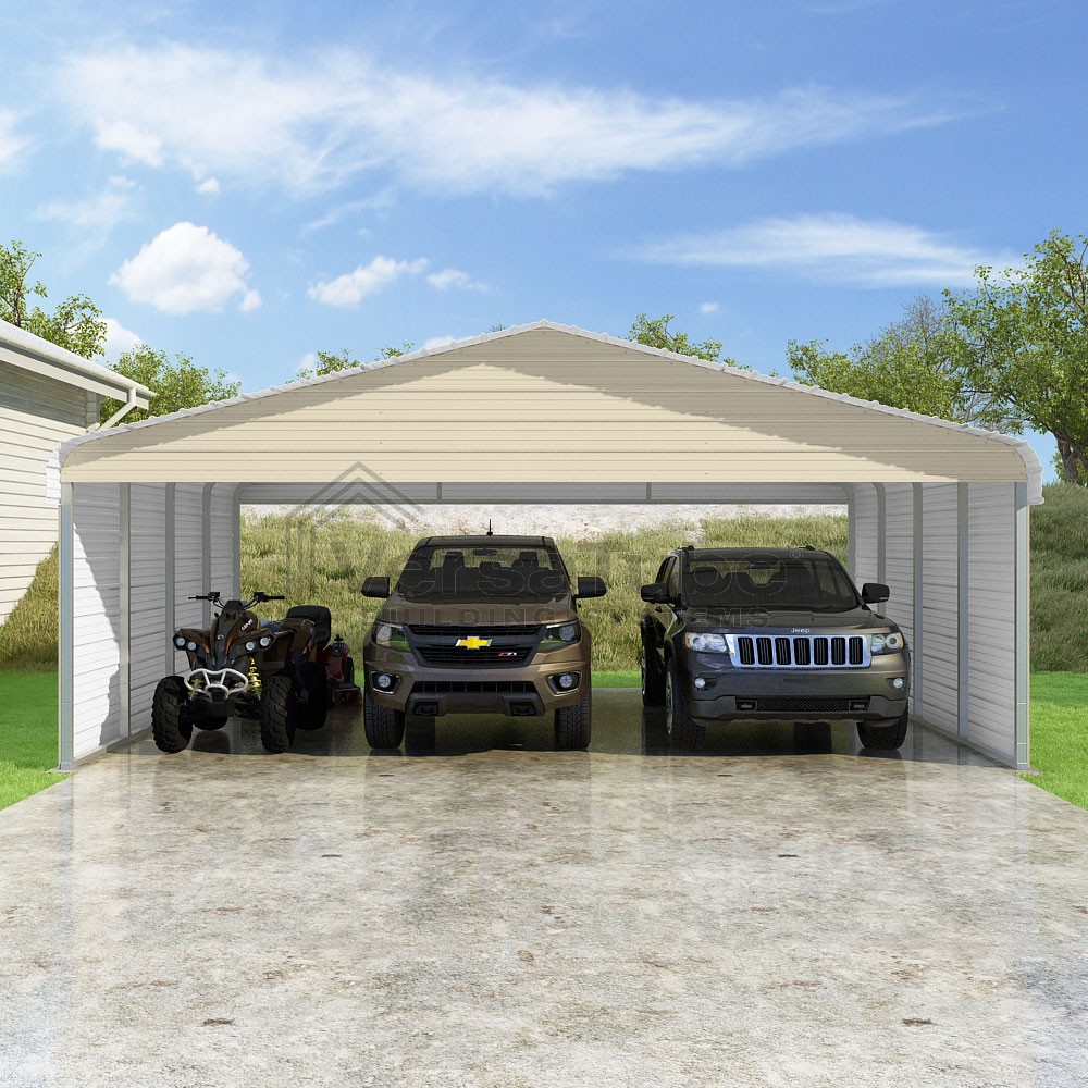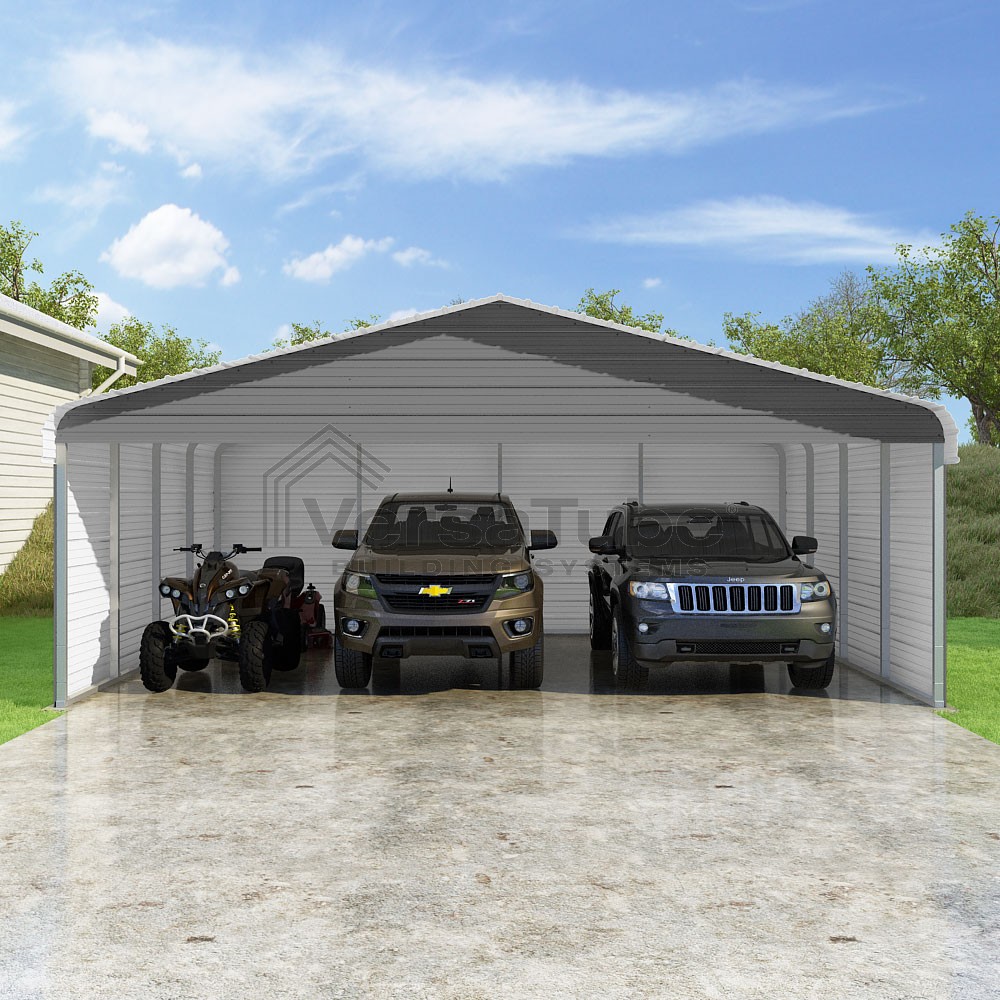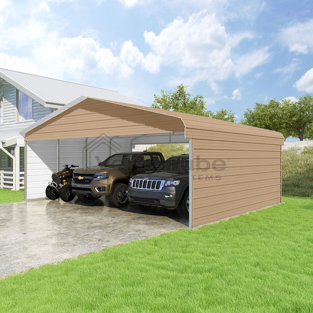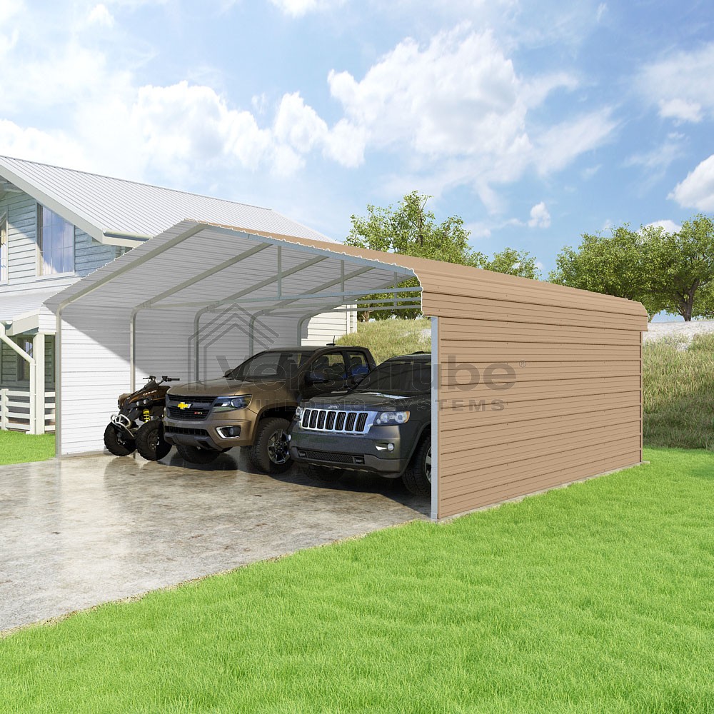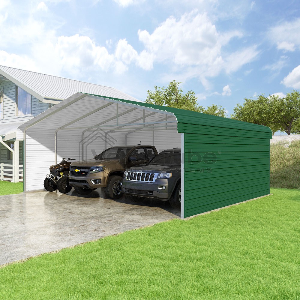 Classic Series DIY carport kit features horizontal application of sheet metal panels with the extra protection of rounded eaves.