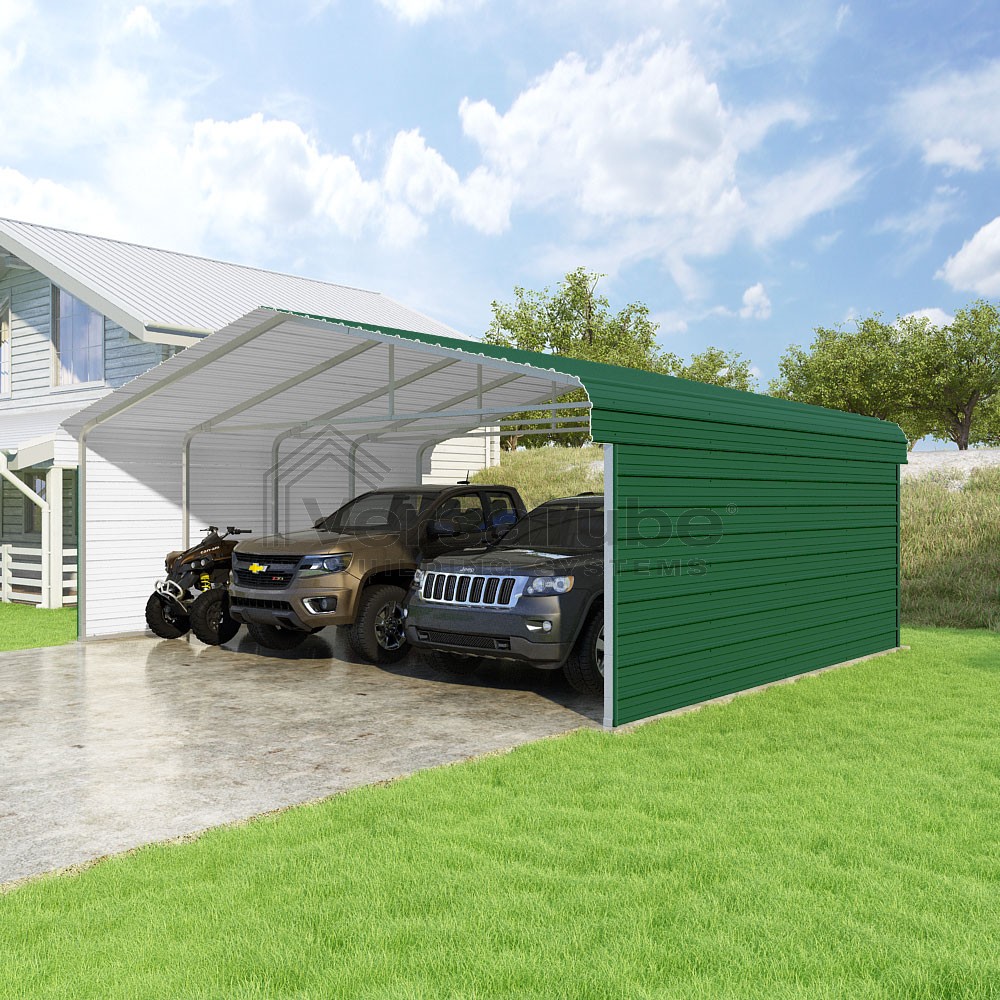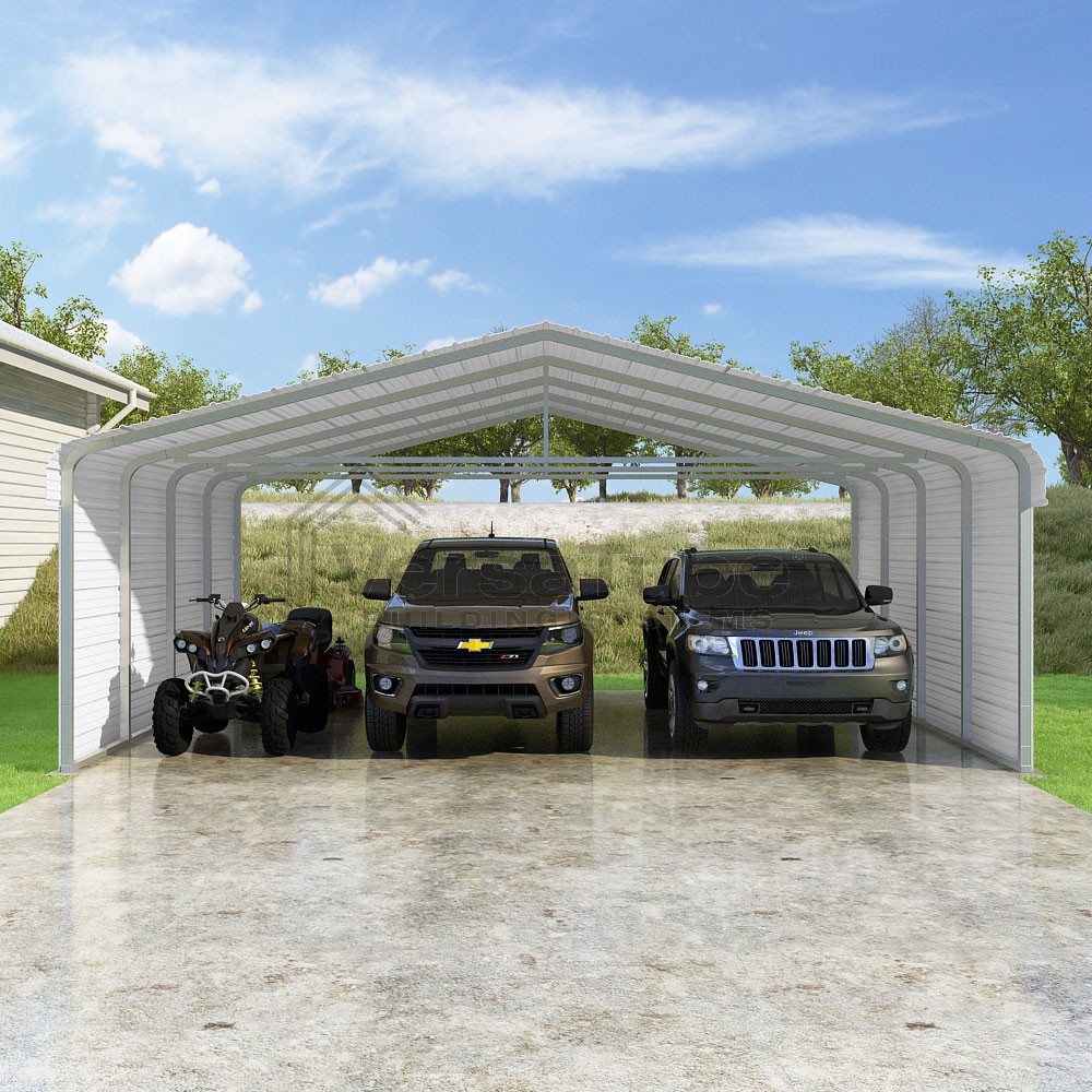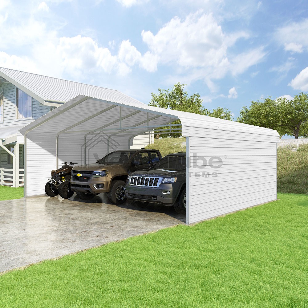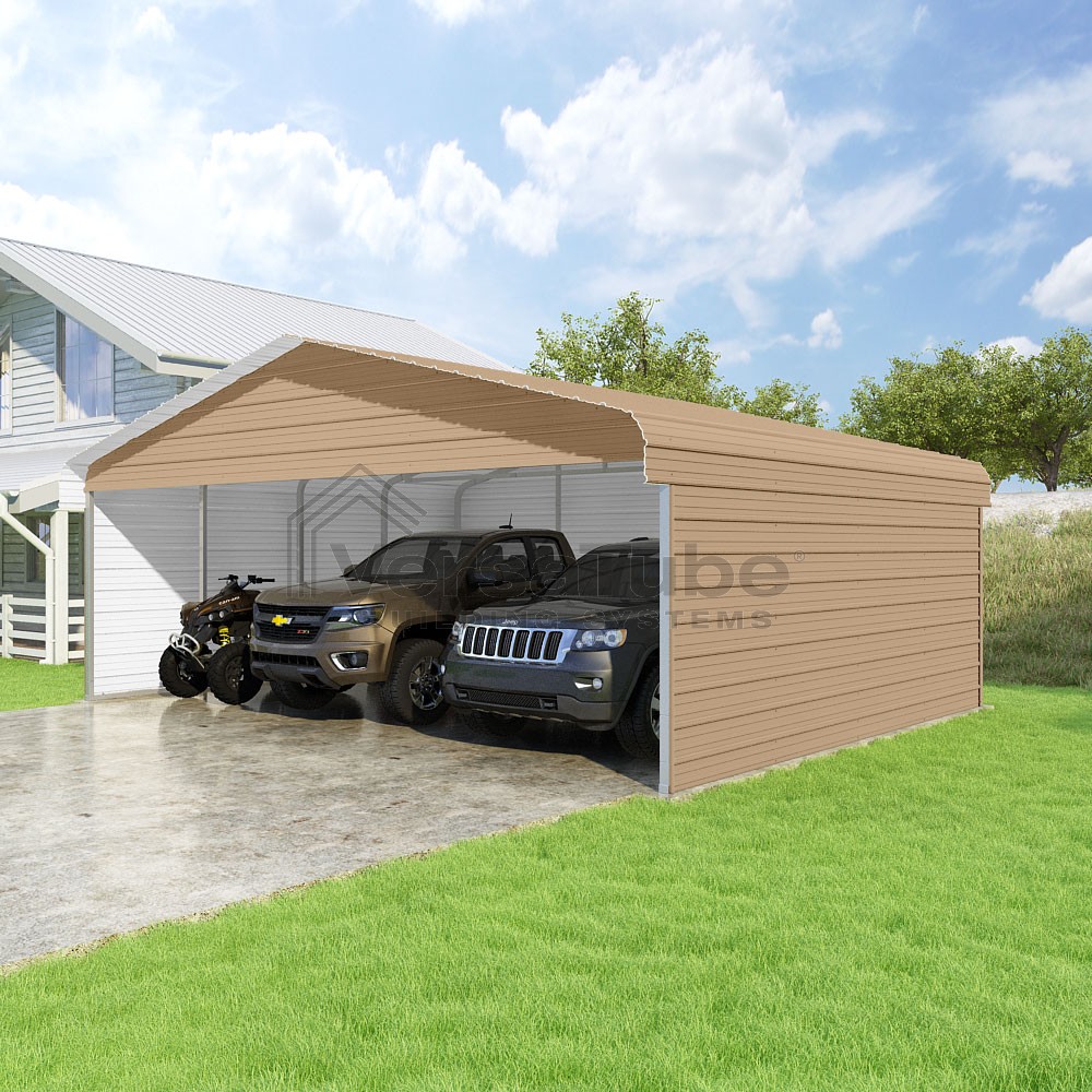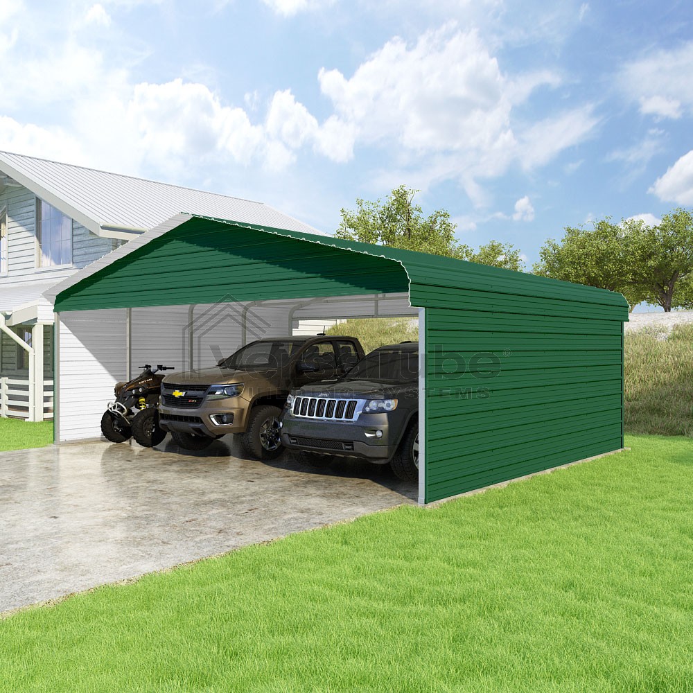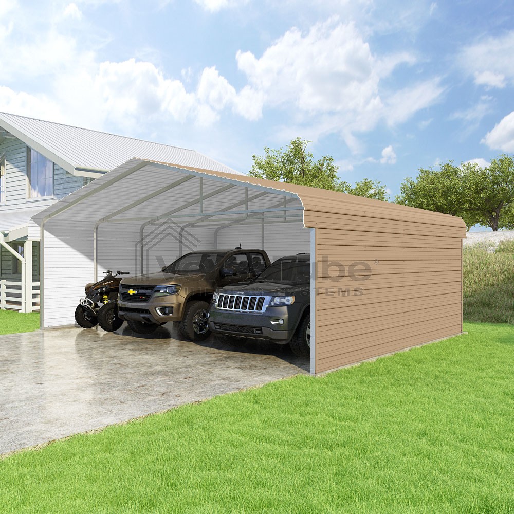 Classic Series DIY carport kit features horizontal application of sheet metal panels with the extra protection of rounded eaves.