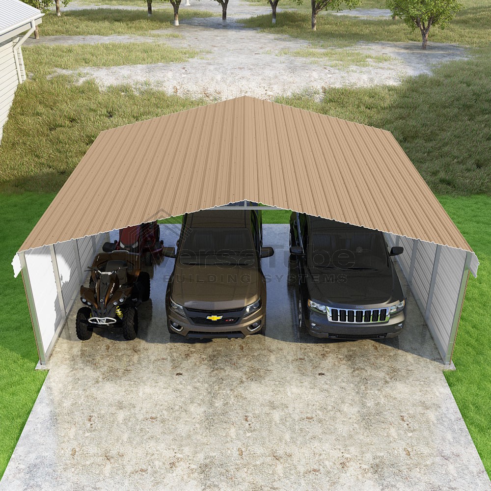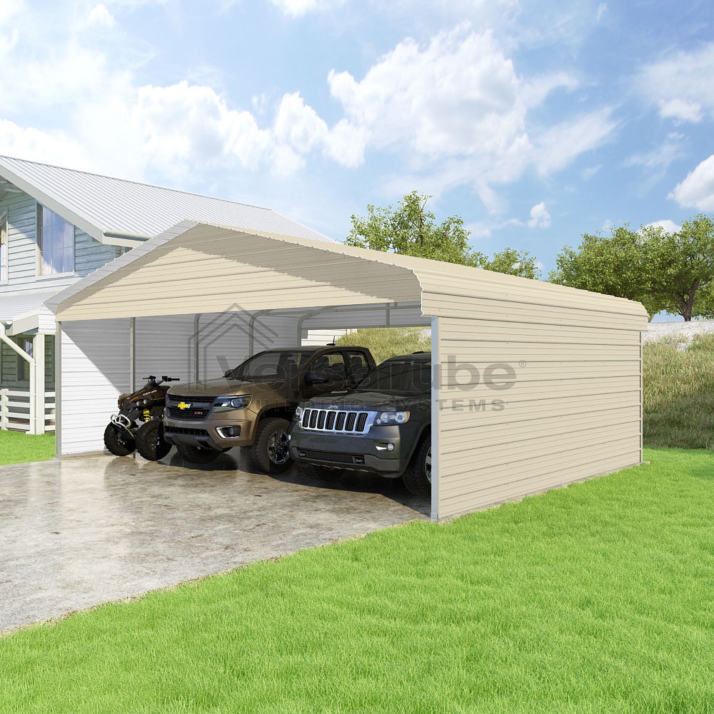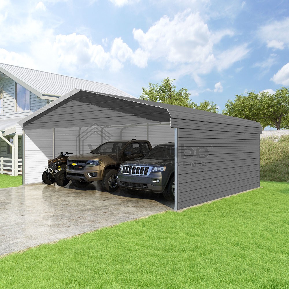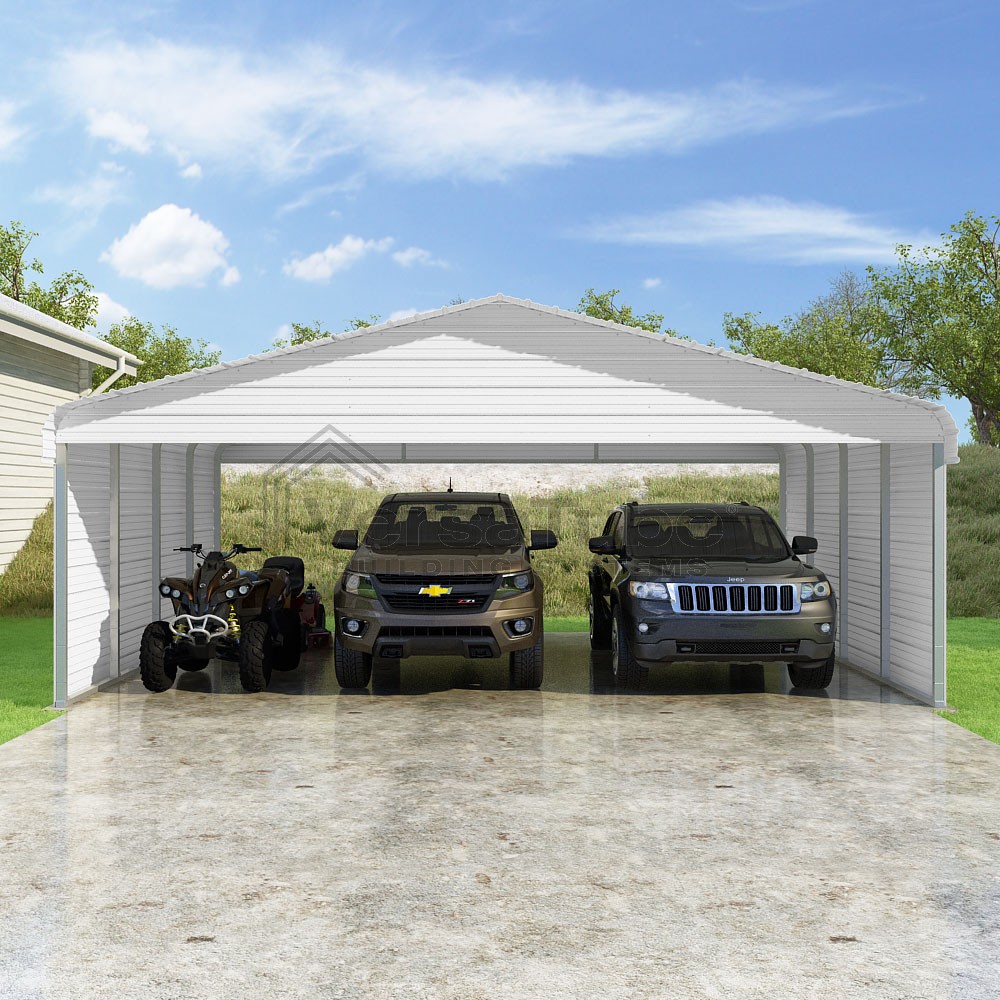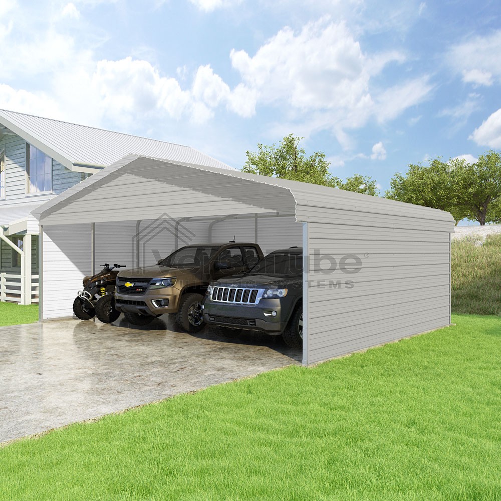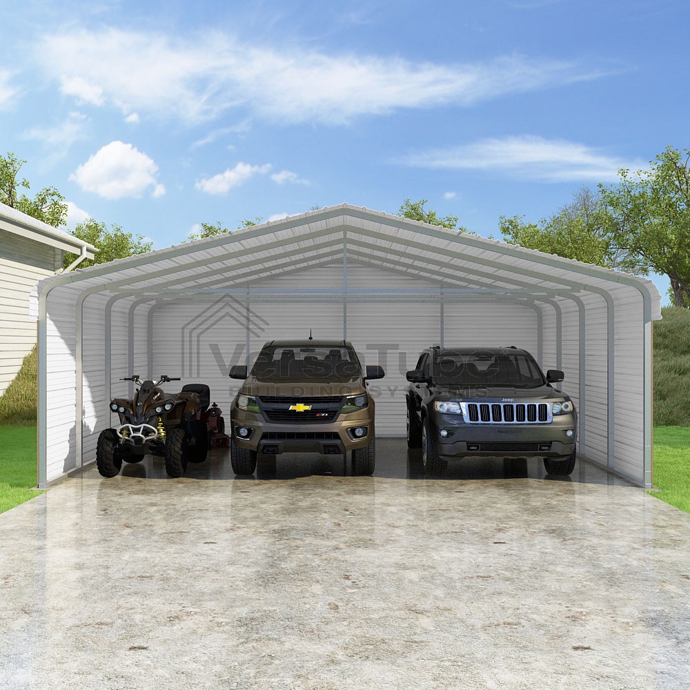 Classic Series DIY carport kit features horizontal application of sheet metal panels with the extra protection of rounded eaves.