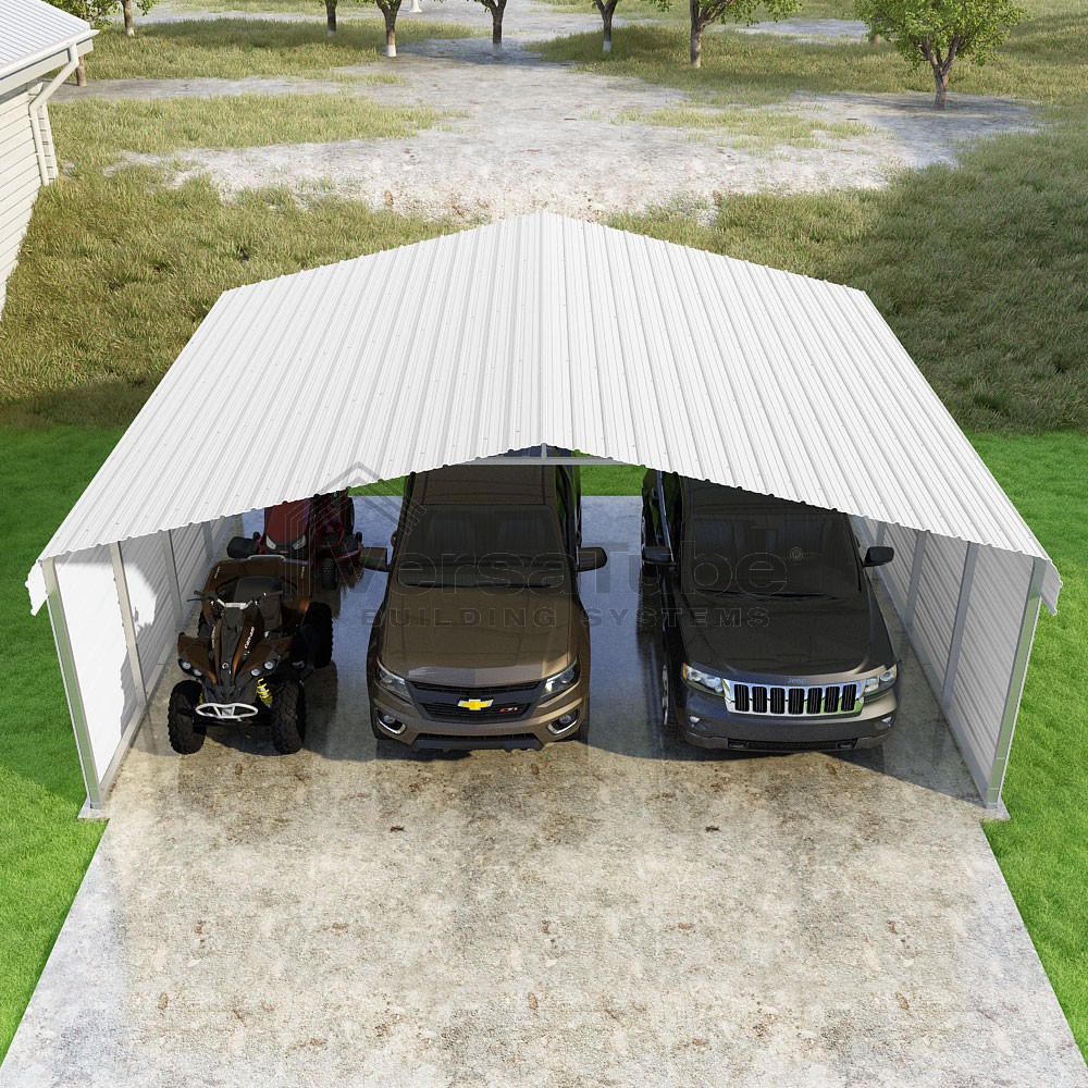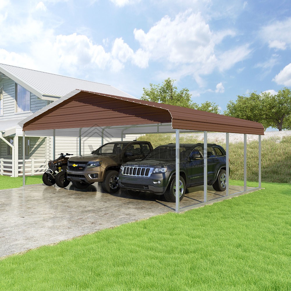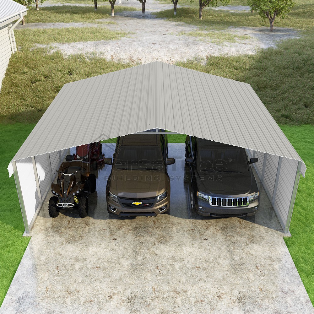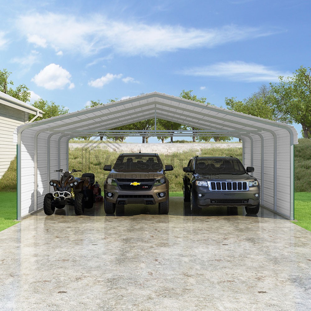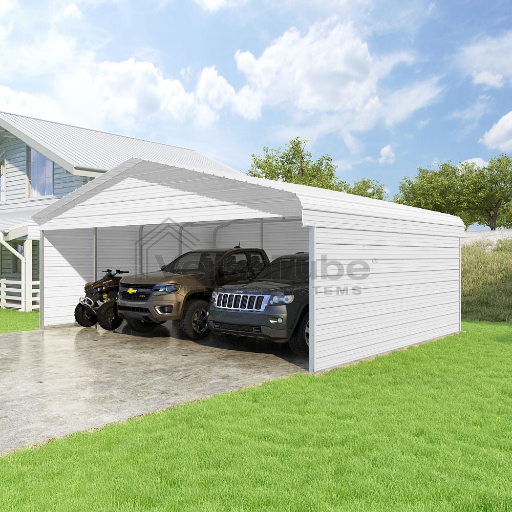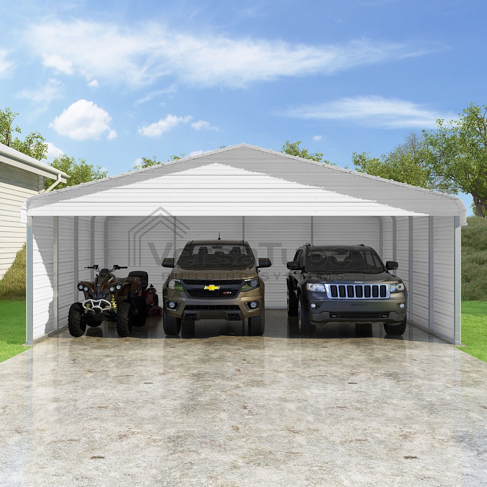 Classic Series DIY carport kit features horizontal application of sheet metal panels with the extra protection of rounded eaves.