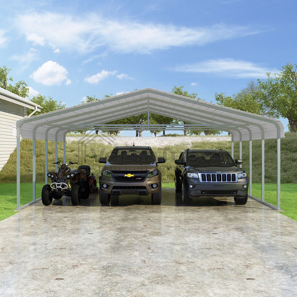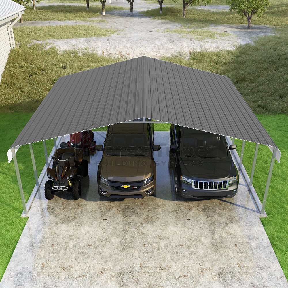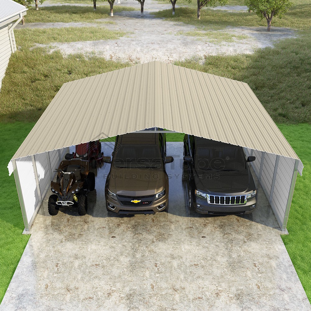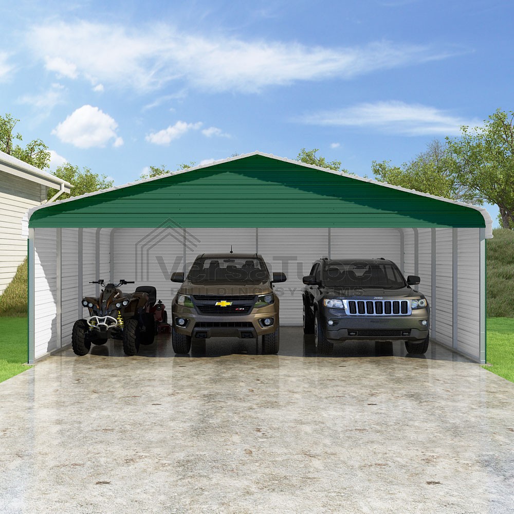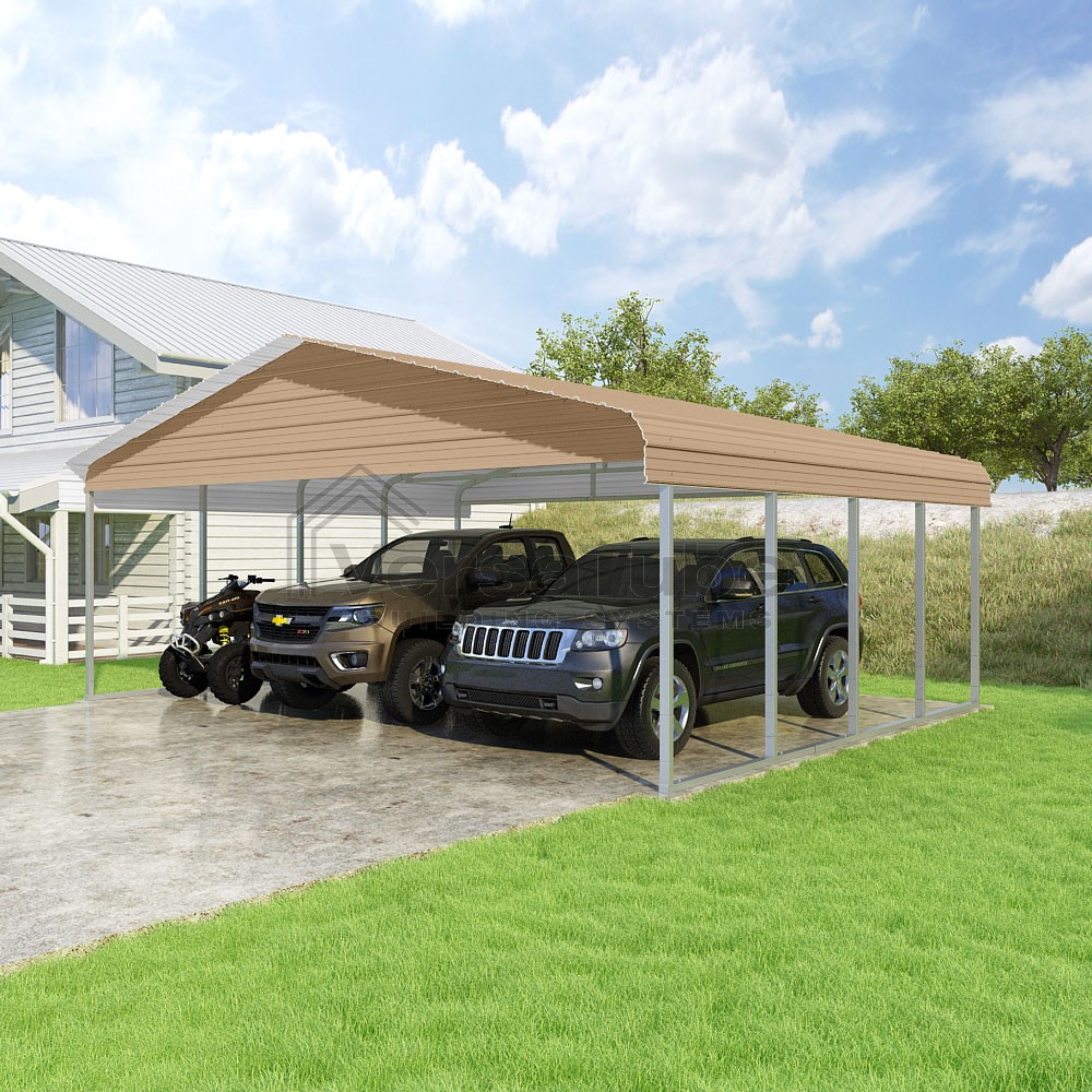Classic Series DIY carport kit features horizontal application of sheet metal panels with the extra protection of rounded eaves.