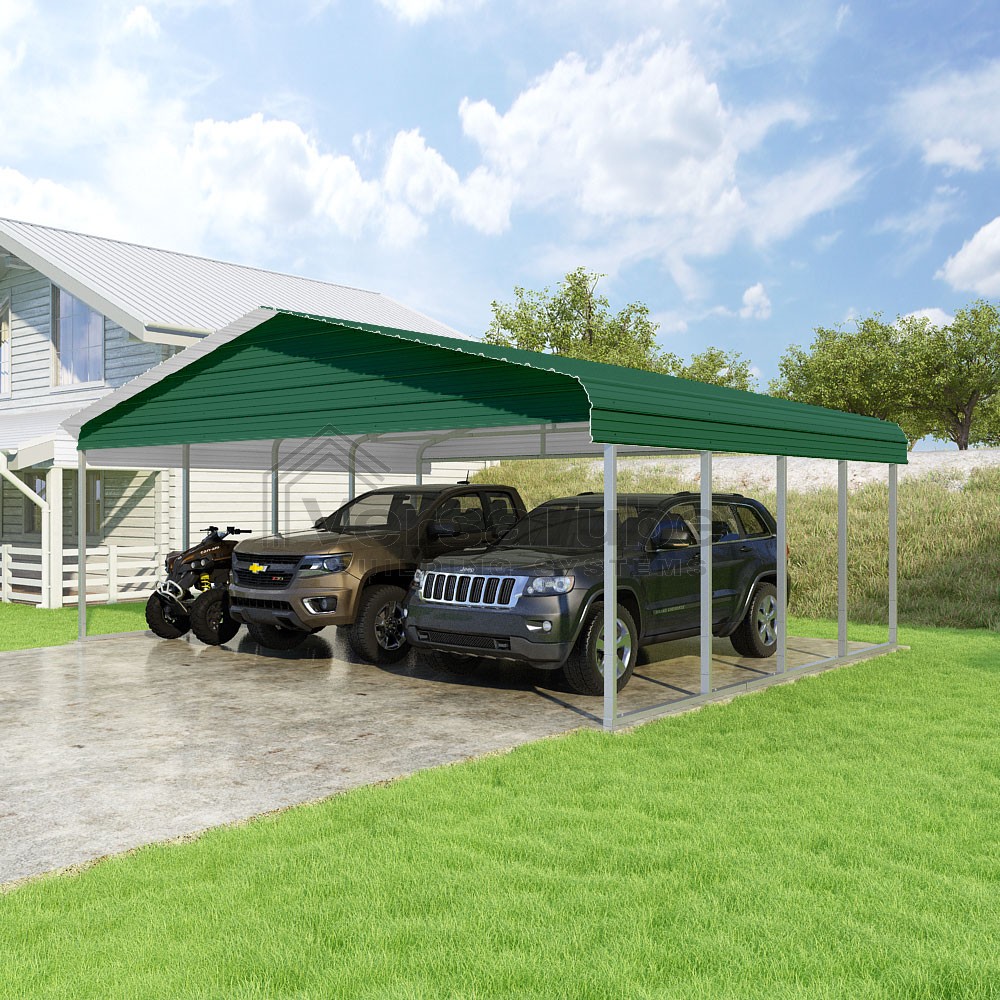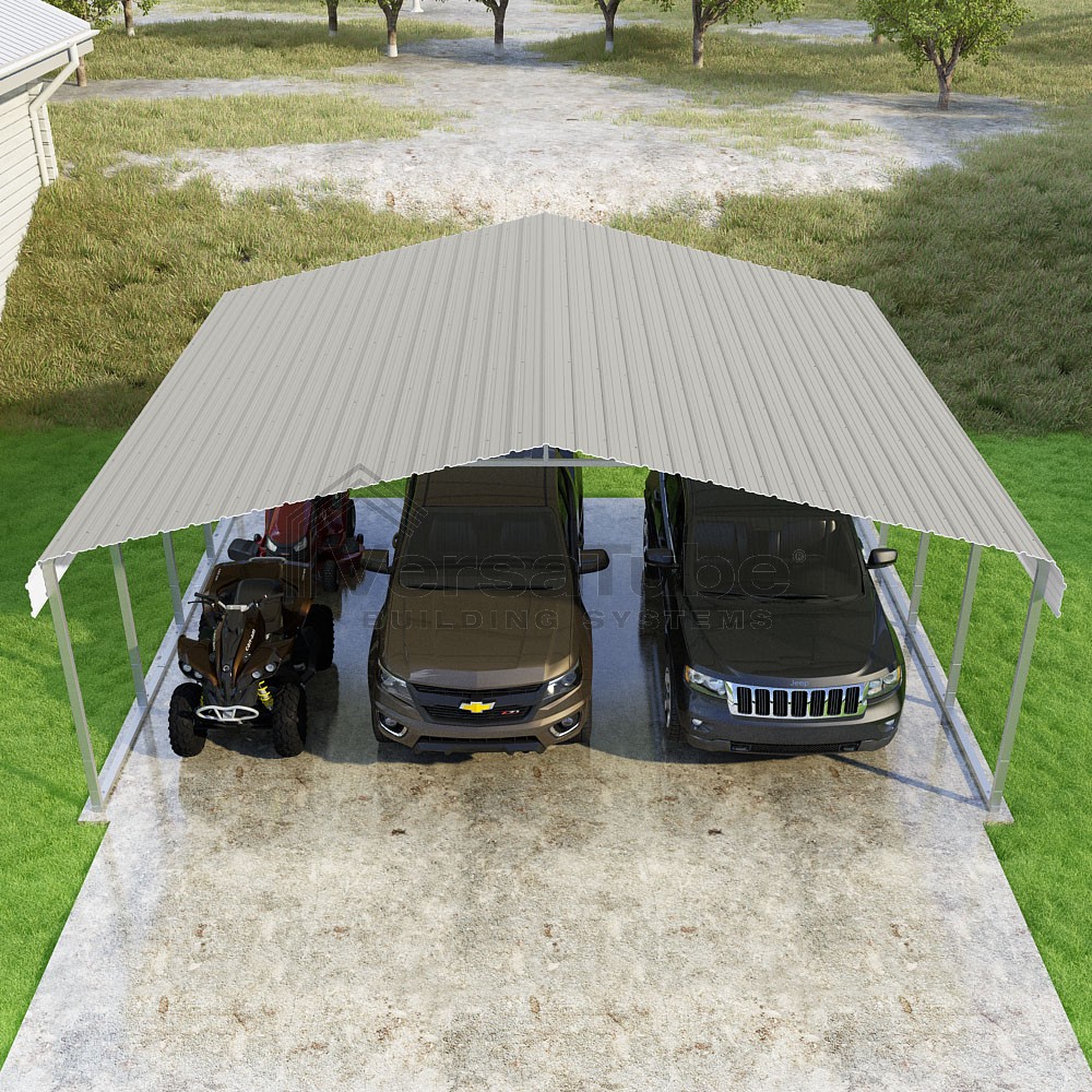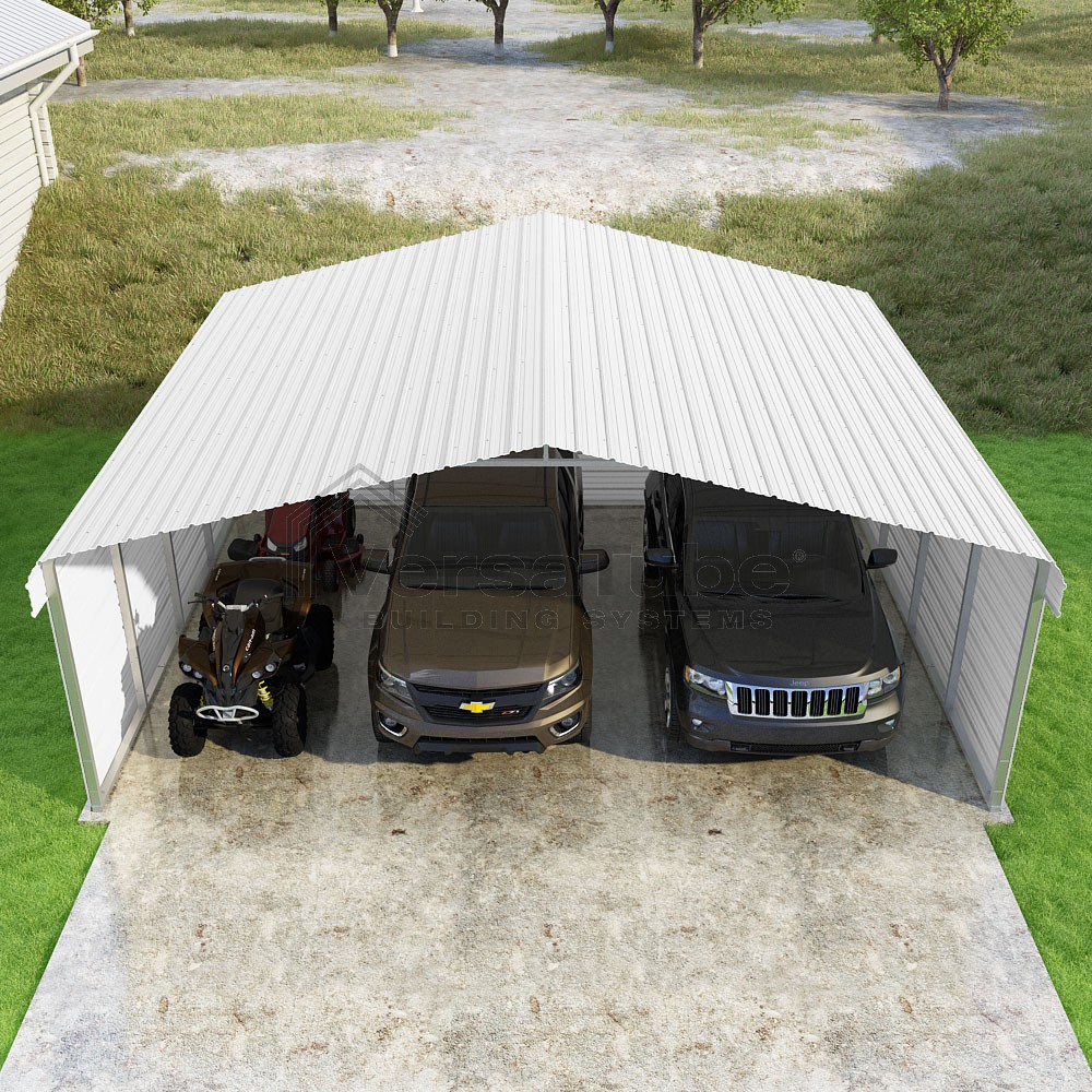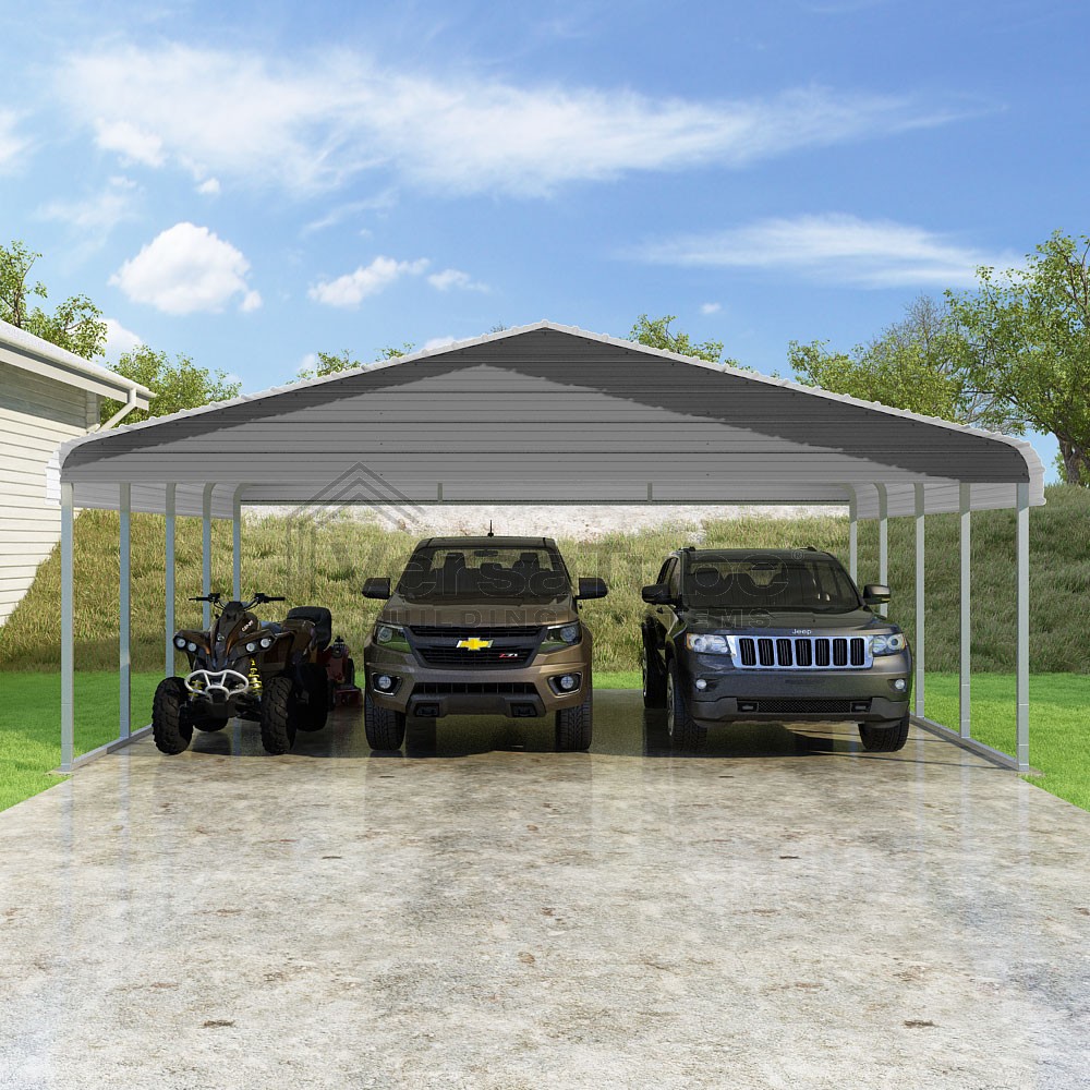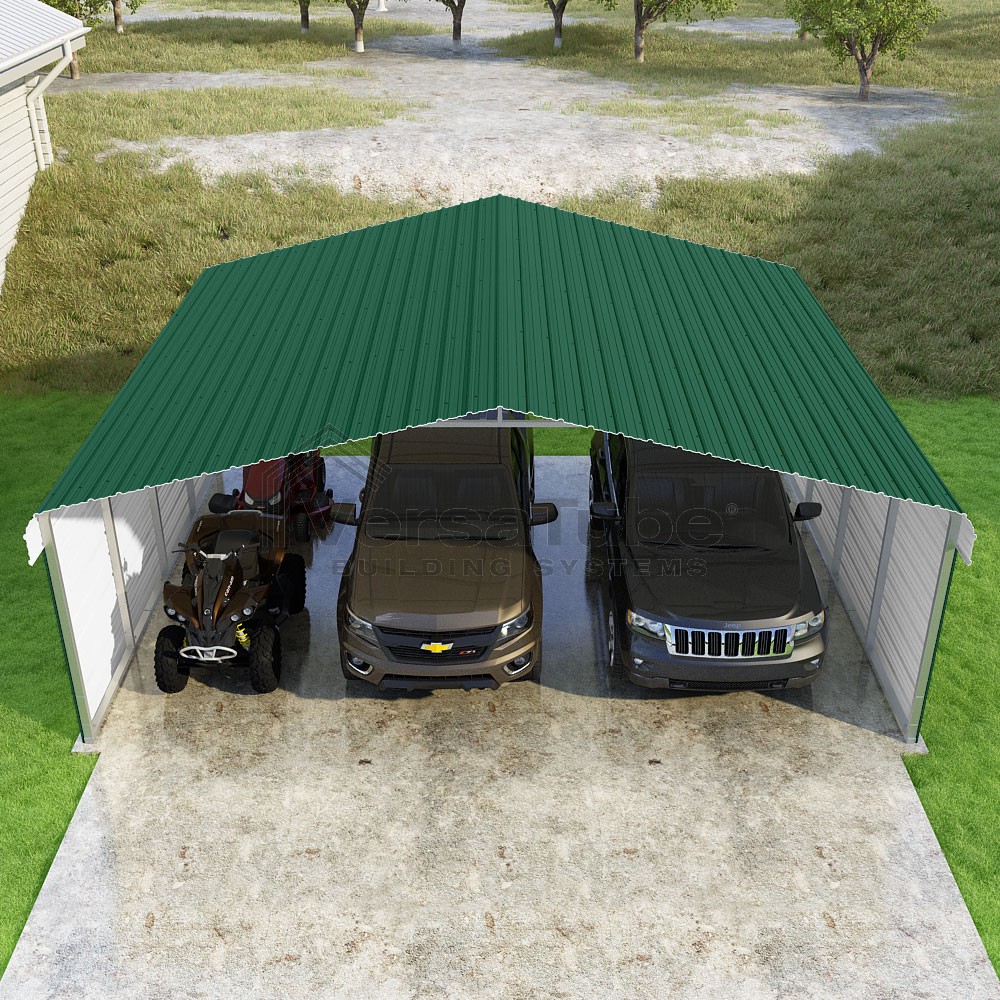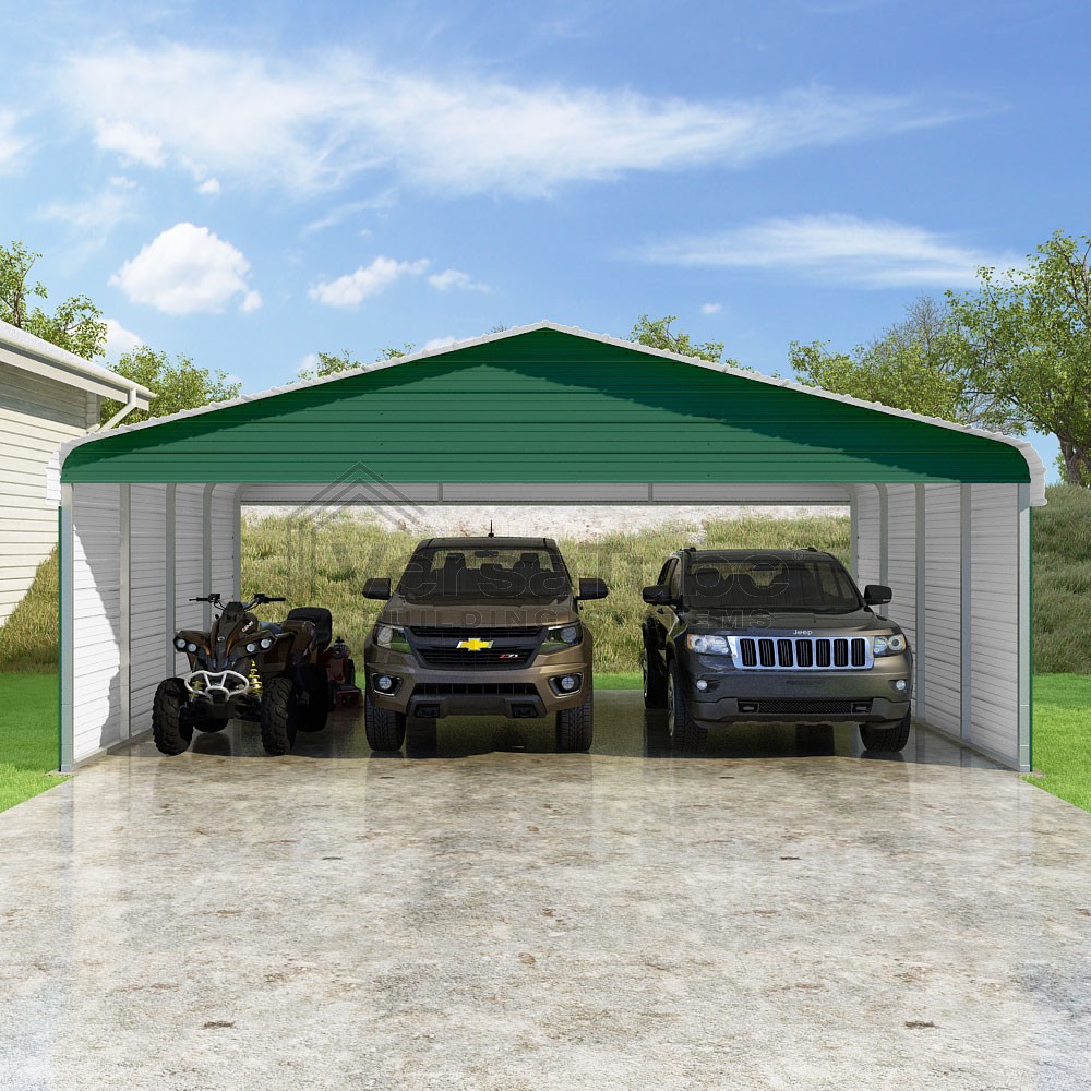 Classic Series DIY carport kit features horizontal application of sheet metal panels with the extra protection of rounded eaves.