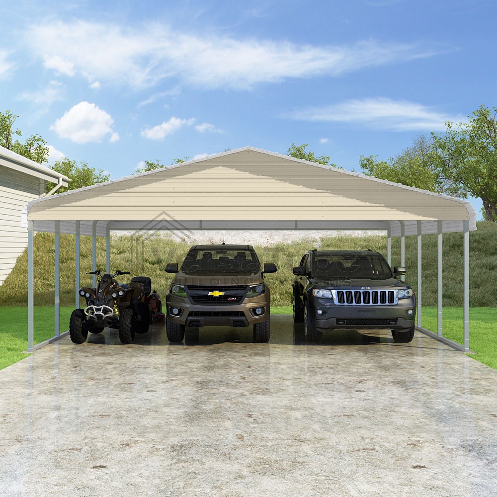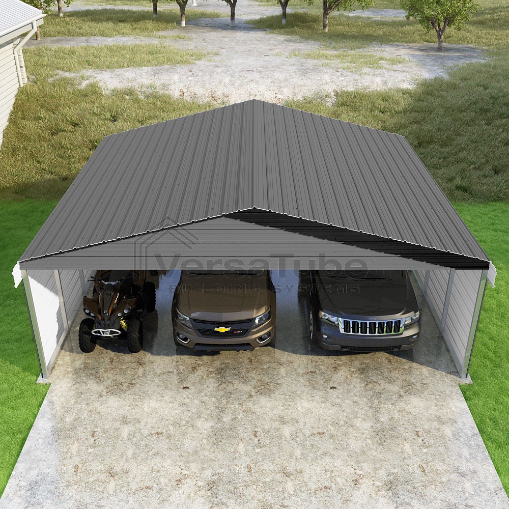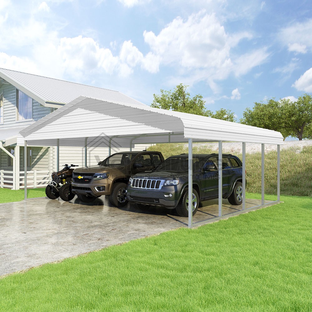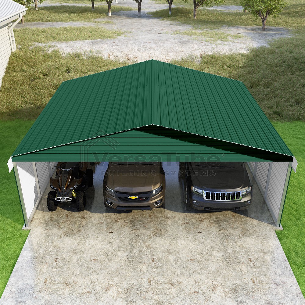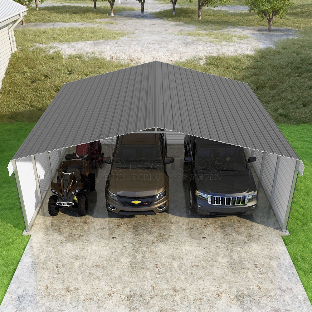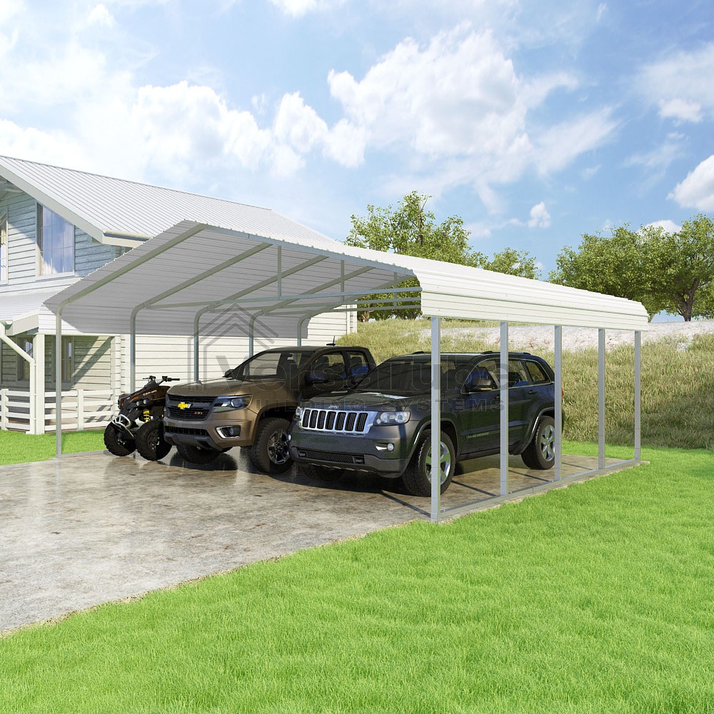 Classic Series DIY carport kit features horizontal application of sheet metal panels with the extra protection of rounded eaves.