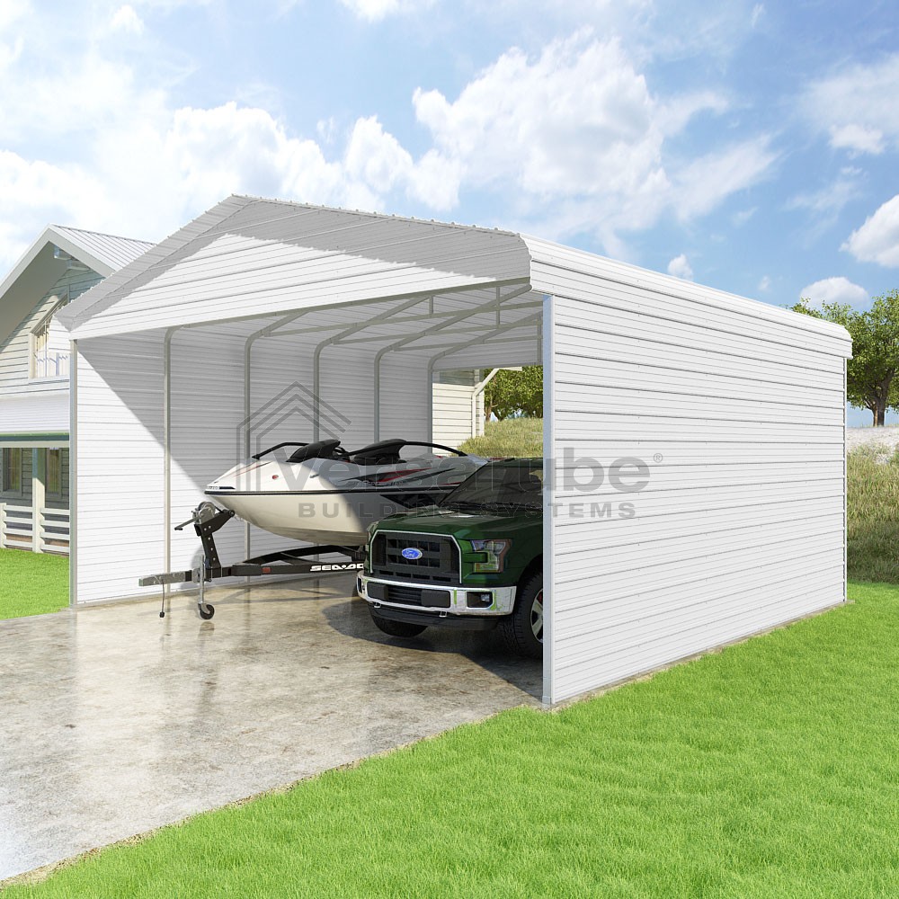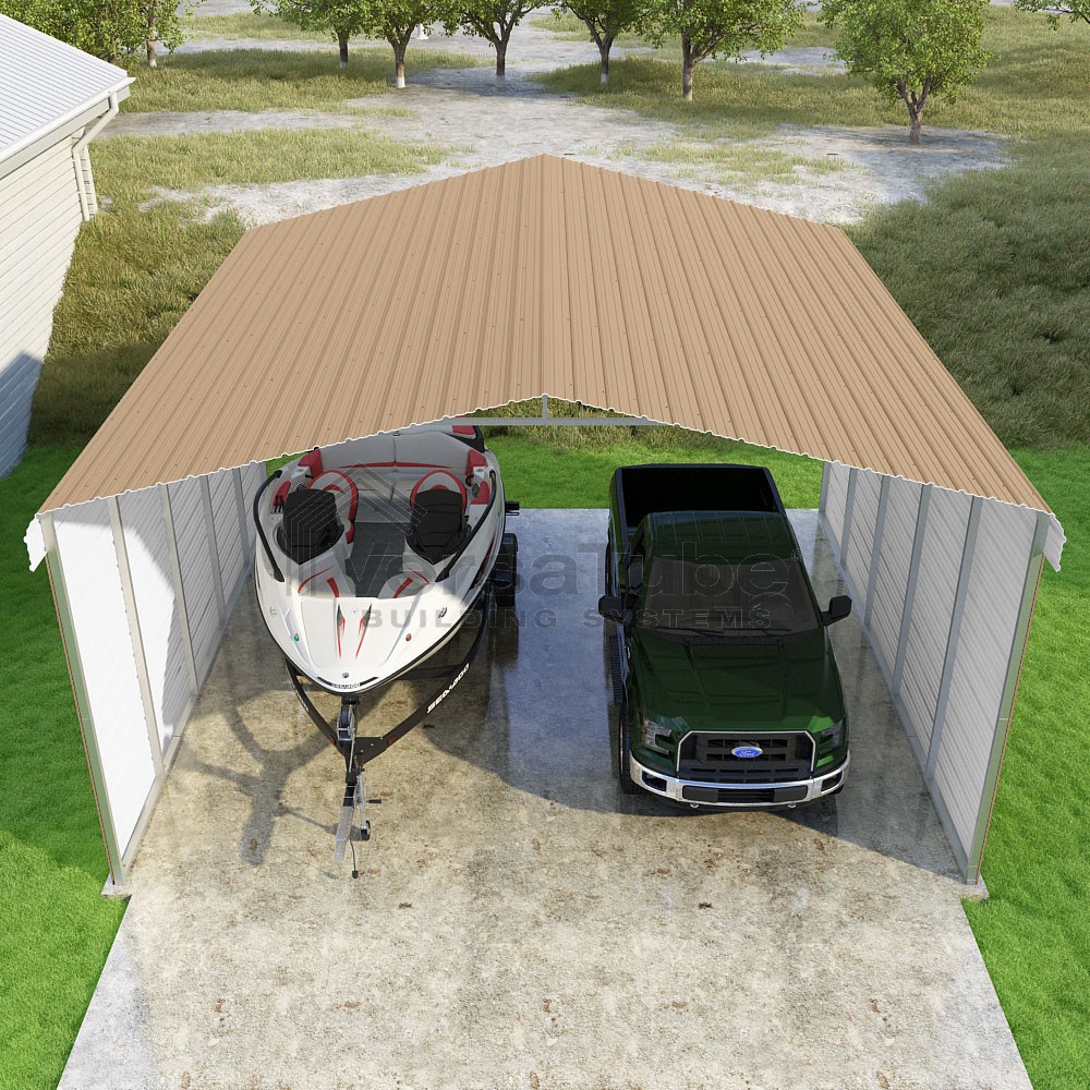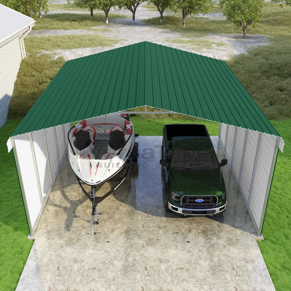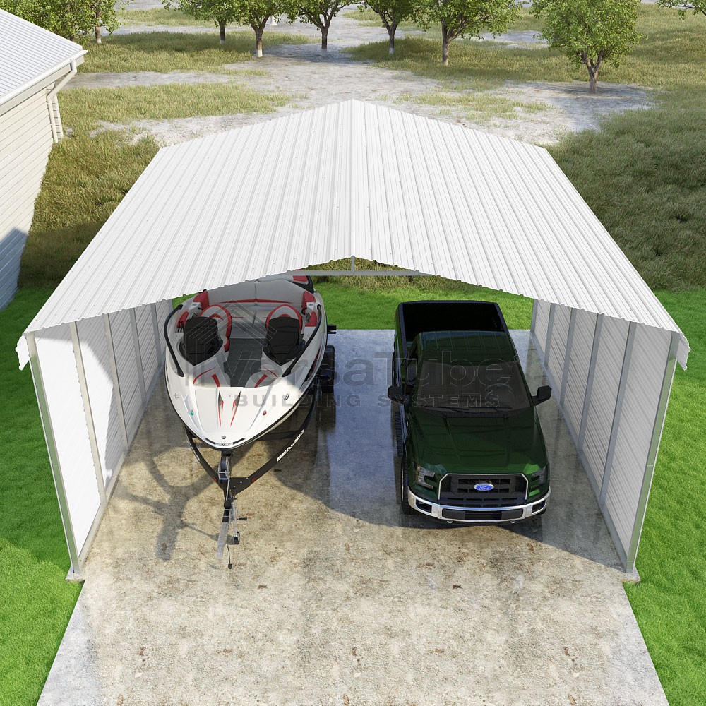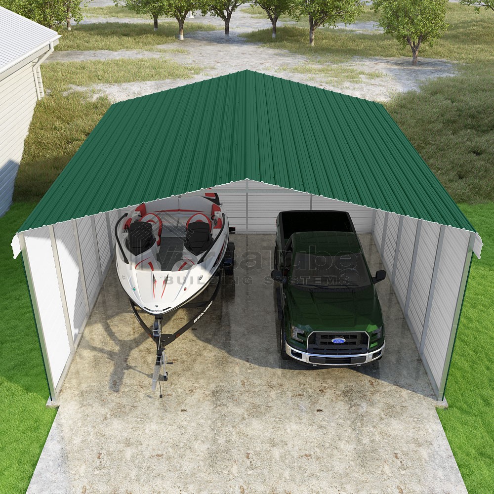 Classic Series DIY carport kit features horizontal application of sheet metal panels with the extra protection of rounded eaves.