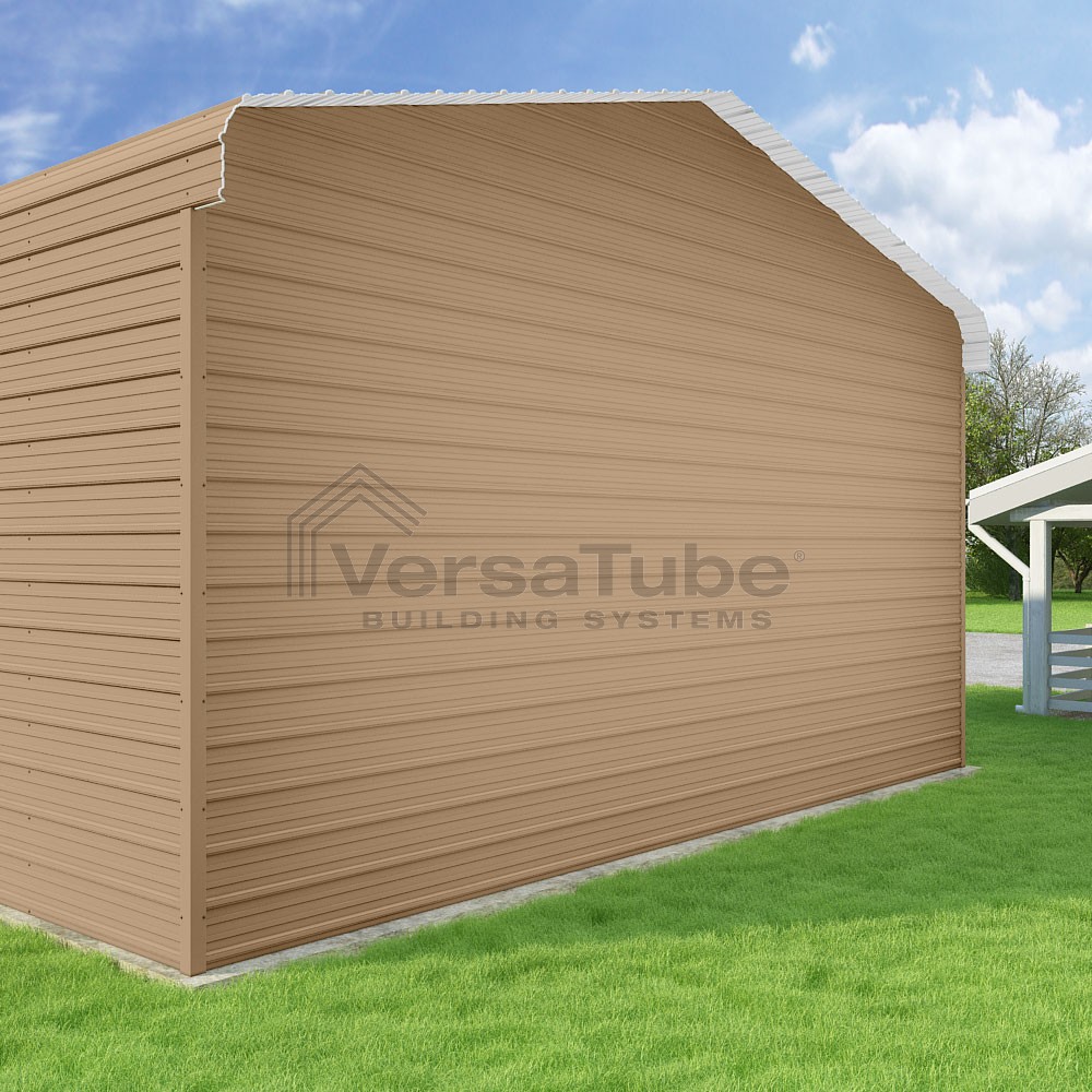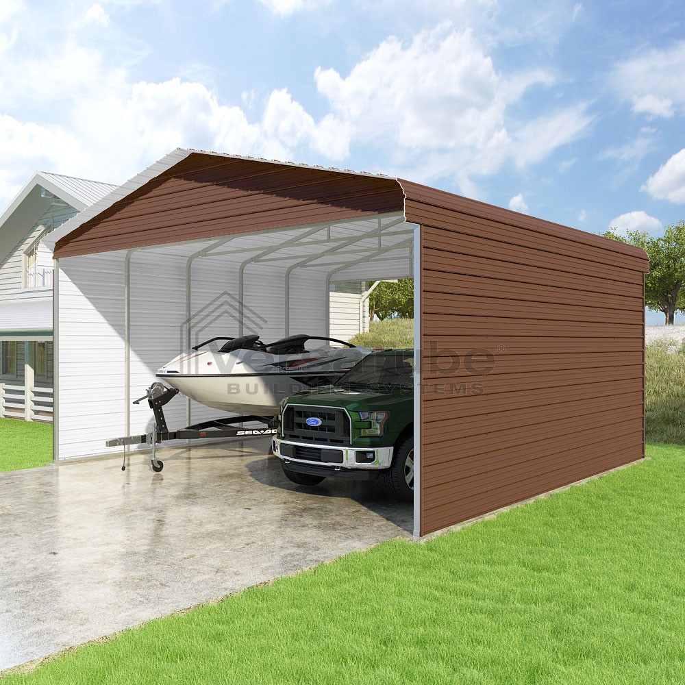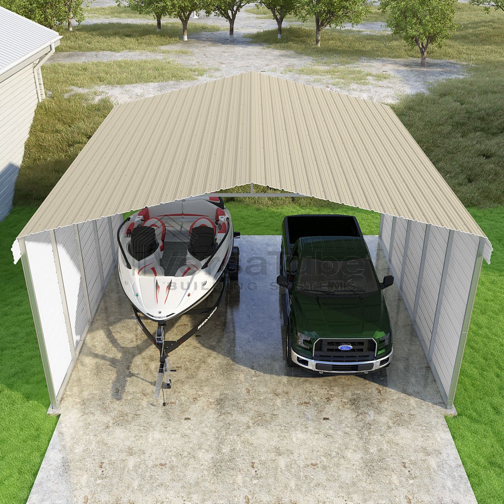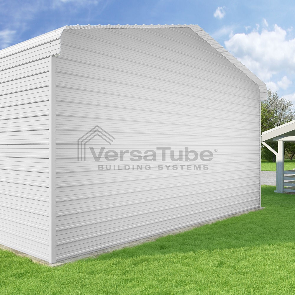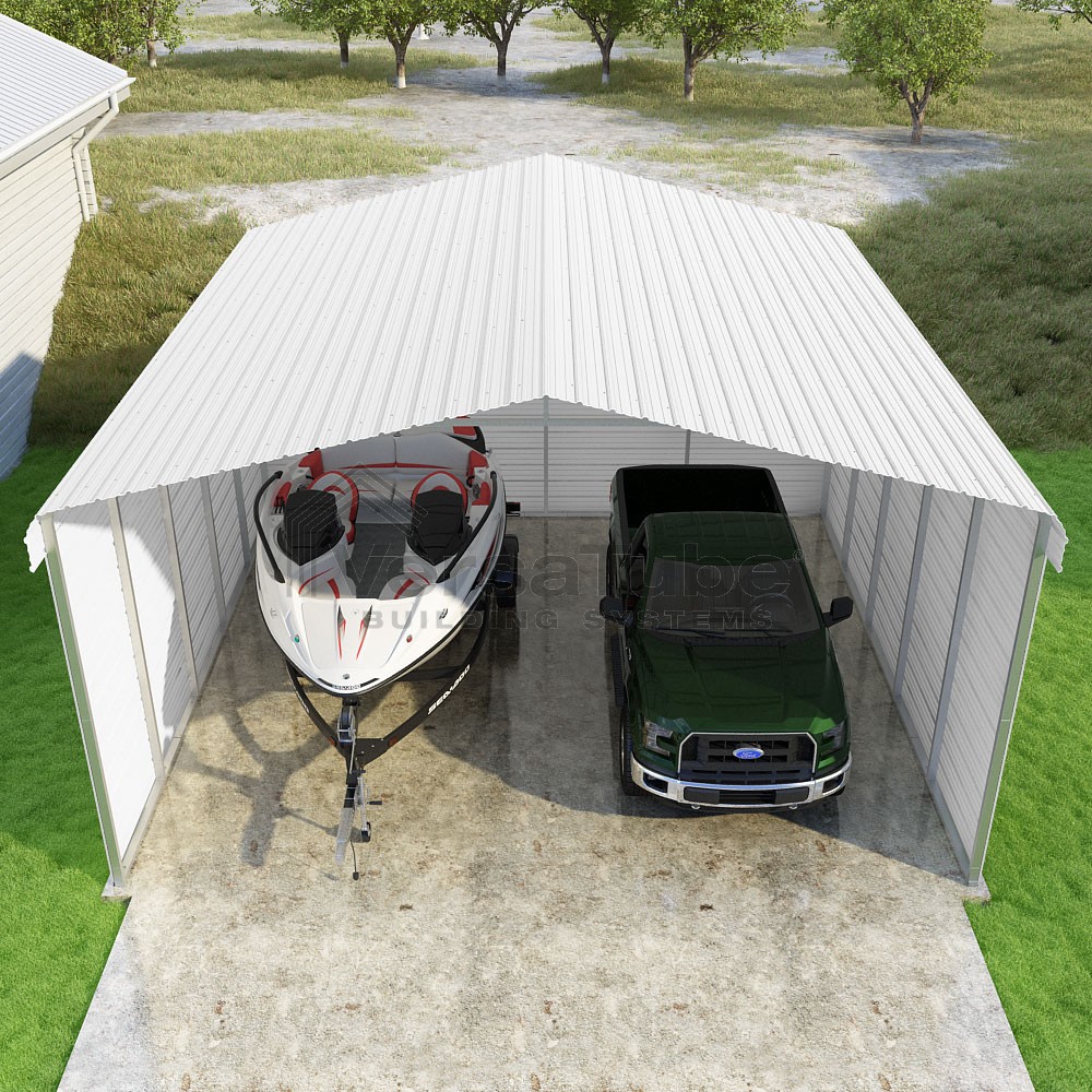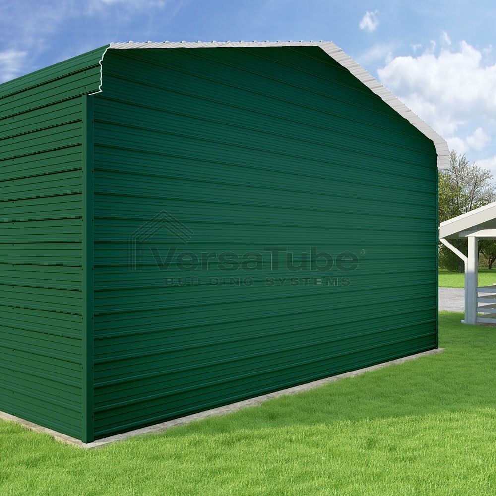 Classic Series DIY carport kit features horizontal application of sheet metal panels with the extra protection of rounded eaves.