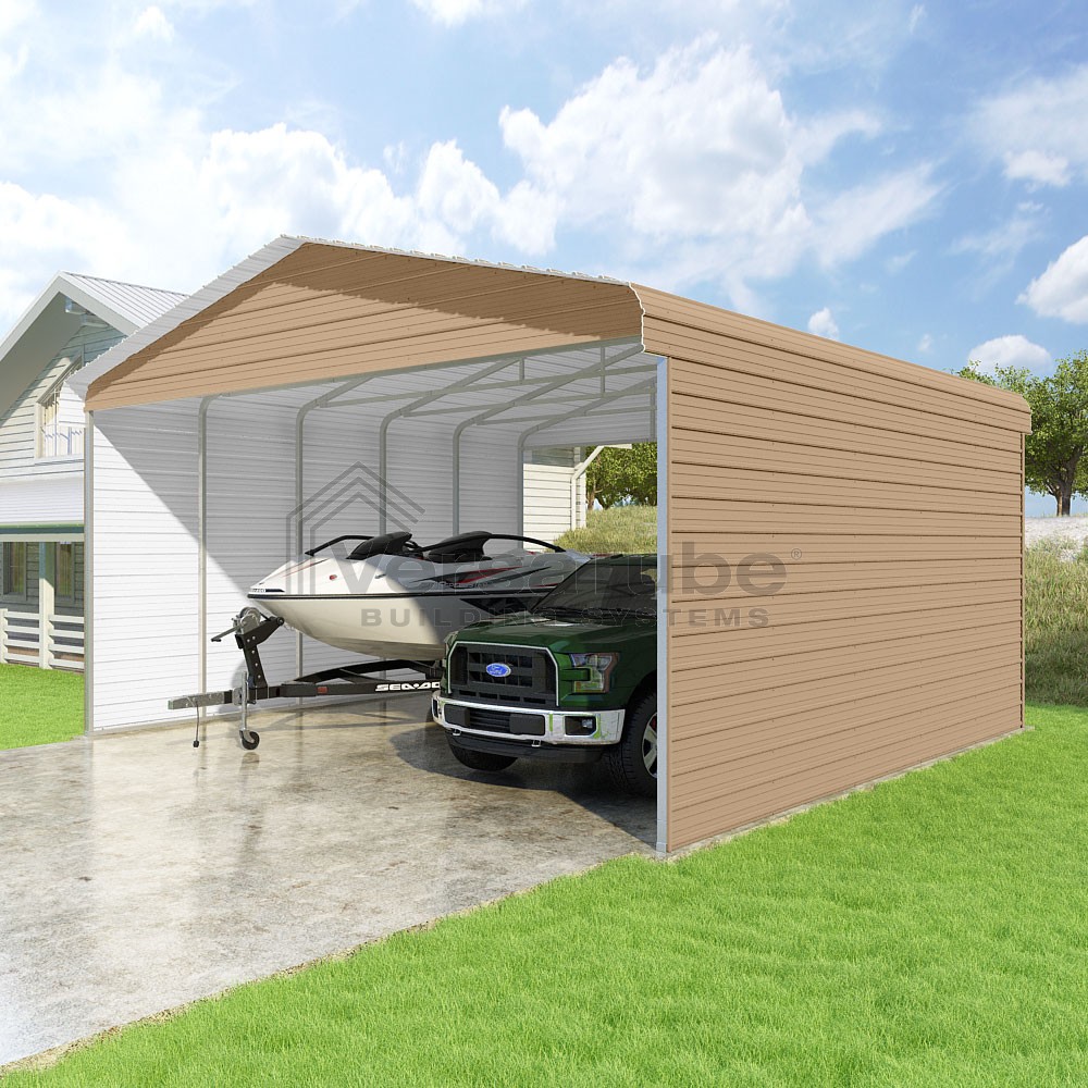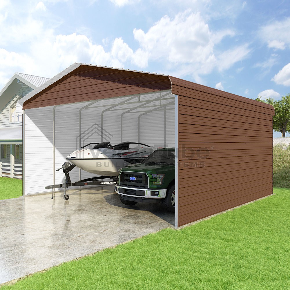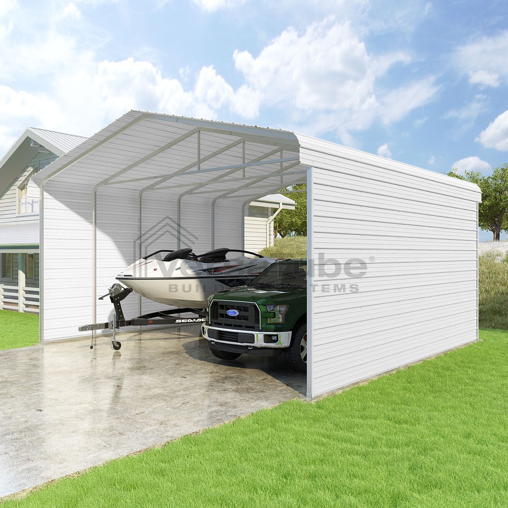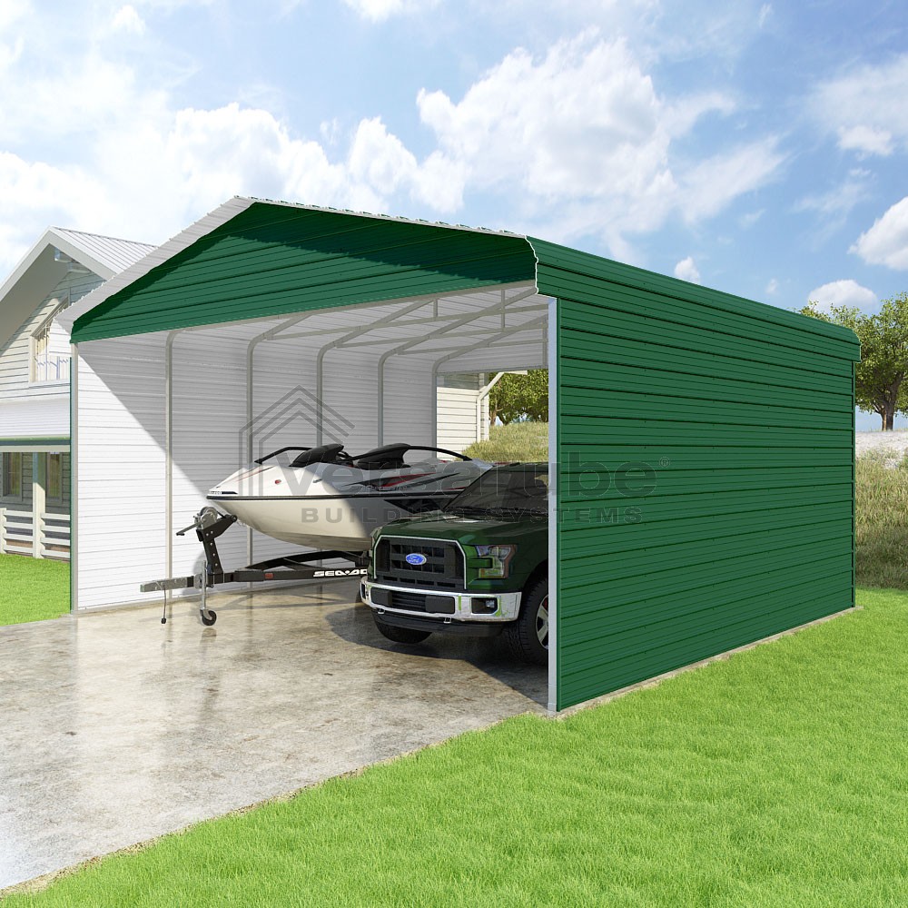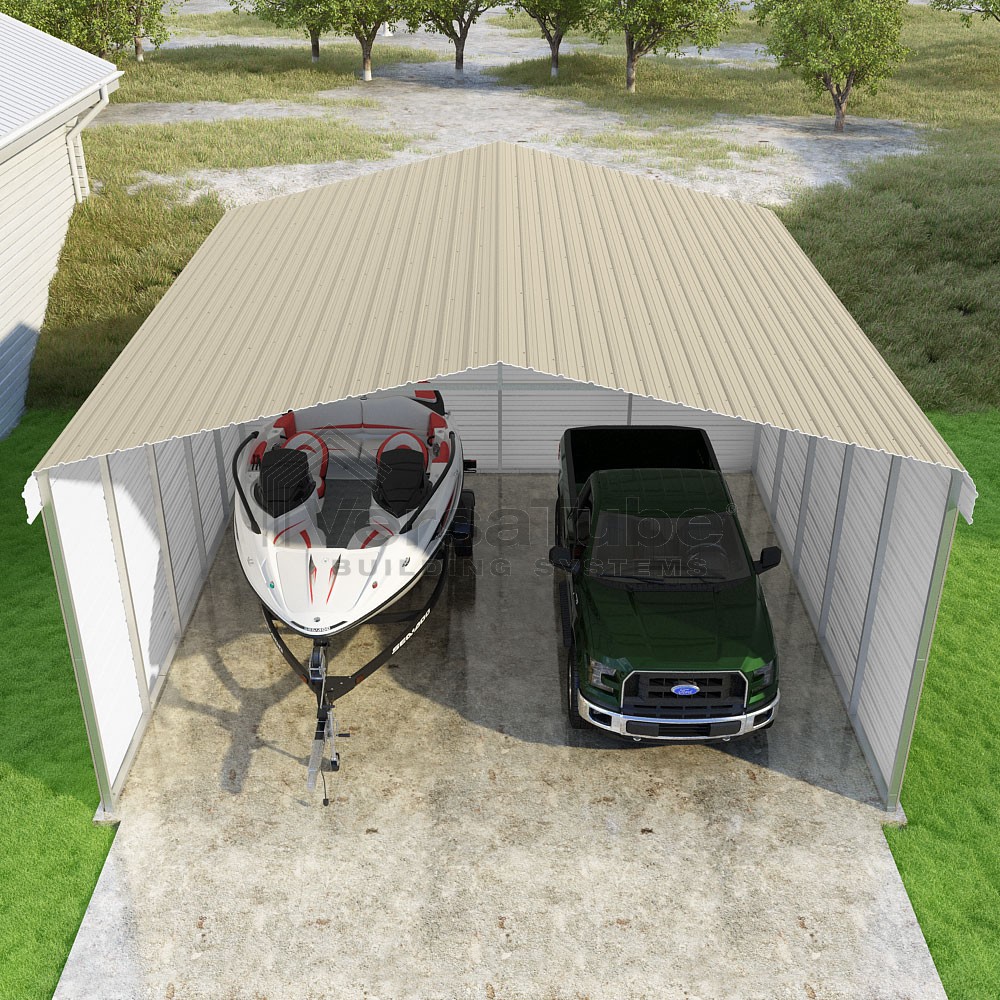 Classic Series DIY carport kit features horizontal application of sheet metal panels with the extra protection of rounded eaves.