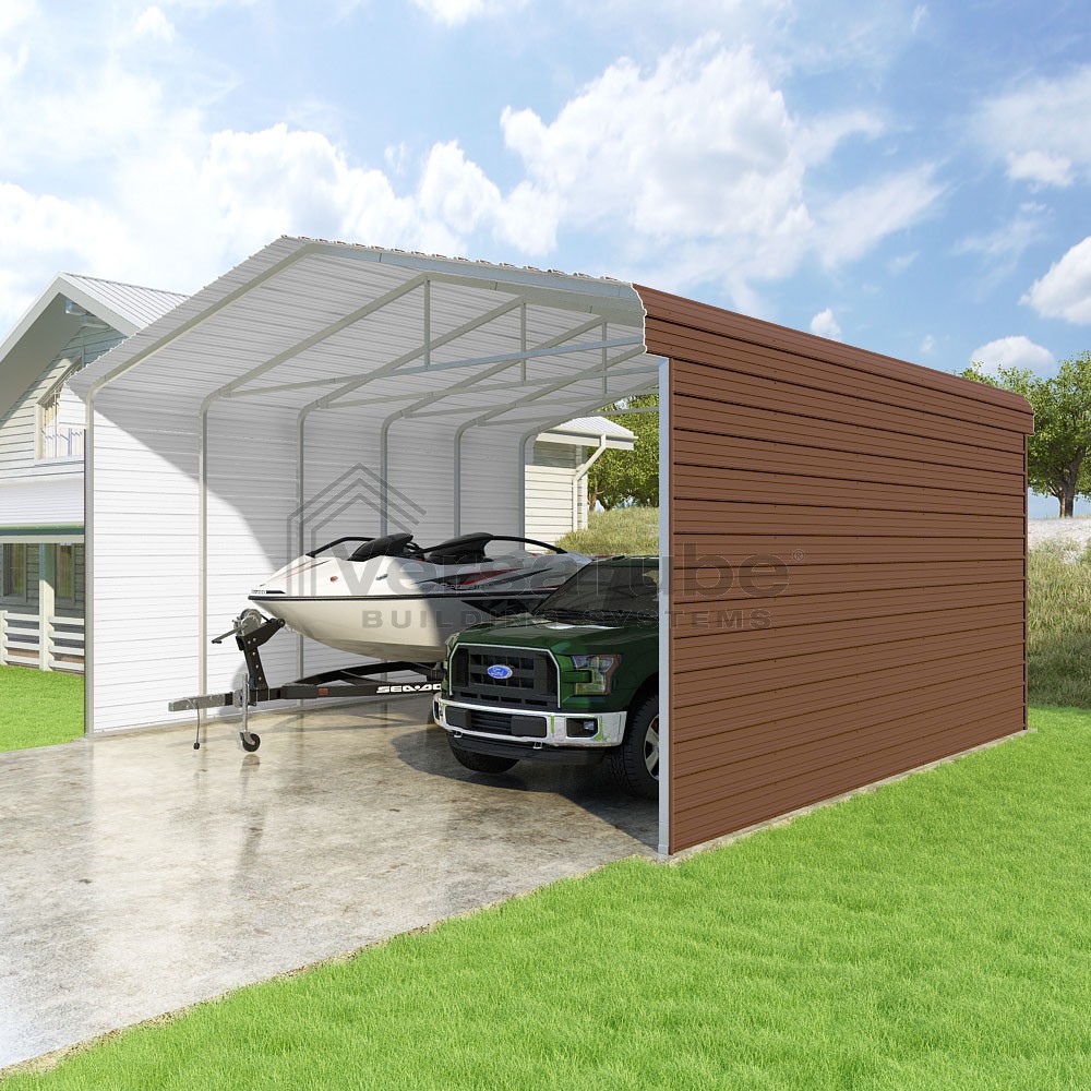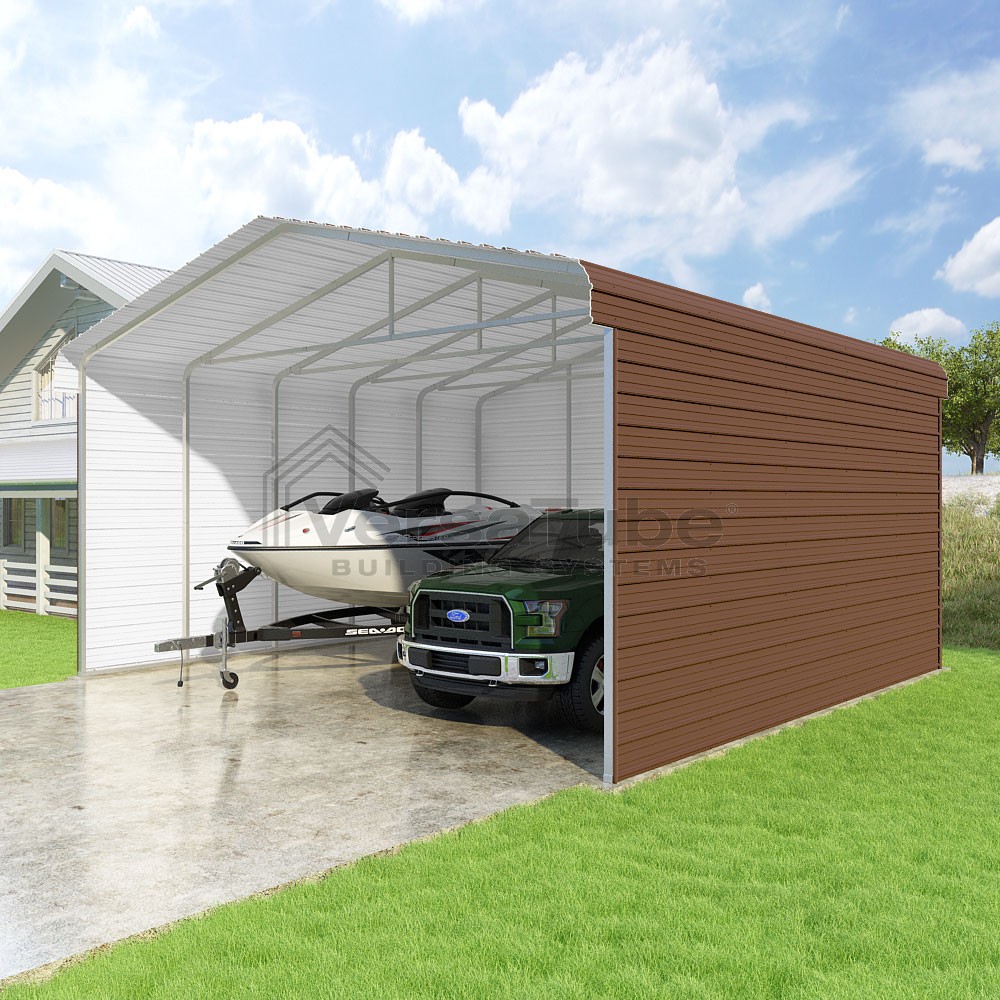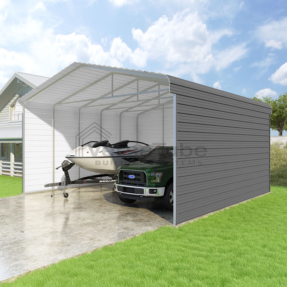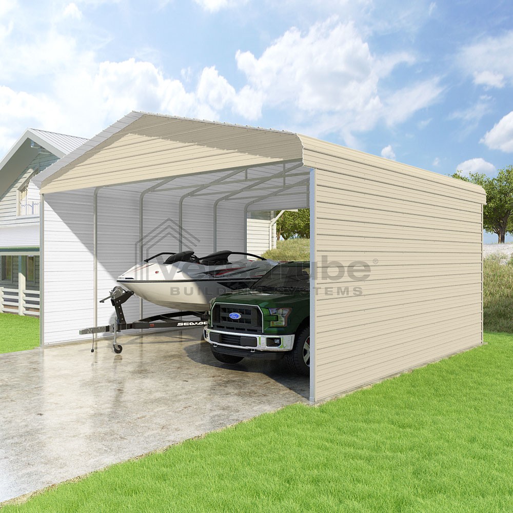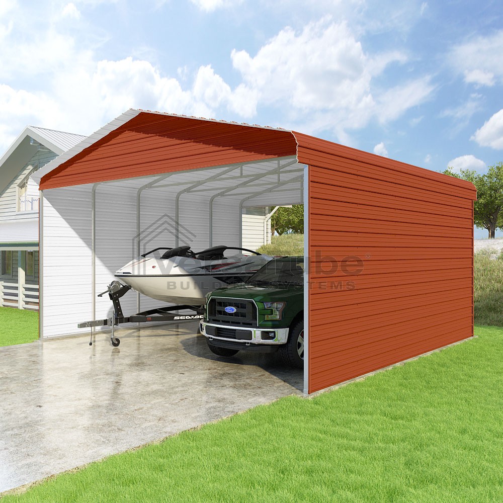 Classic Series DIY carport kit features horizontal application of sheet metal panels with the extra protection of rounded eaves.