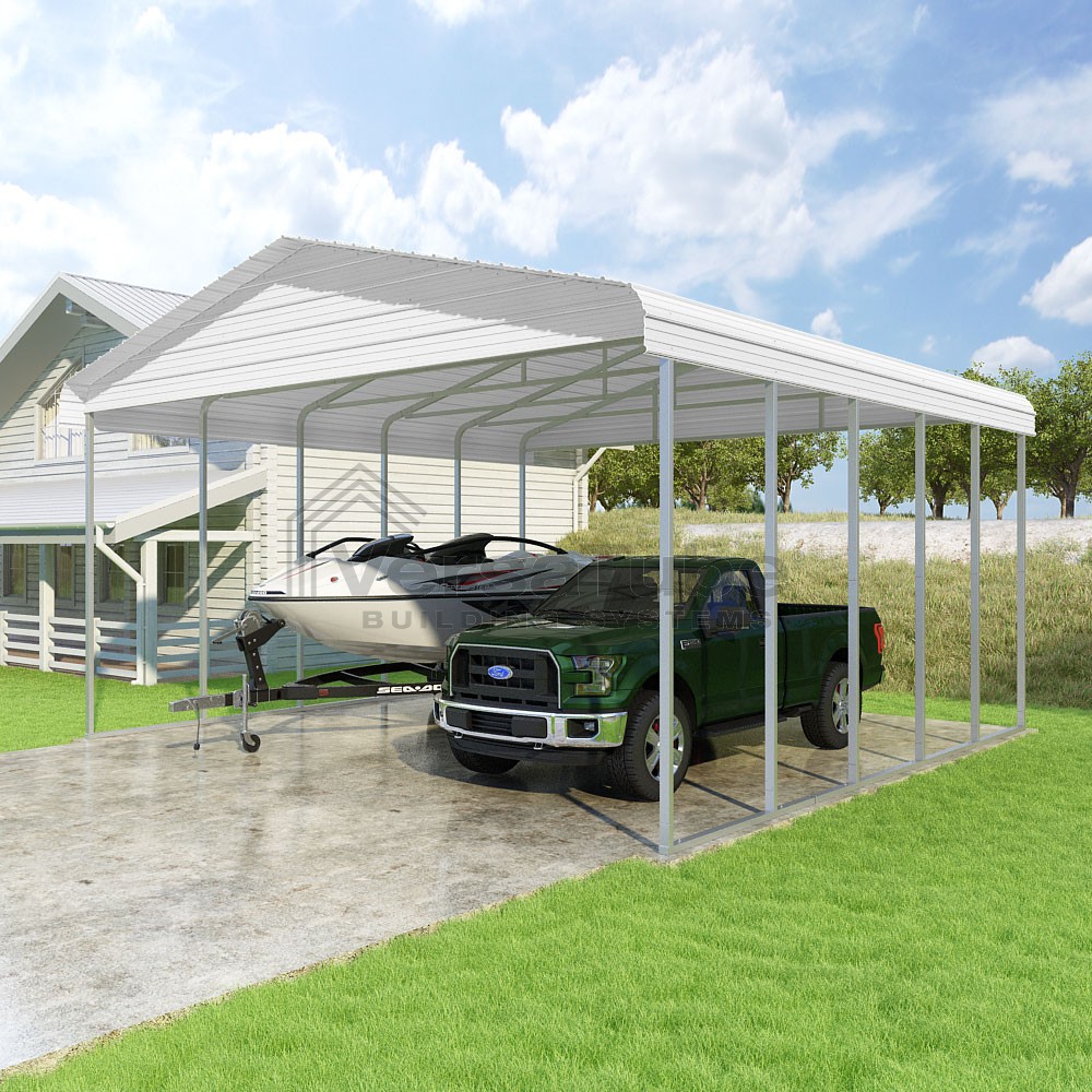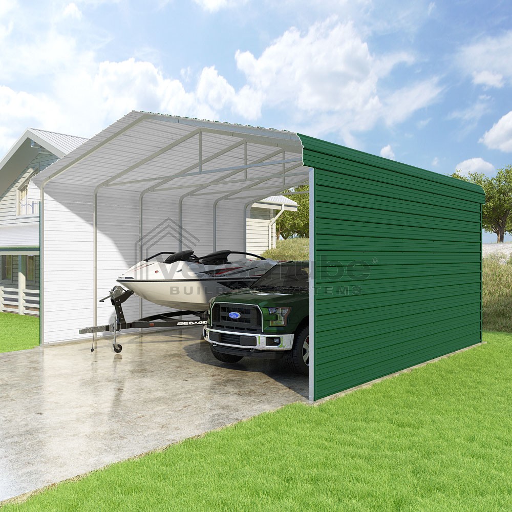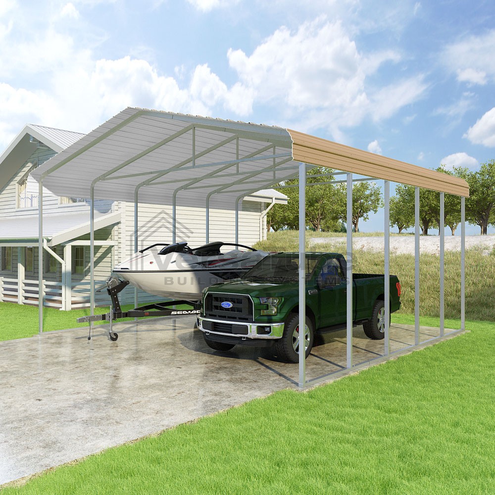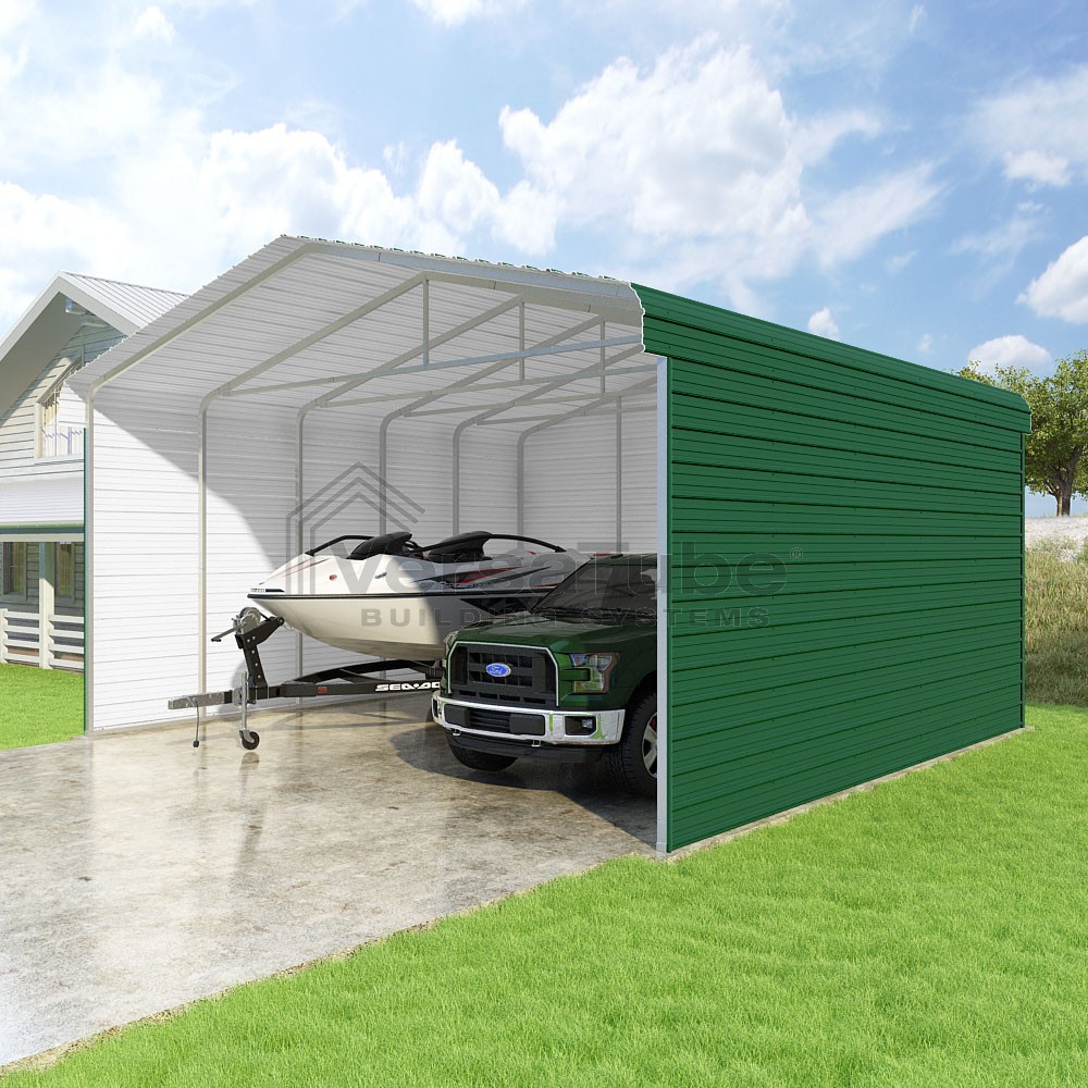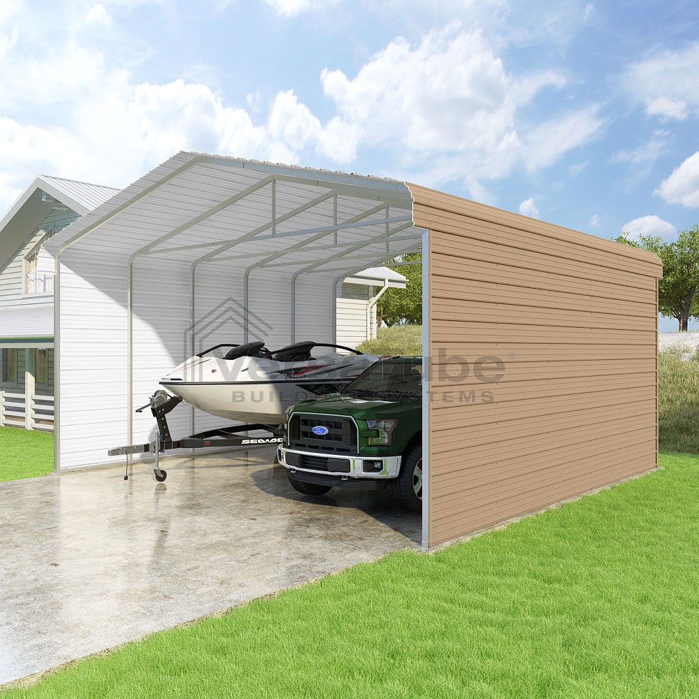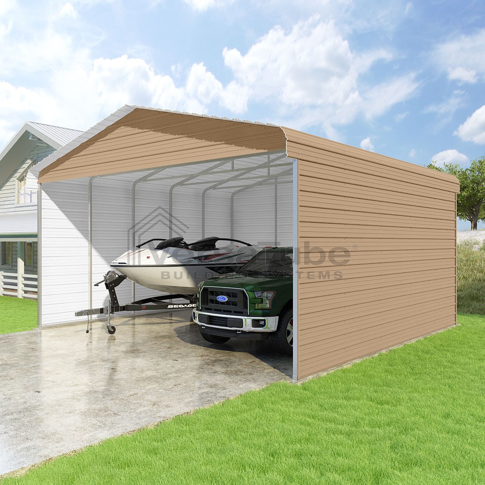 Classic Series DIY carport kit features horizontal application of sheet metal panels with the extra protection of rounded eaves.