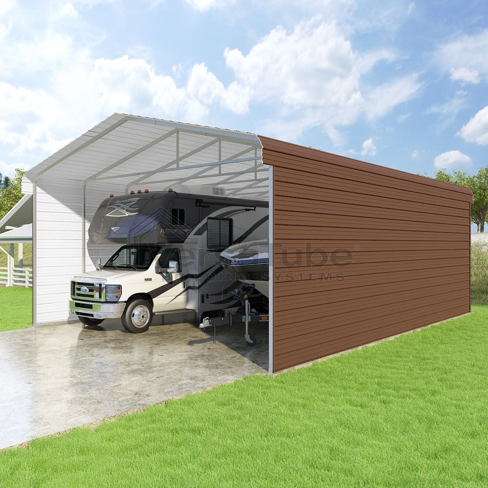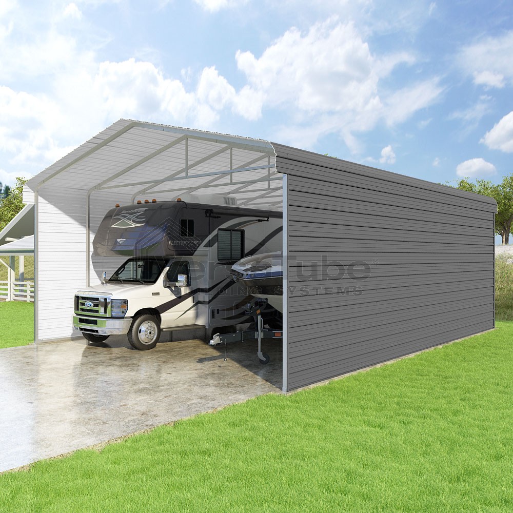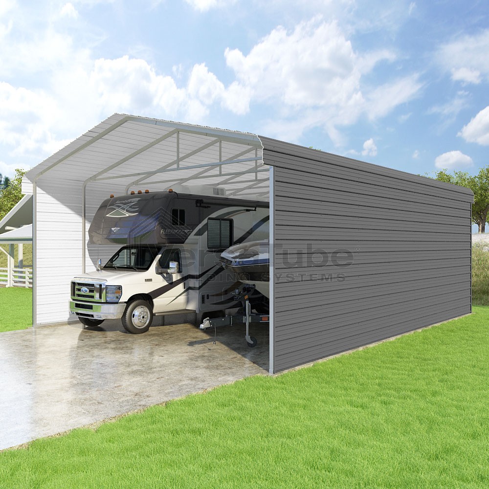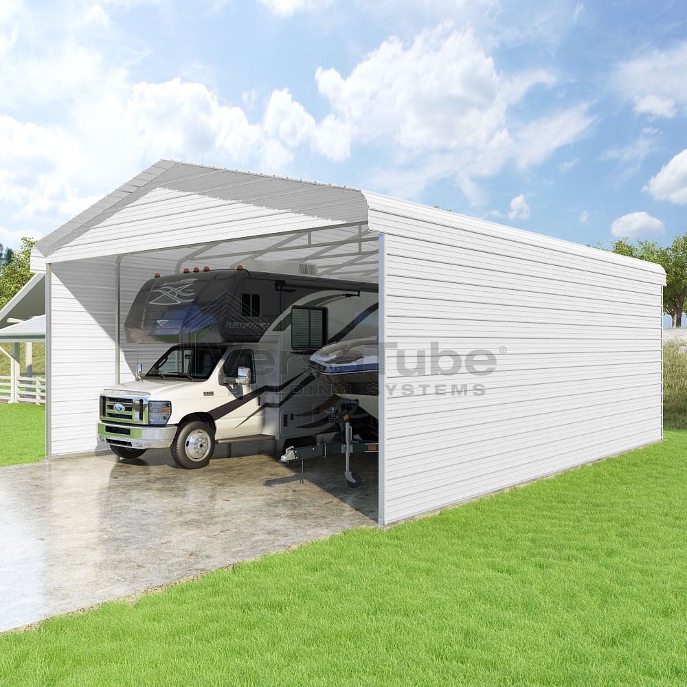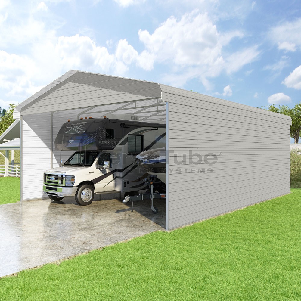 Classic Series DIY carport kit features horizontal application of sheet metal panels with the extra protection of rounded eaves.
