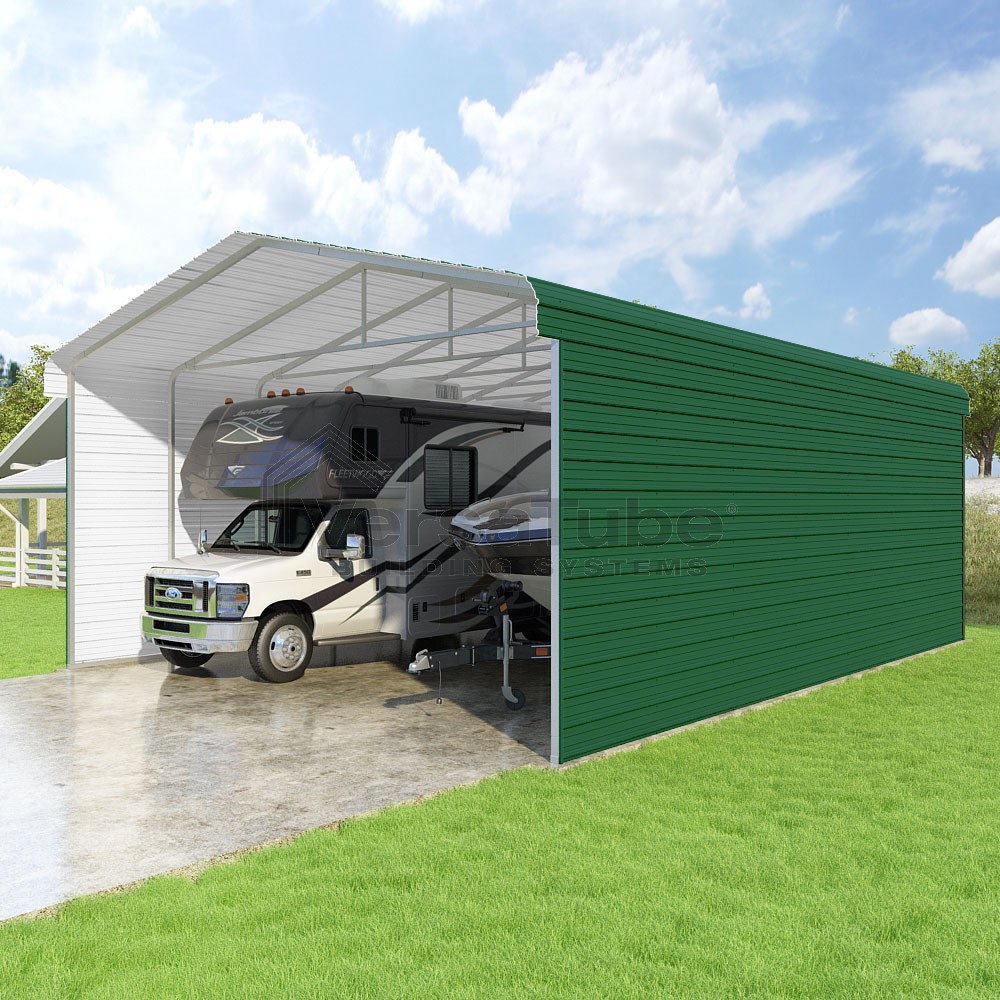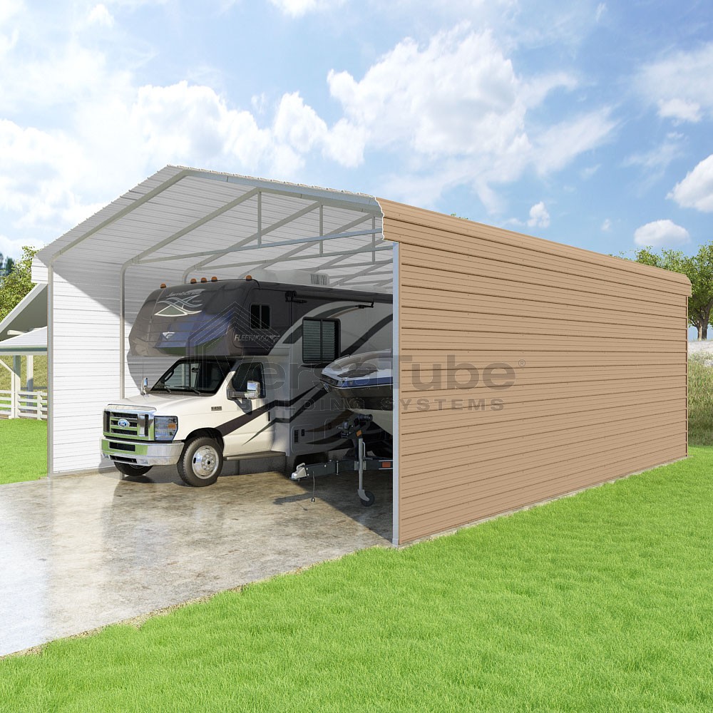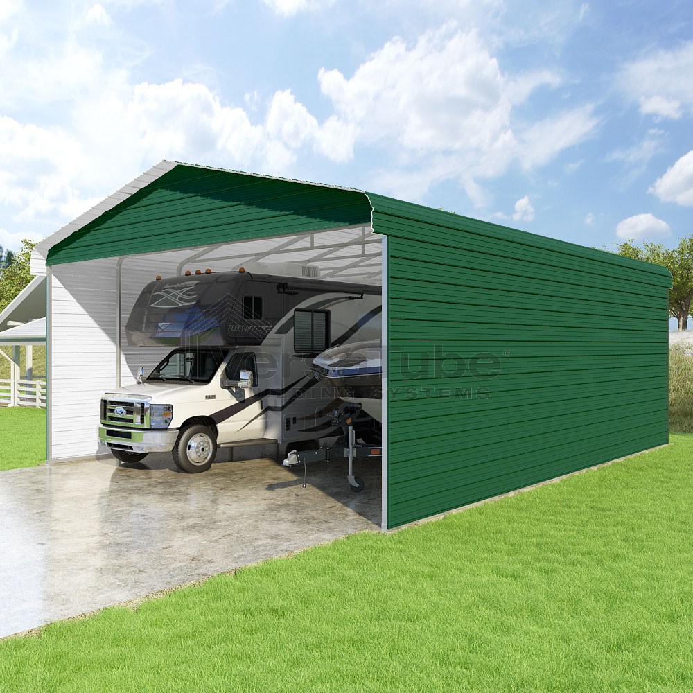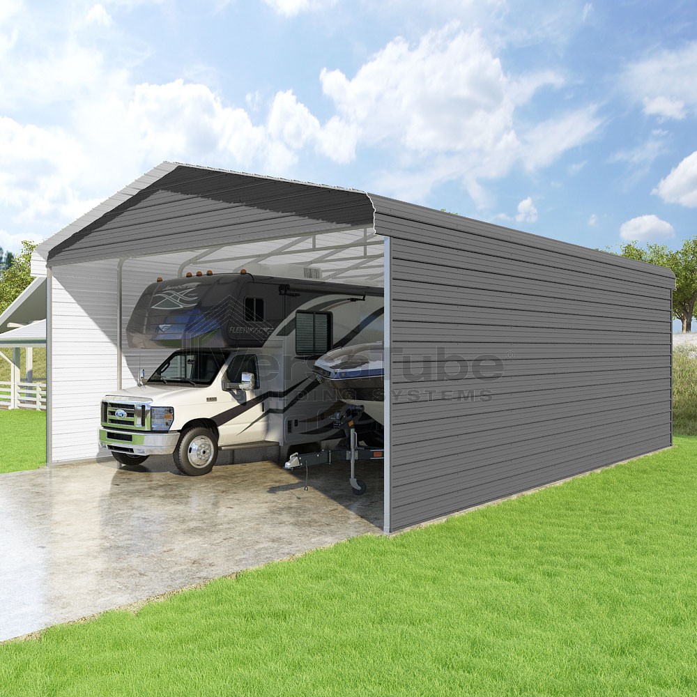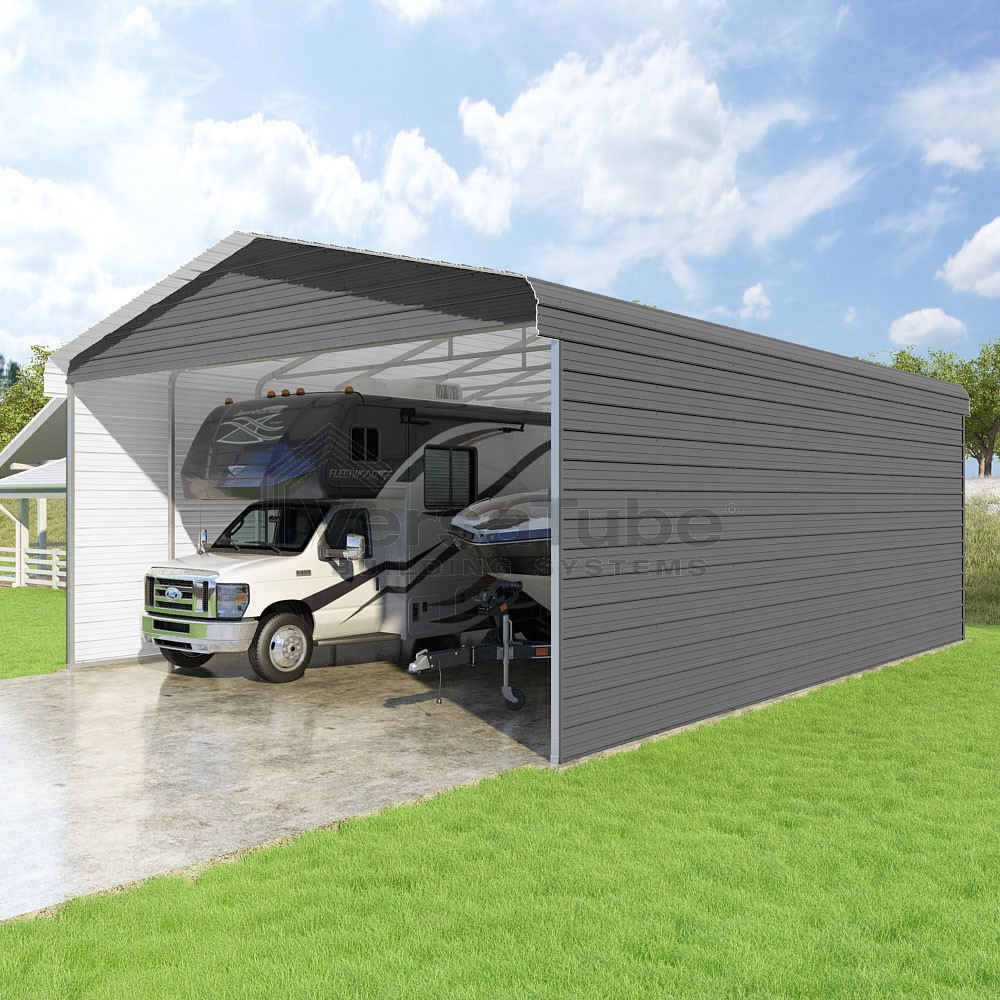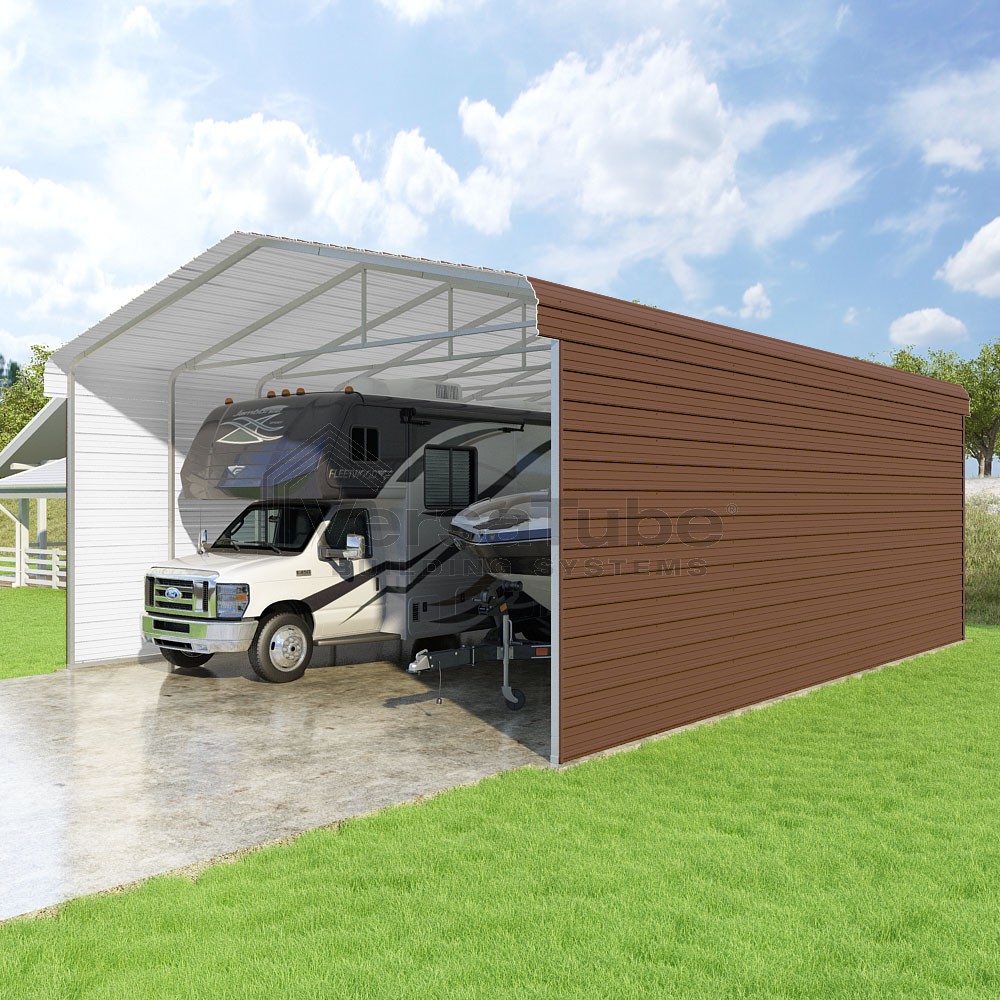 Classic Series DIY carport kit features horizontal application of sheet metal panels with the extra protection of rounded eaves.