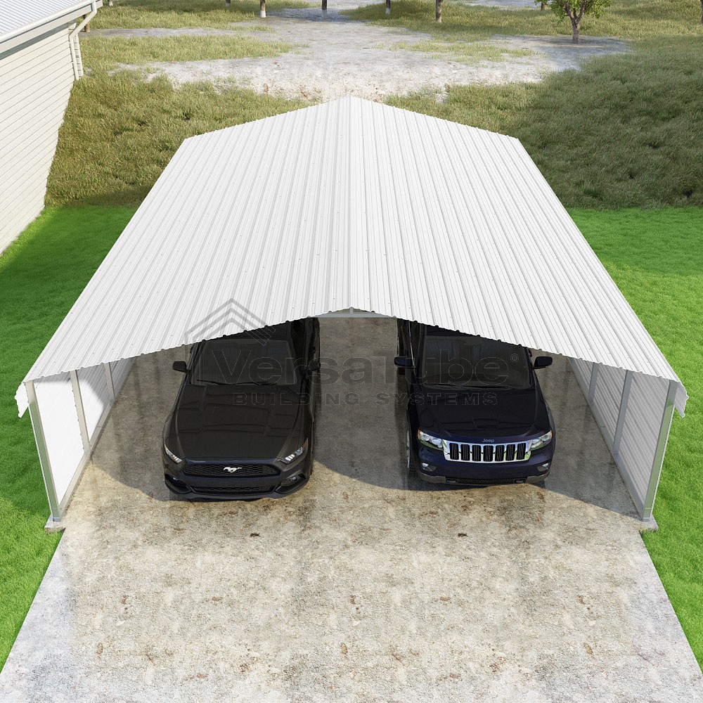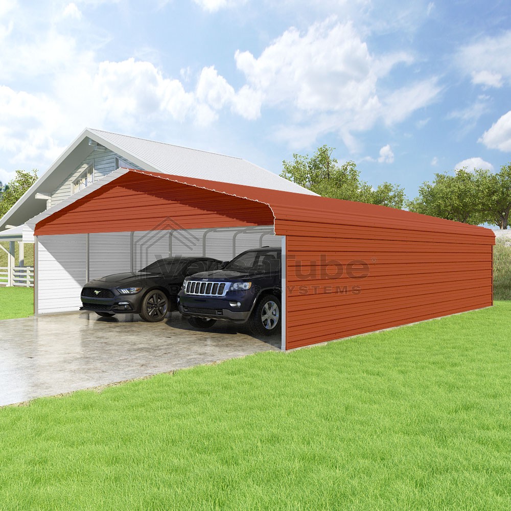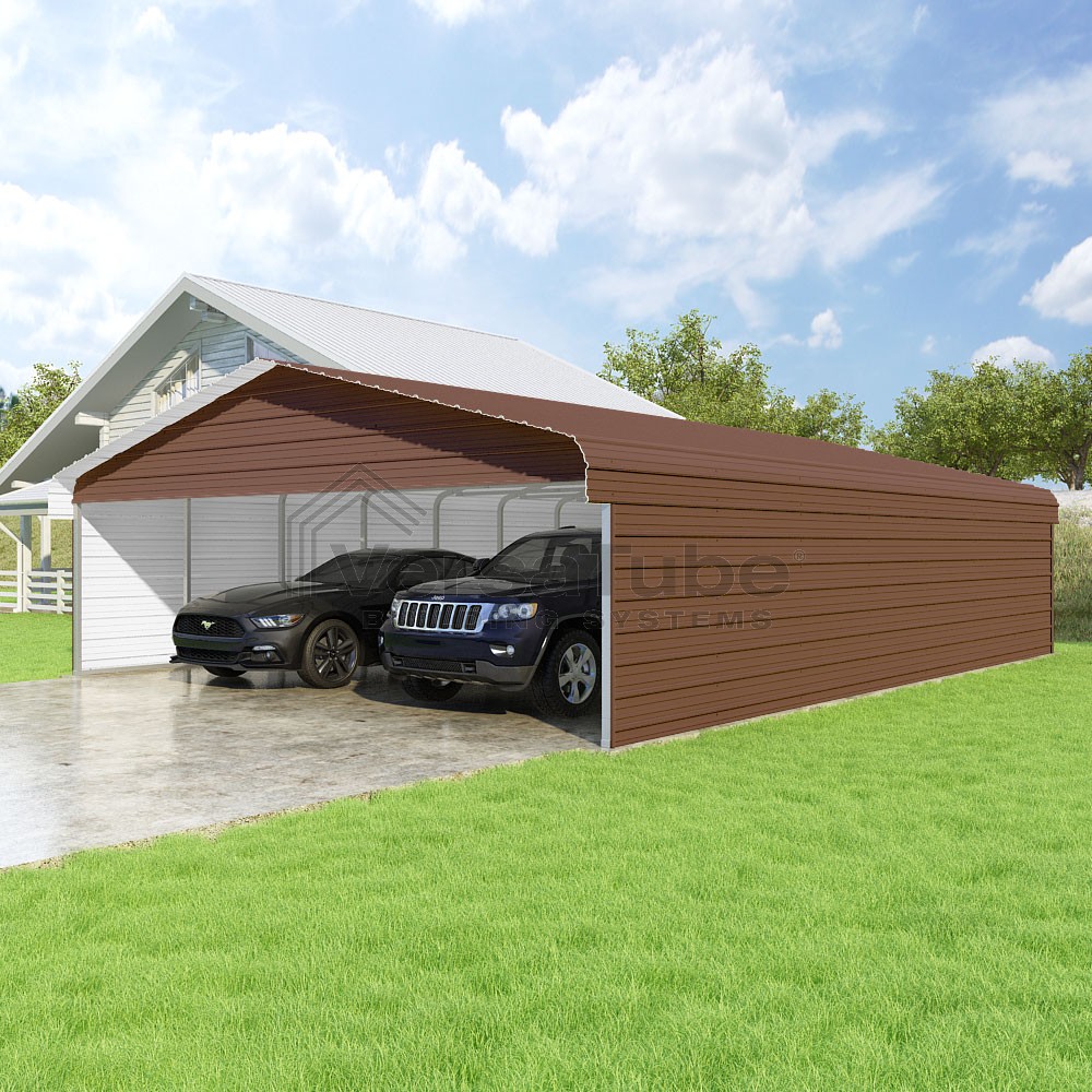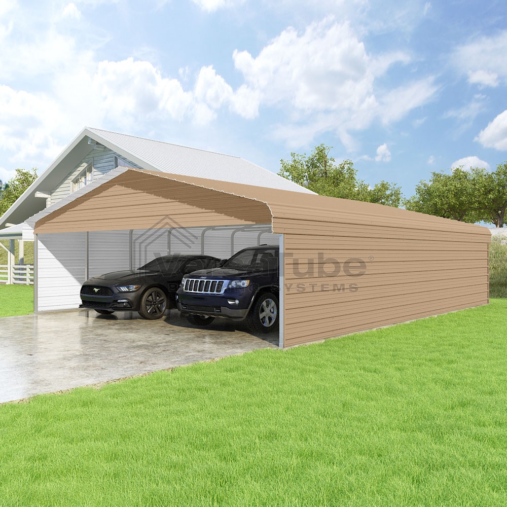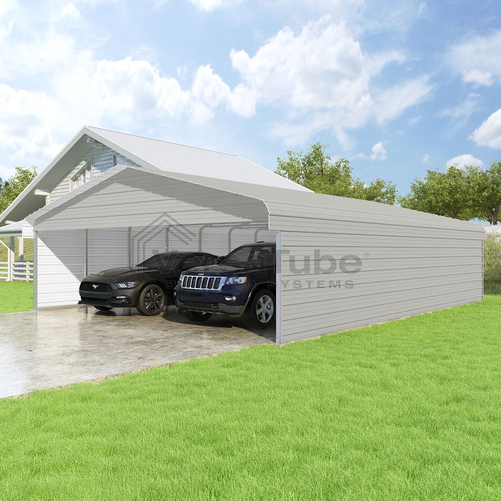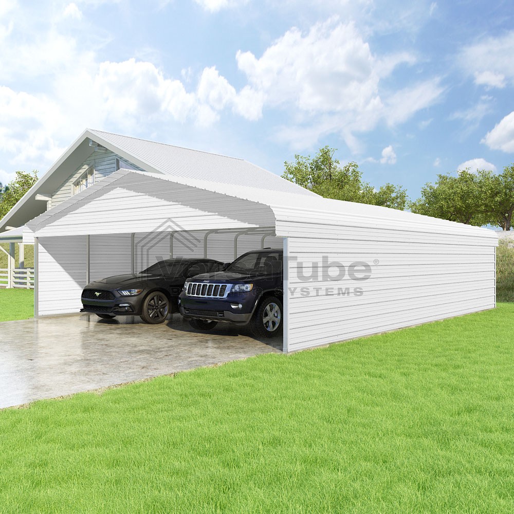 Classic Series DIY carport kit features horizontal application of sheet metal panels with the extra protection of rounded eaves.