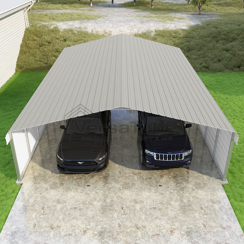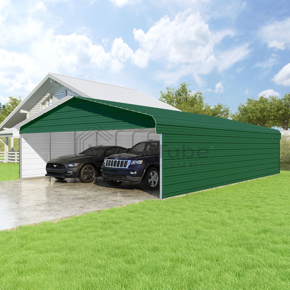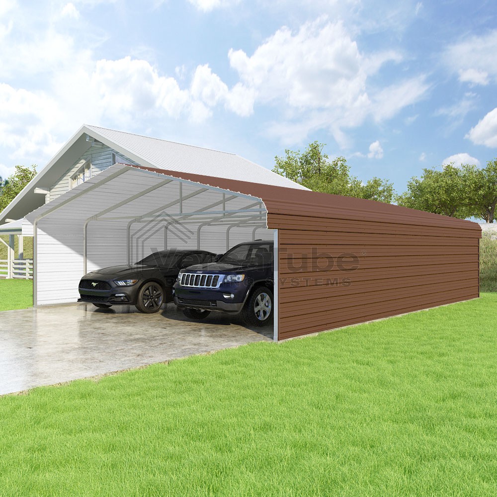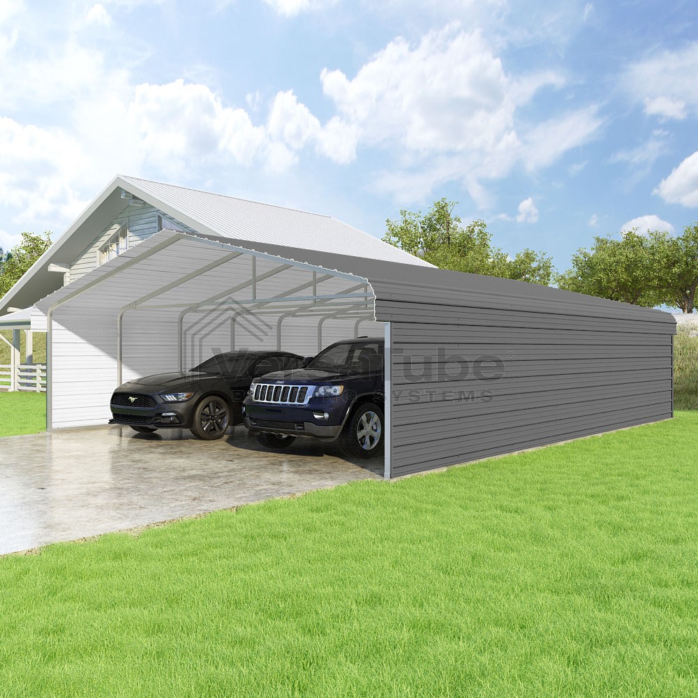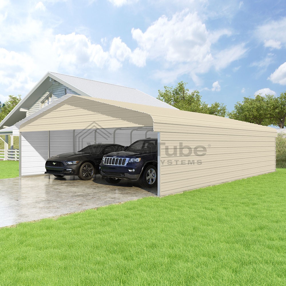 Classic Series DIY carport kit features horizontal application of sheet metal panels with the extra protection of rounded eaves.