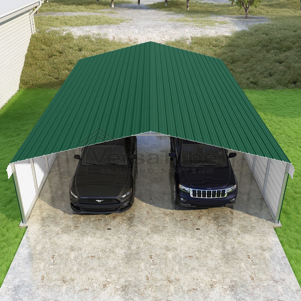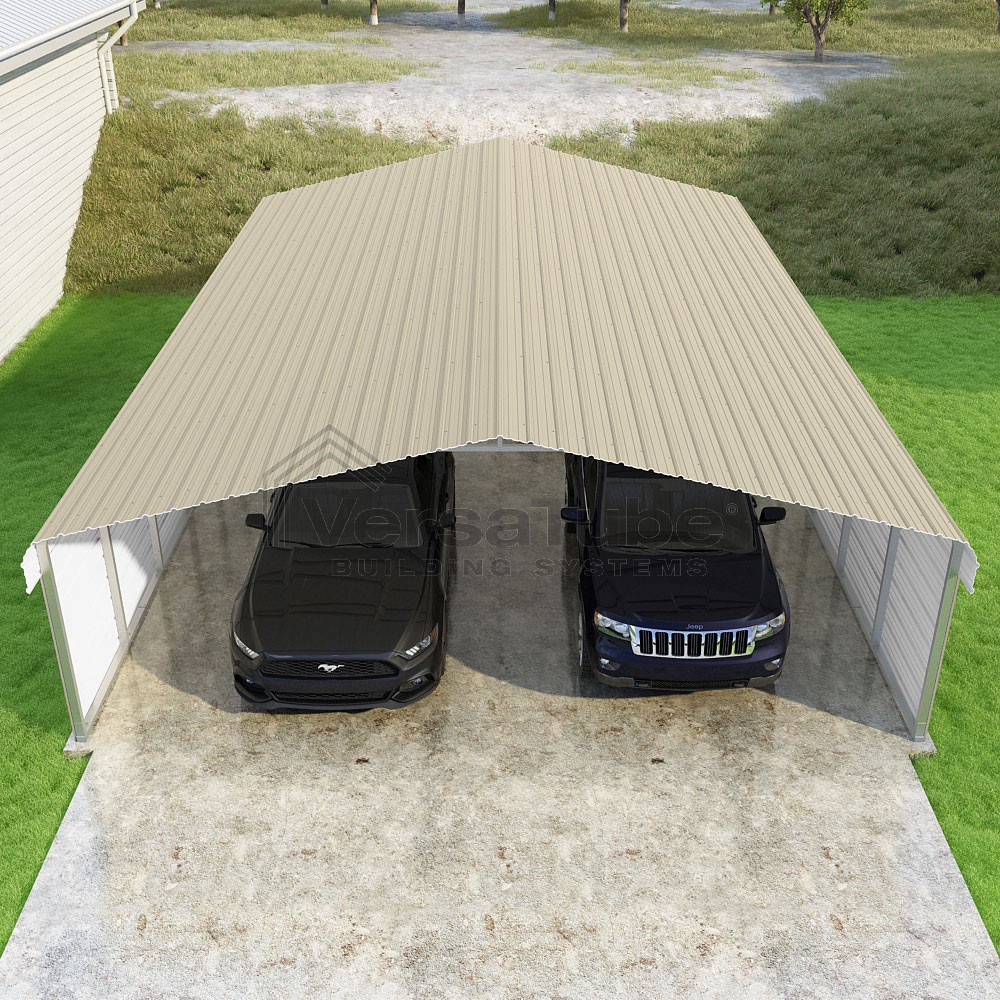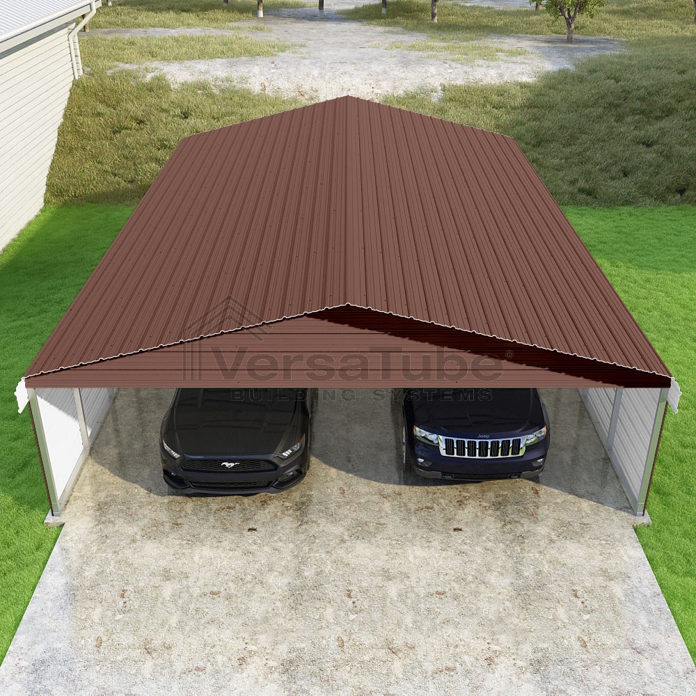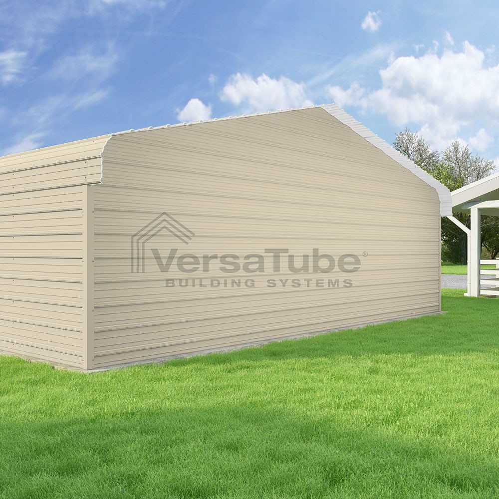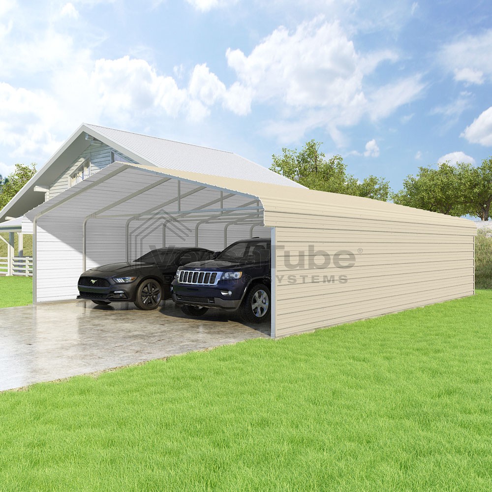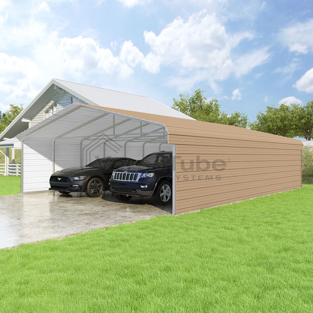 Classic Series DIY carport kit features horizontal application of sheet metal panels with the extra protection of rounded eaves.