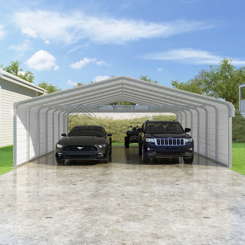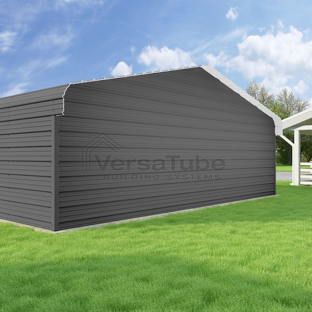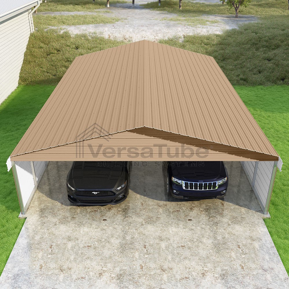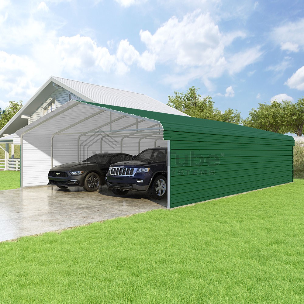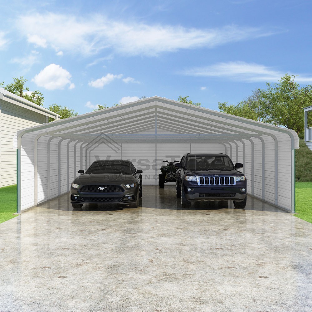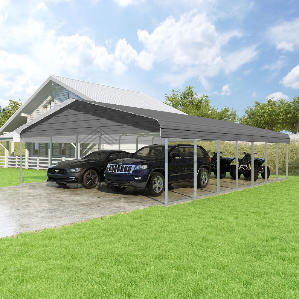 Classic Series DIY carport kit features horizontal application of sheet metal panels with the extra protection of rounded eaves.