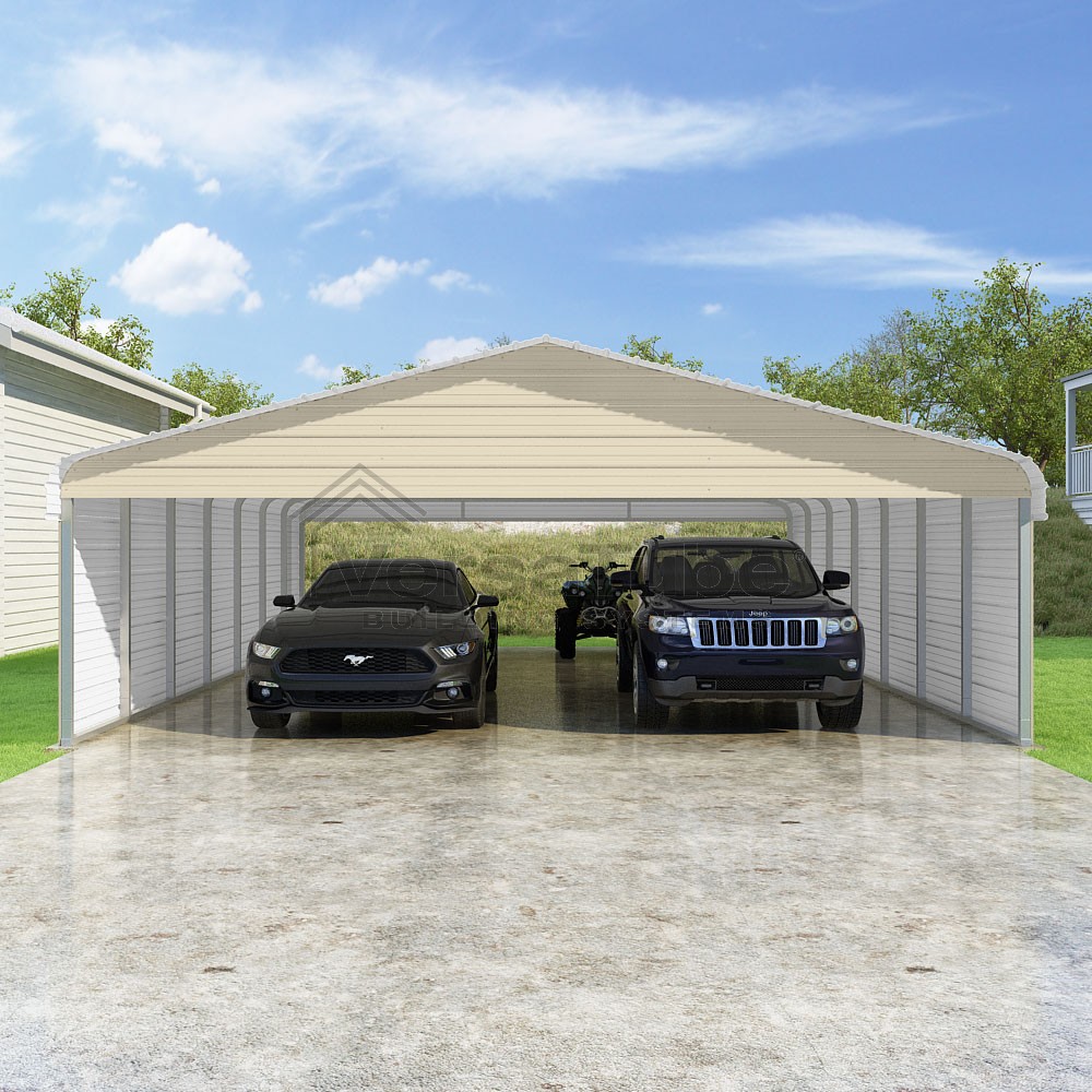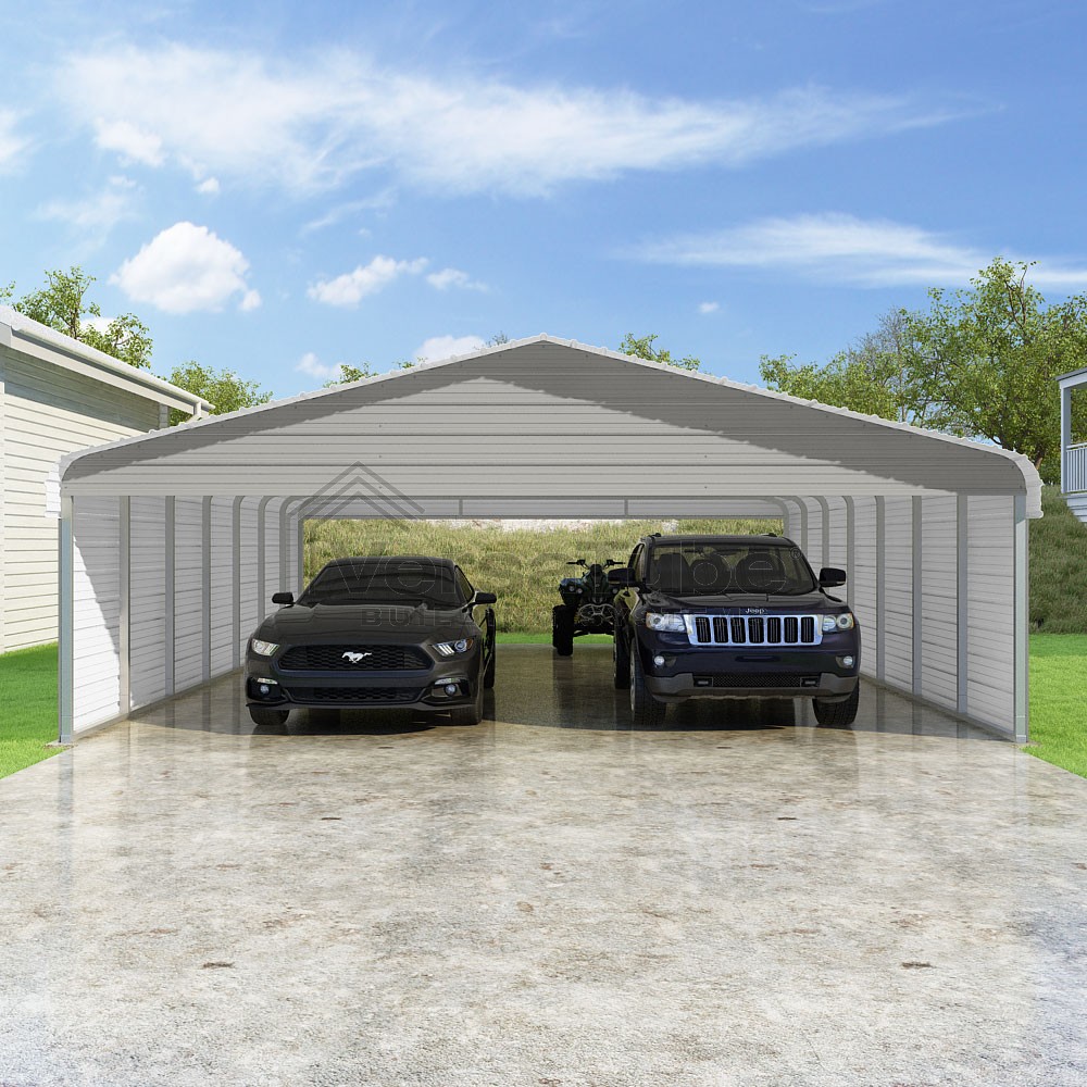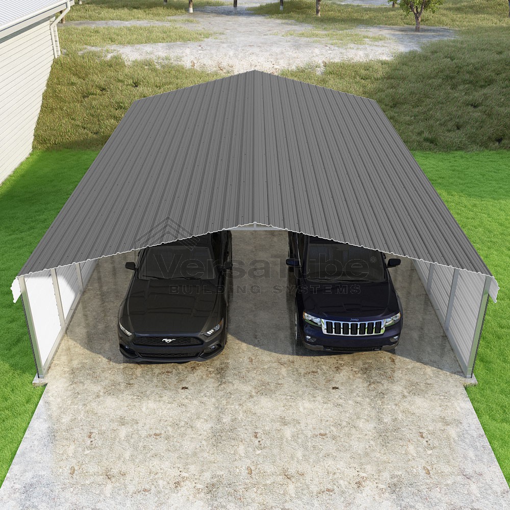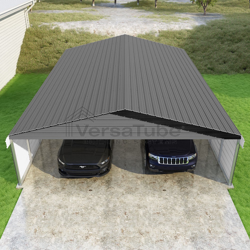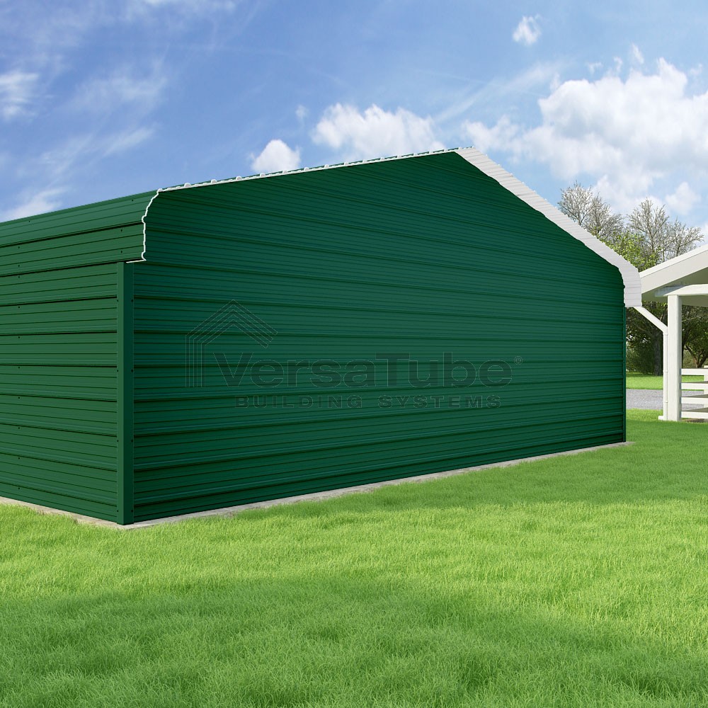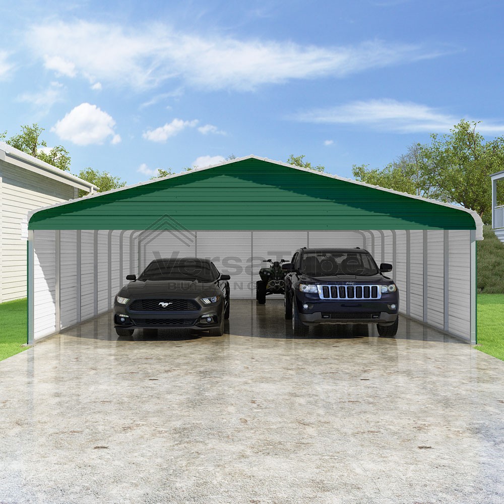 Classic Series DIY carport kit features horizontal application of sheet metal panels with the extra protection of rounded eaves.