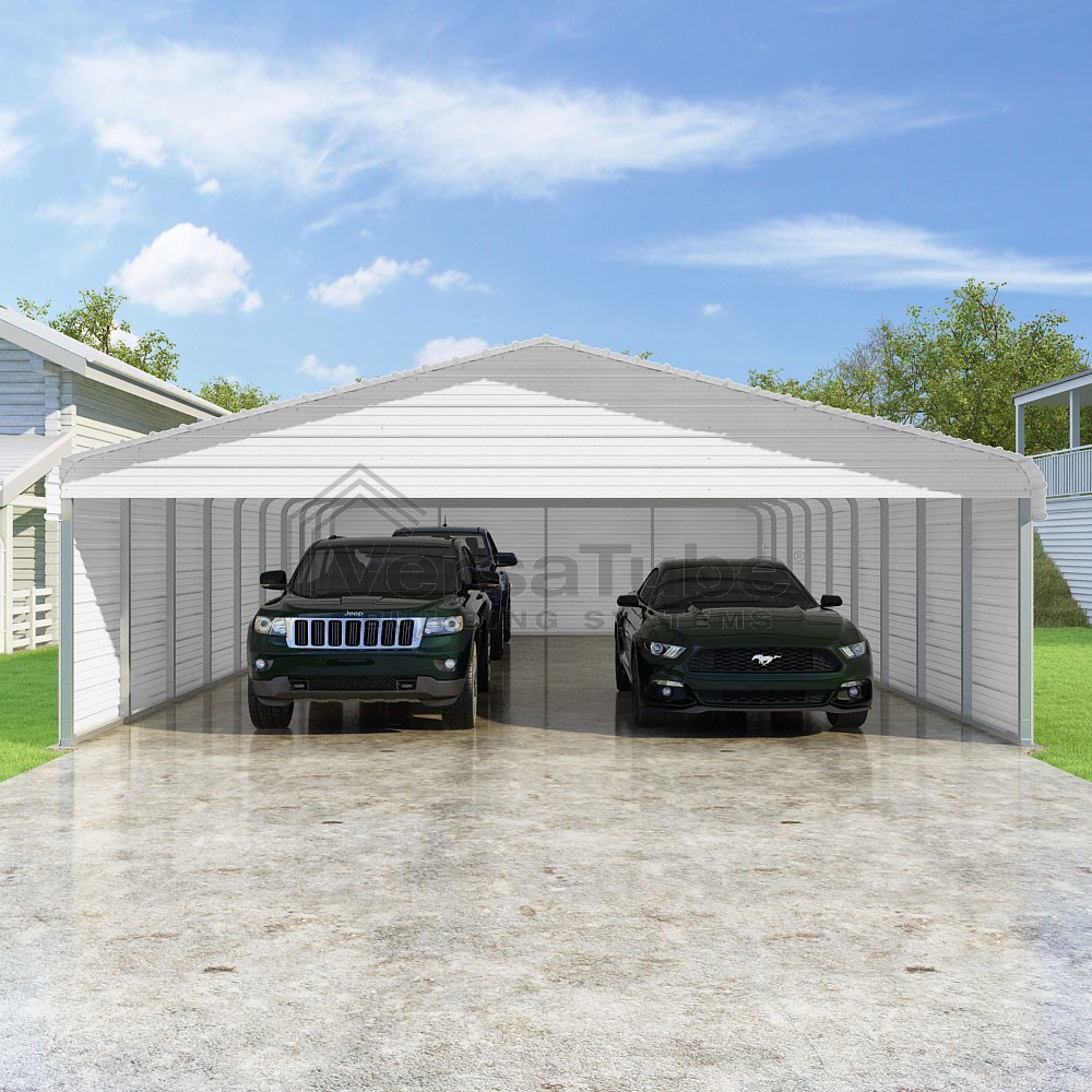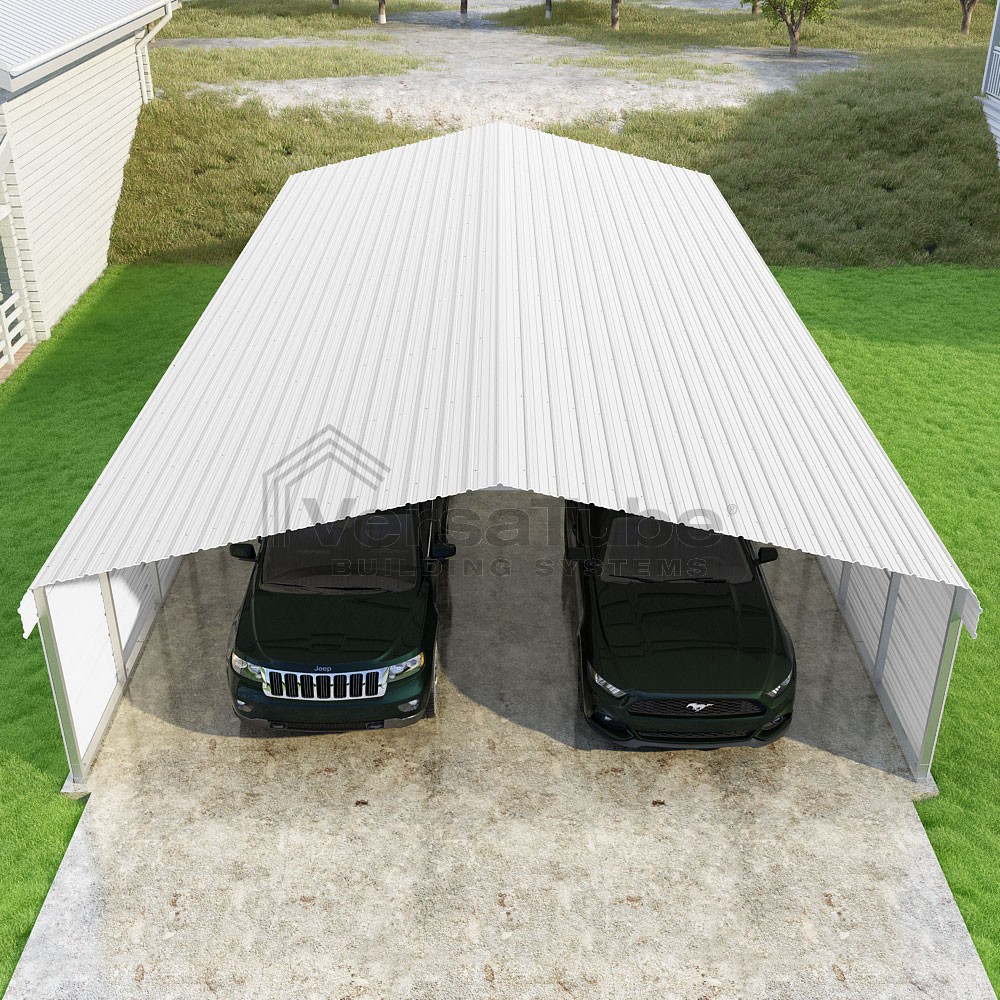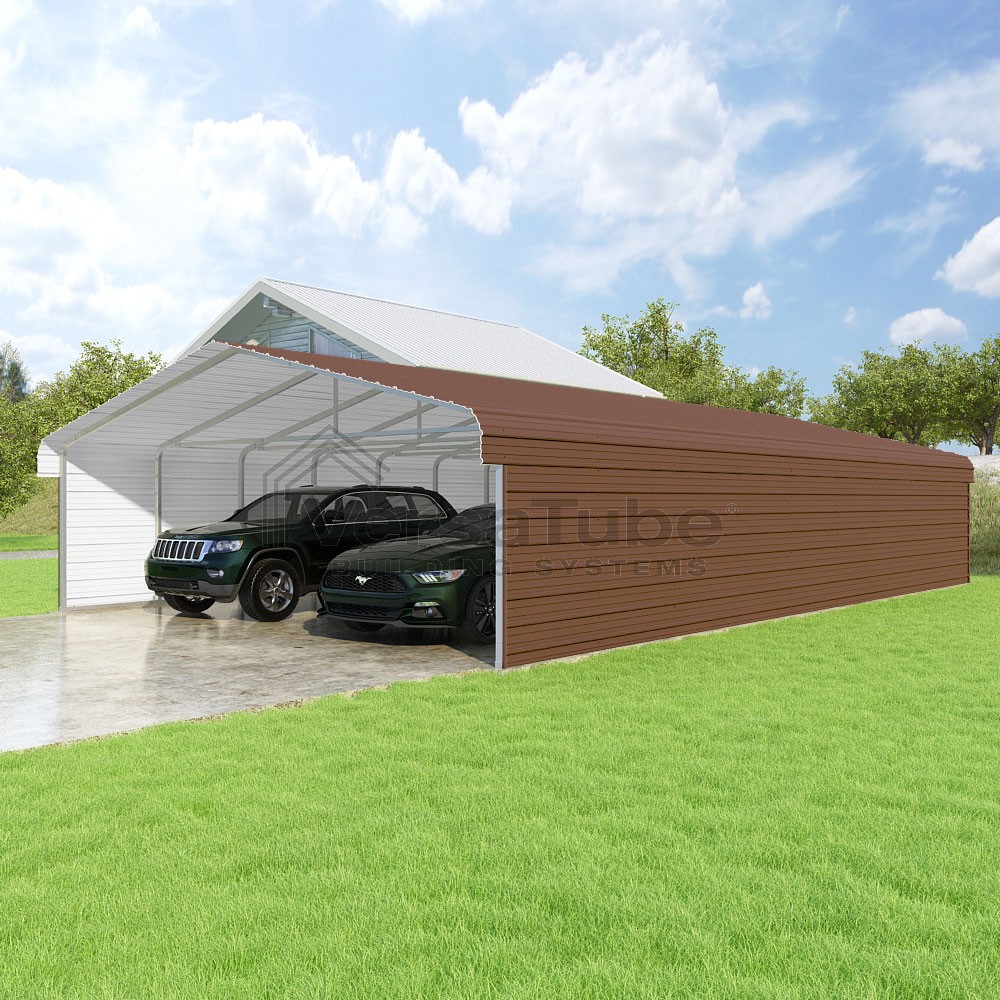 Classic Series DIY carport kit features horizontal application of sheet metal panels with the extra protection of rounded eaves.