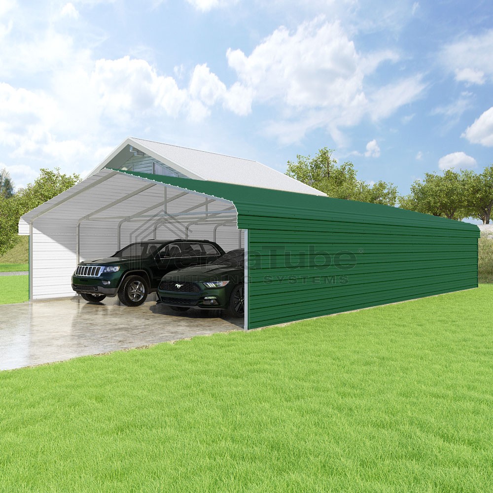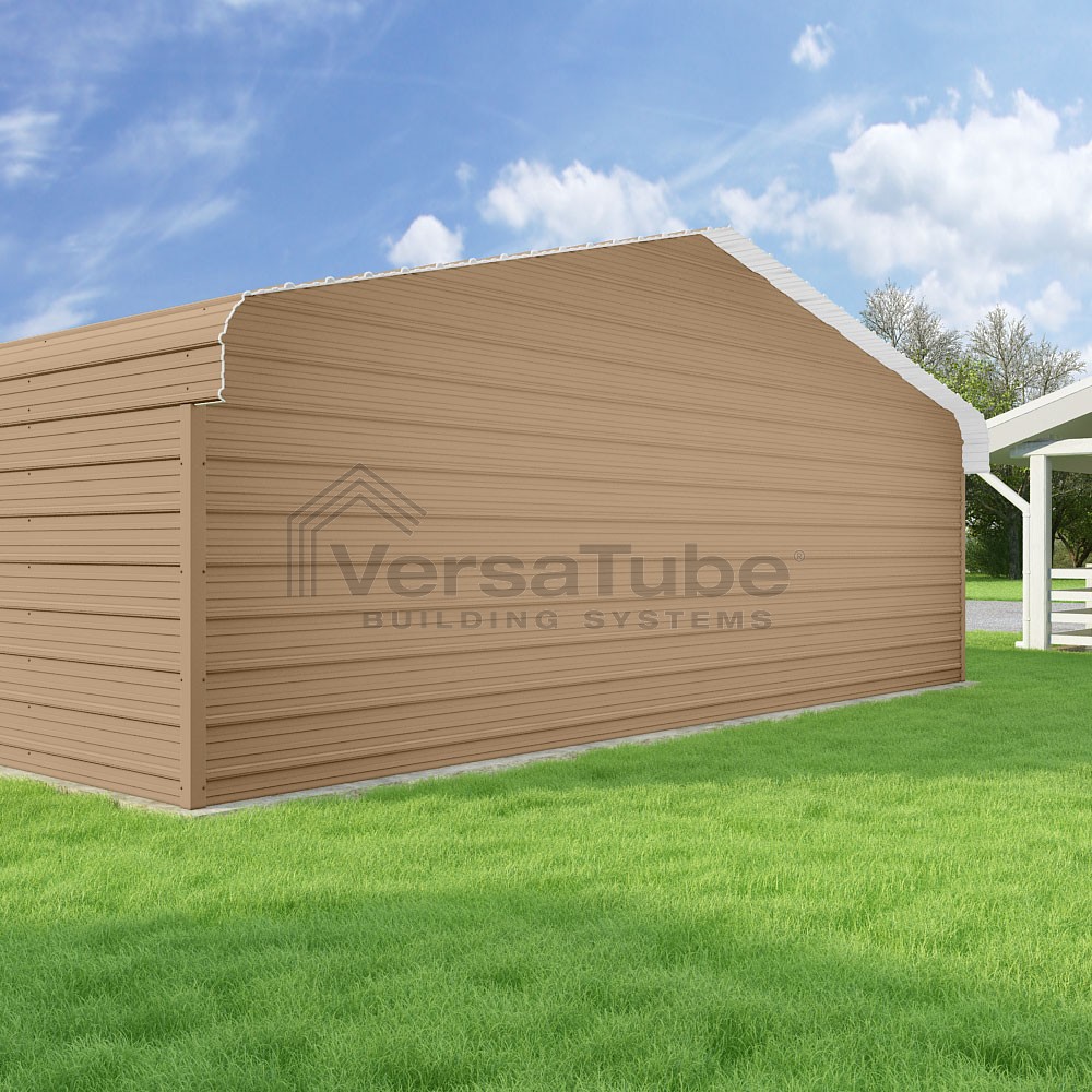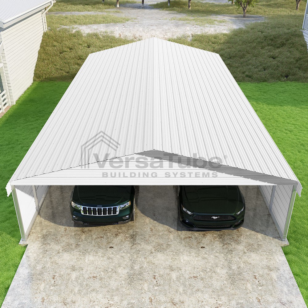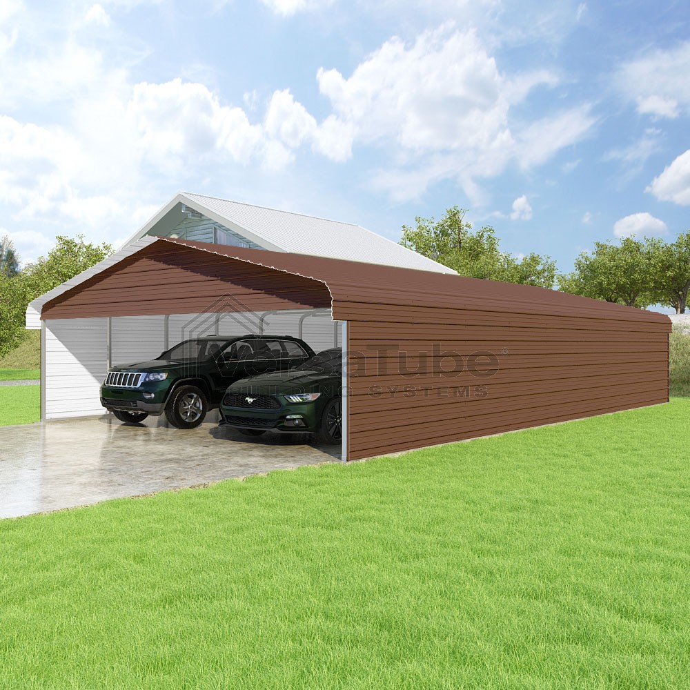 Classic Series DIY carport kit features horizontal application of sheet metal panels with the extra protection of rounded eaves.