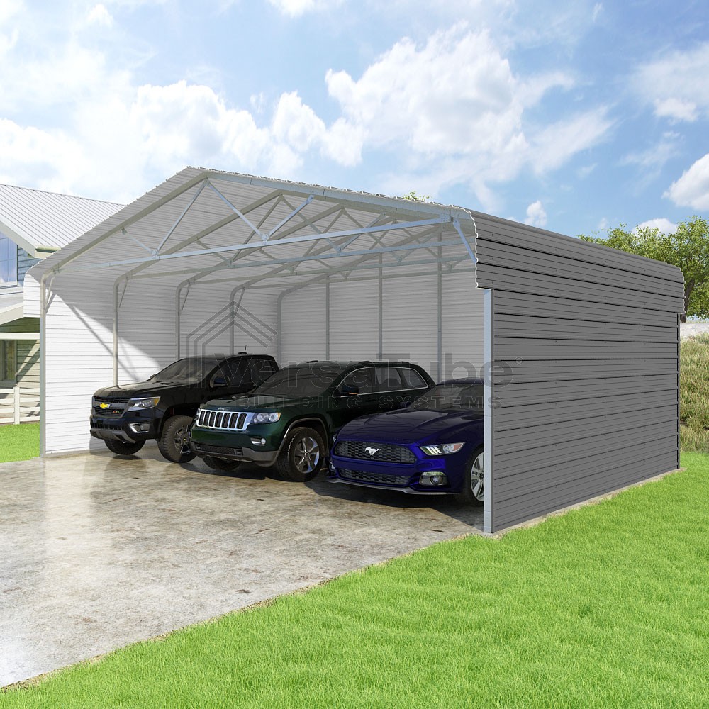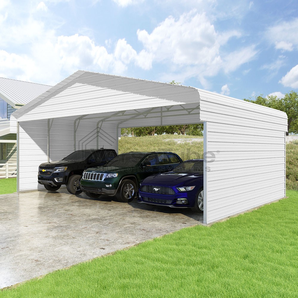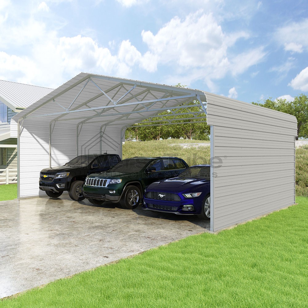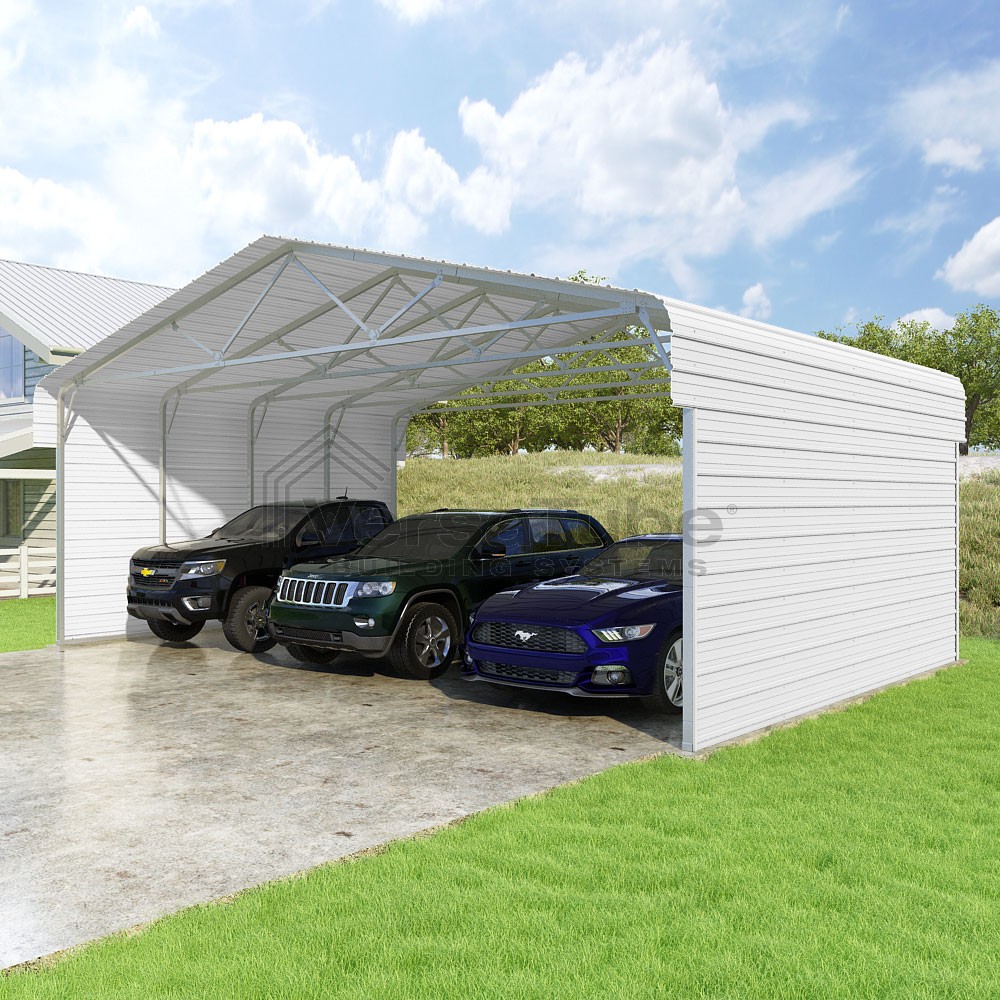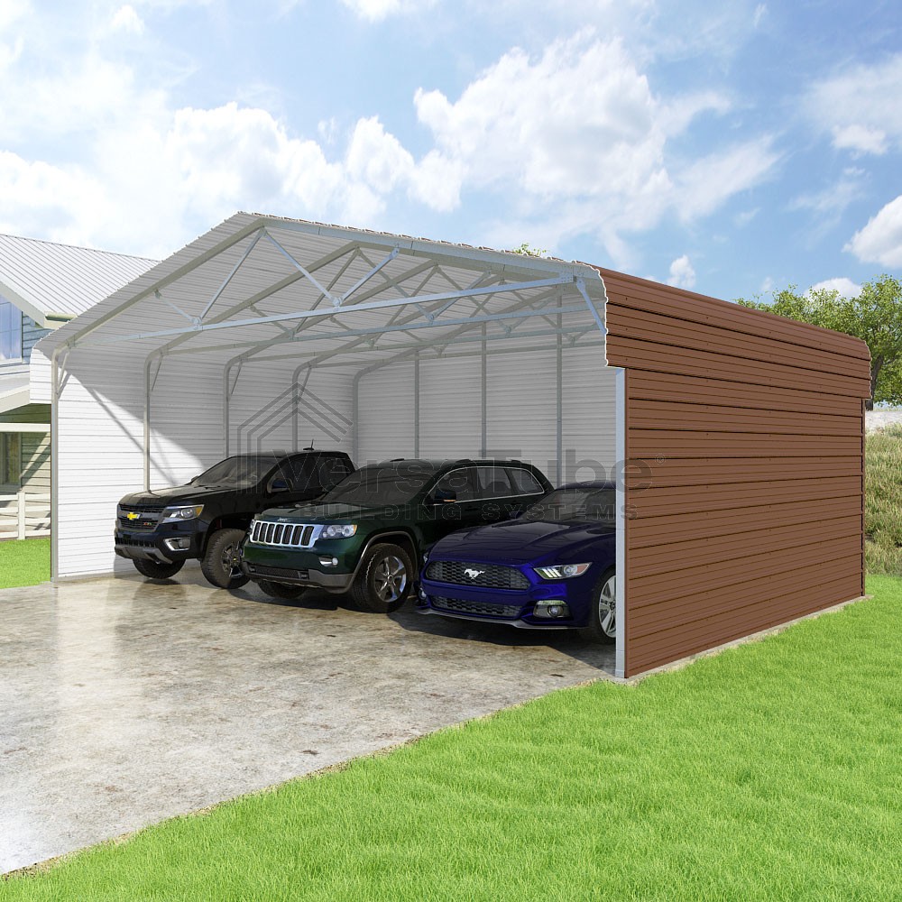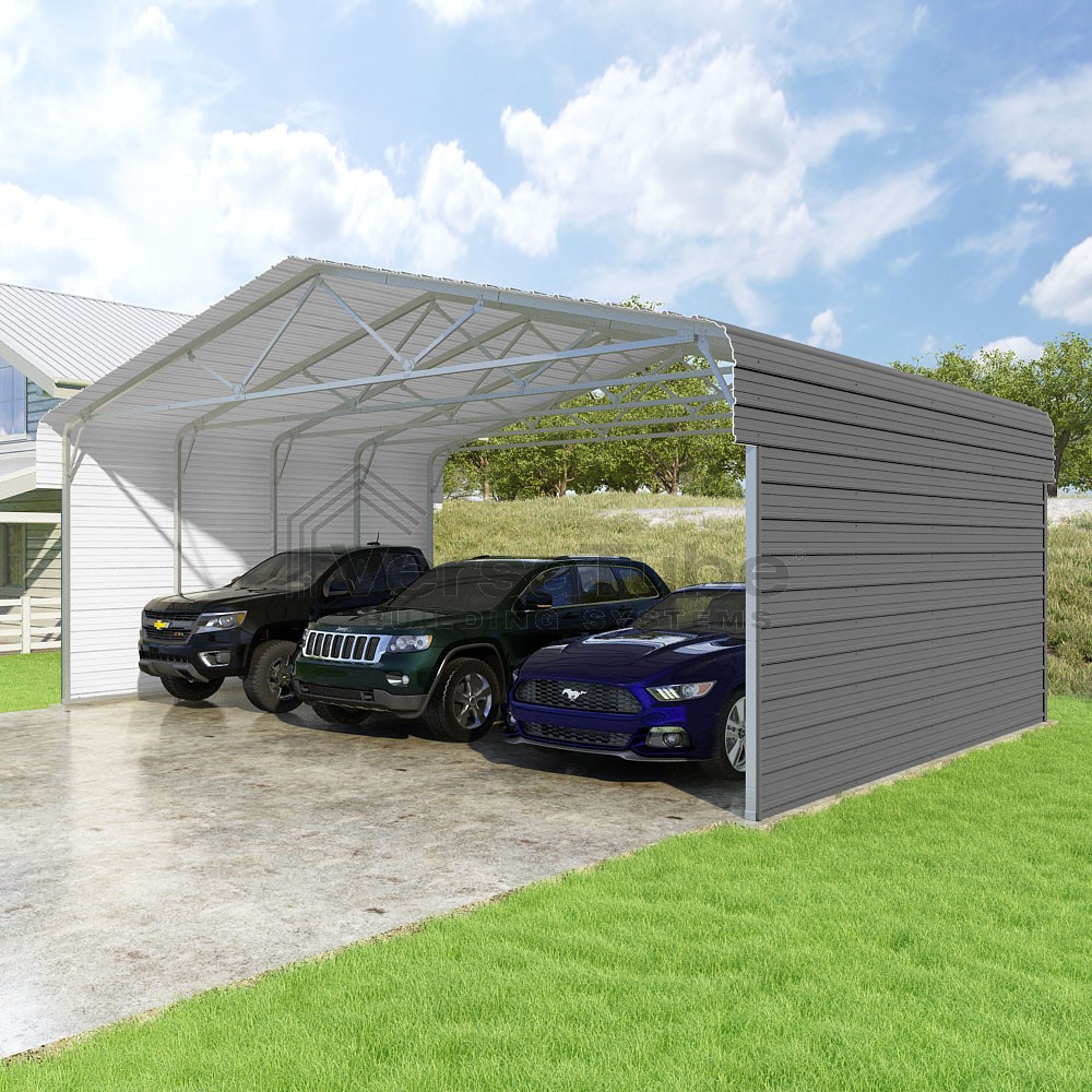 Classic Series DIY carport kit features horizontal application of sheet metal panels with the extra protection of rounded eaves.