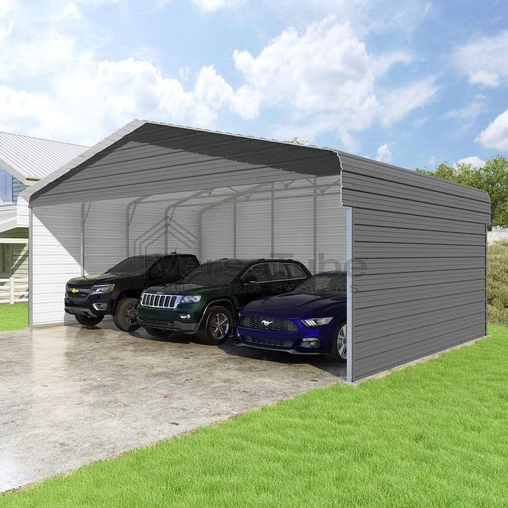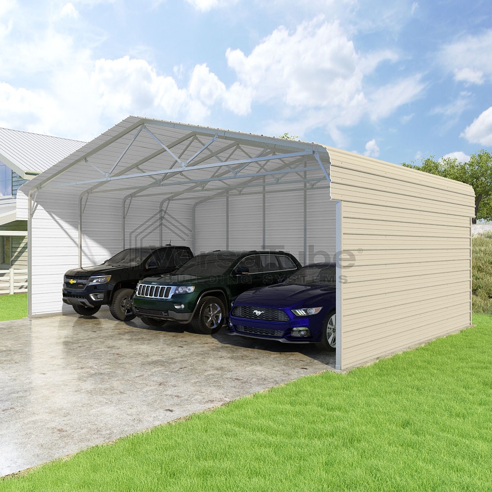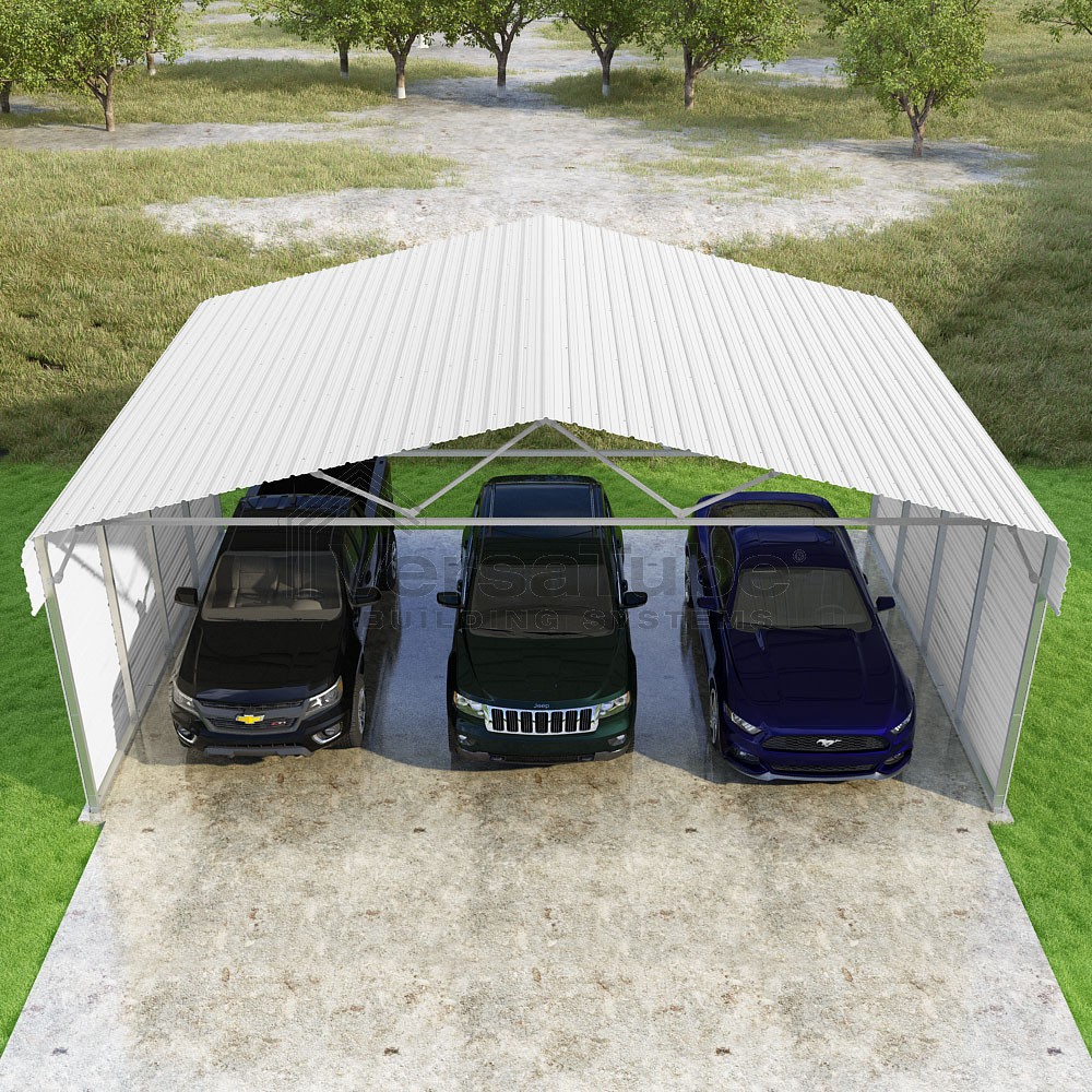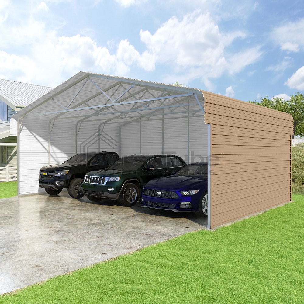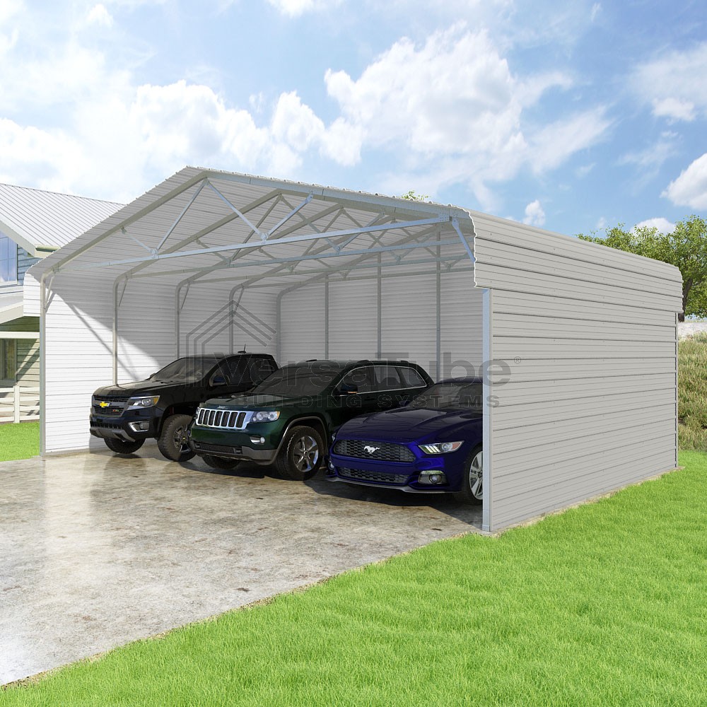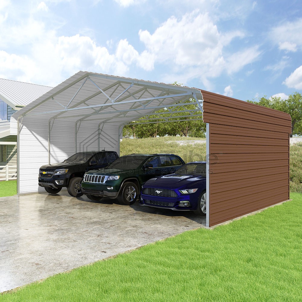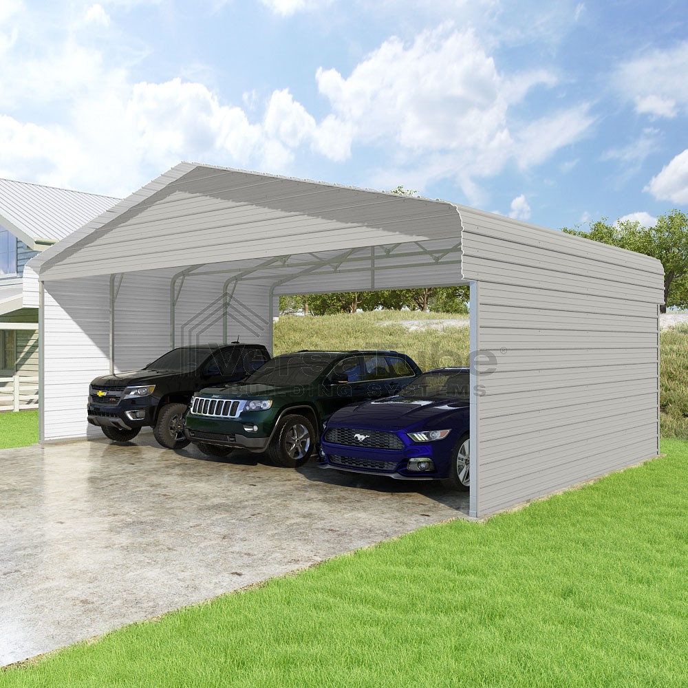 Classic Series DIY carport kit features horizontal application of sheet metal panels with the extra protection of rounded eaves.