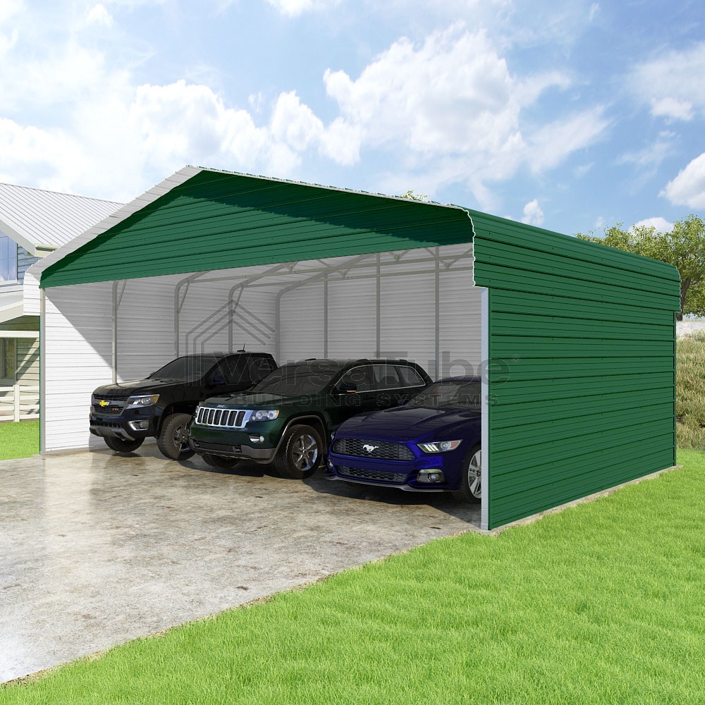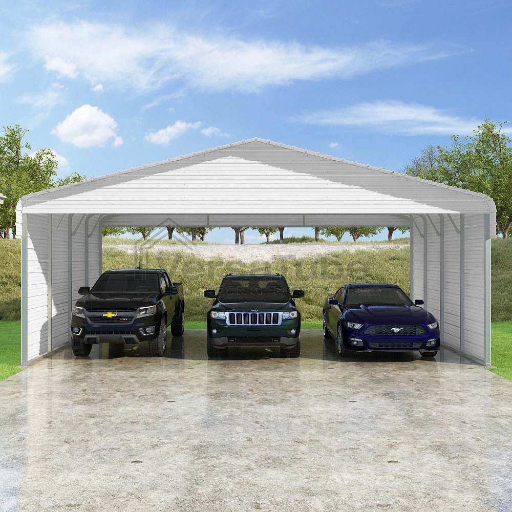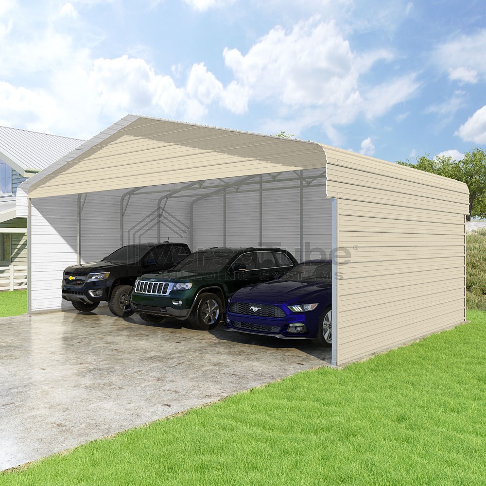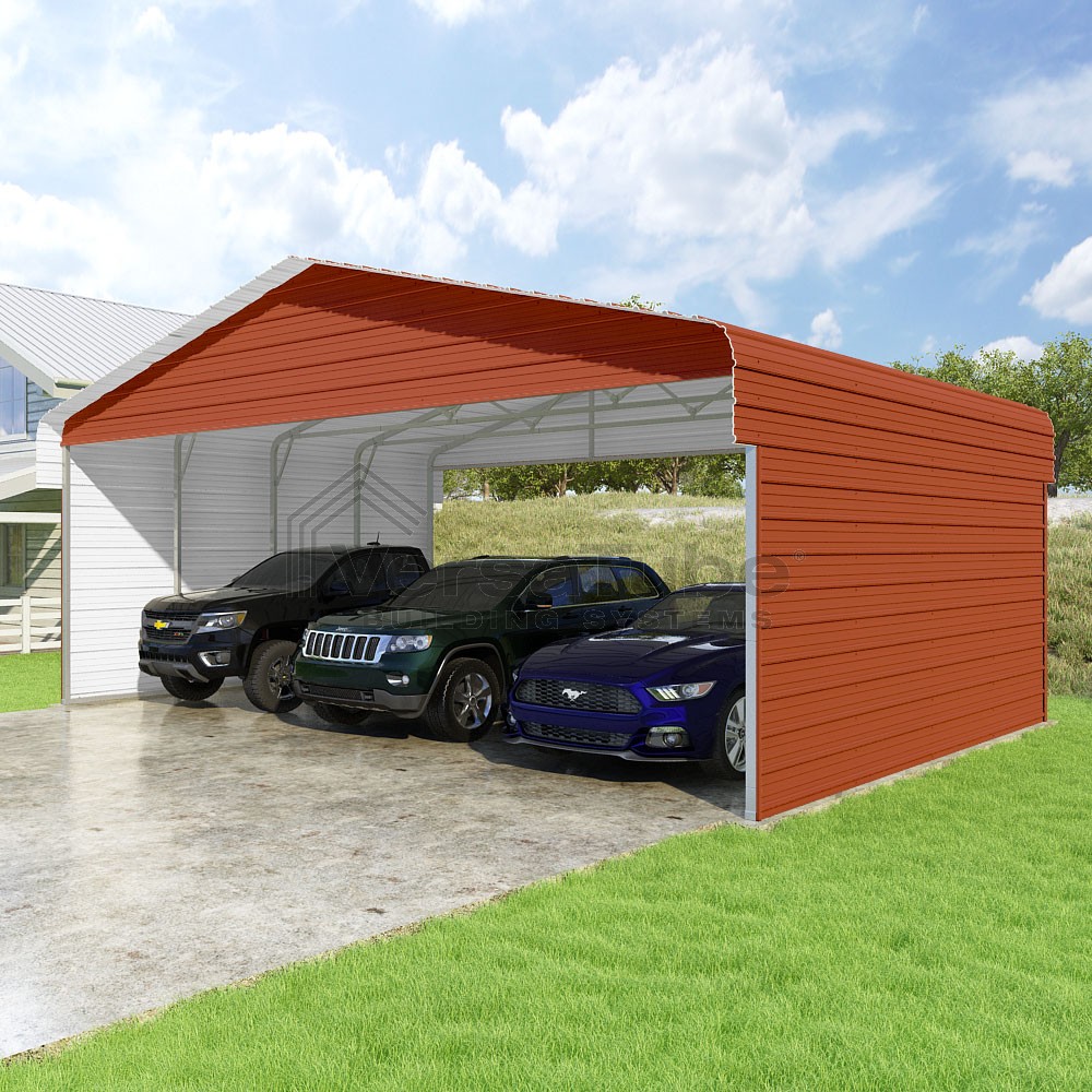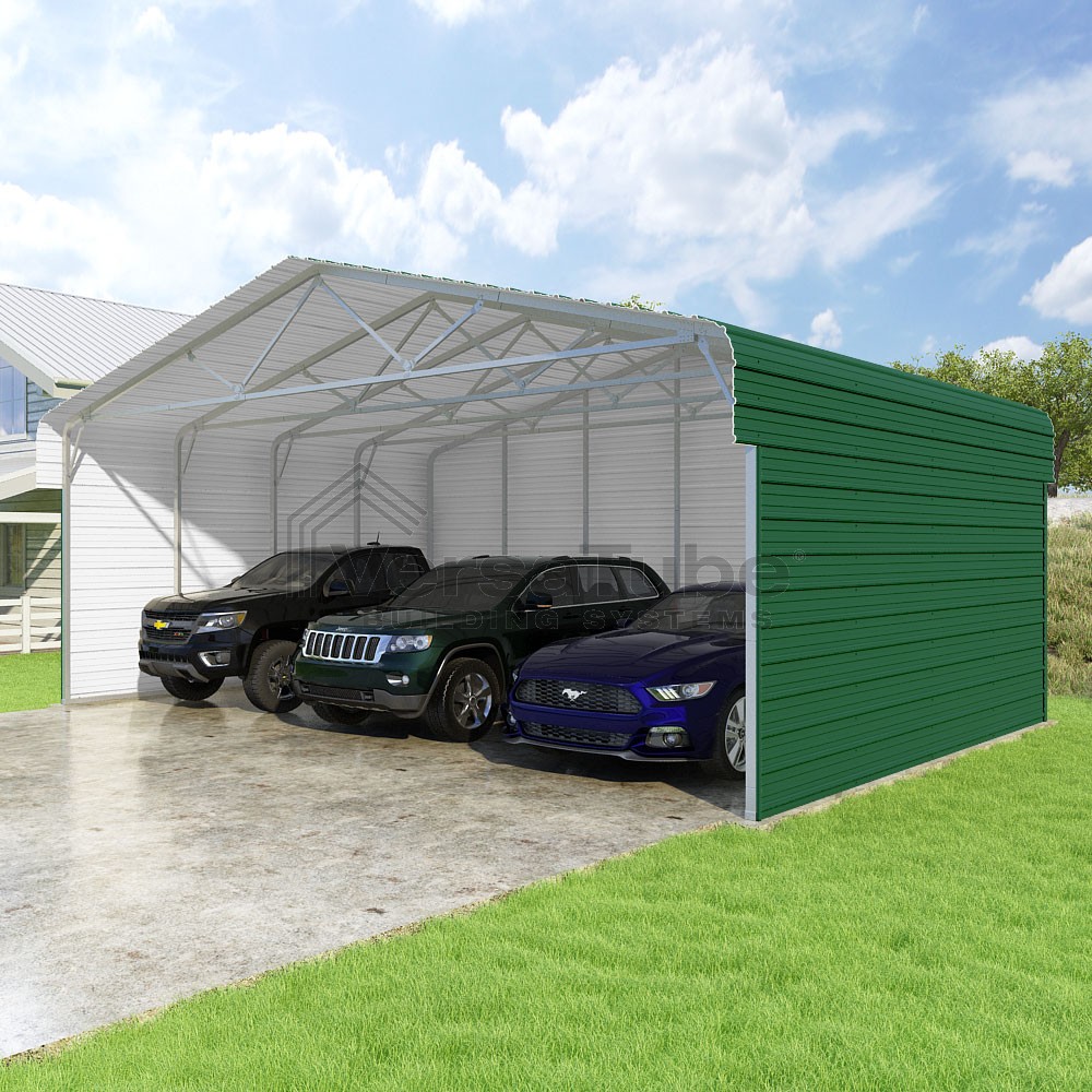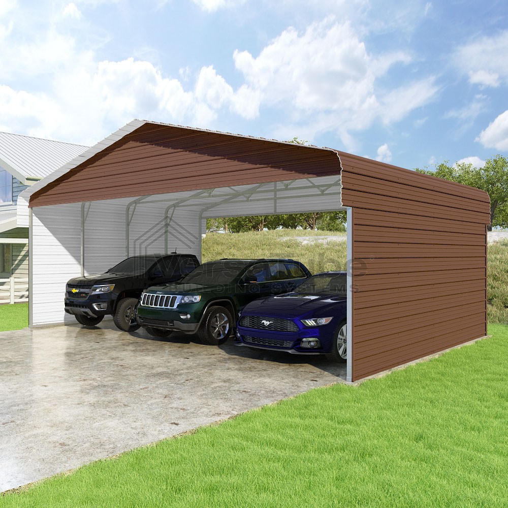 Classic Series DIY carport kit features horizontal application of sheet metal panels with the extra protection of rounded eaves.