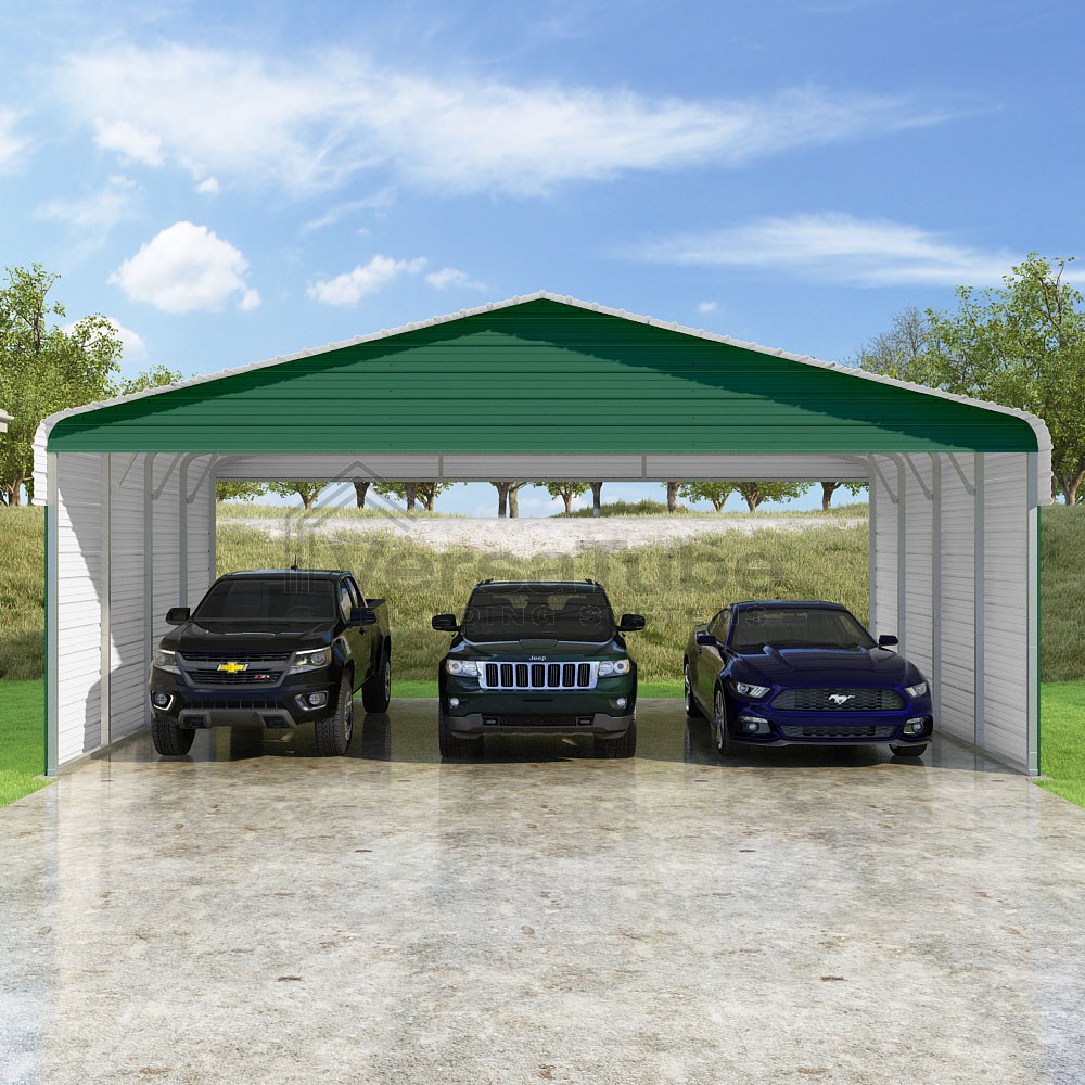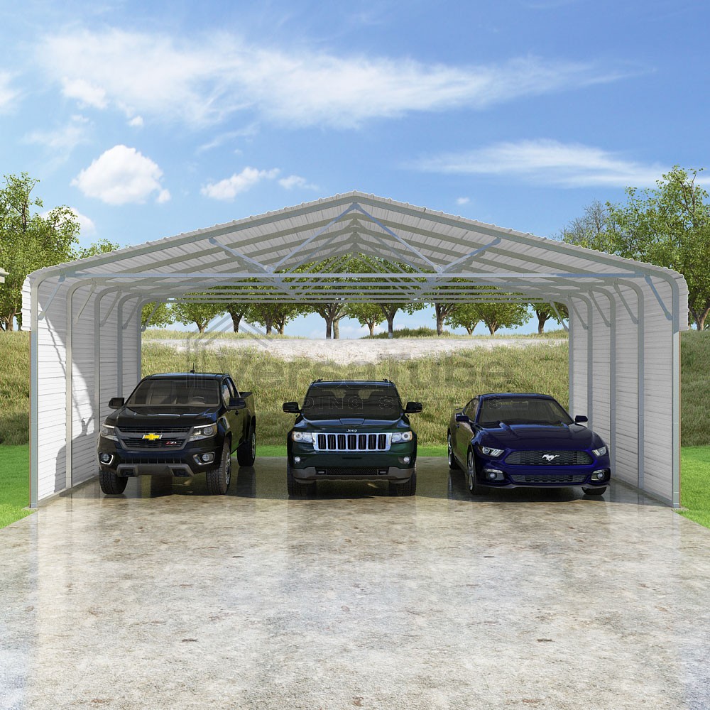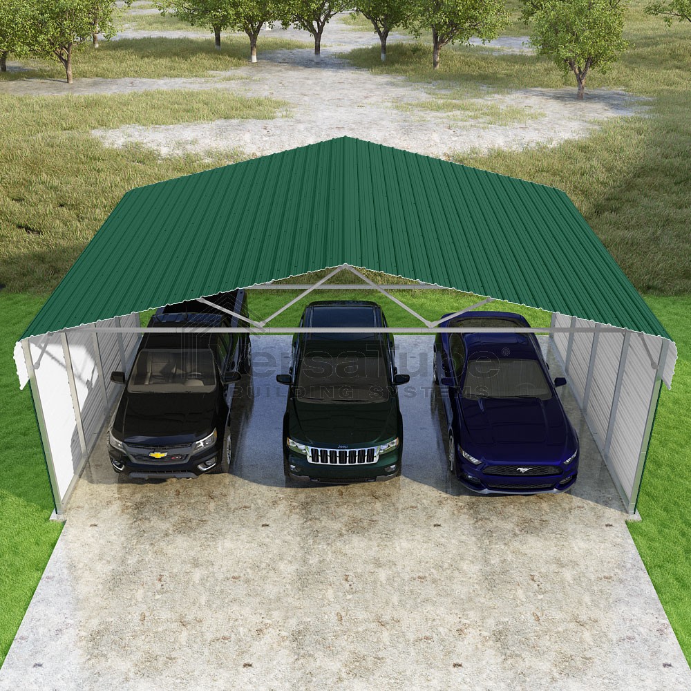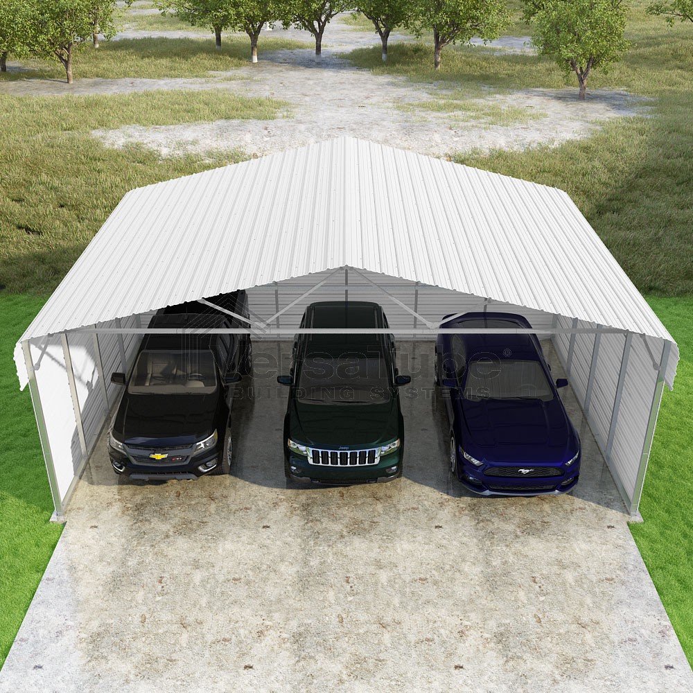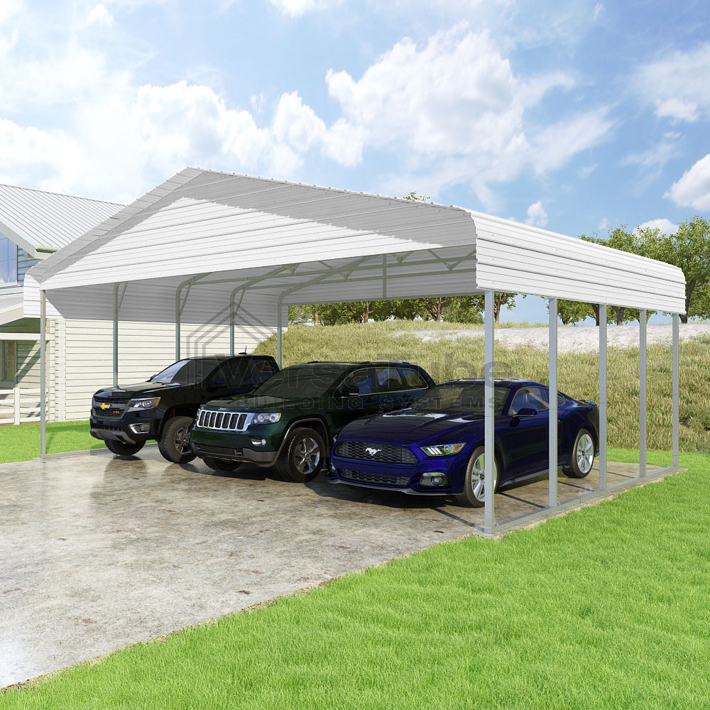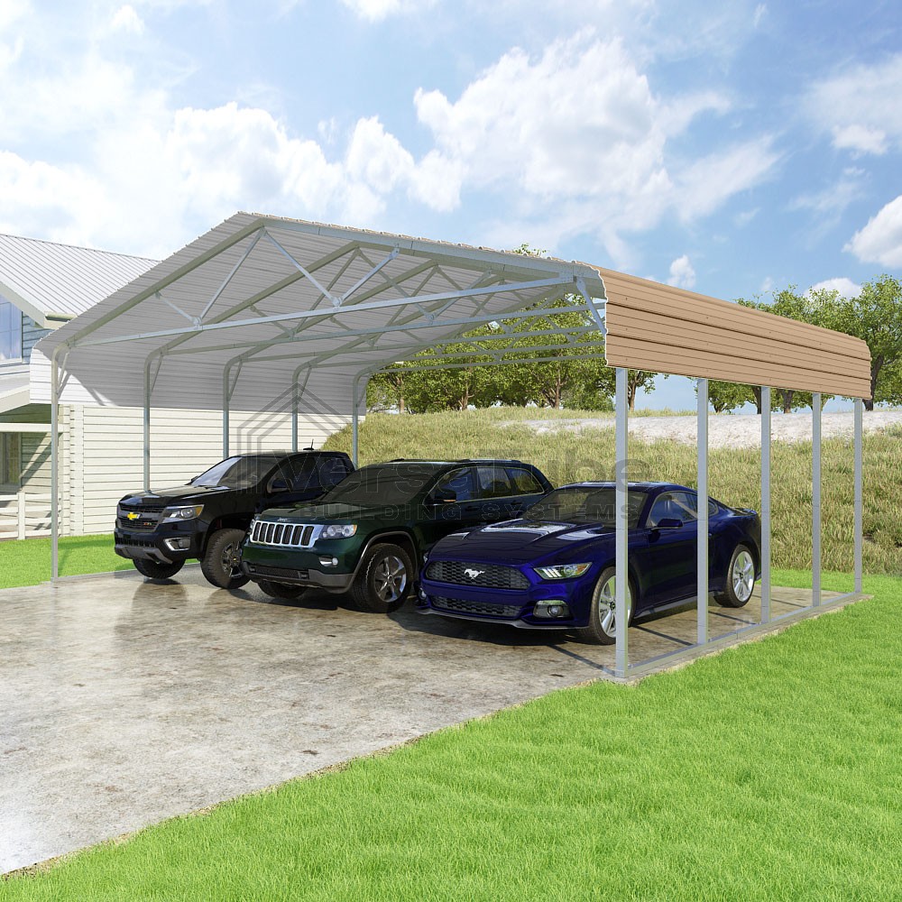 Classic Series DIY carport kit features horizontal application of sheet metal panels with the extra protection of rounded eaves.