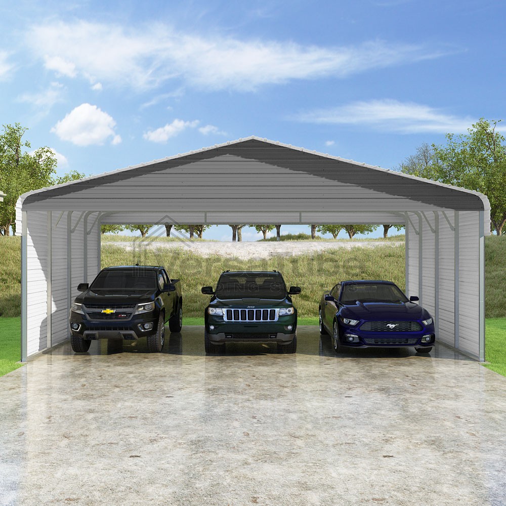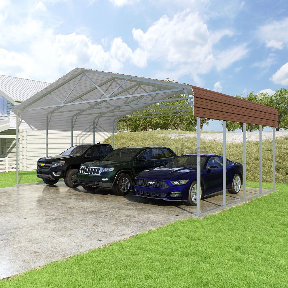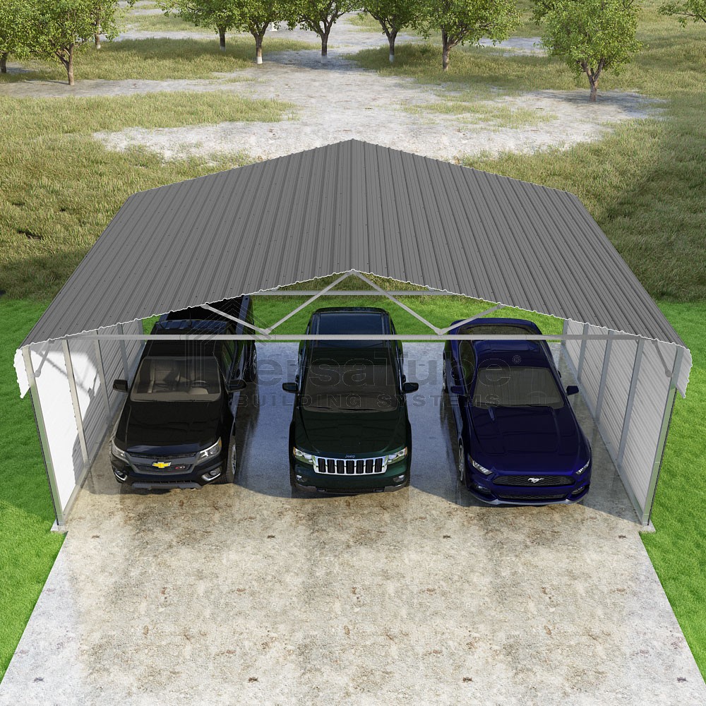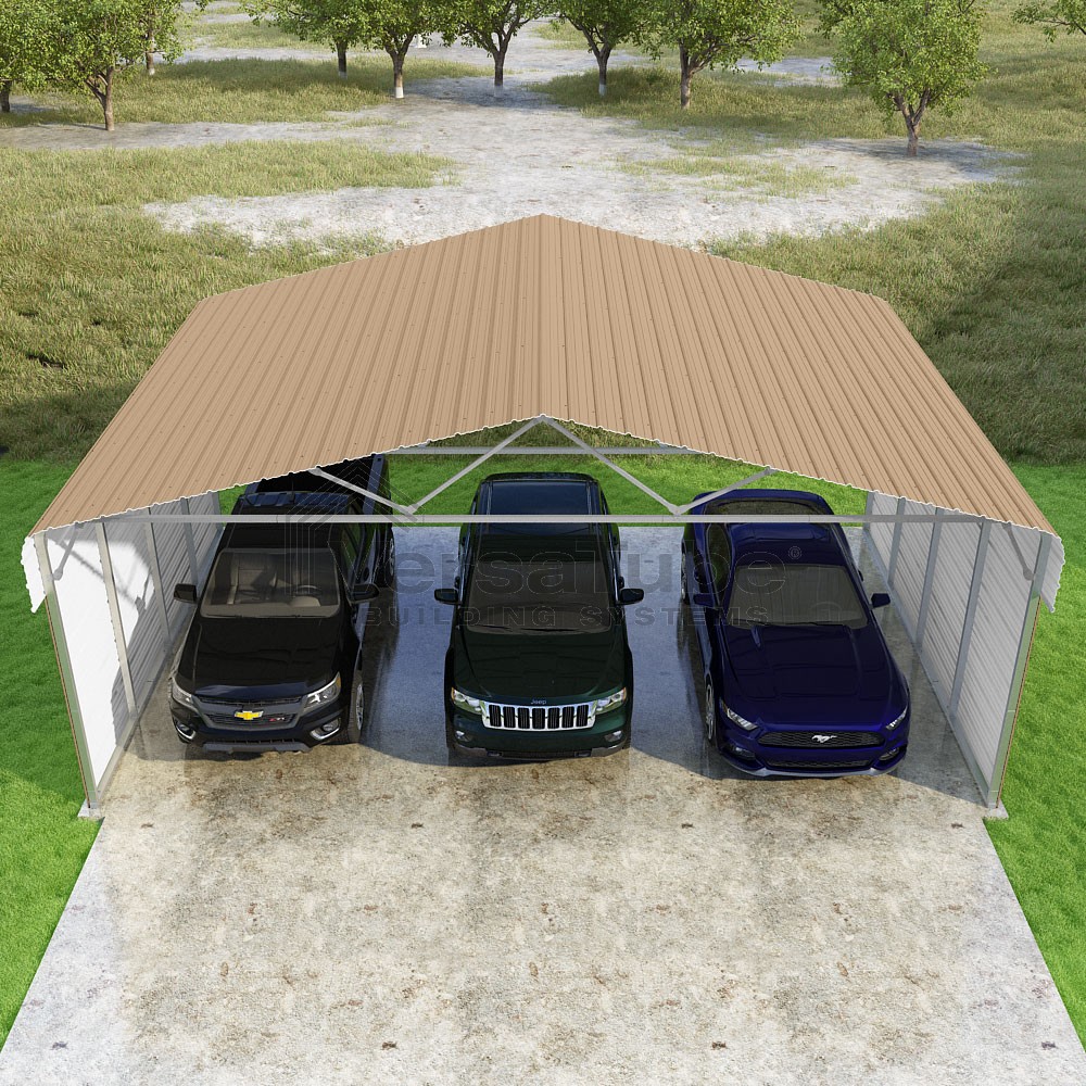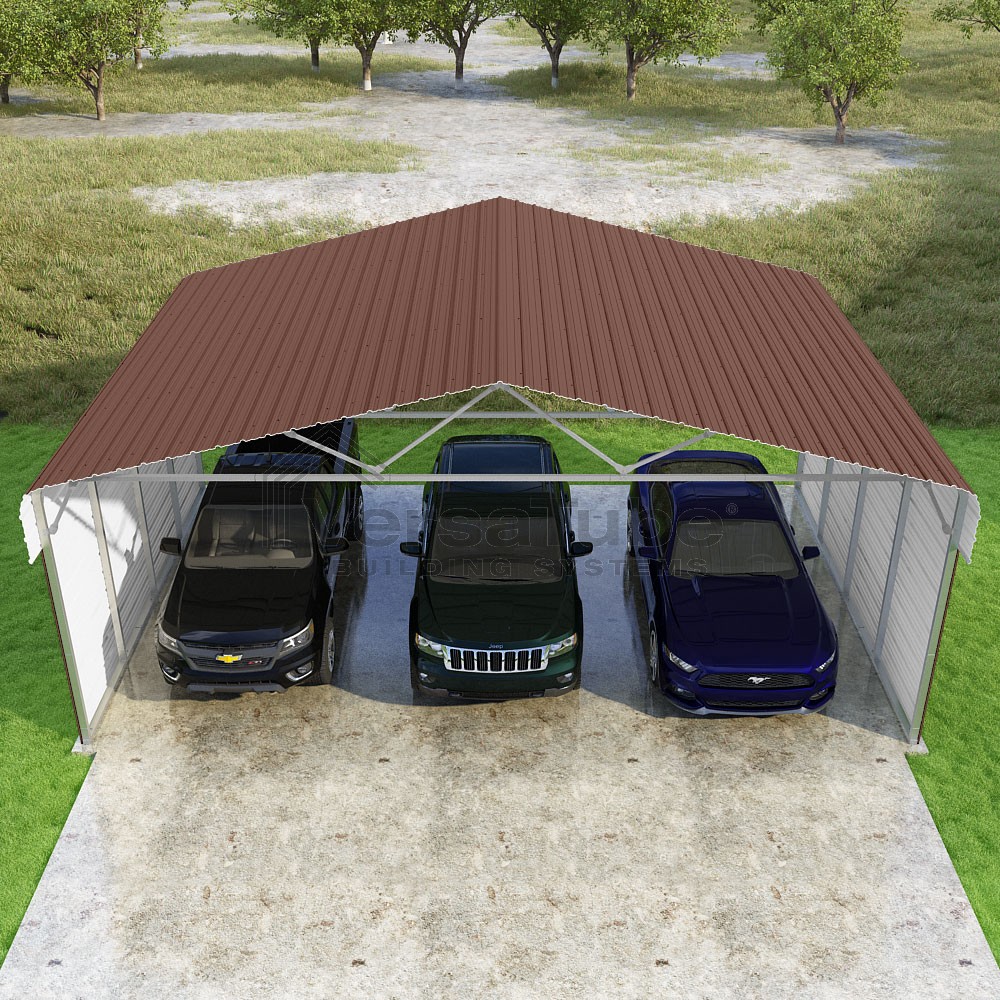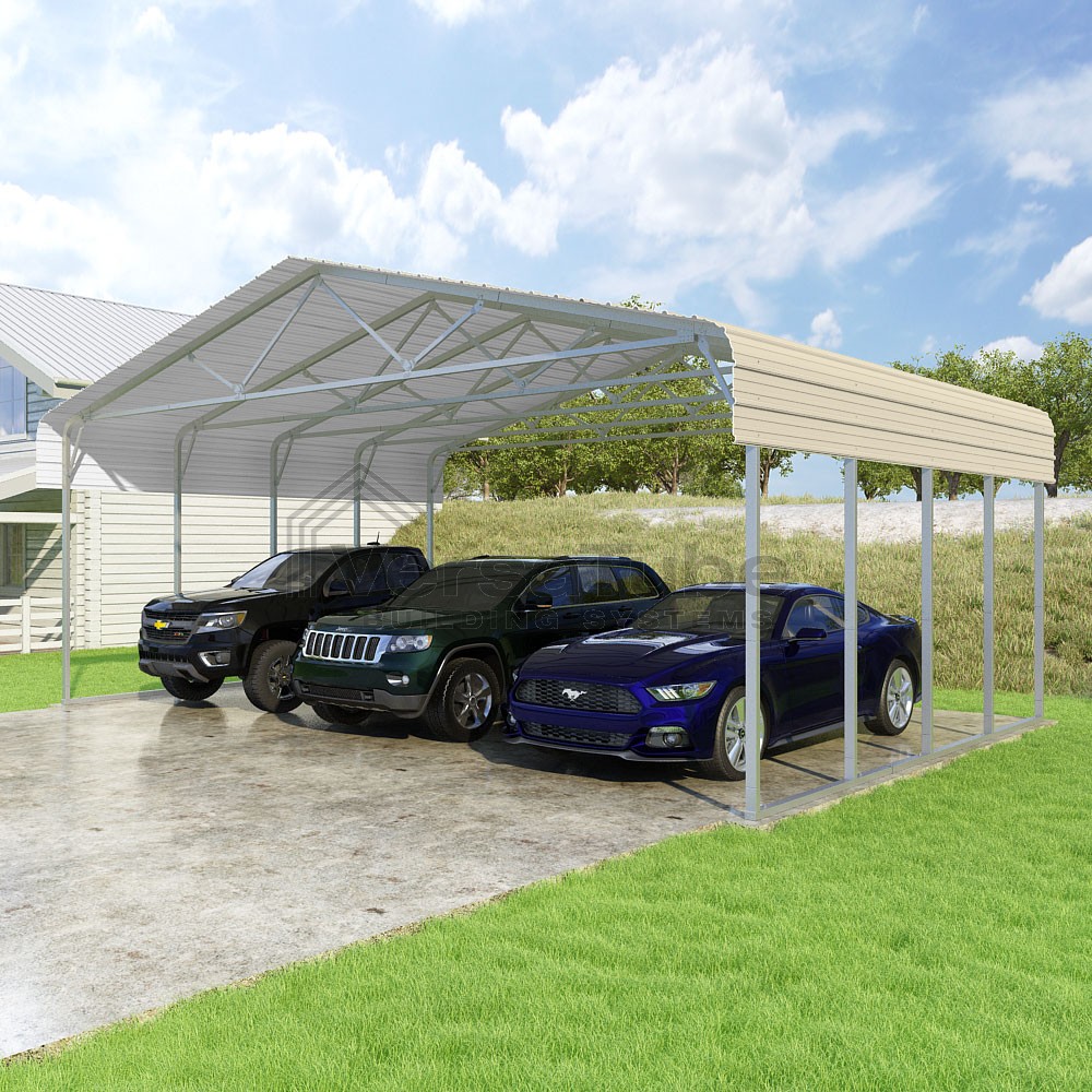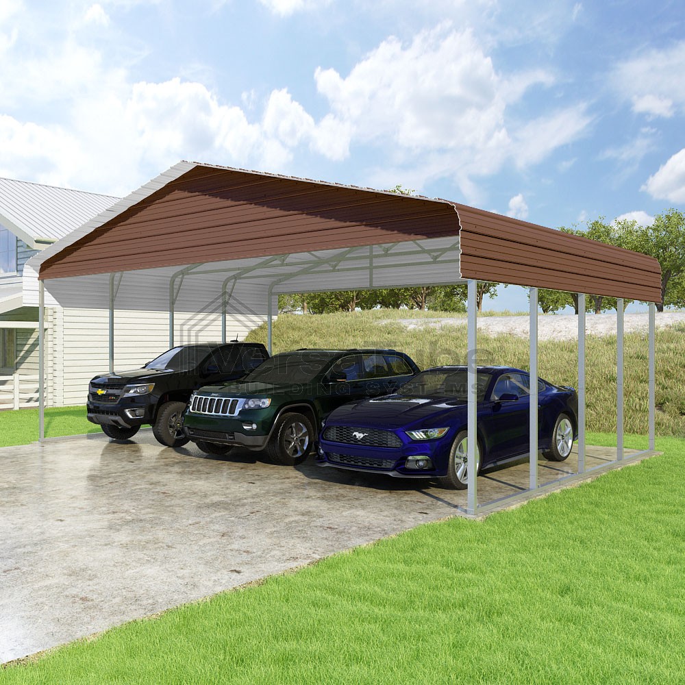 Classic Series DIY carport kit features horizontal application of sheet metal panels with the extra protection of rounded eaves.