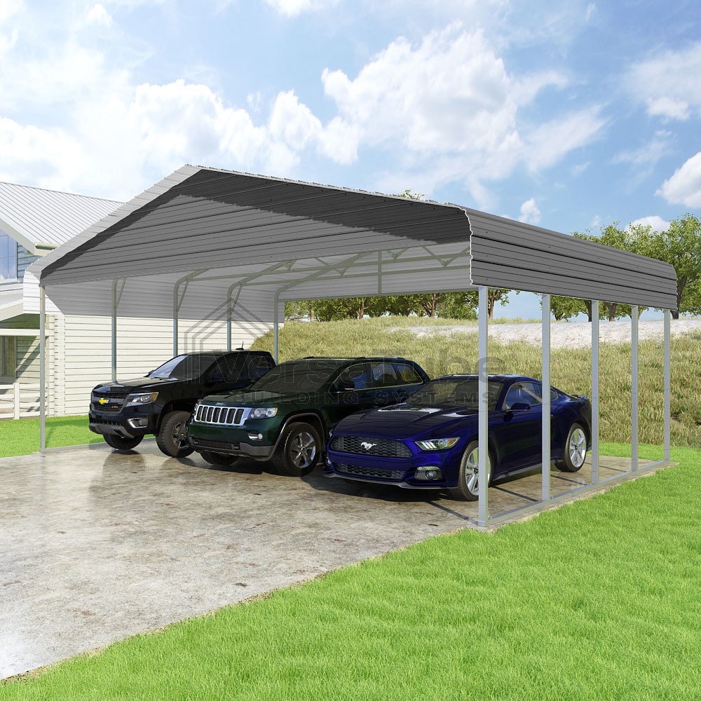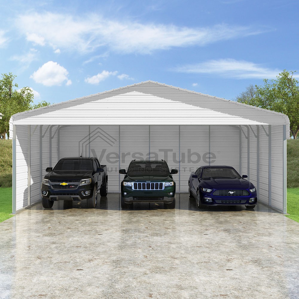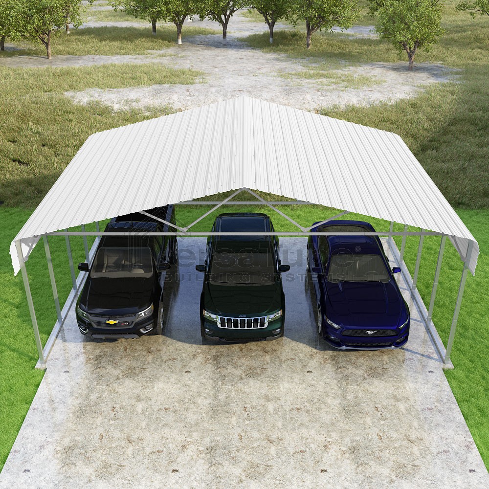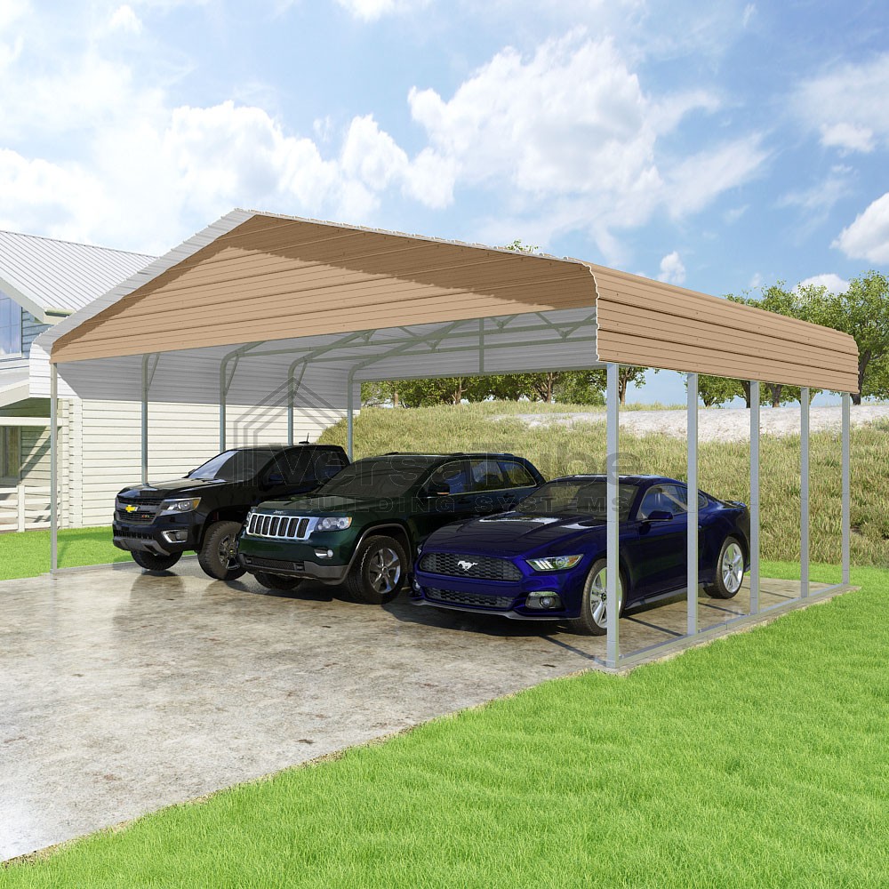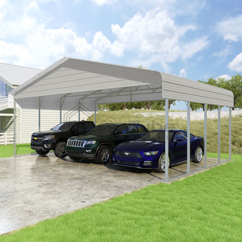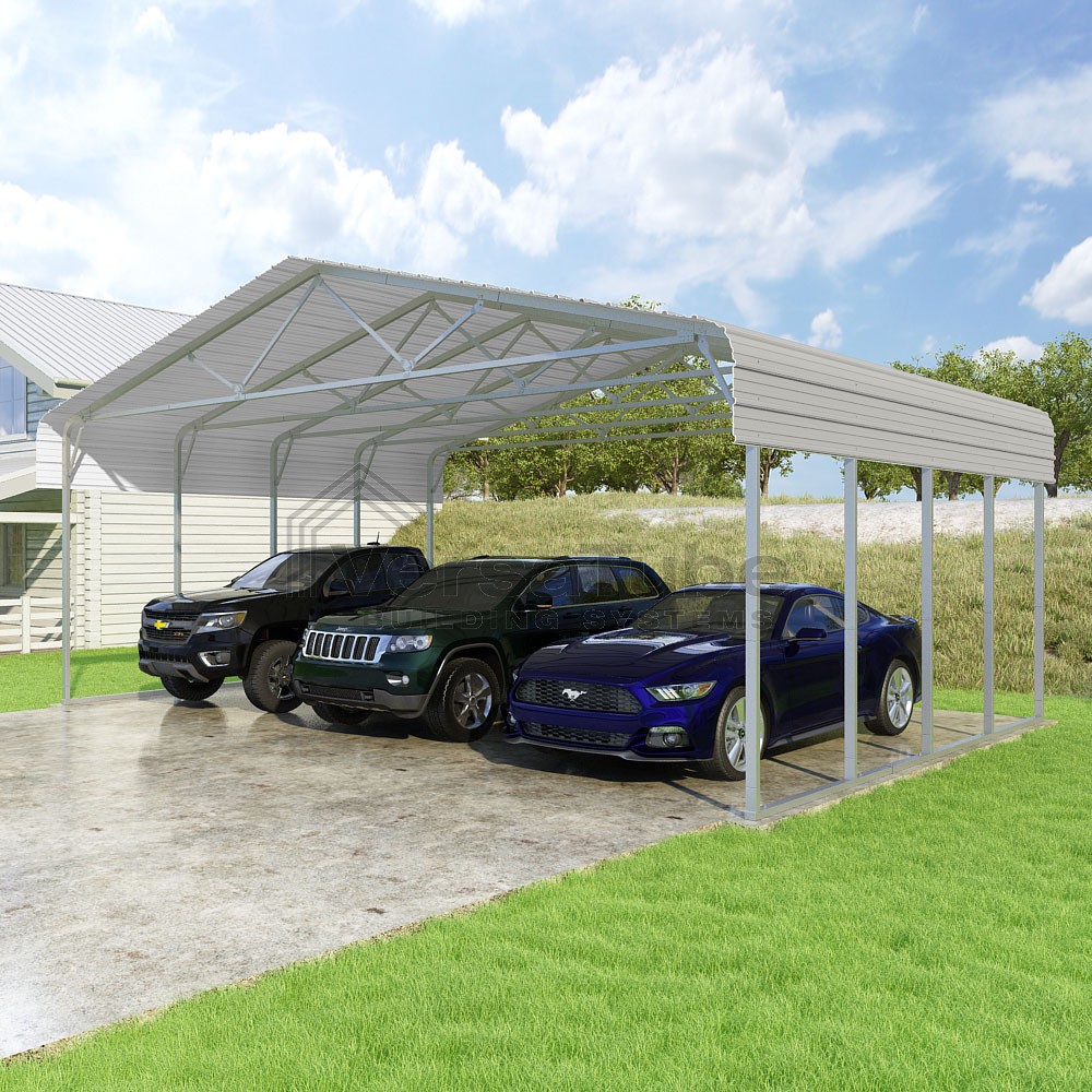 Classic Series DIY carport kit features horizontal application of sheet metal panels with the extra protection of rounded eaves.