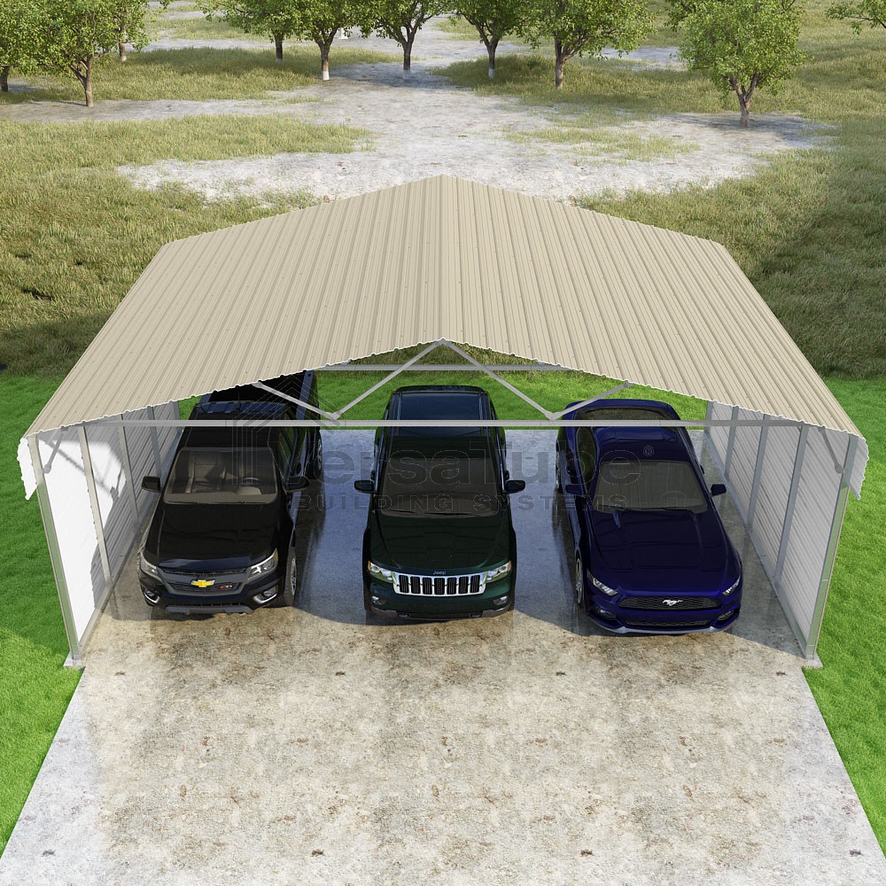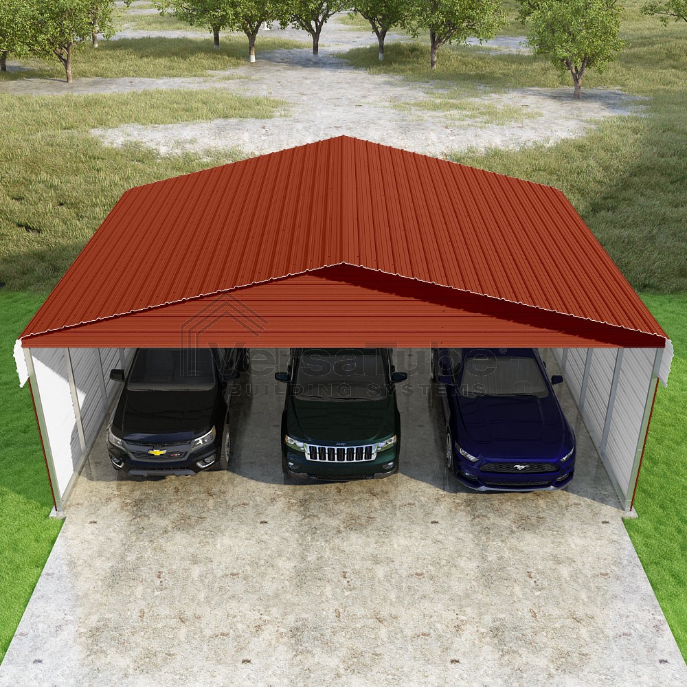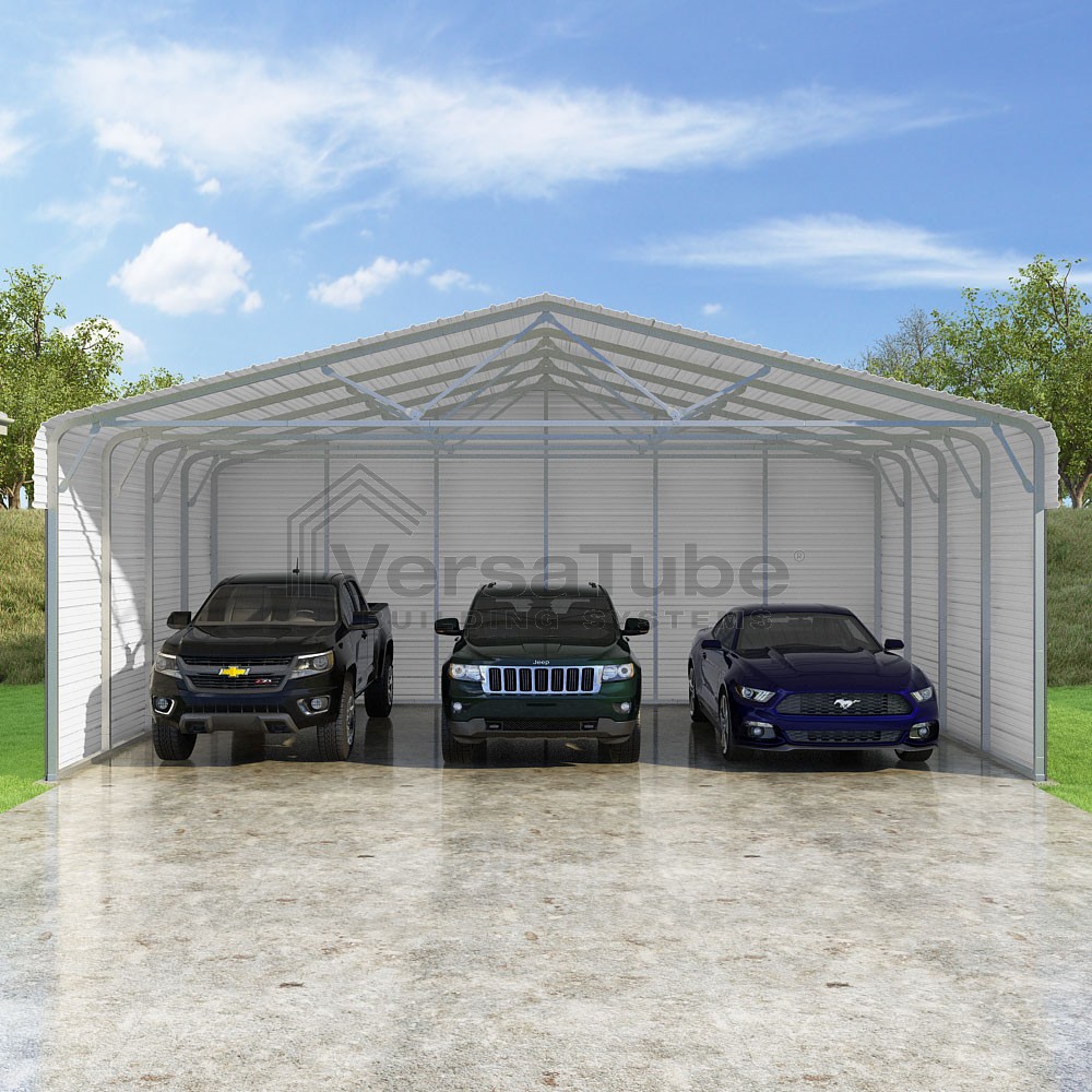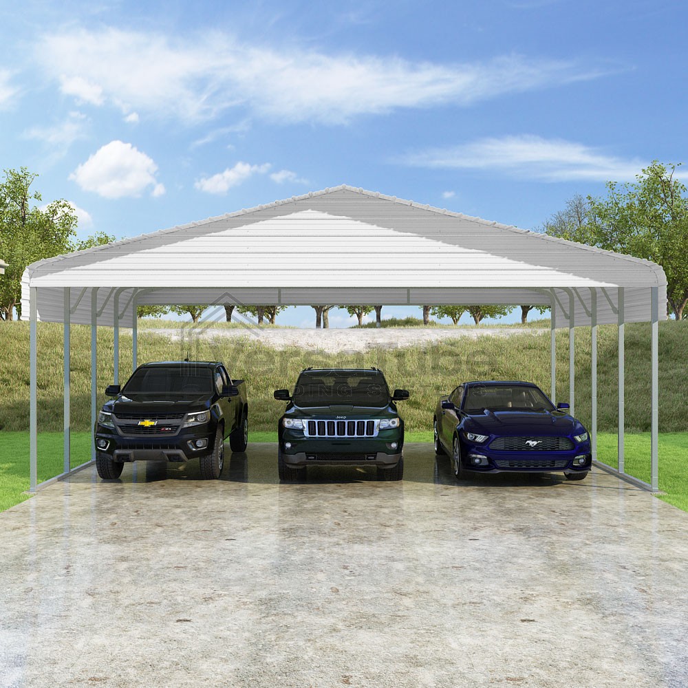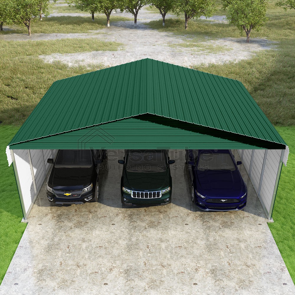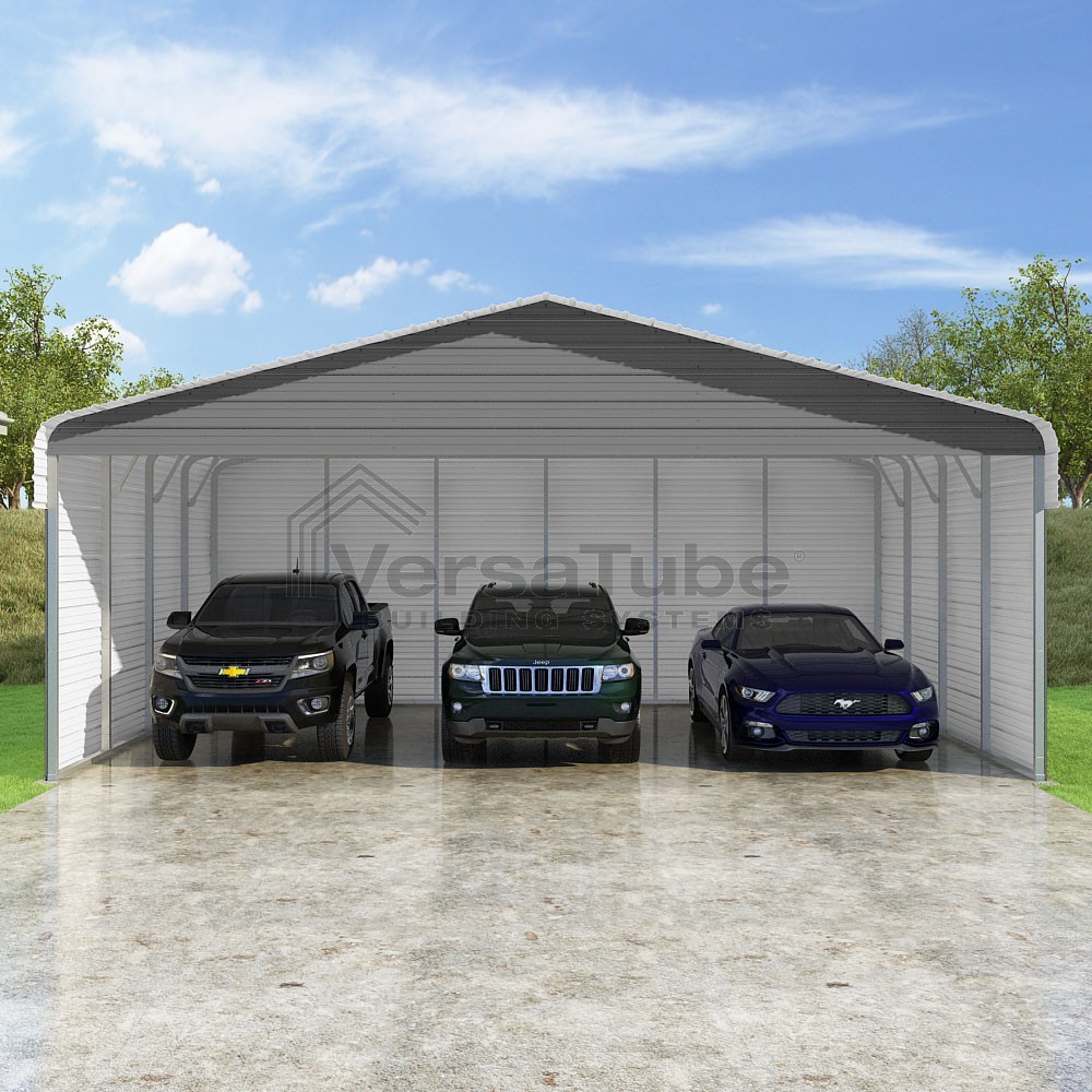 Classic Series DIY carport kit features horizontal application of sheet metal panels with the extra protection of rounded eaves.