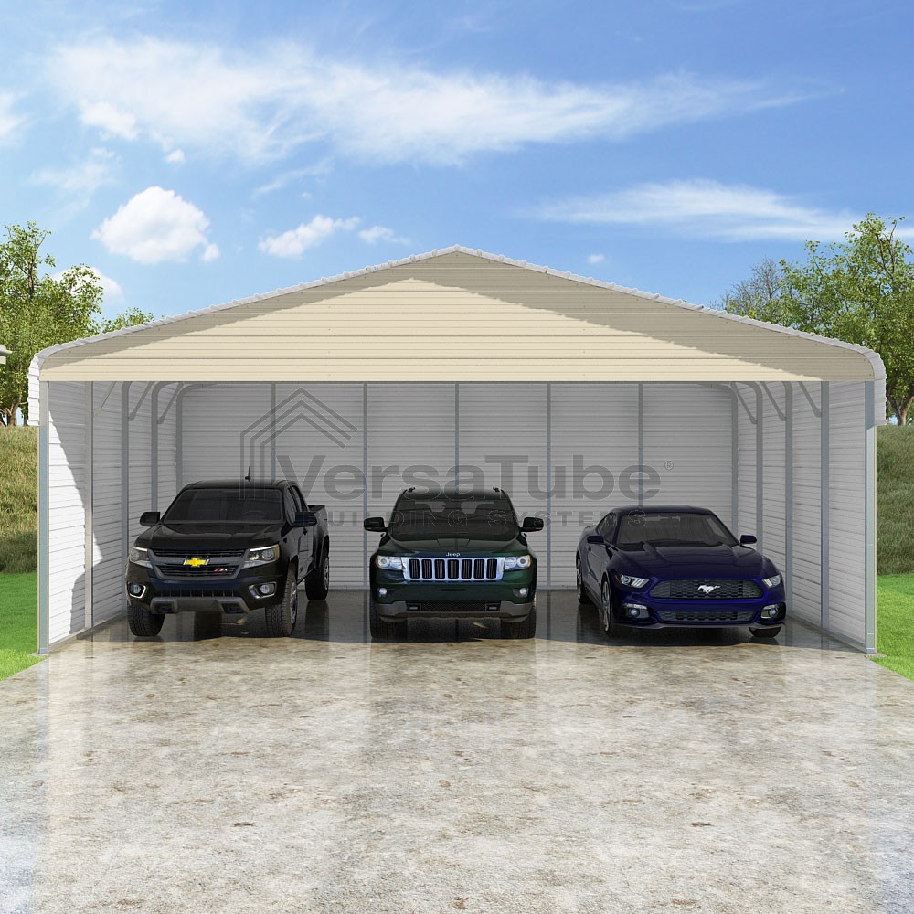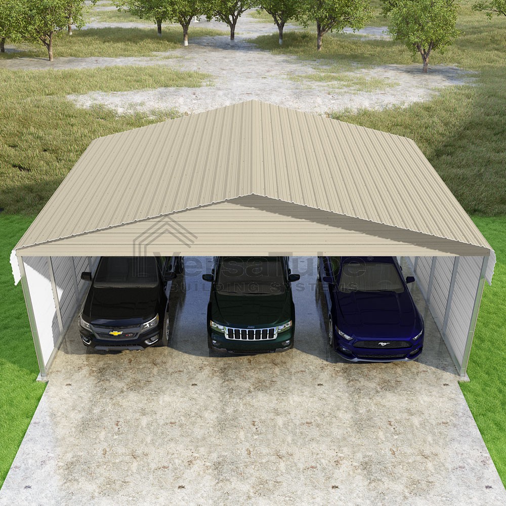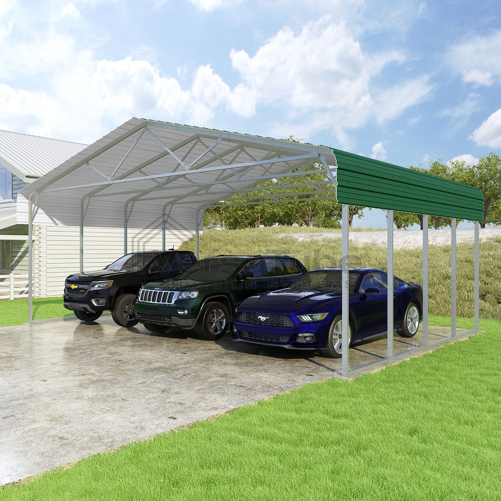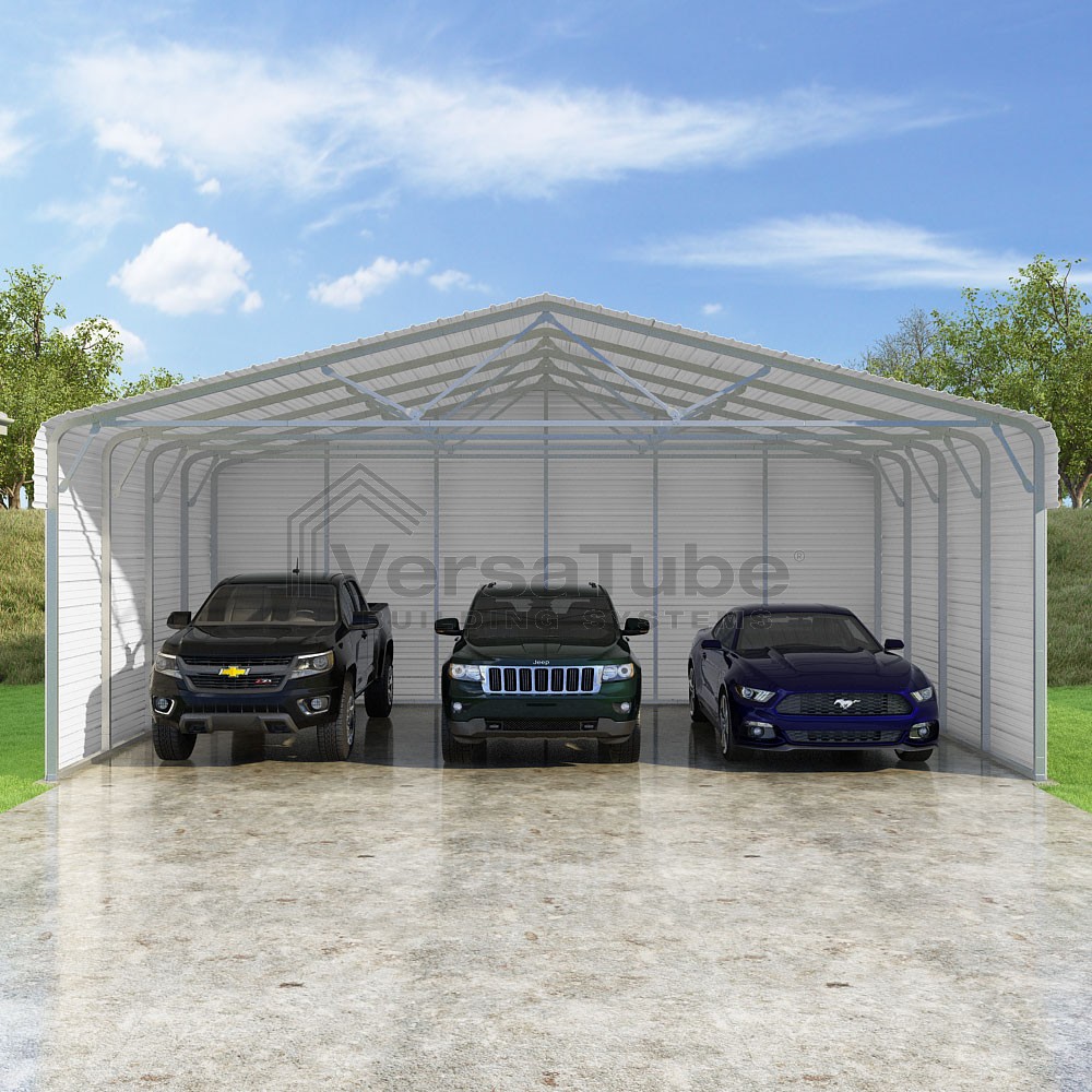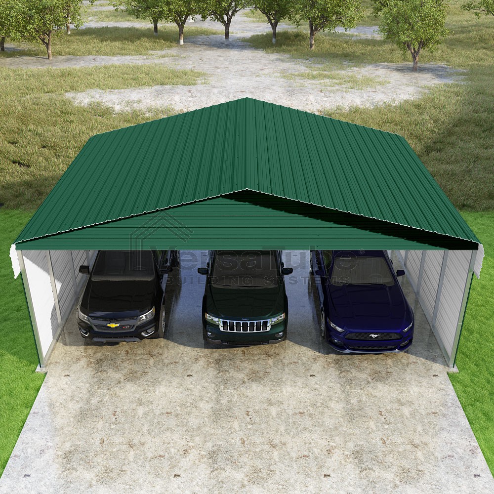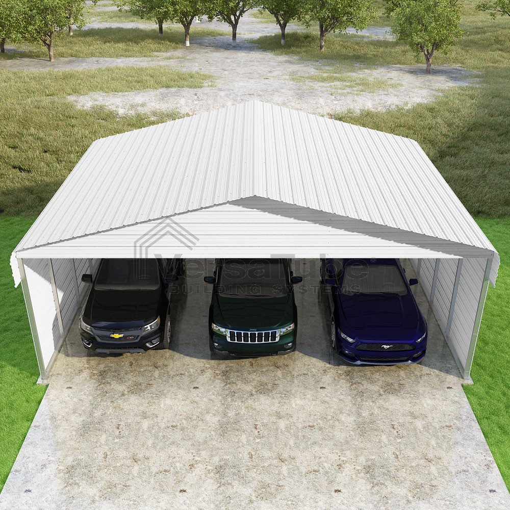 Classic Series DIY carport kit features horizontal application of sheet metal panels with the extra protection of rounded eaves.