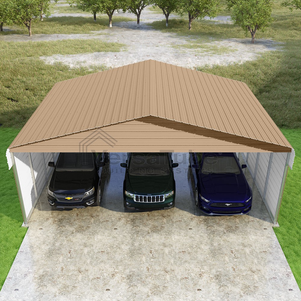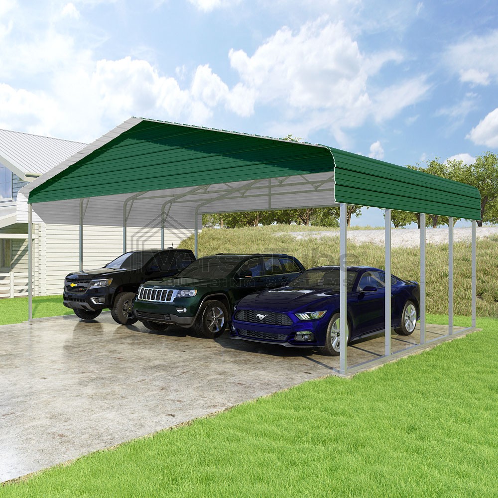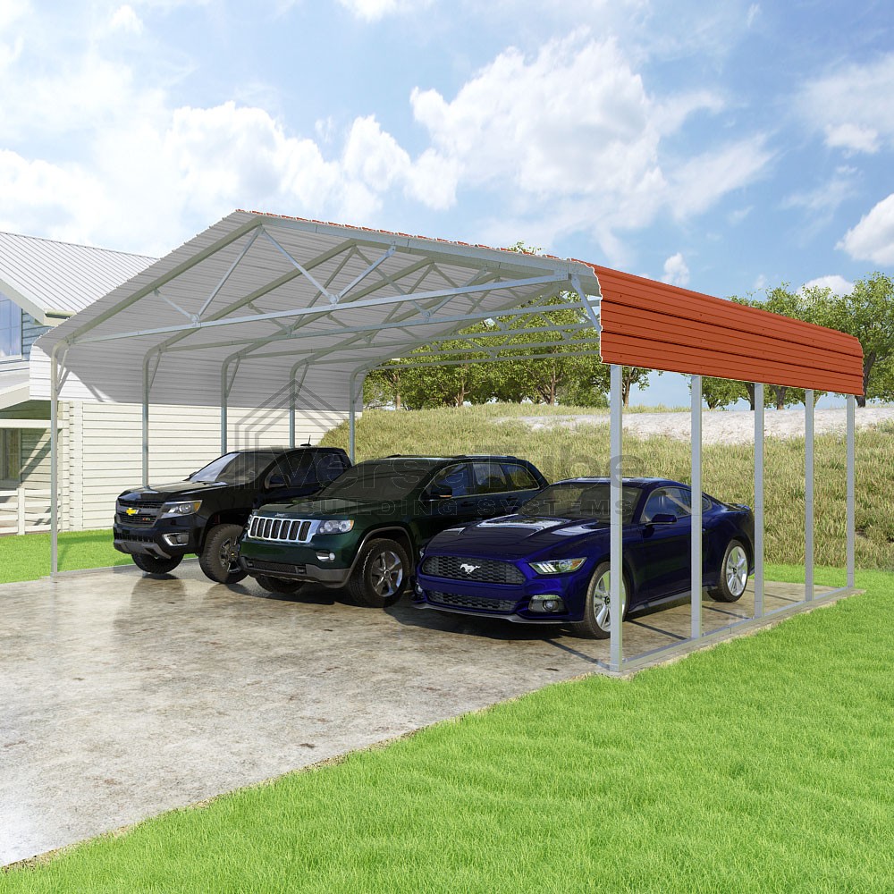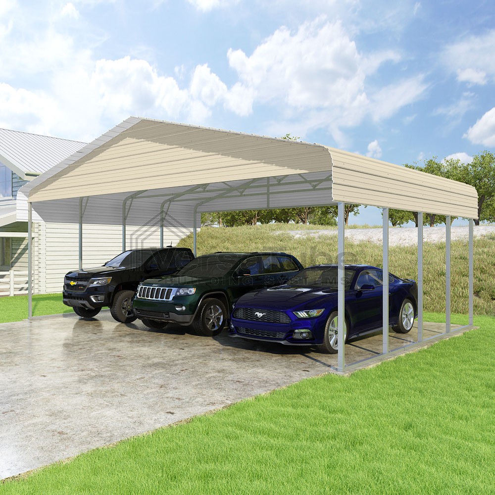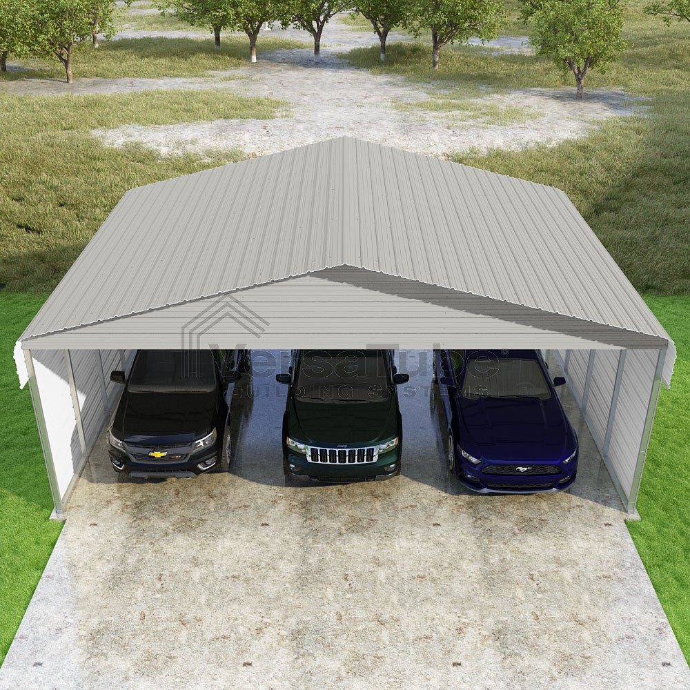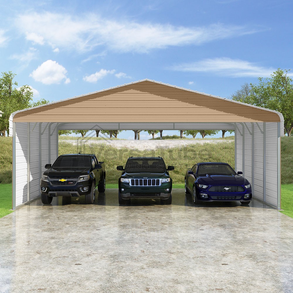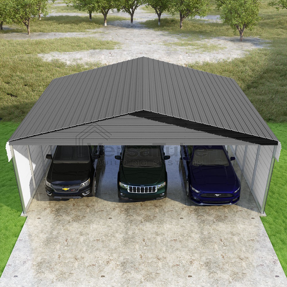Classic Series DIY carport kit features horizontal application of sheet metal panels with the extra protection of rounded eaves.