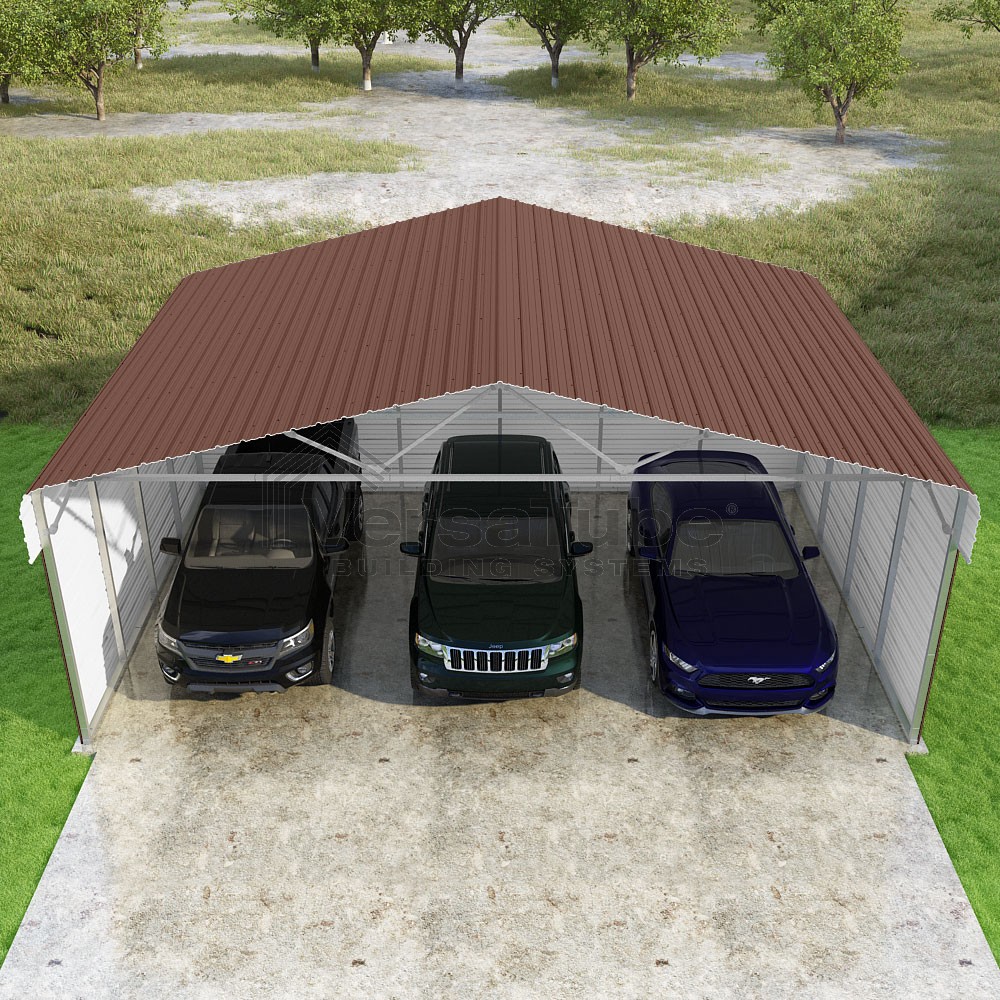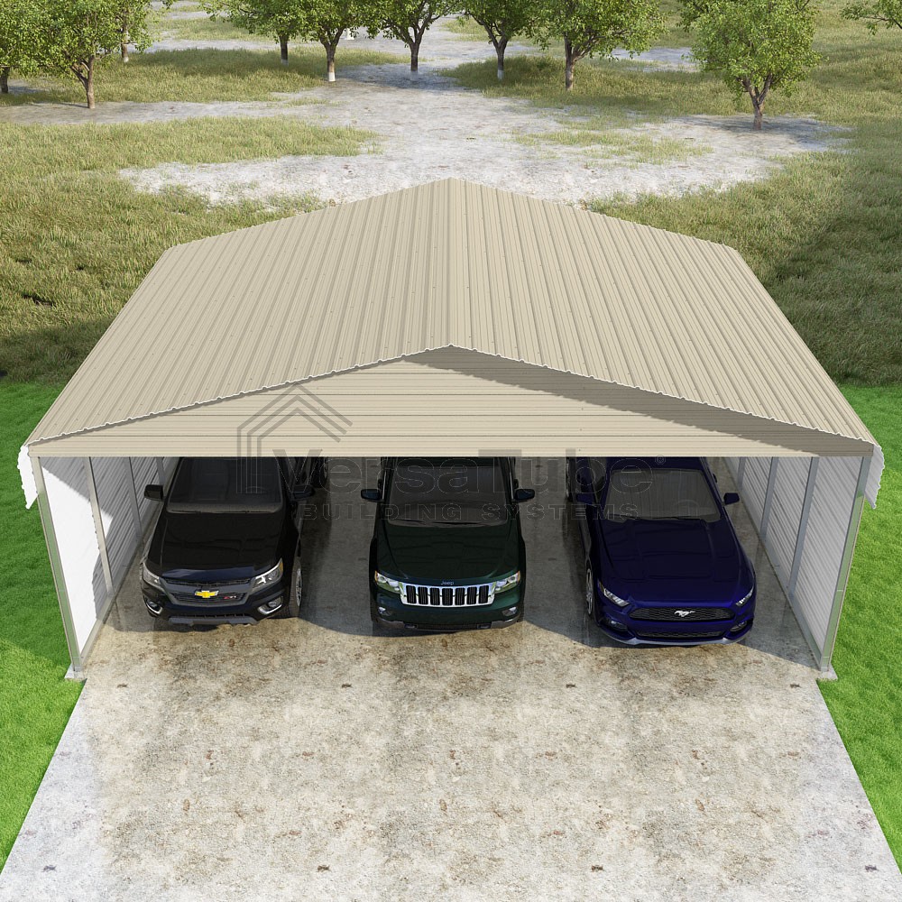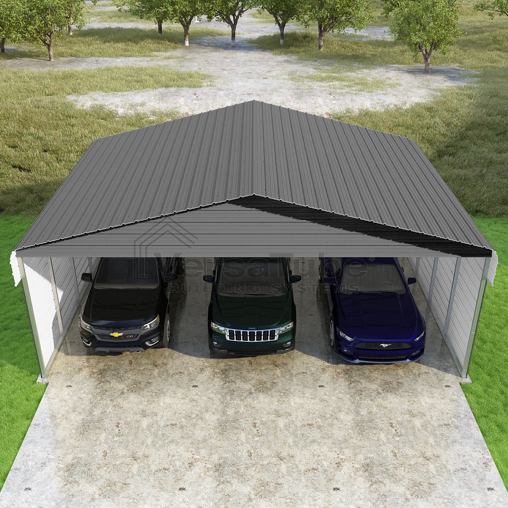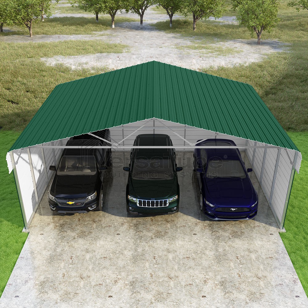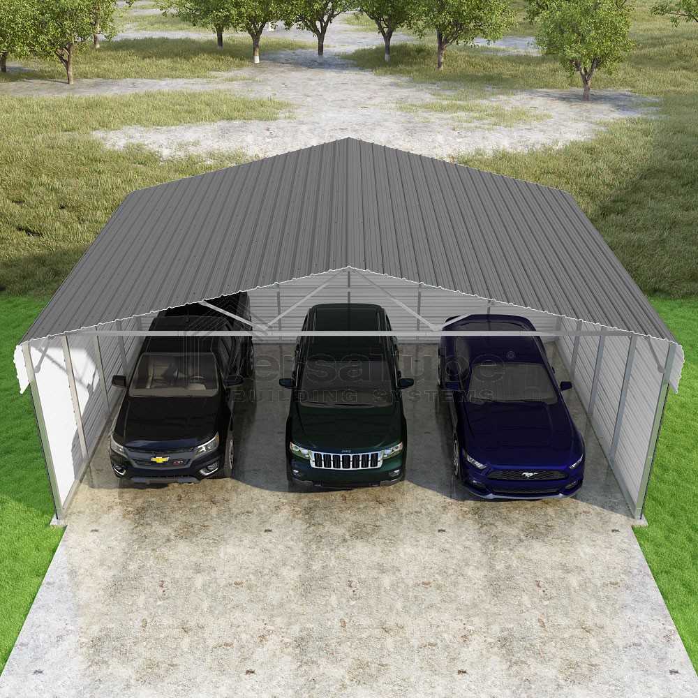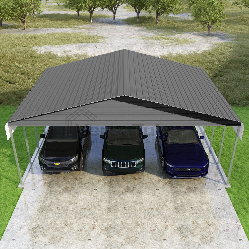 Classic Series DIY carport kit features horizontal application of sheet metal panels with the extra protection of rounded eaves.