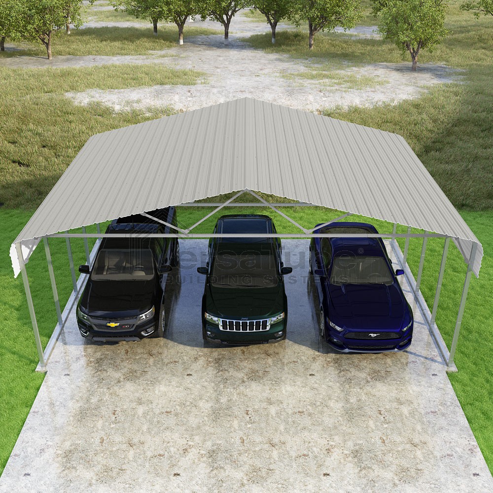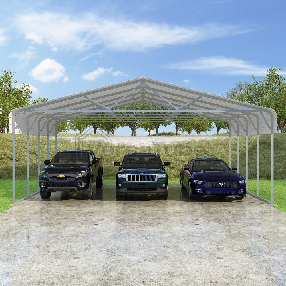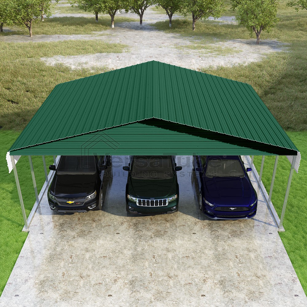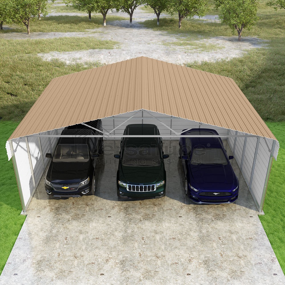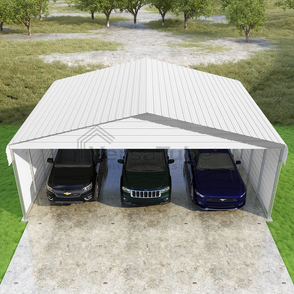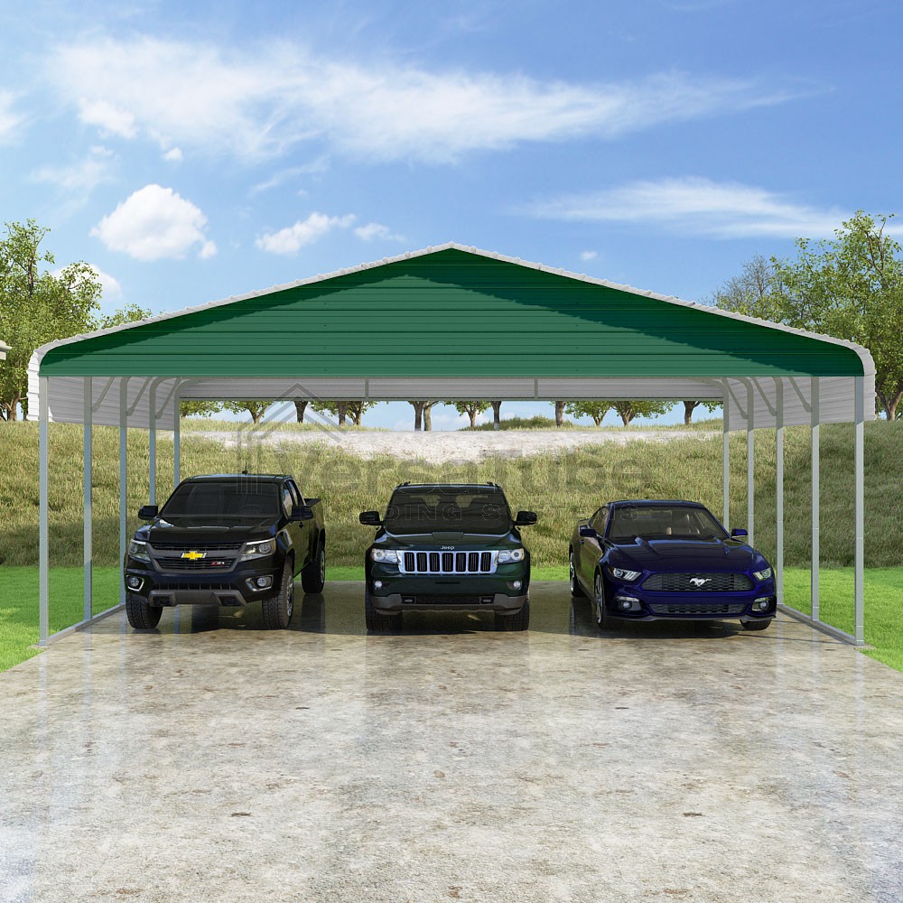 Classic Series DIY carport kit features horizontal application of sheet metal panels with the extra protection of rounded eaves.