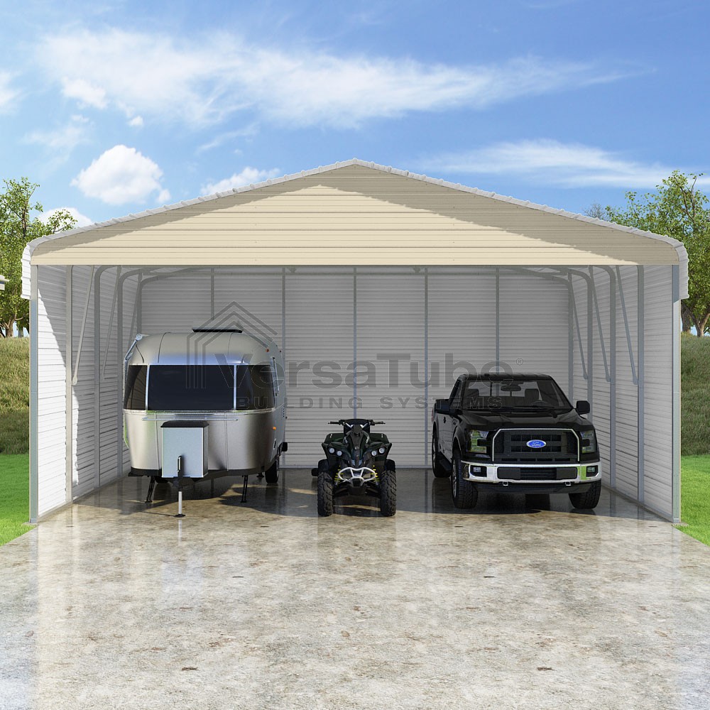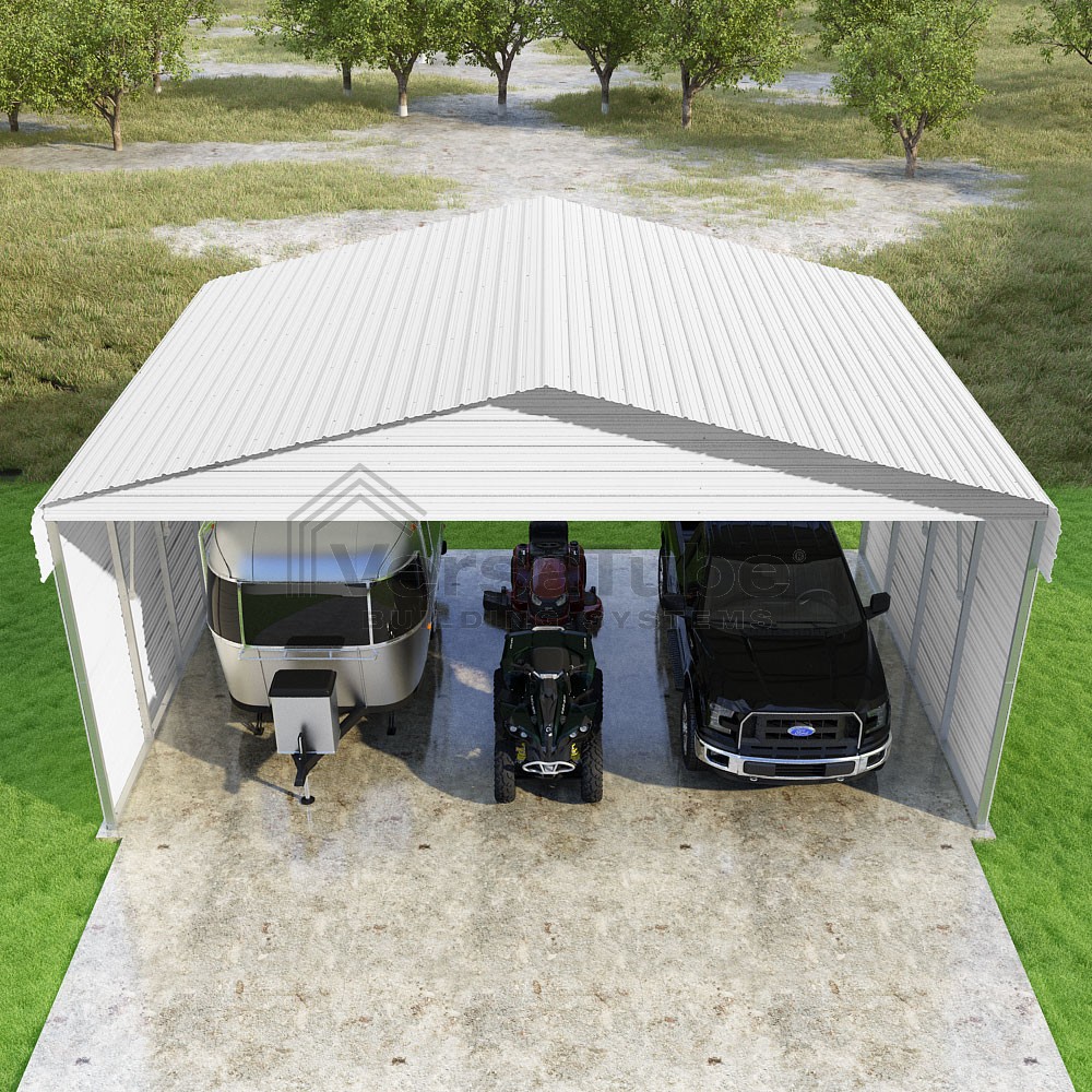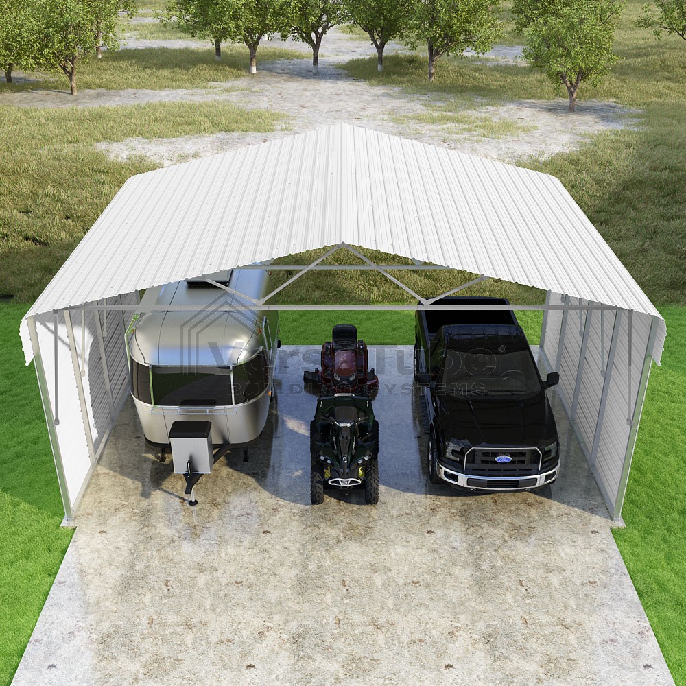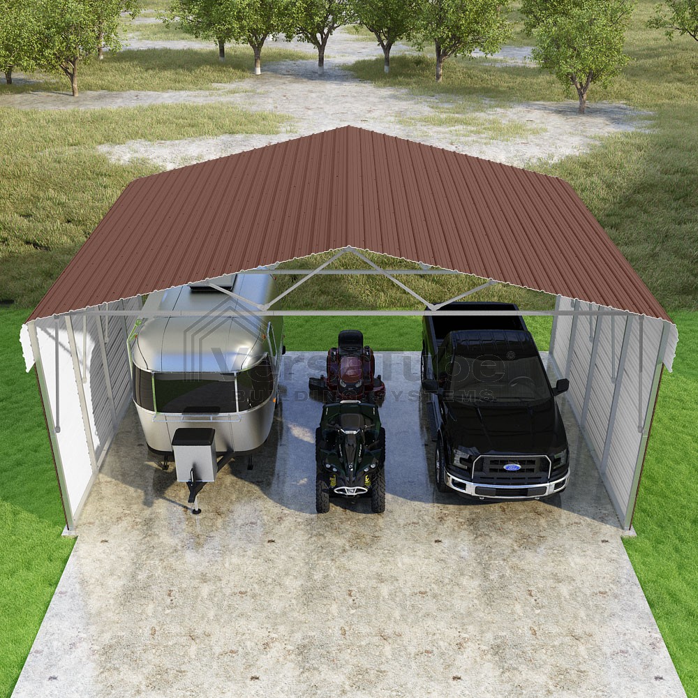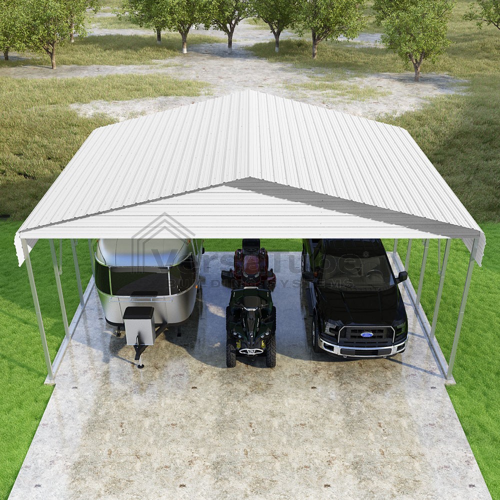 Classic Series DIY carport kit features horizontal application of sheet metal panels with the extra protection of rounded eaves.